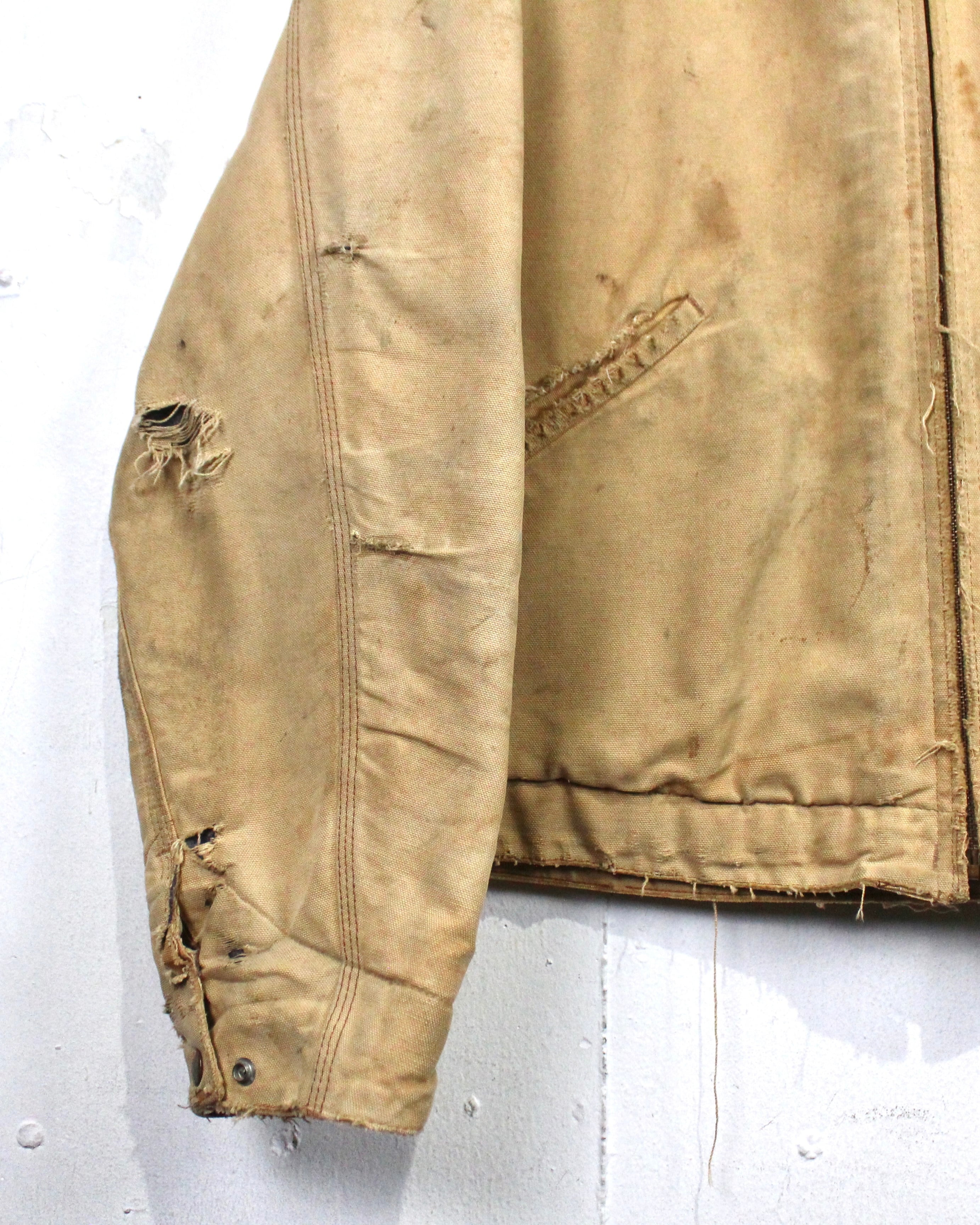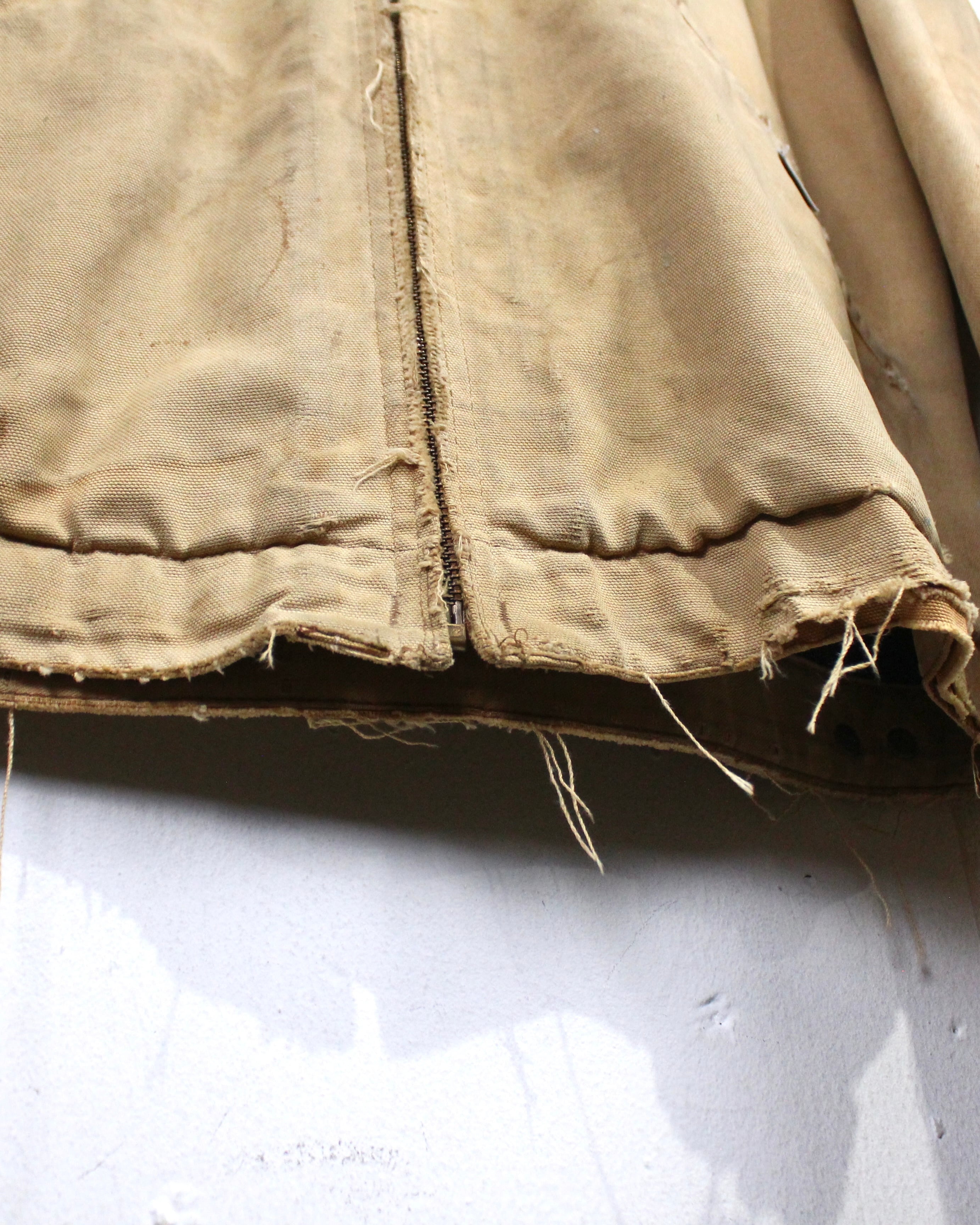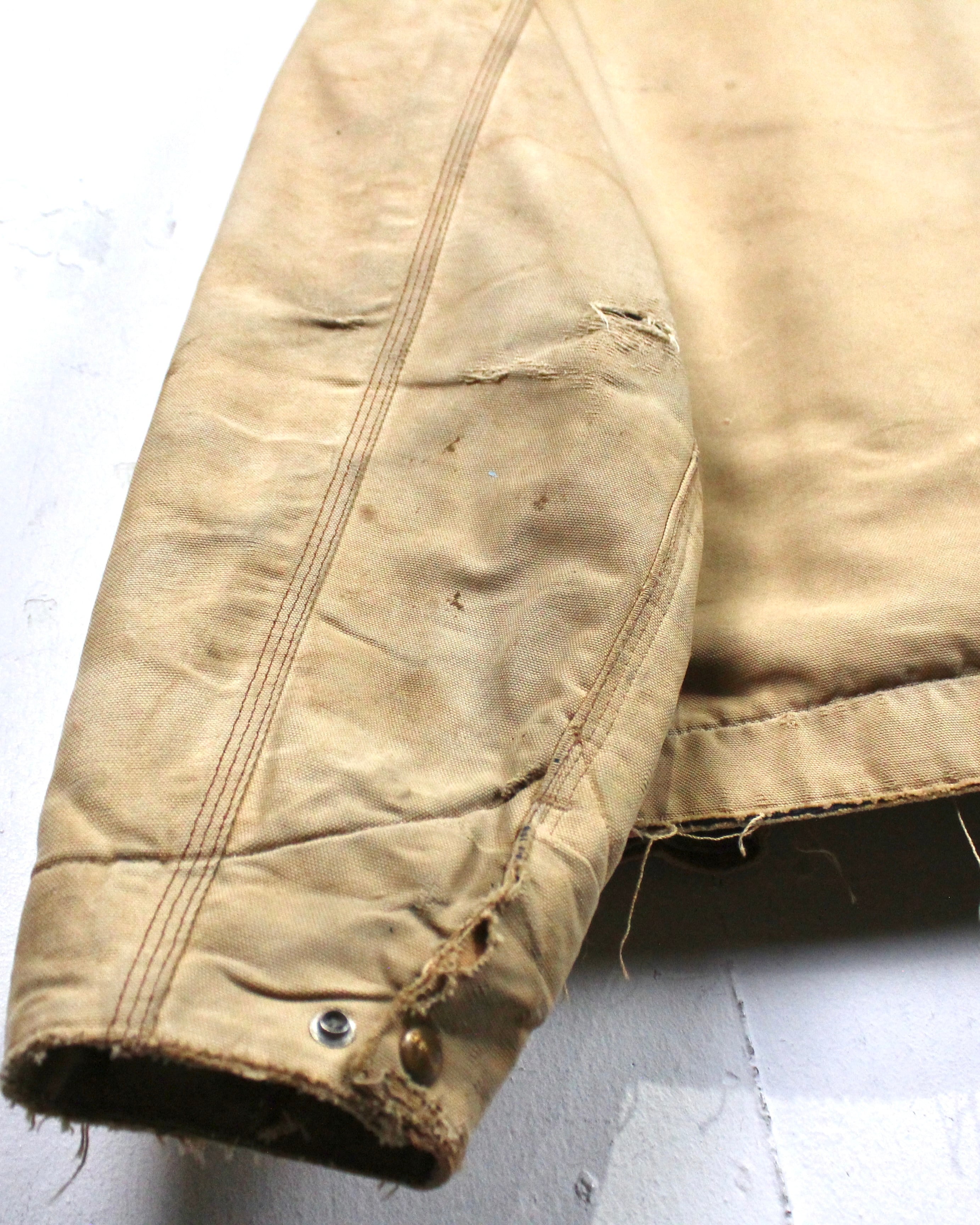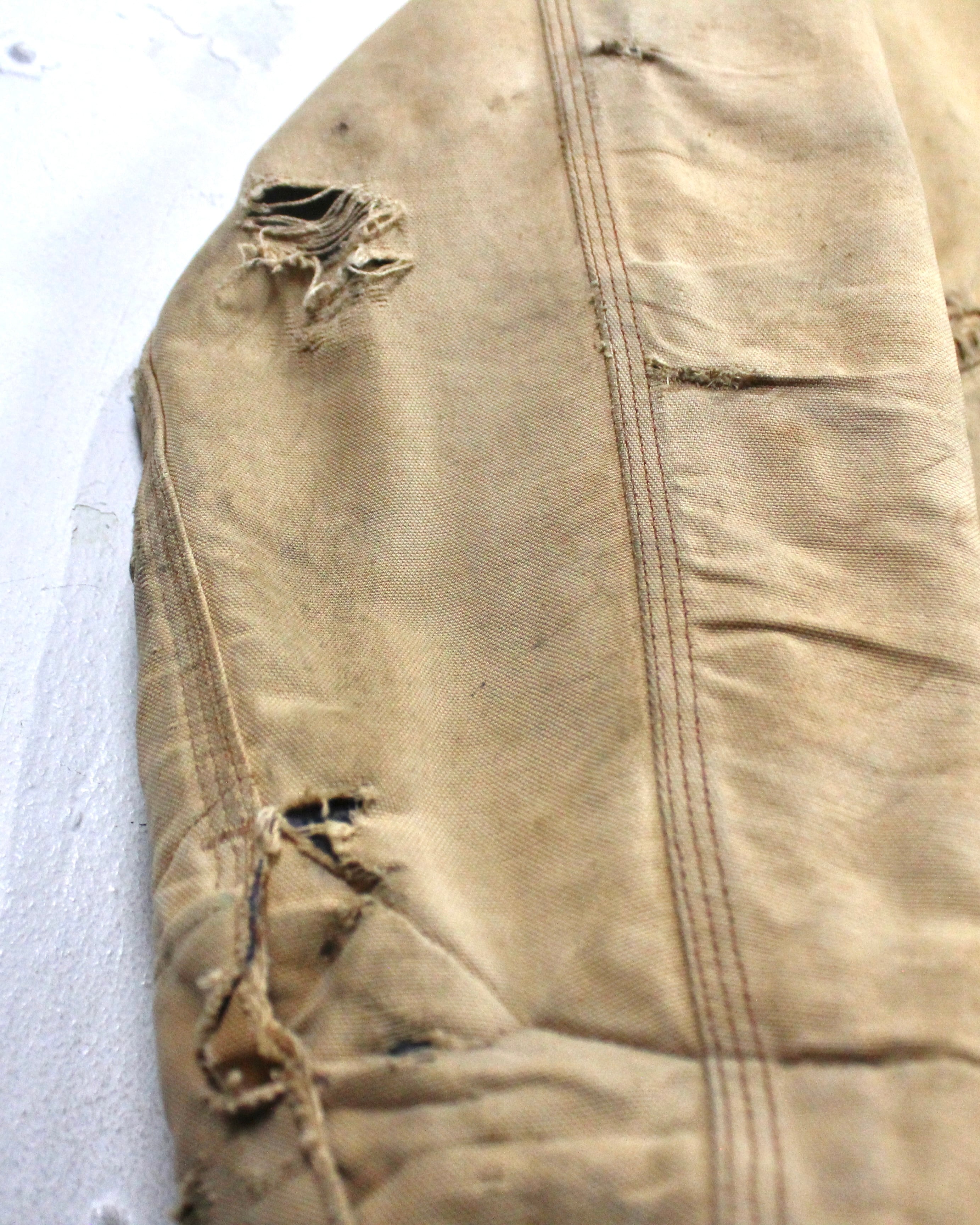 強靭なダック地をベースに、長年の着用によって刻まれたフェード、擦れ、ダメージが全体に広がり、ワークウェアならではの迫力ある佇まいに仕上がった1着。均一ではない色落ちやボロ感が、現行品では決して表現できない奥行きを生み出しています。