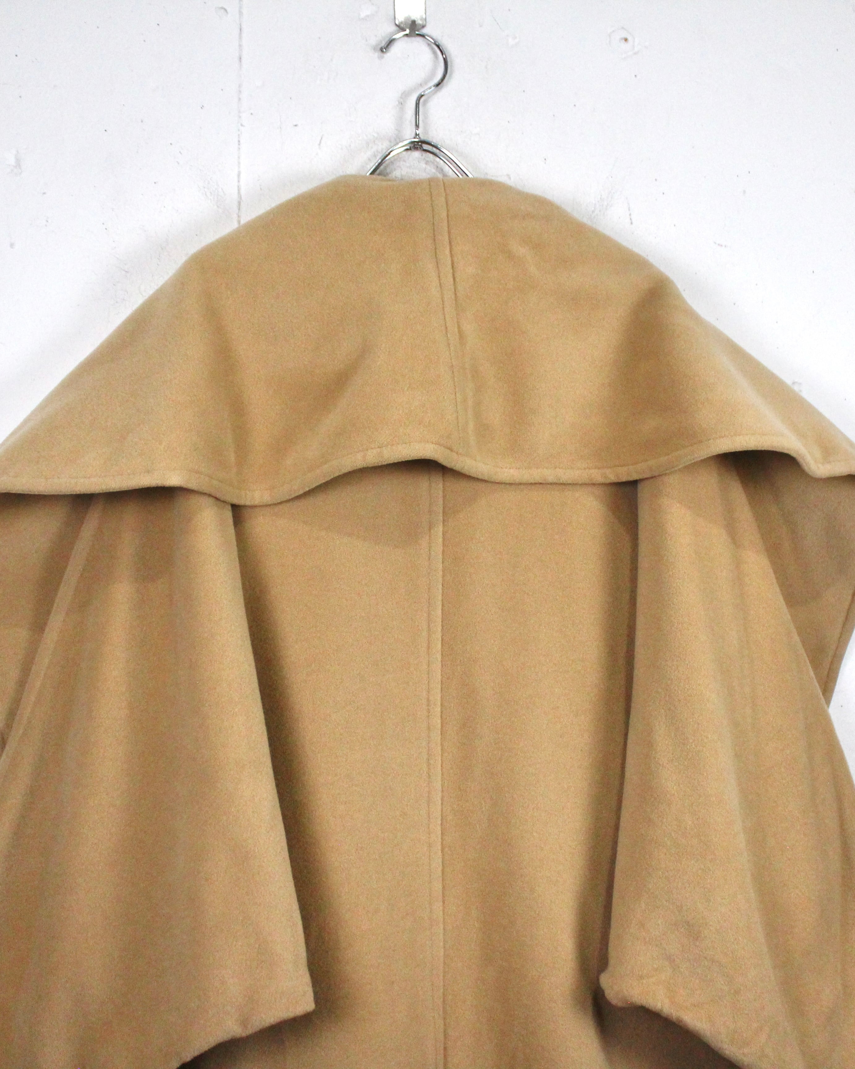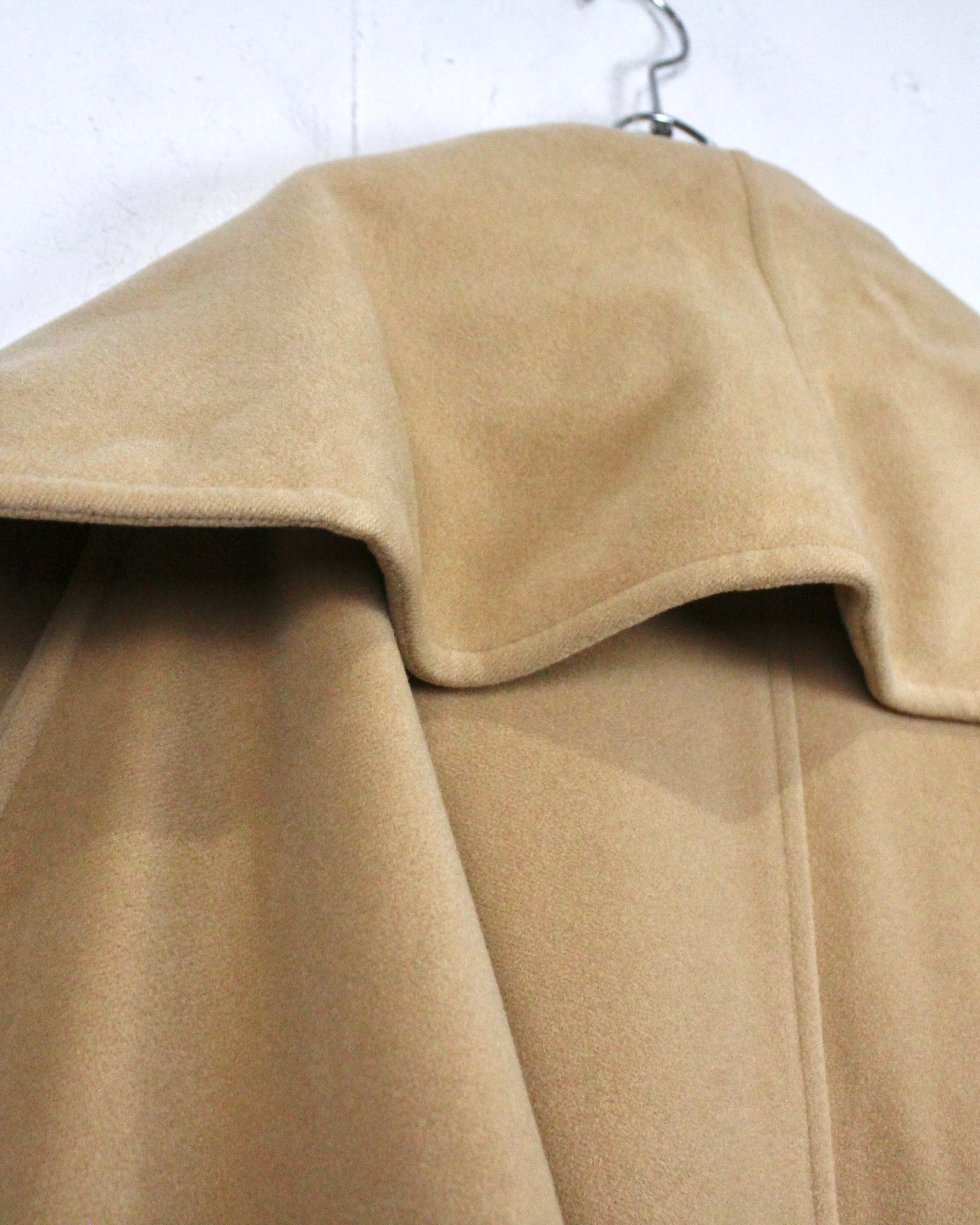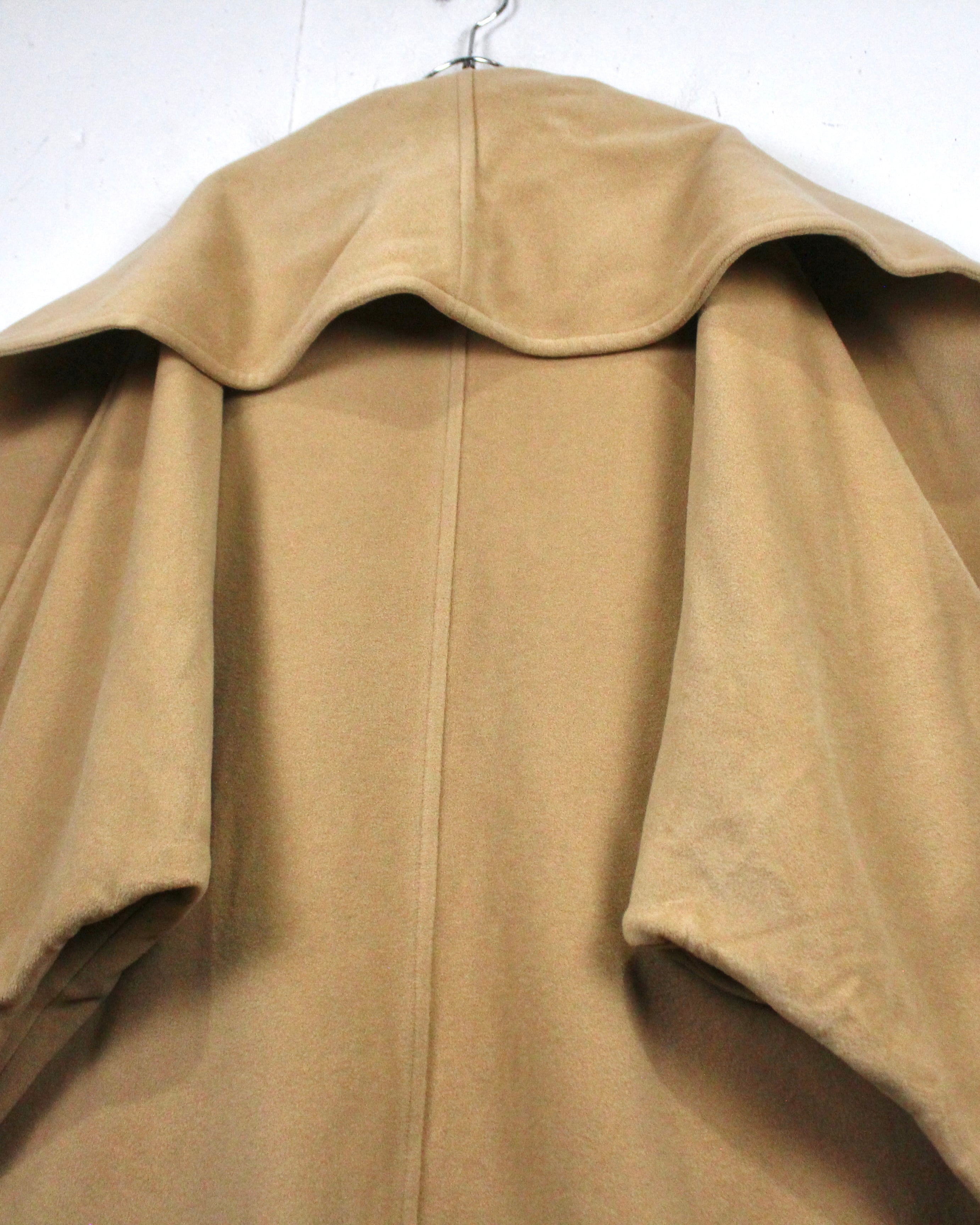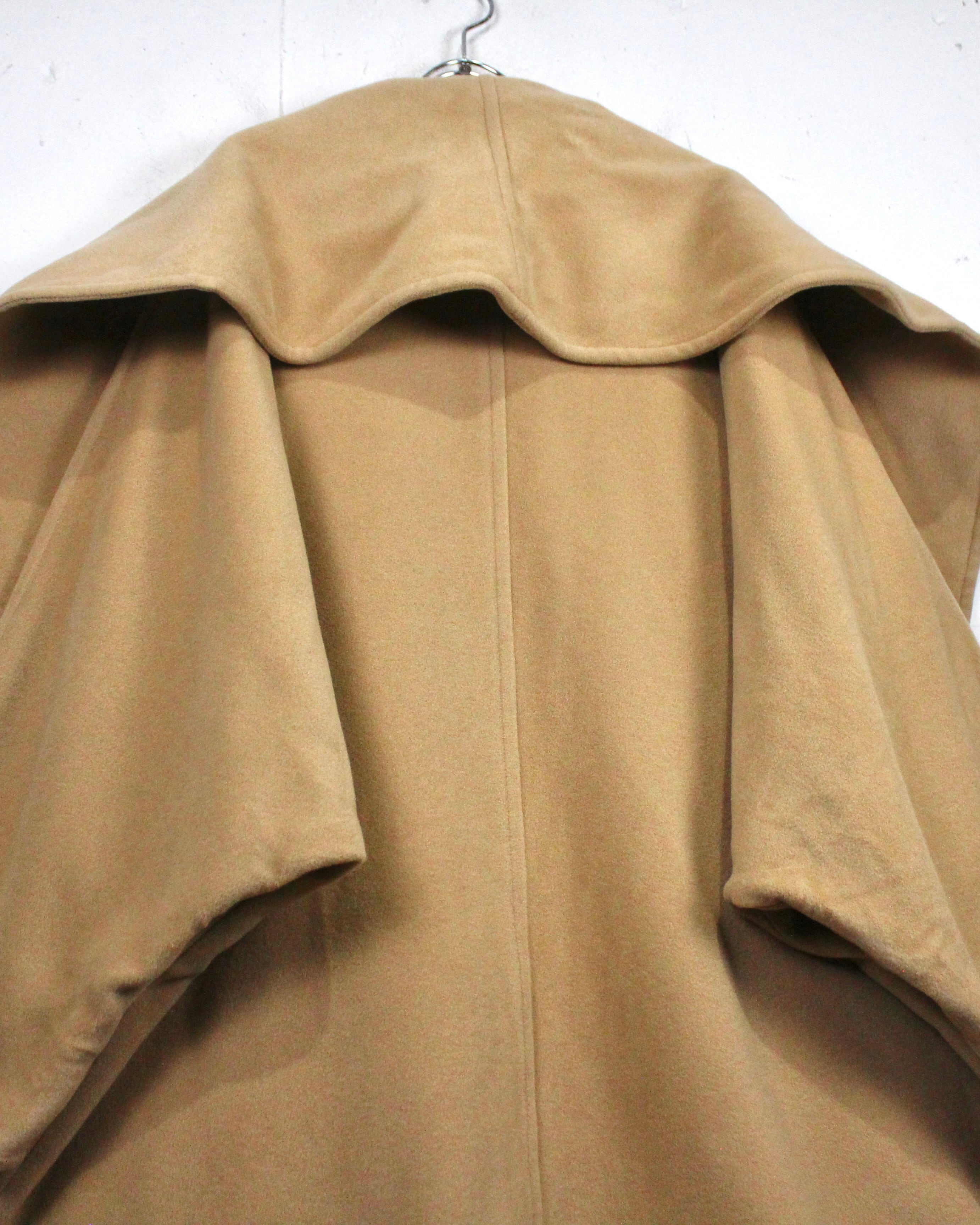 最大の特徴は圧倒的な存在感を放つビッグカラーに、肩線を落としたドルマンスリーブ仕様。丸みのあるフォルムと流れるようなラインが生まれ、羽織るだけで雰囲気を漂わせています。