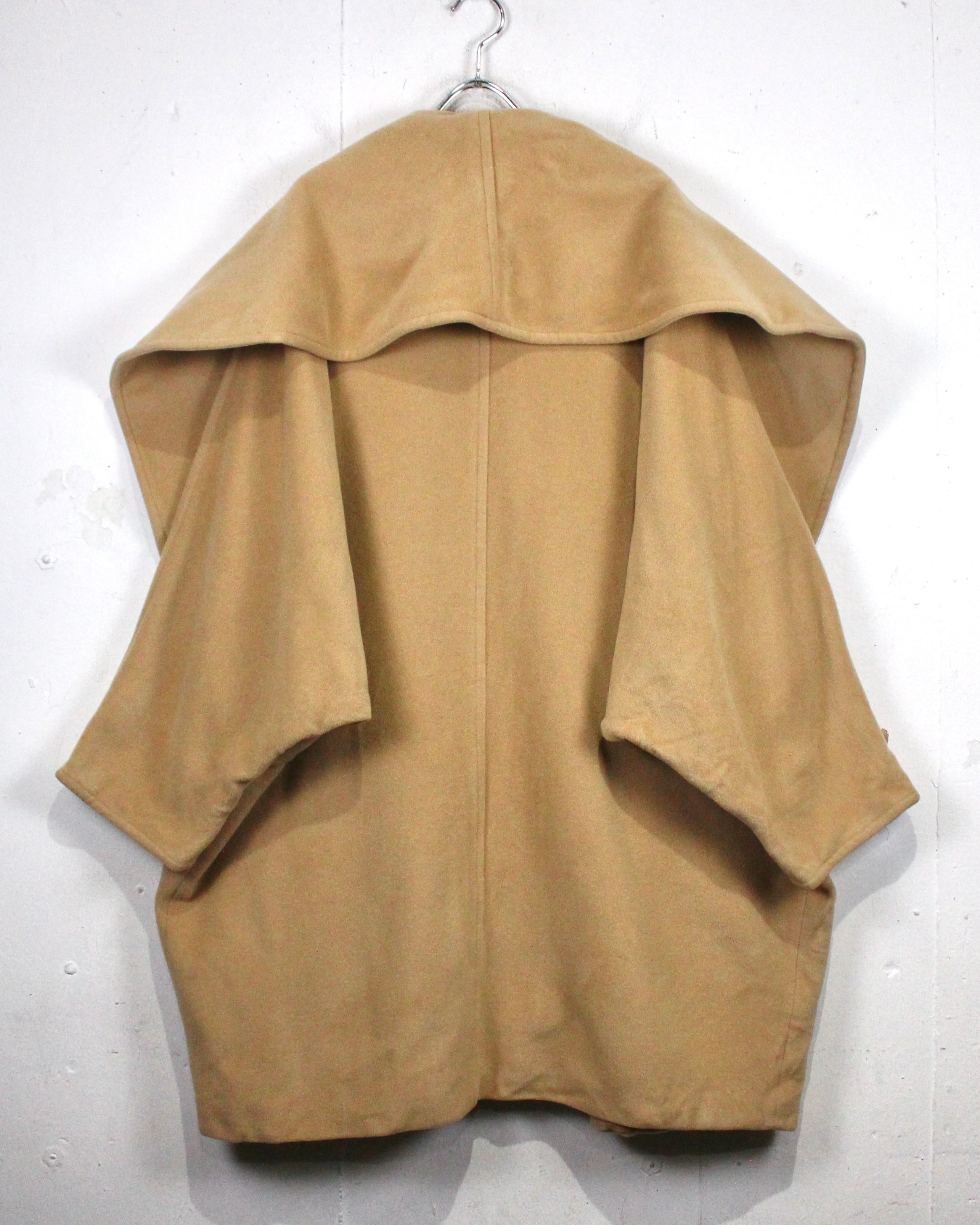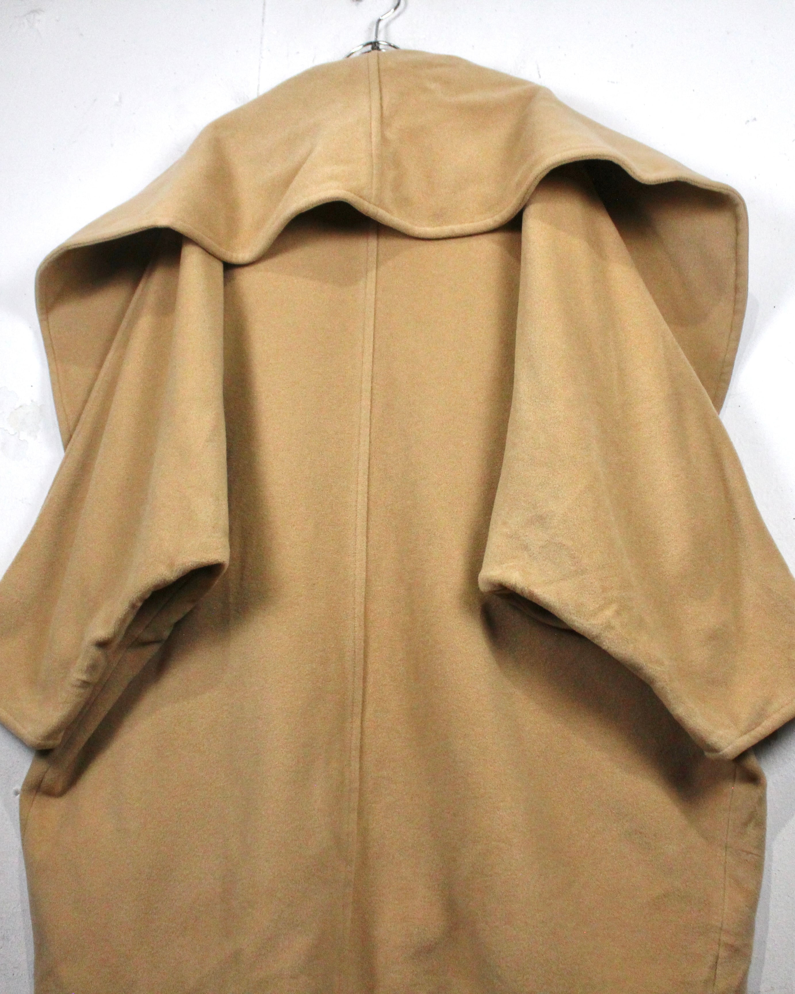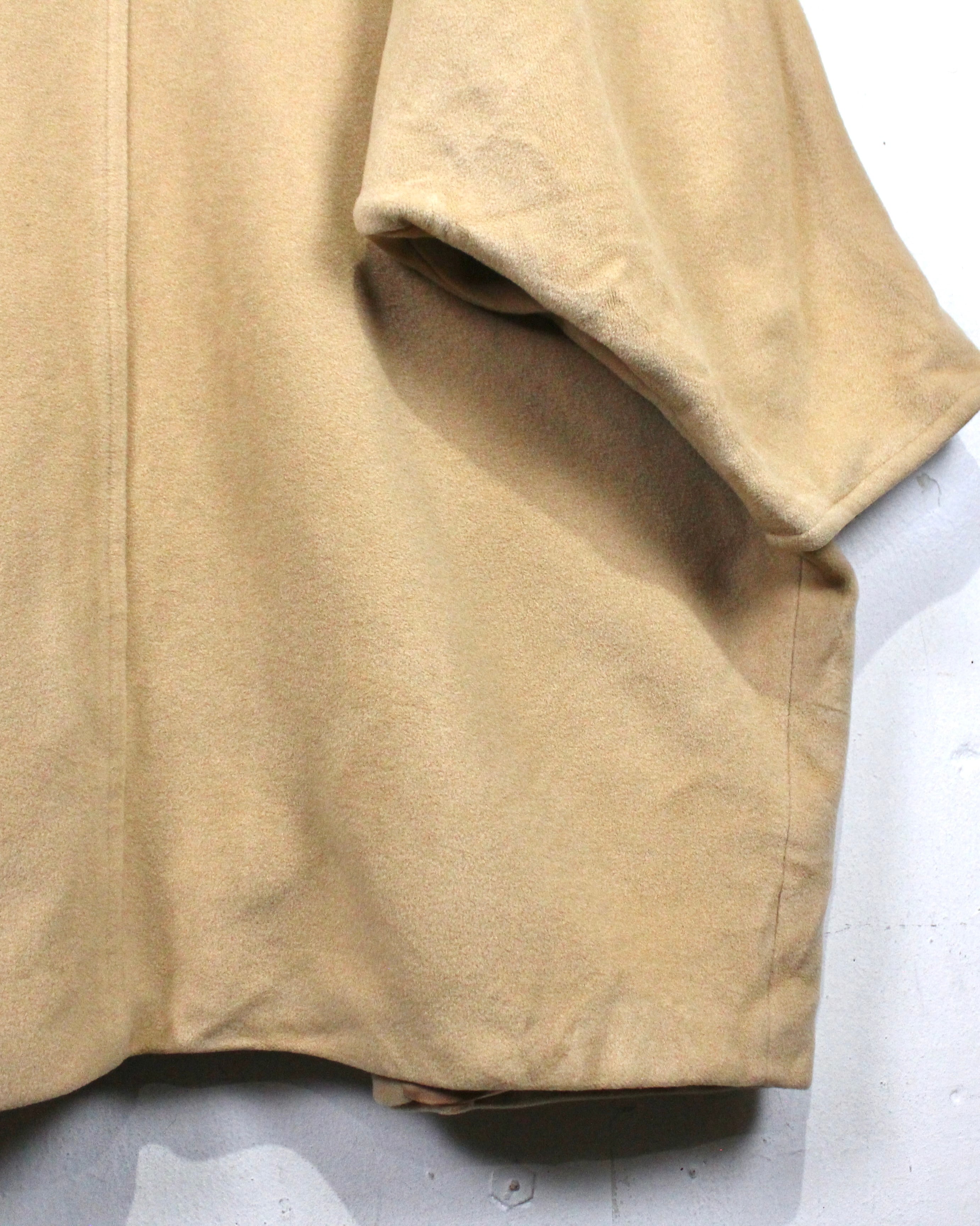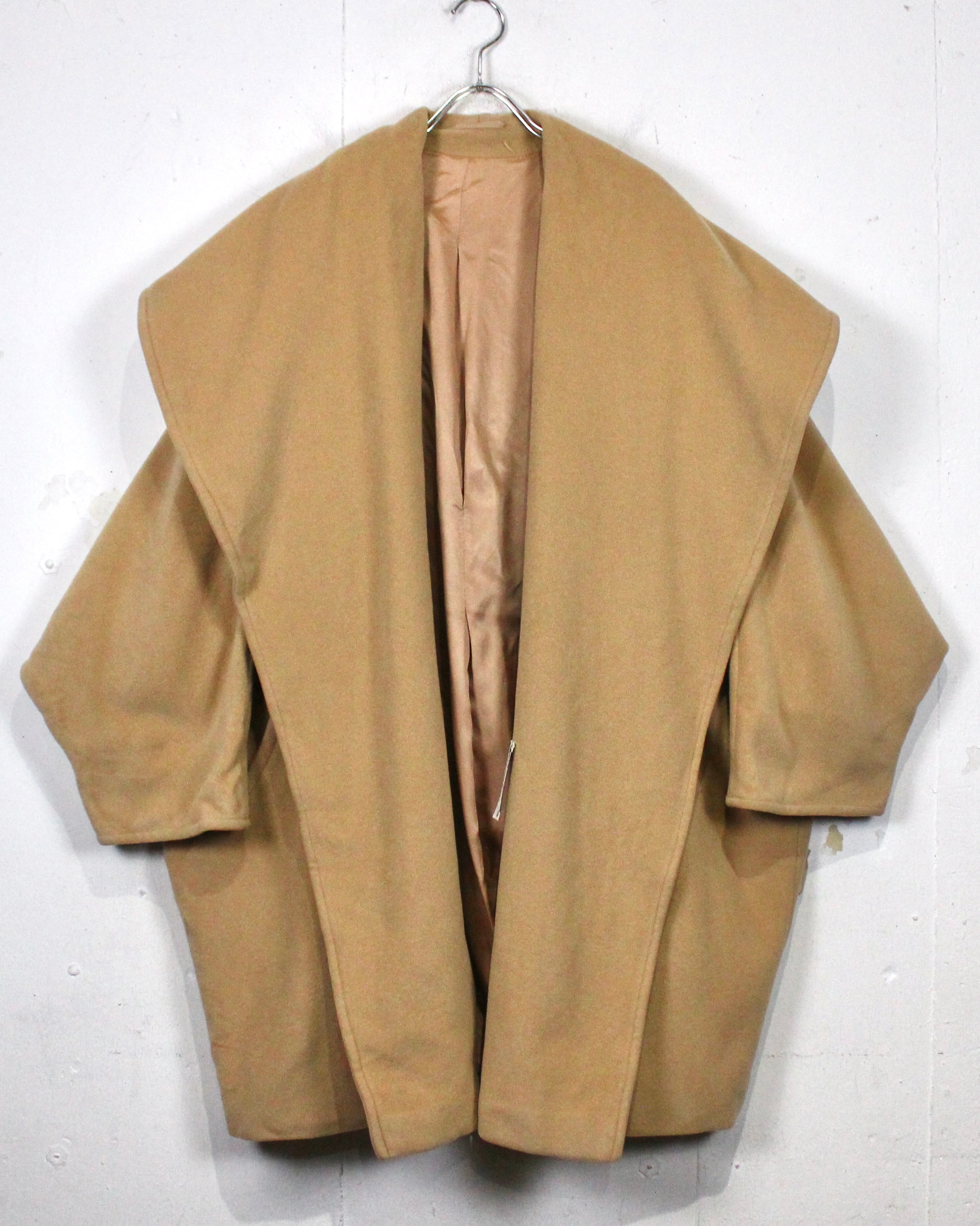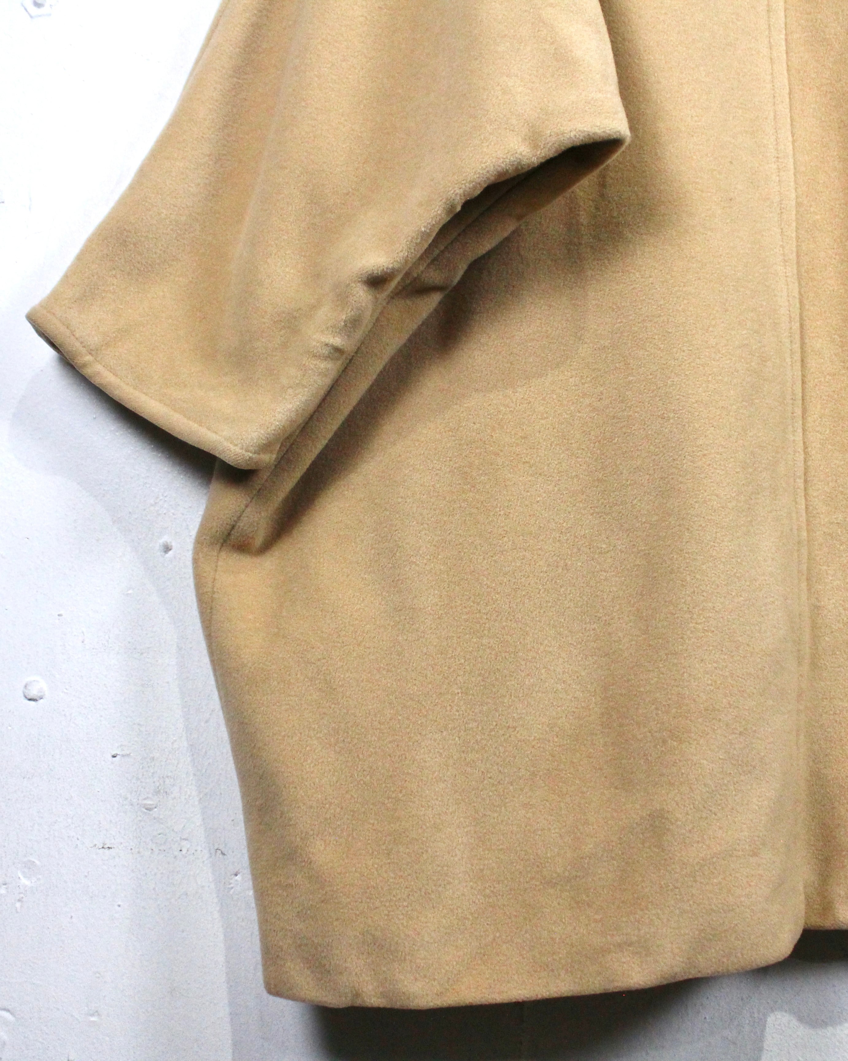 最大の特徴は圧倒的な存在感を放つビッグカラーに、肩線を落としたドルマンスリーブ仕様。丸みのあるフォルムと流れるようなラインが生まれ、羽織るだけで雰囲気を漂わせています。
