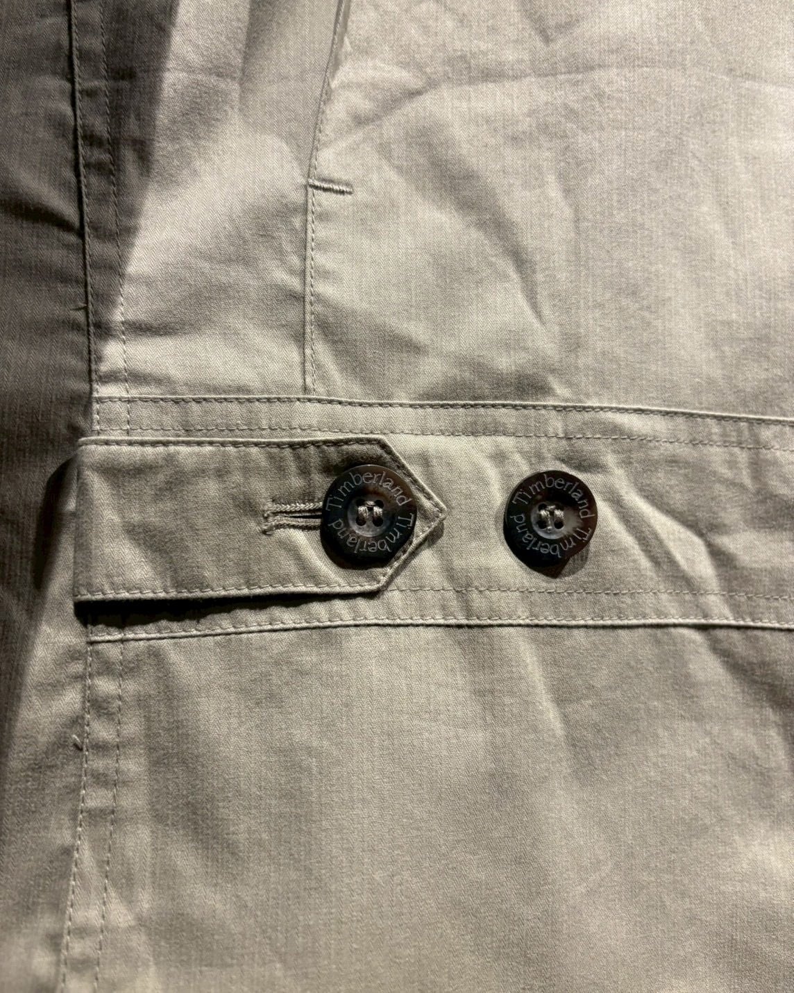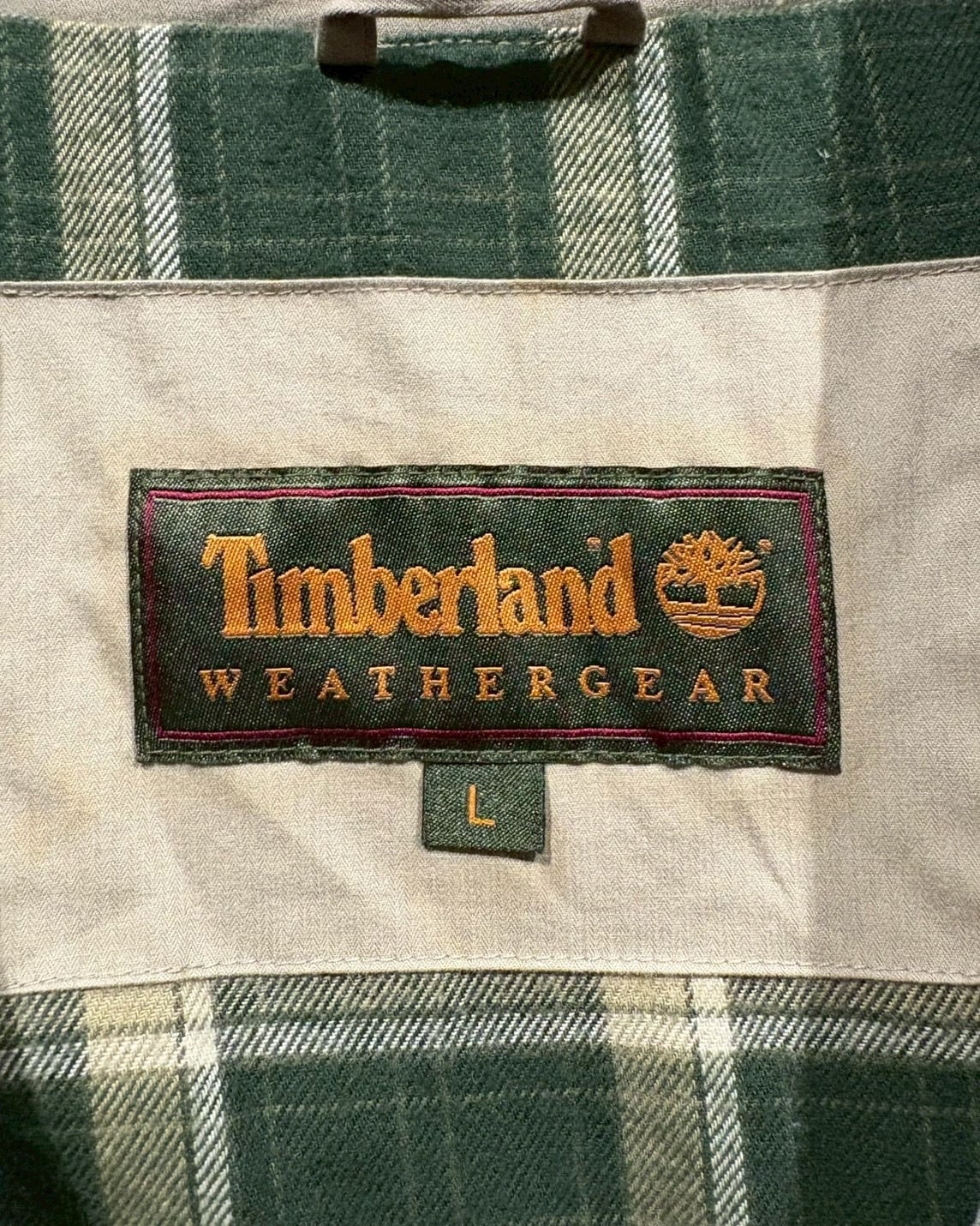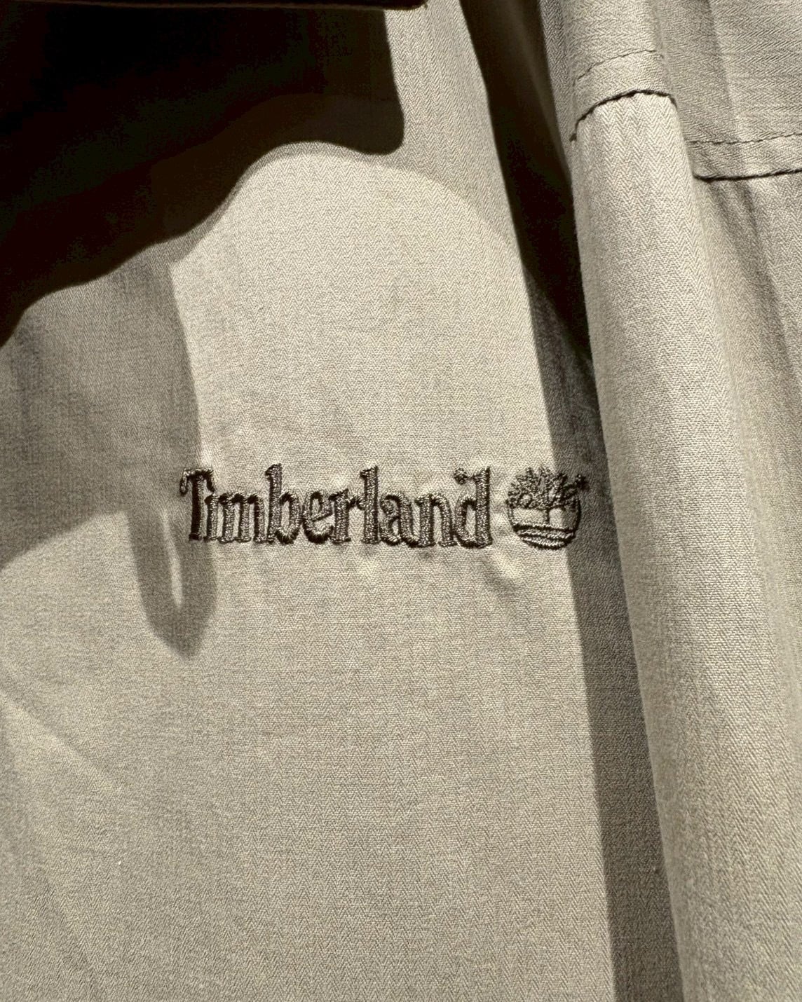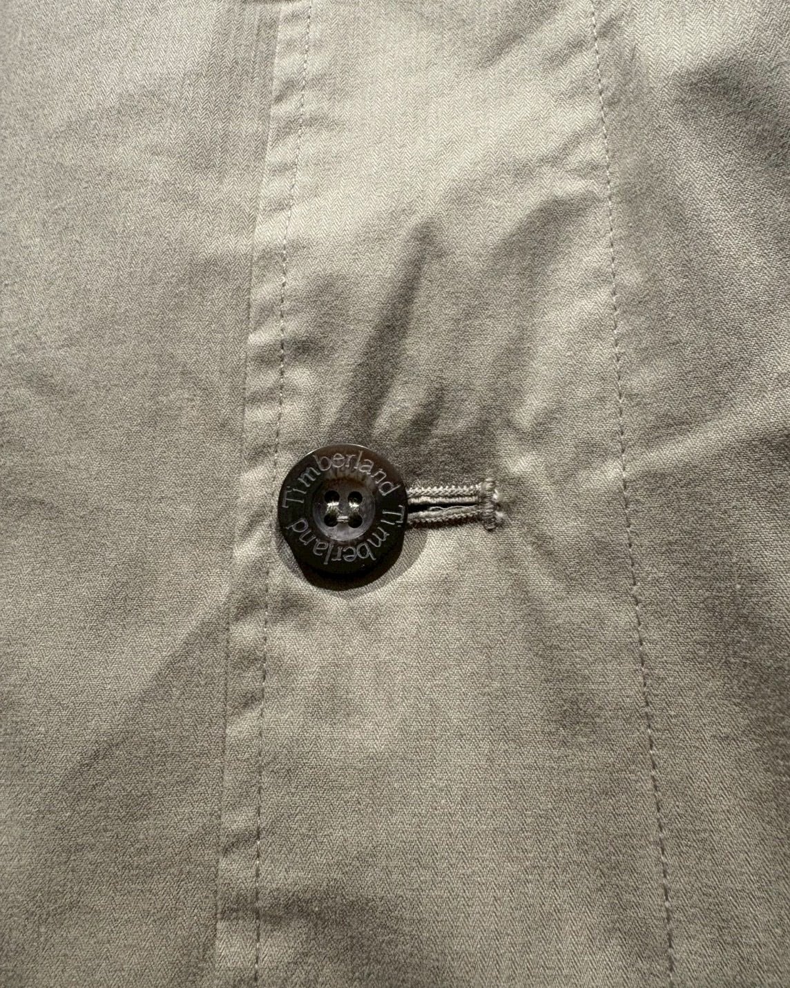 裏地にはグリーンベースのチェックライニングを用い、左胸にさりげなく入るロゴ刺繍、ボタンやパーツにもTimberlandの刻印が入り、細部まで抜かりない作り込みが感じられます。