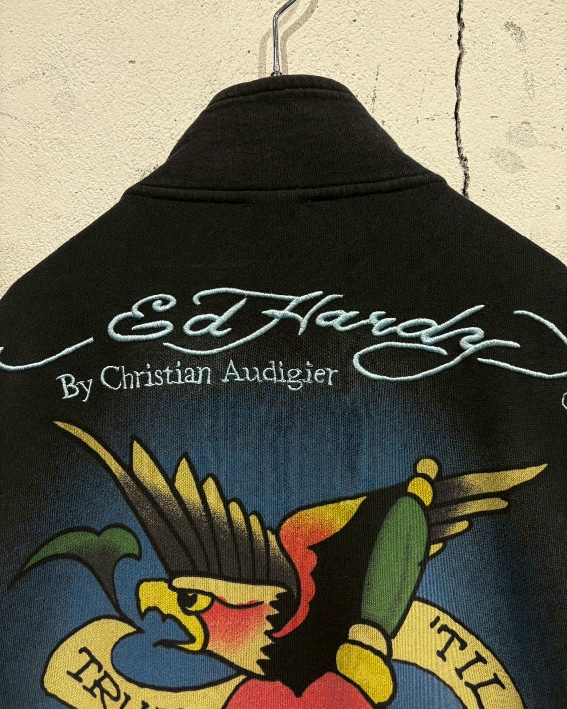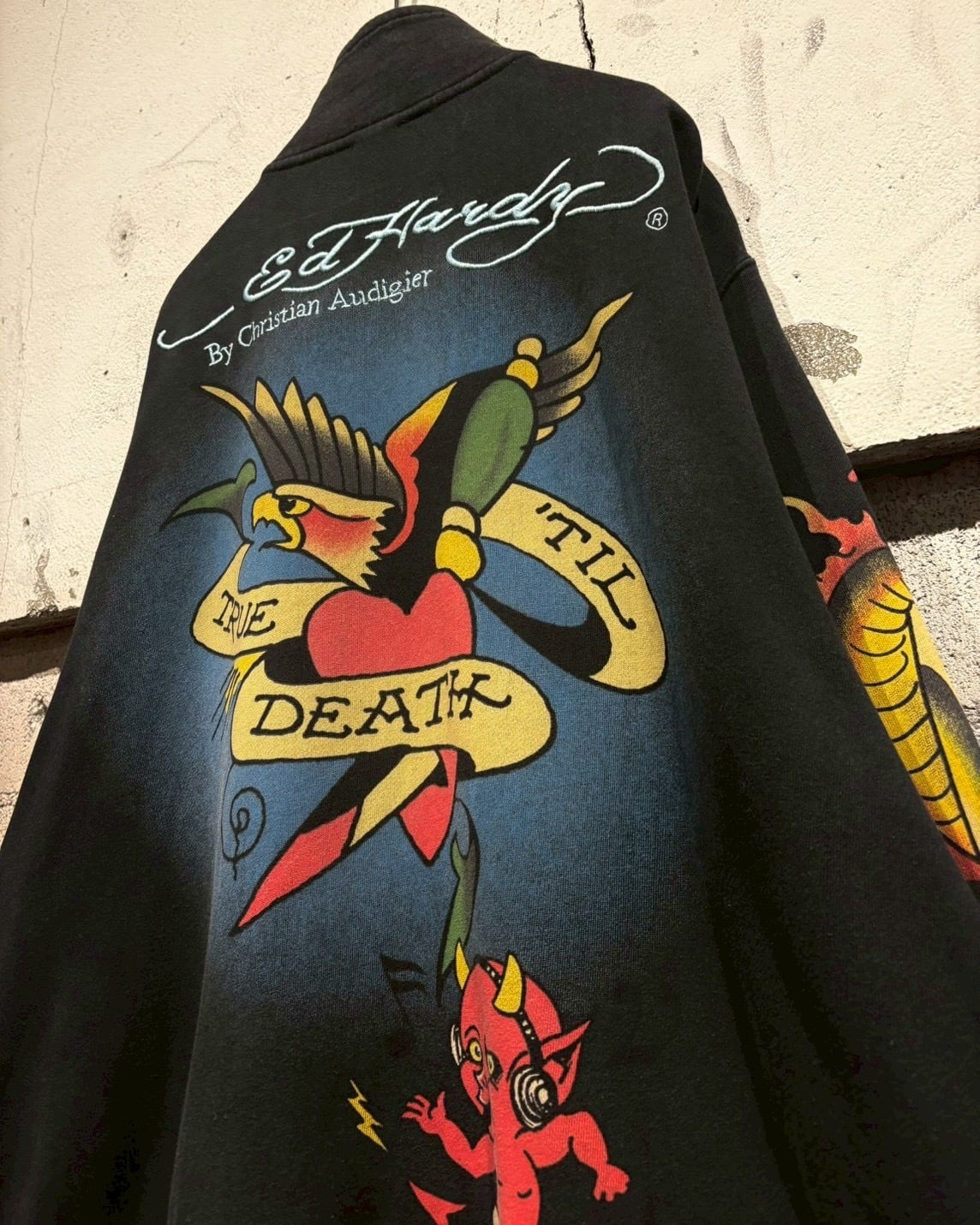 左右スリーブには、躍動感のあるダガーにスネークが落とし込まれ、背面には“Ed Hardy By Christian Audigier”の刺繍と共に、ハートを貫くスワロー、そして「TRUE TIL DEATH」のフレーズを配置。アメリカントラディショナルタトゥーの世界観を全身で表現しています。