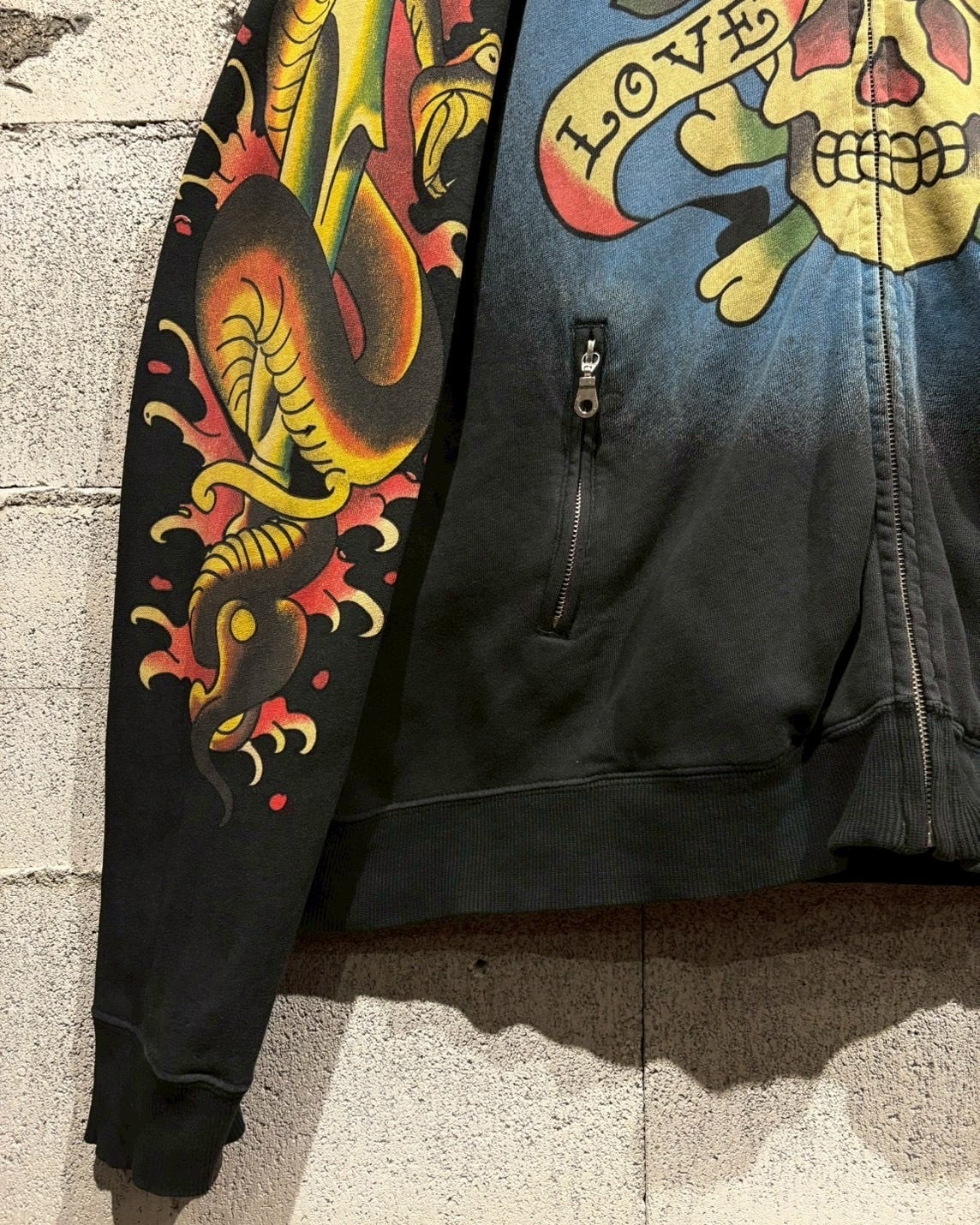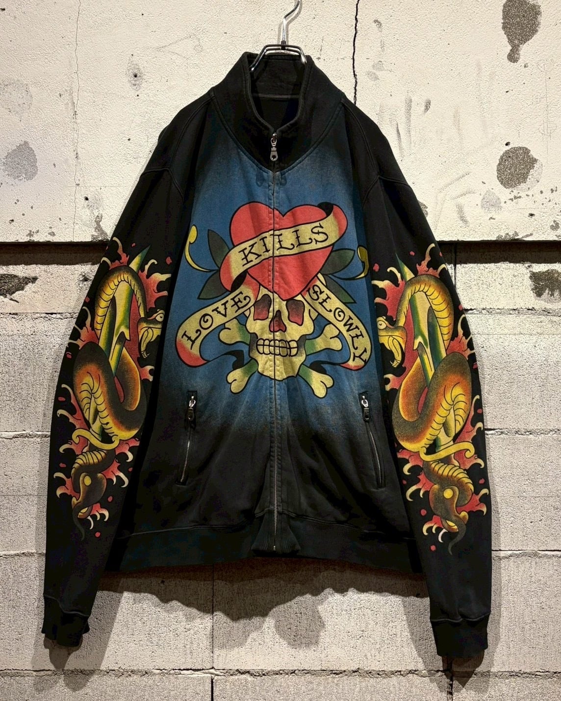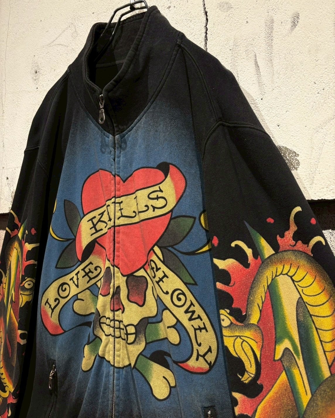 “Ed Hardy”らしいタトゥーカルチャーを色濃く反映した、ジップアップスウェットジャケットをご紹介いたします。