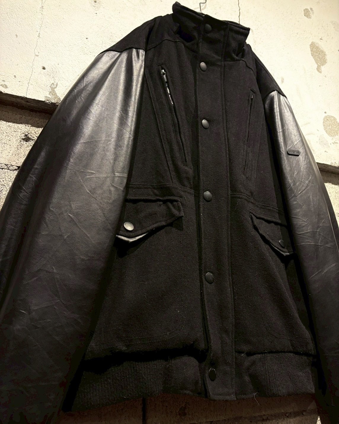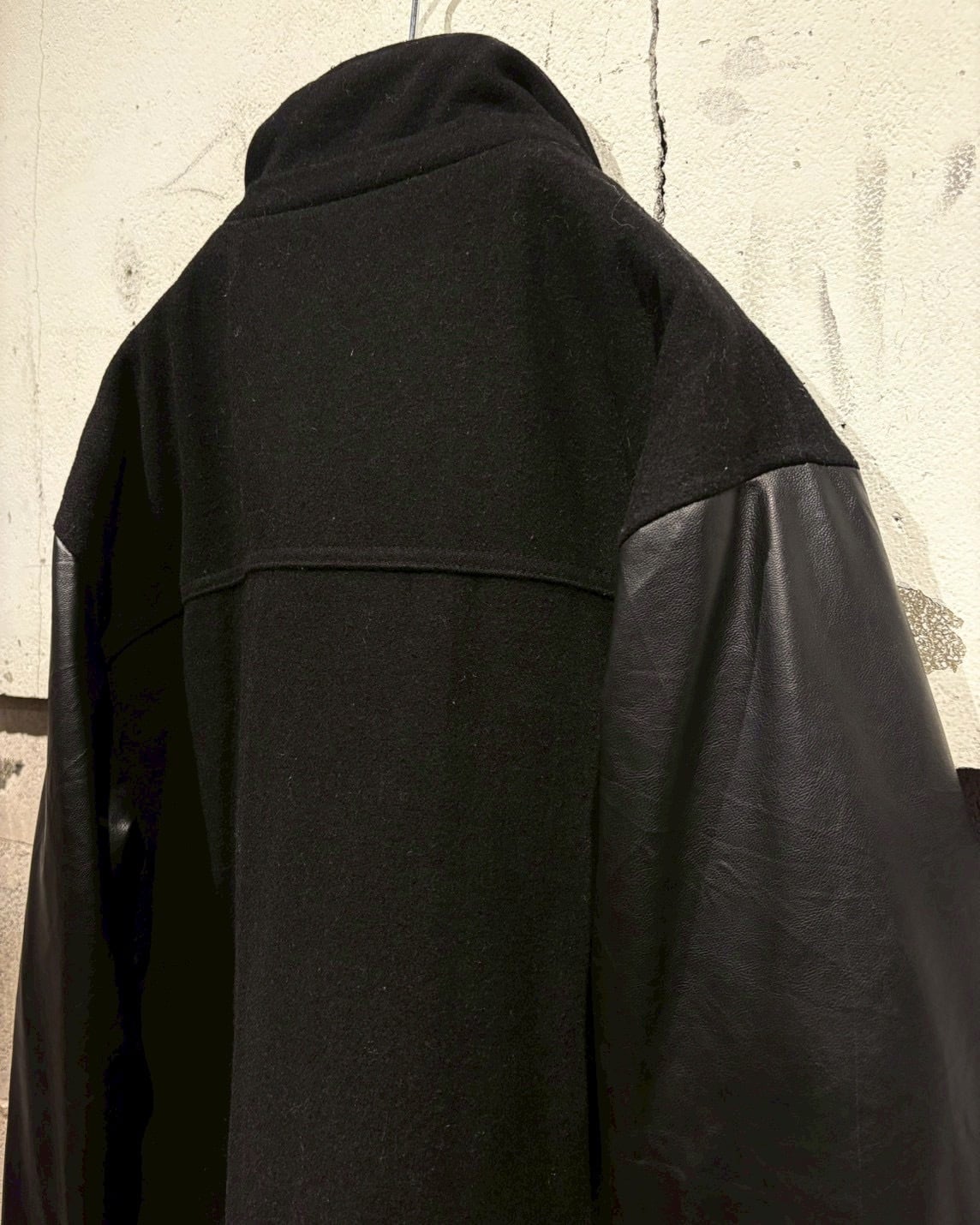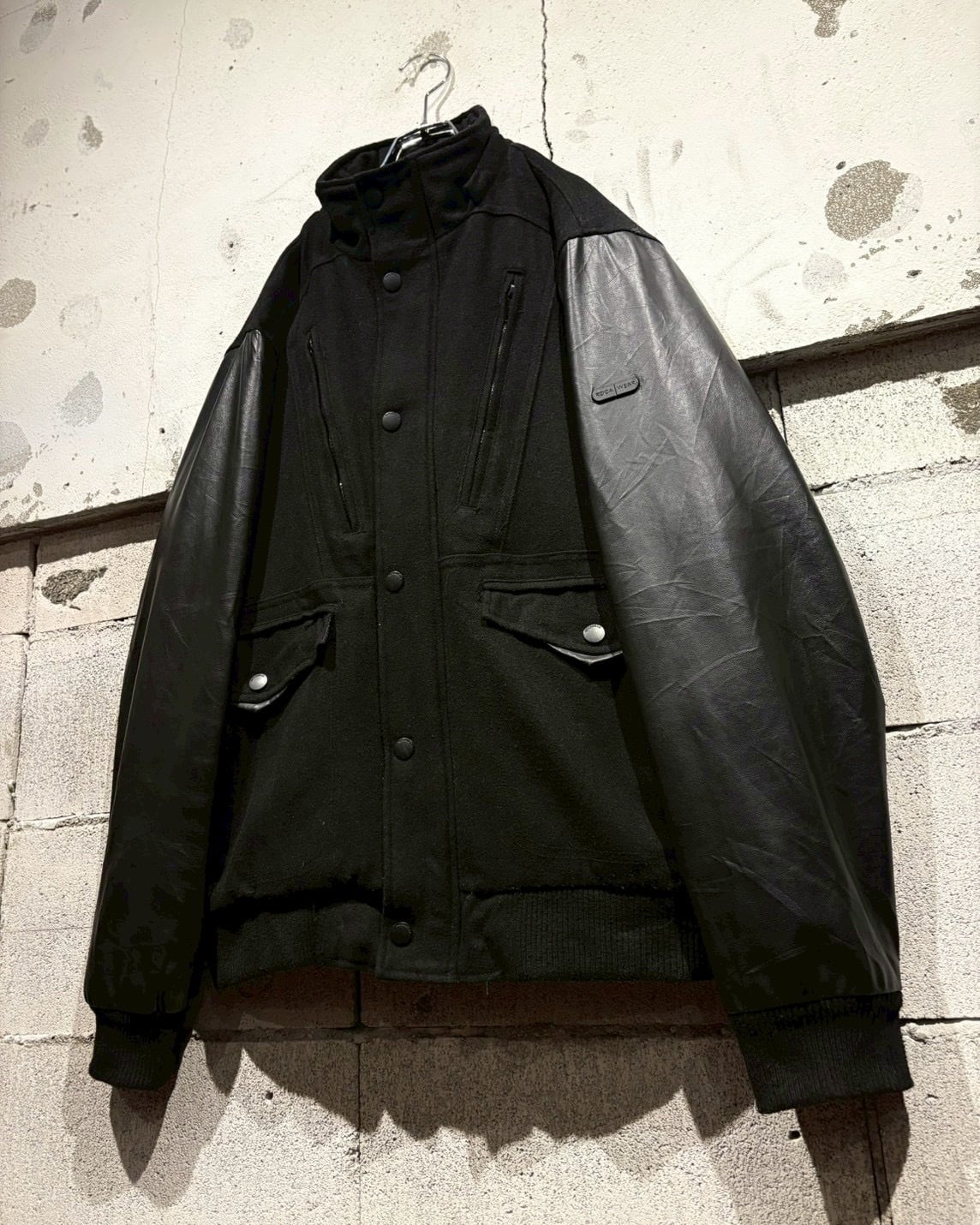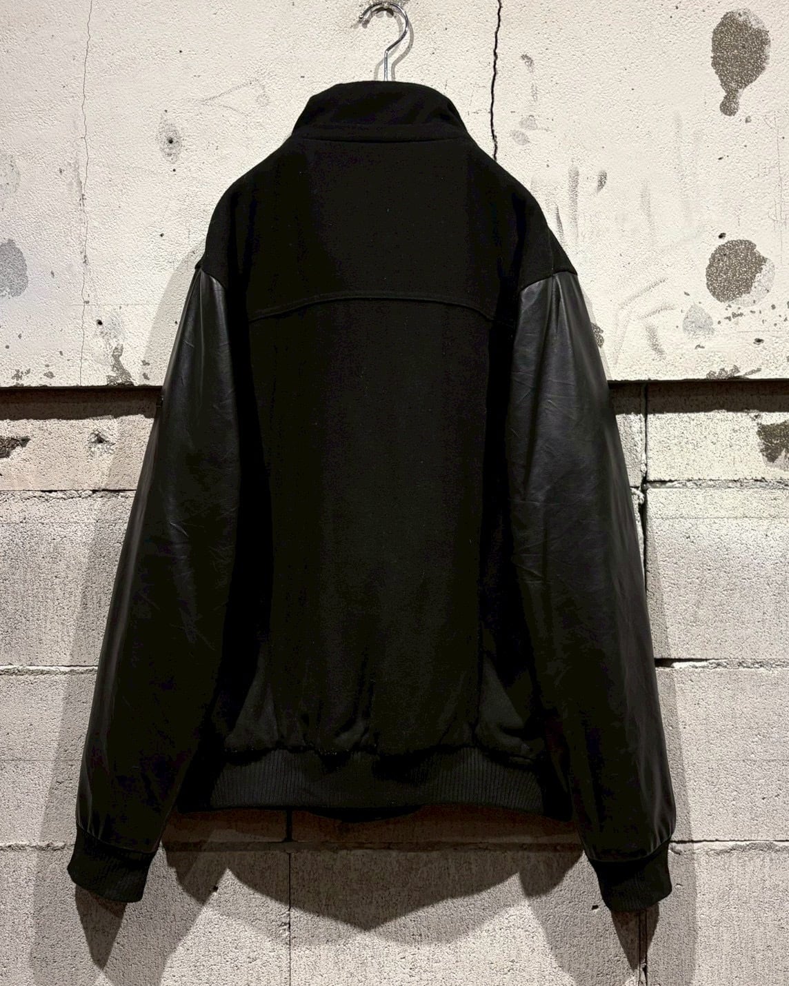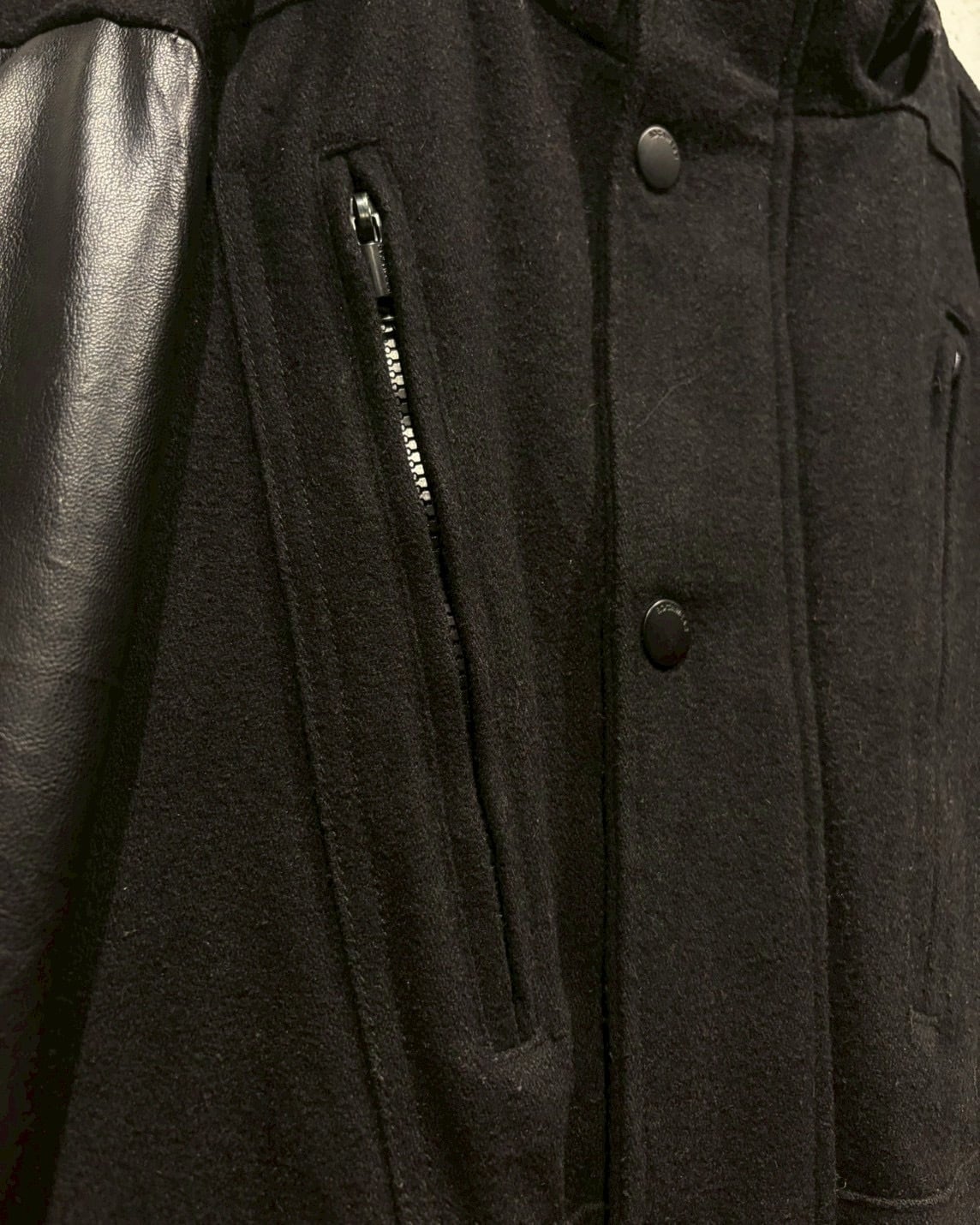 ボディにはウール混素材を採用し、アーム部分にはフェイクレザーを切り替えで配置し、異素材のコントラストが視覚的なアクセントに。ストリートでありながら、落ち着いた雰囲気に仕上がっています。