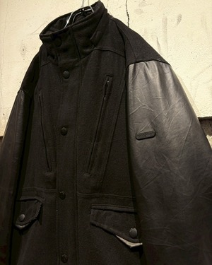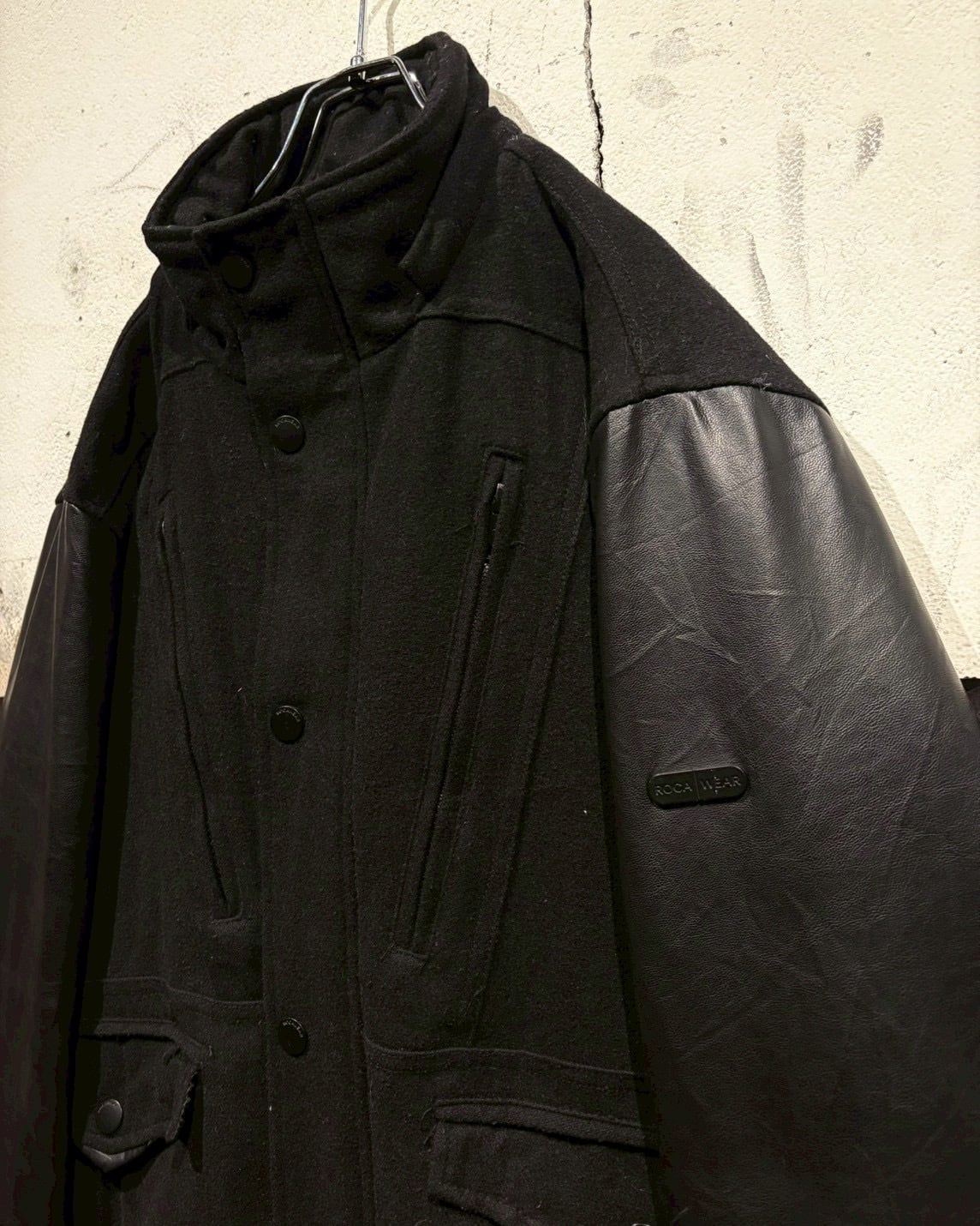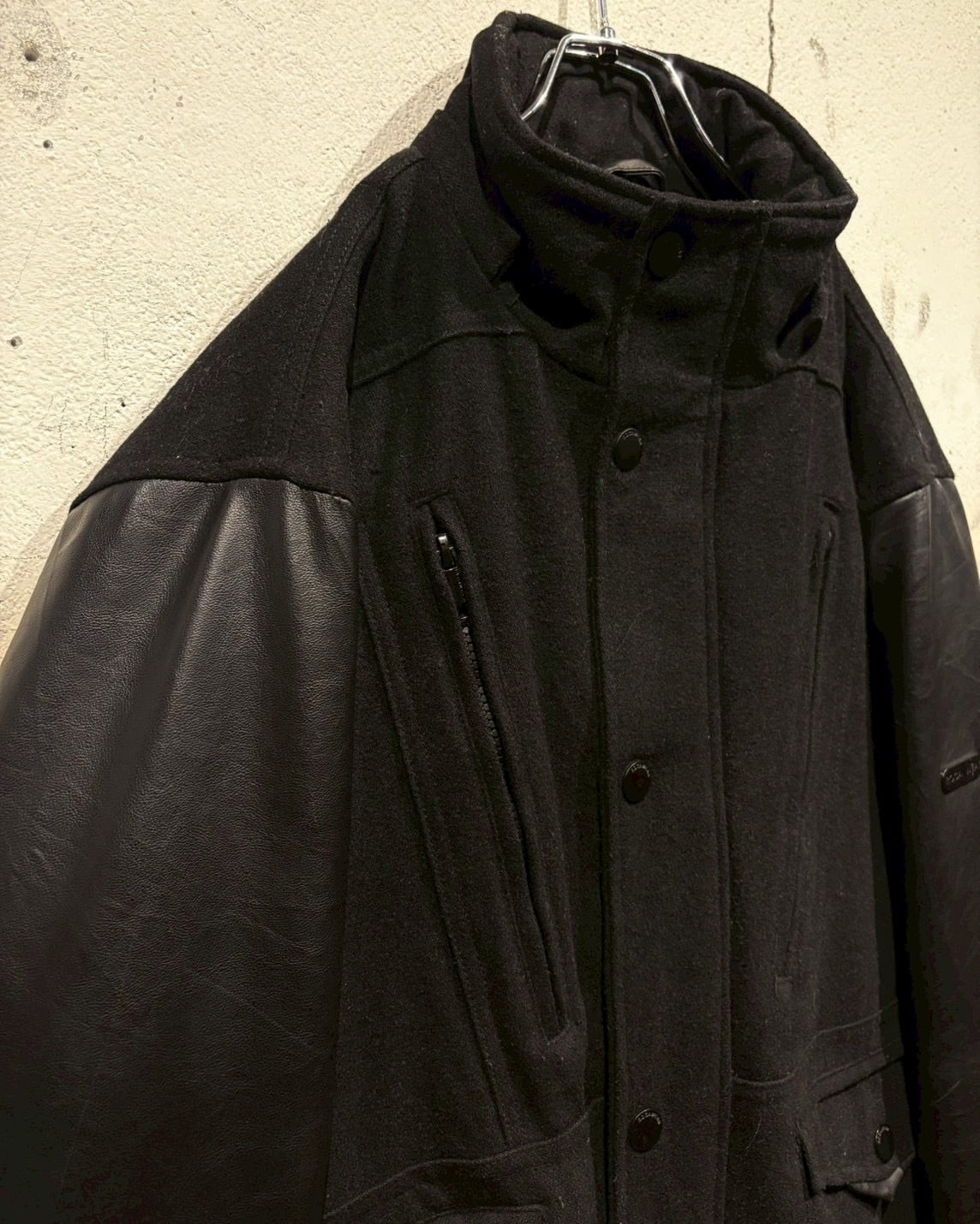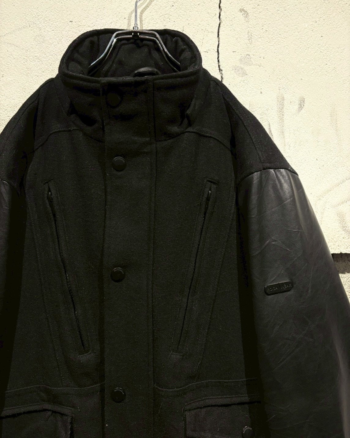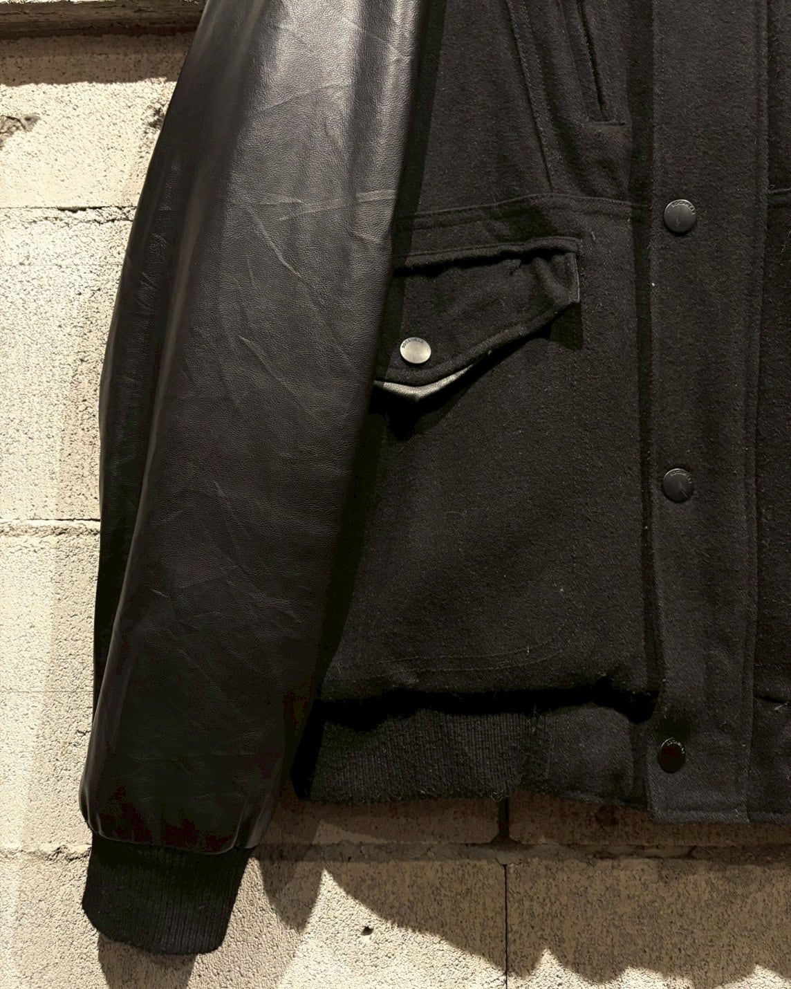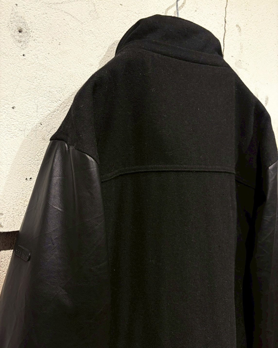 ボディにはウール混素材を採用し、アーム部分にはフェイクレザーを切り替えで配置し、異素材のコントラストが視覚的なアクセントに。ストリートでありながら、落ち着いた雰囲気に仕上がっています。