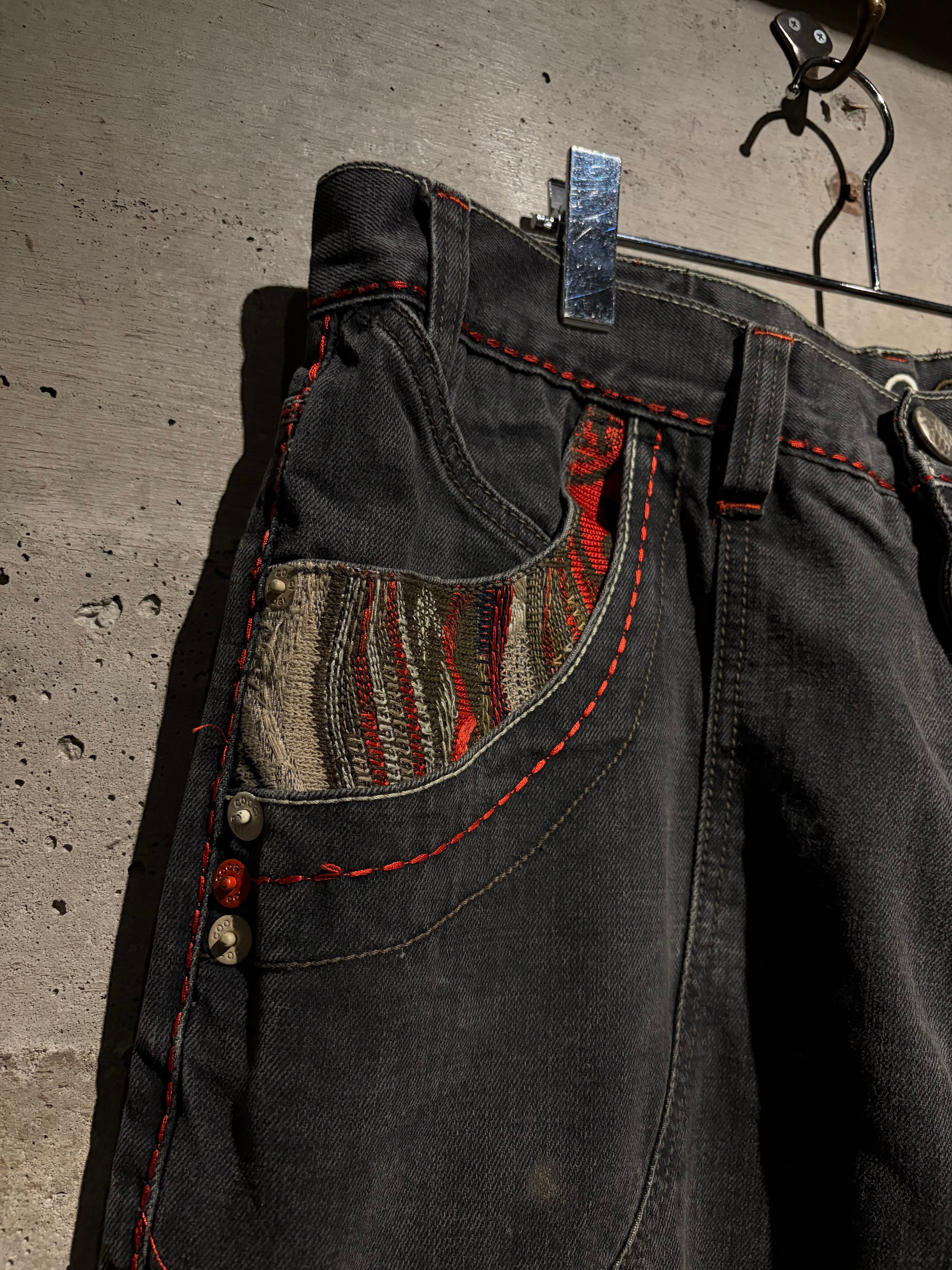 味わい深い風合いを漂わせるフェードの効いたデニムのボディに、フロント、バックポケットに、ブランドのアイデンティティである3Dニットを彷彿とさせる刺繍を刻み込んだ至極の1本。