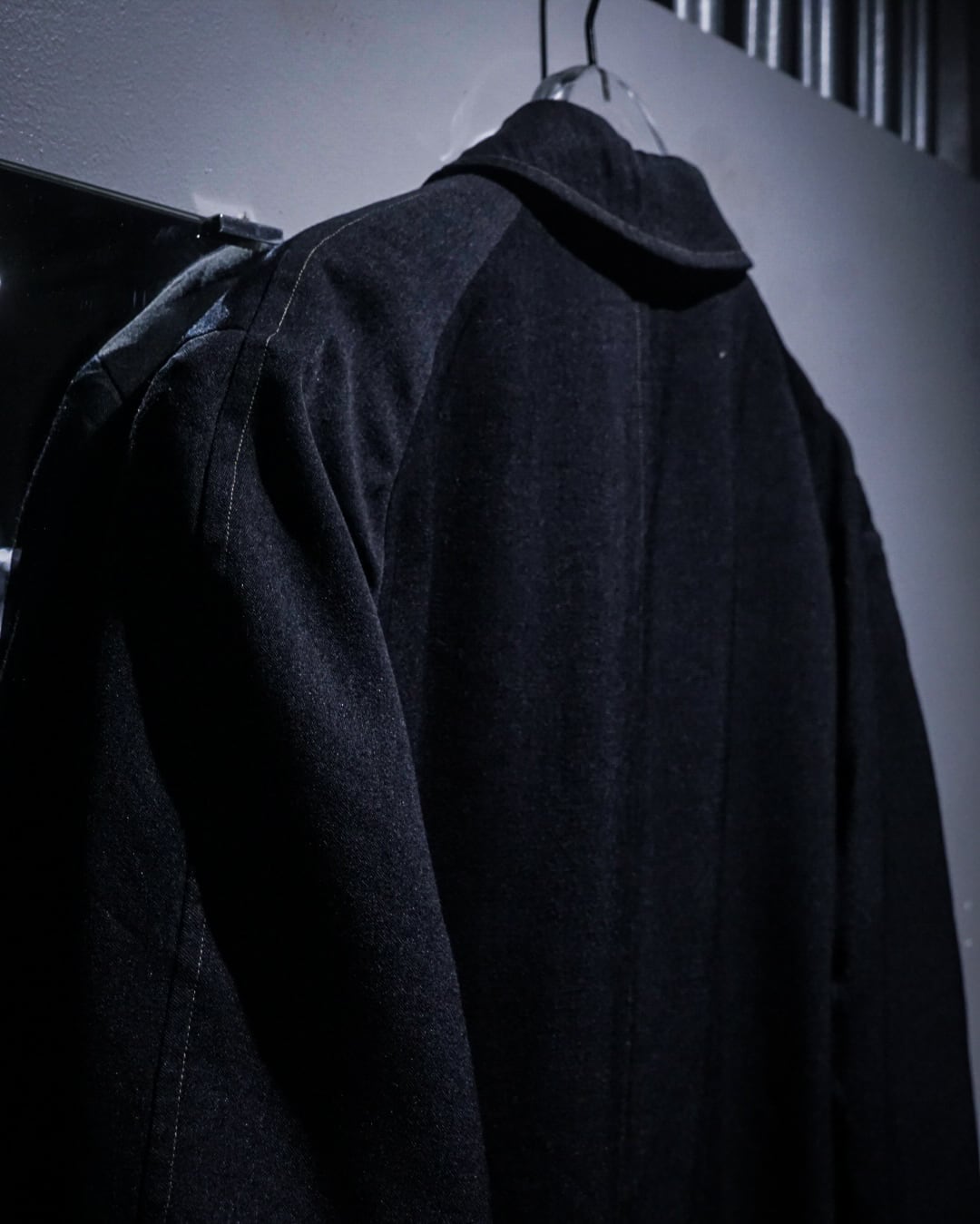 高密度に織られたウールギャバ特有のしなやかさとコシを併せ持ち、落ち着いたマットな表情ながら、着用時には動きに合わせて美しいドレープを演出。内側にはワインレッドの裏地を配し、色気のある表情を更に際立てています。