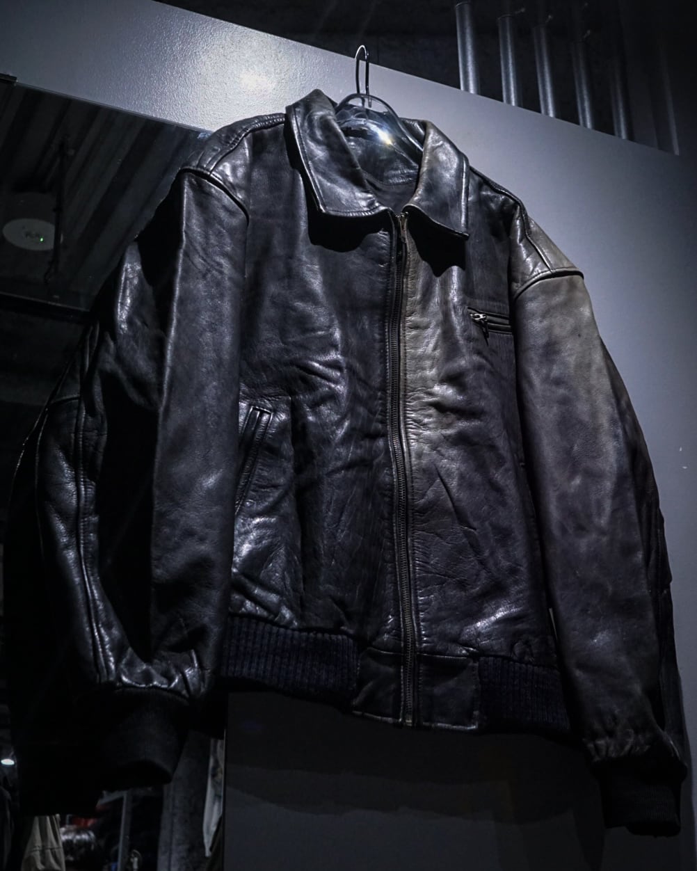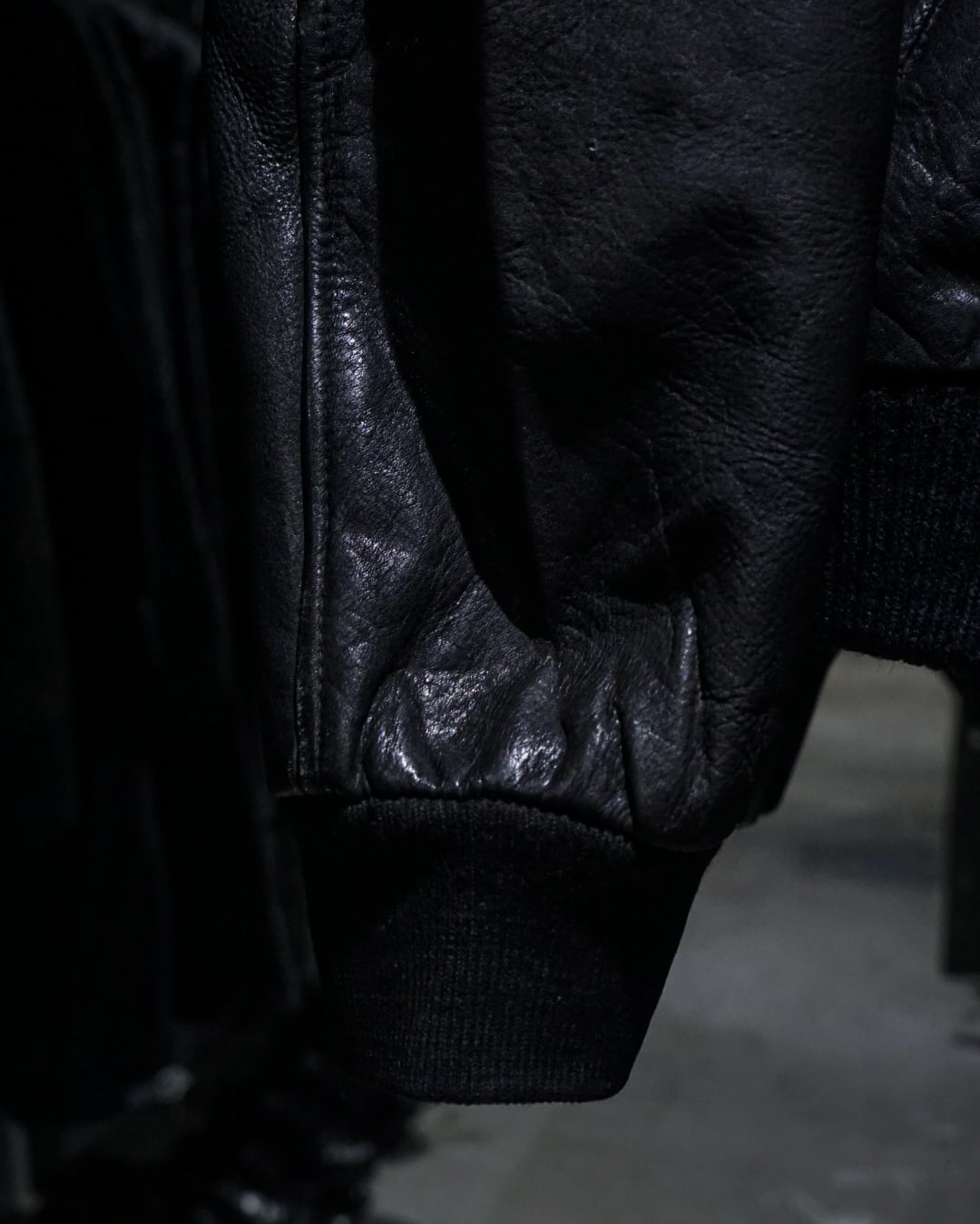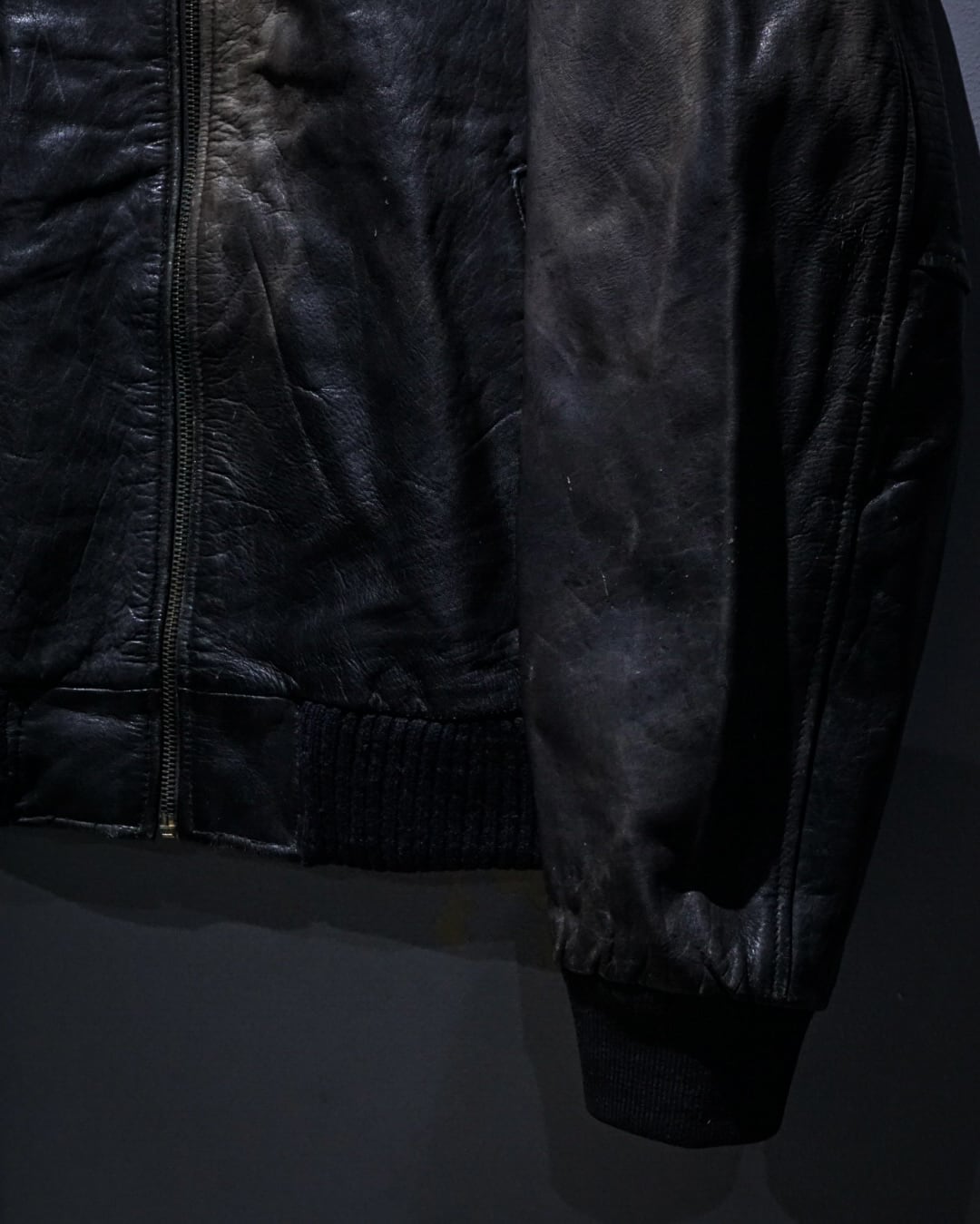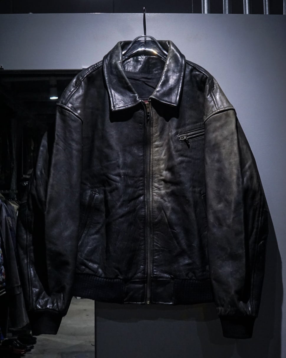 ハリとしなやかさを併せ持つブラックレザーを使用したボディに、美しいサンフェードが現れた、ボンバー型レザージャケット。