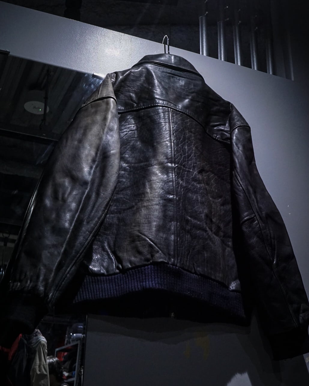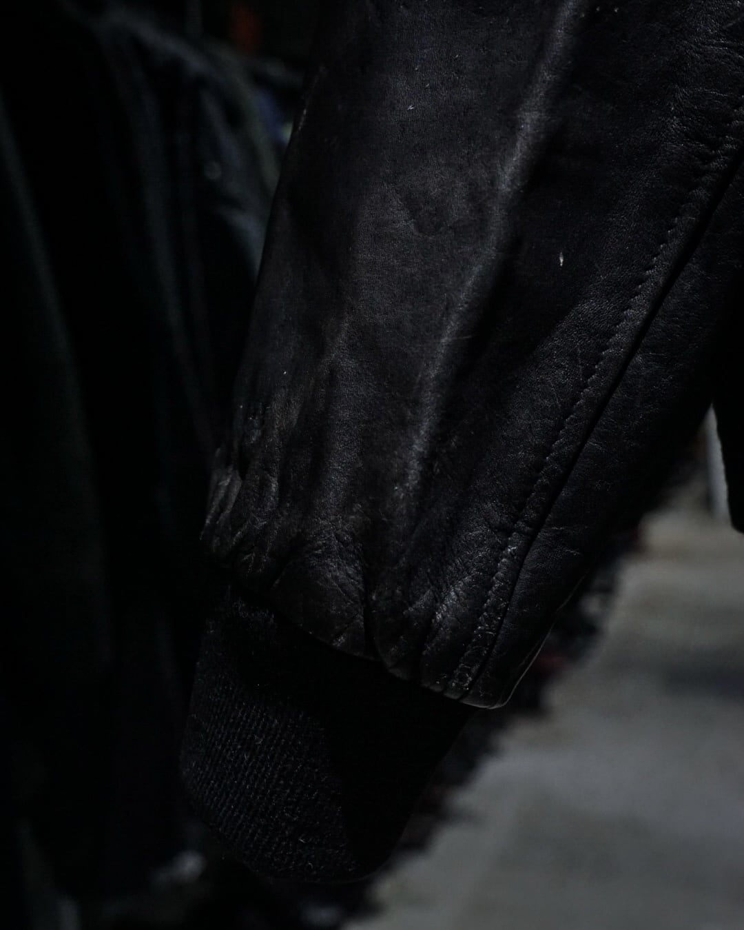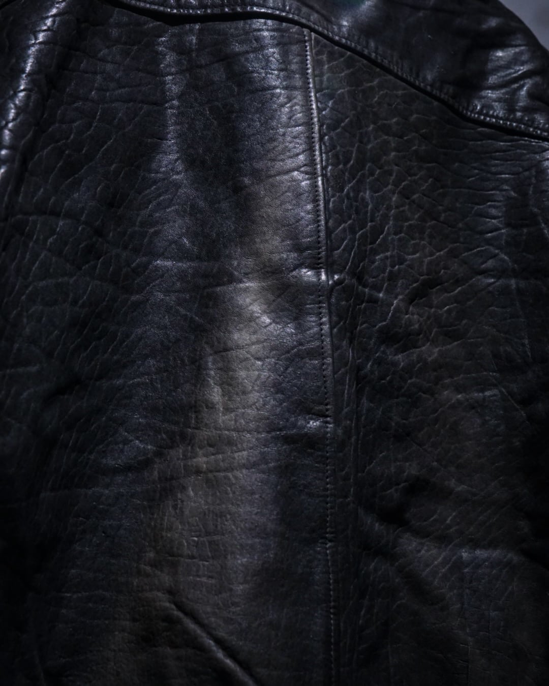 ハリとしなやかさを併せ持つブラックレザーを使用したボディに、美しいサンフェードが現れた、ボンバー型レザージャケット。