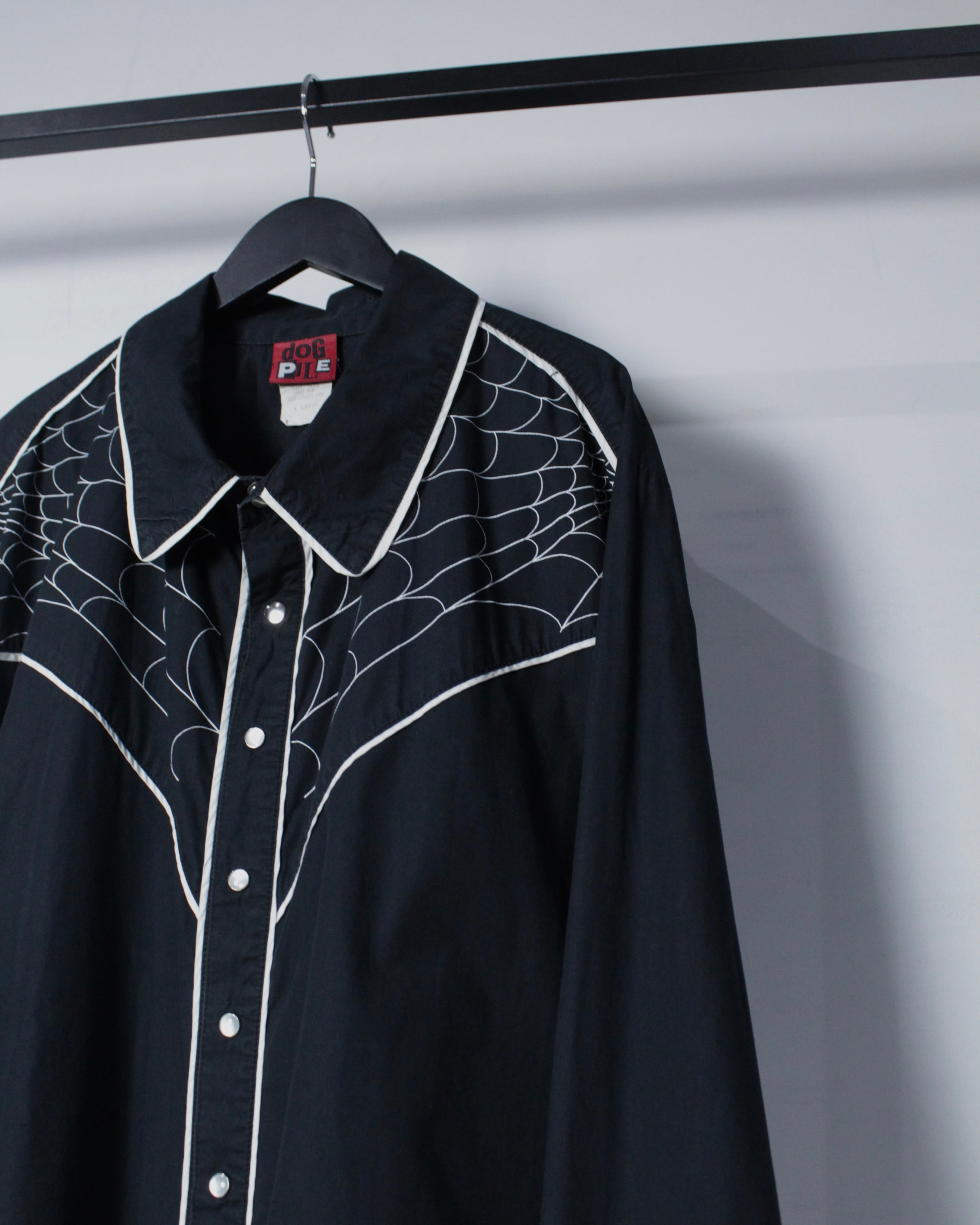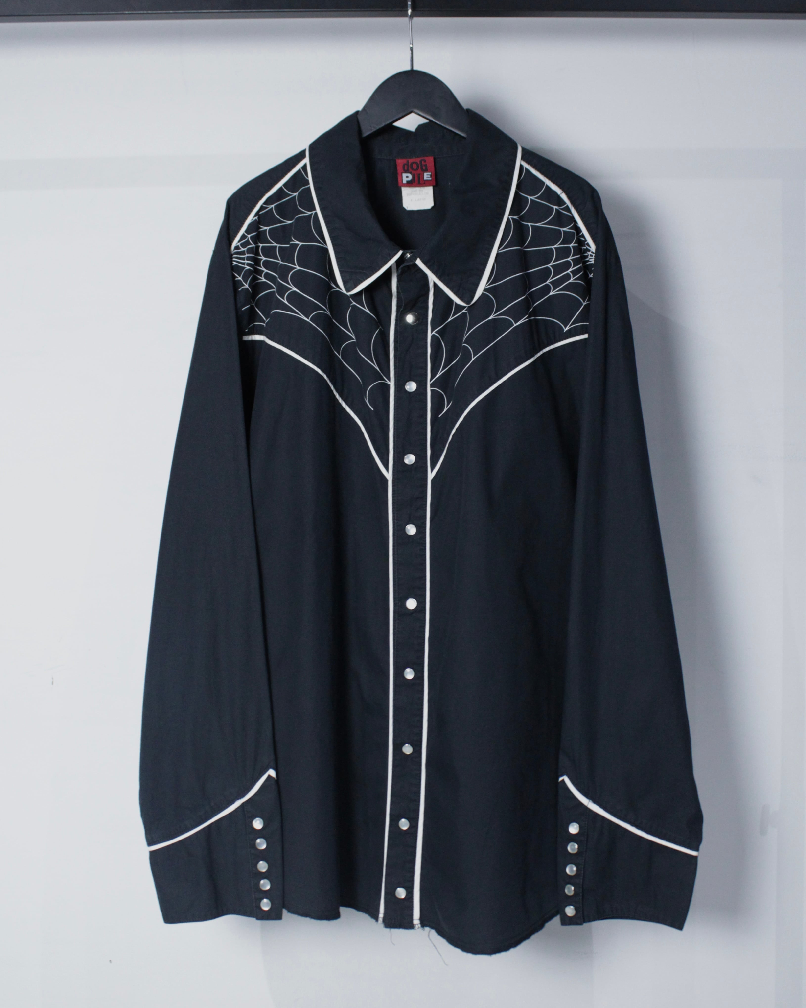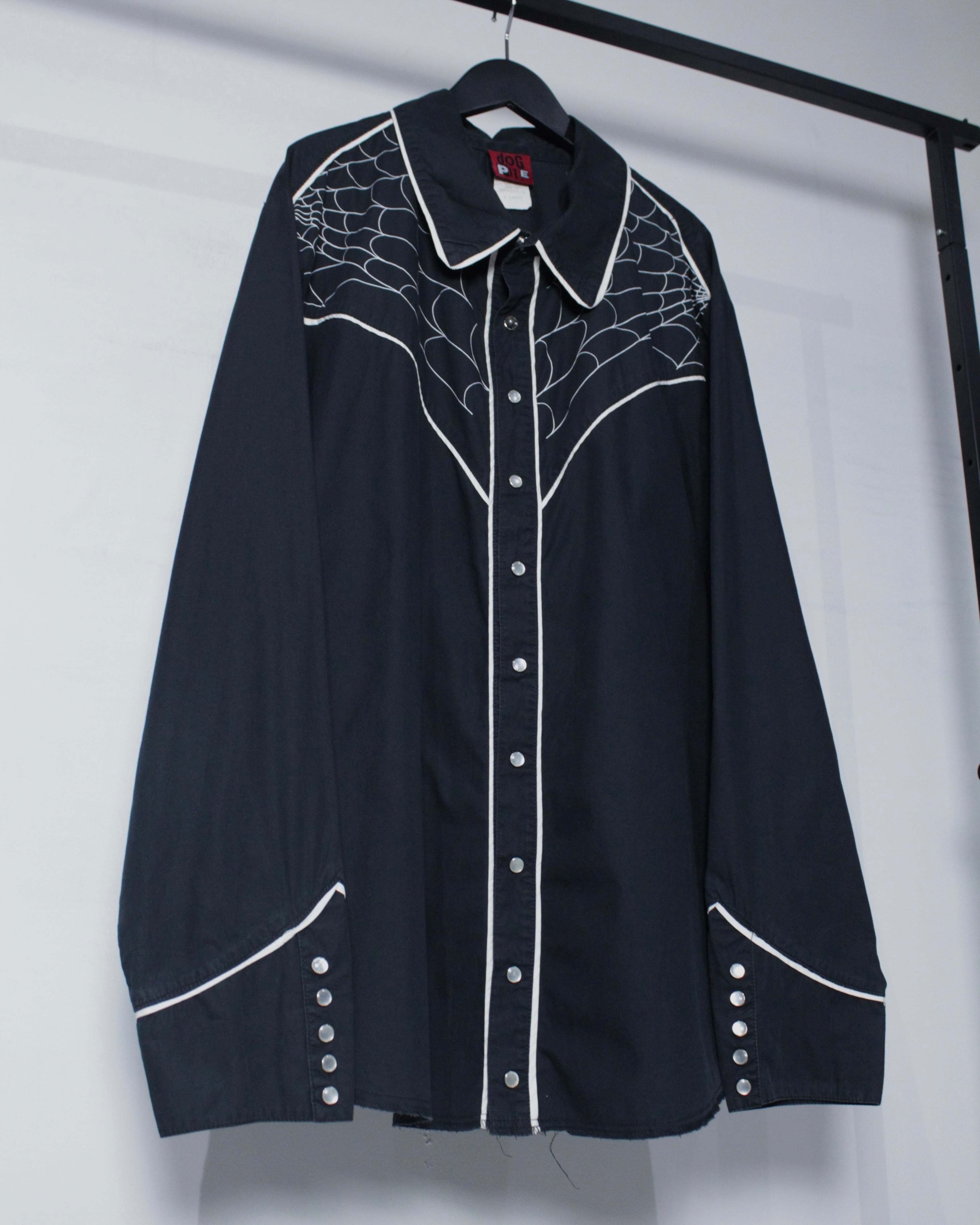 ブラックボディをベースに、ウエスタンシャツならではのヨークラインを活かしながら、蜘蛛の巣モチーフの刺繍を大胆に落とし込んだ1着。
