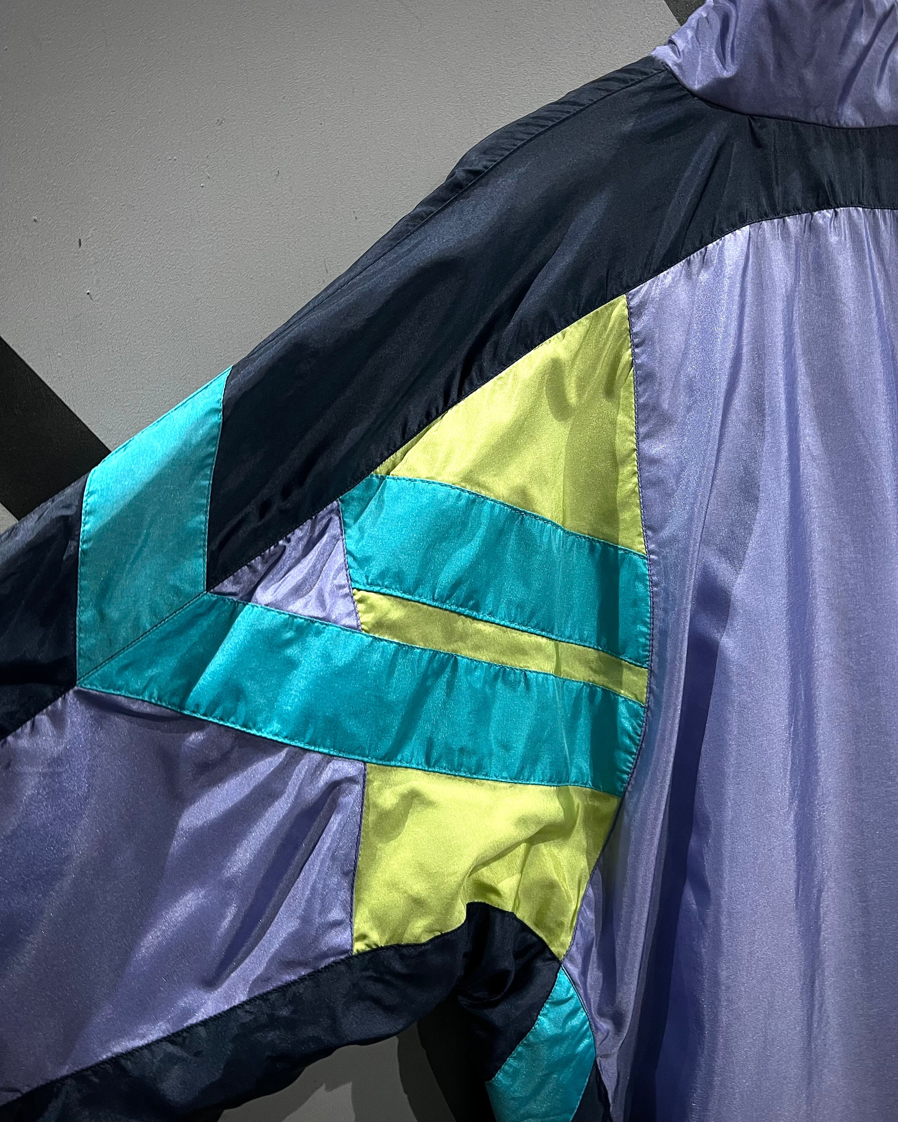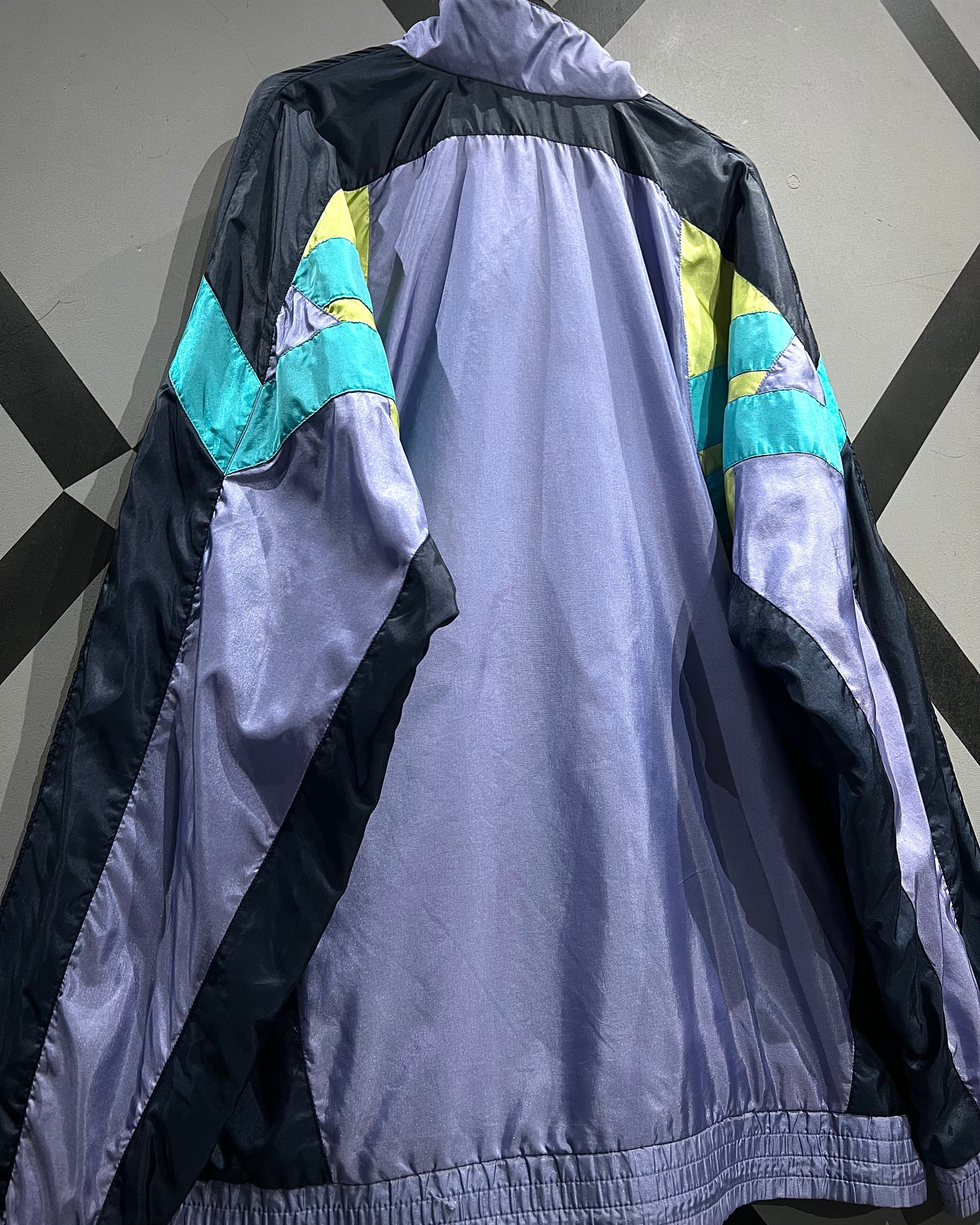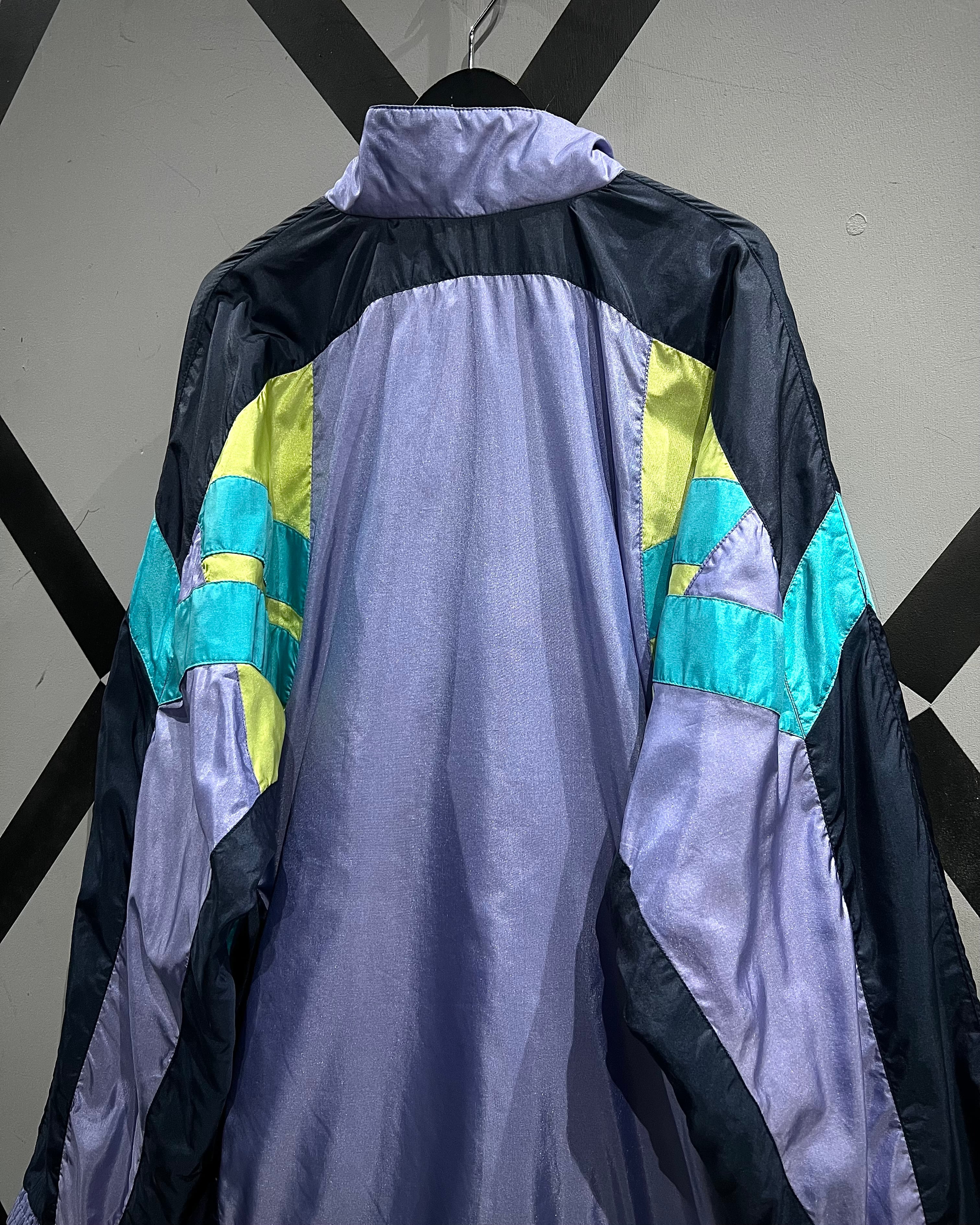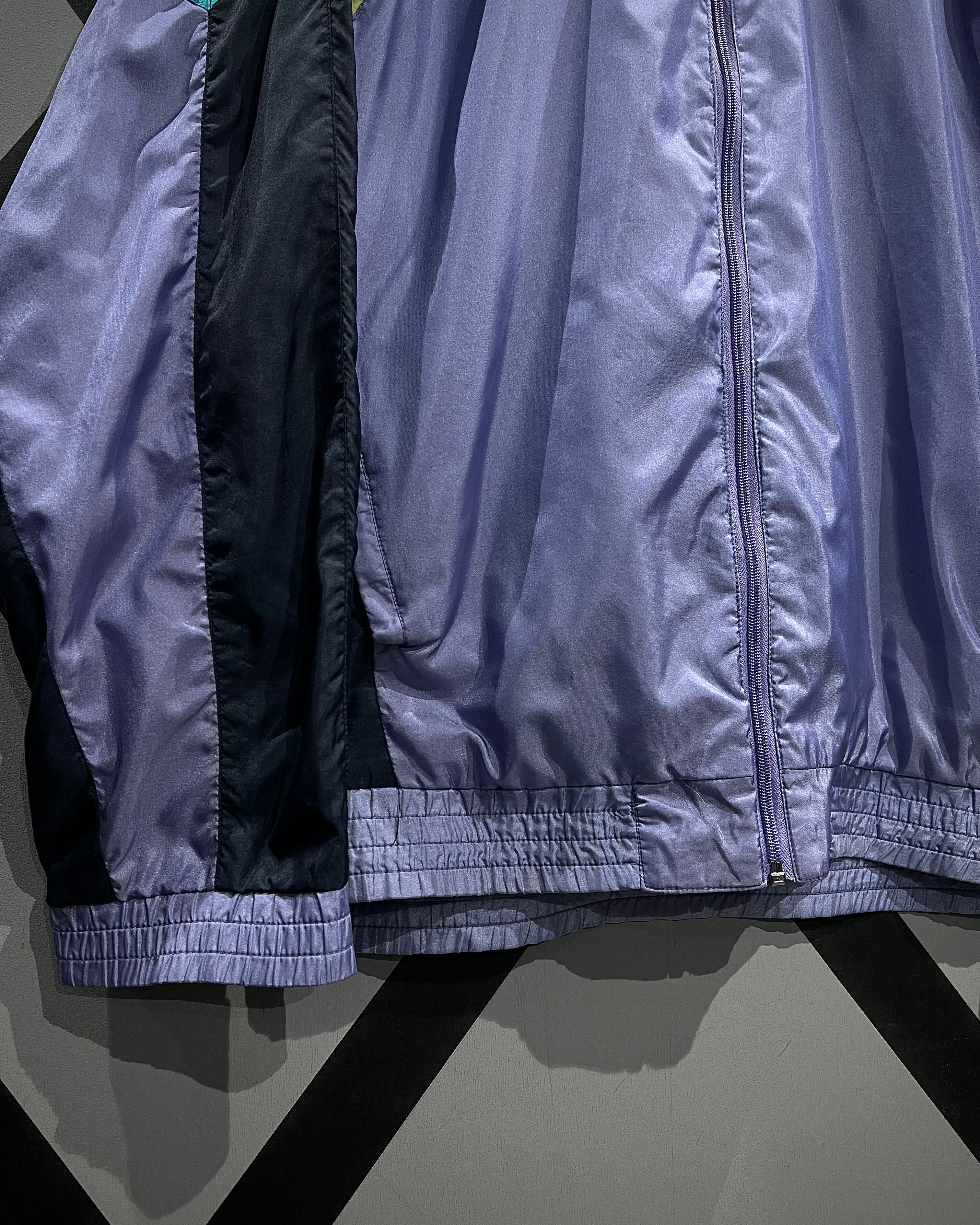 紫、紺、水色、黄色の配色で切り替え、この年代ならではのレトロながらフューチャリスティックなカラーリングが素晴らしいトラックジャケット。