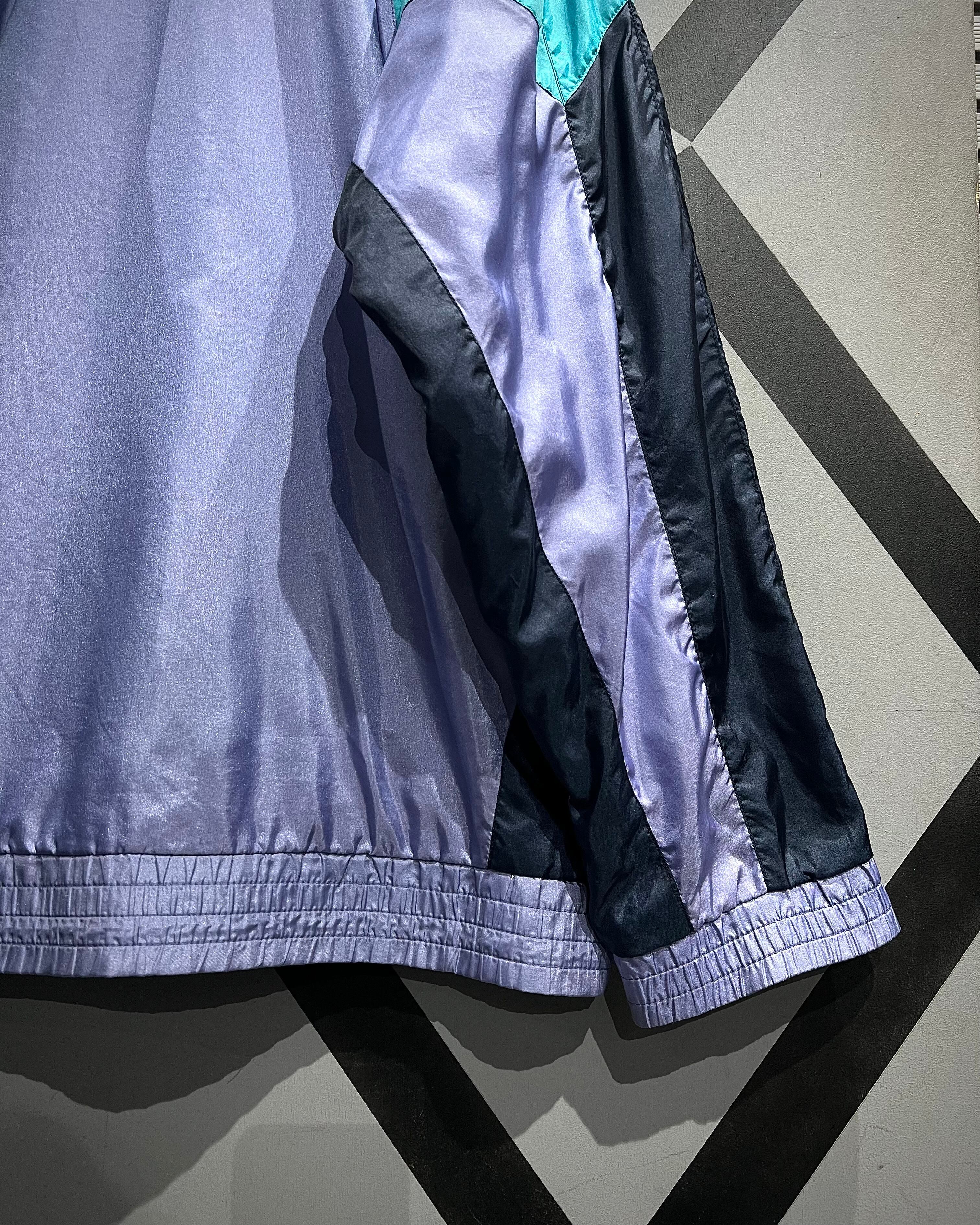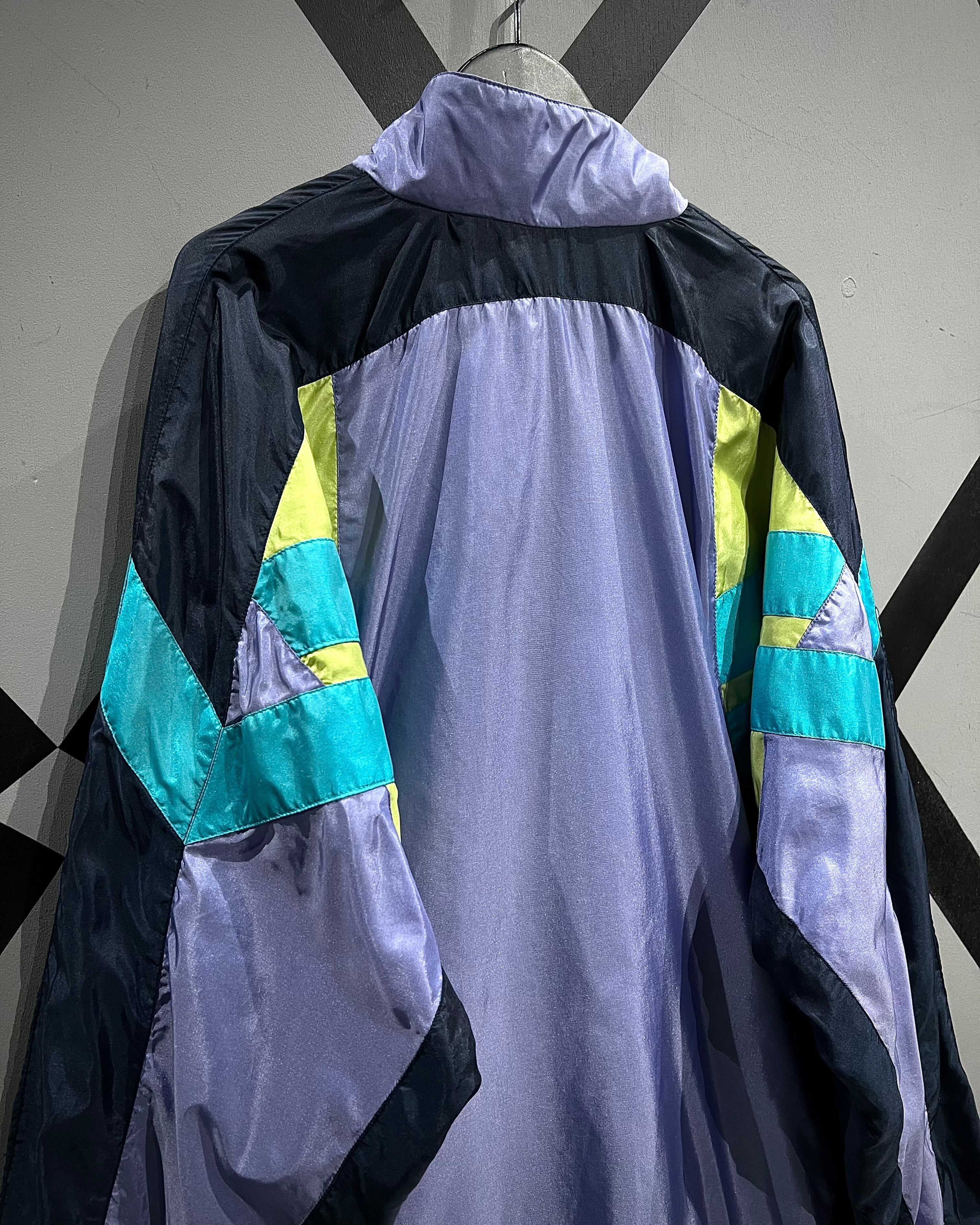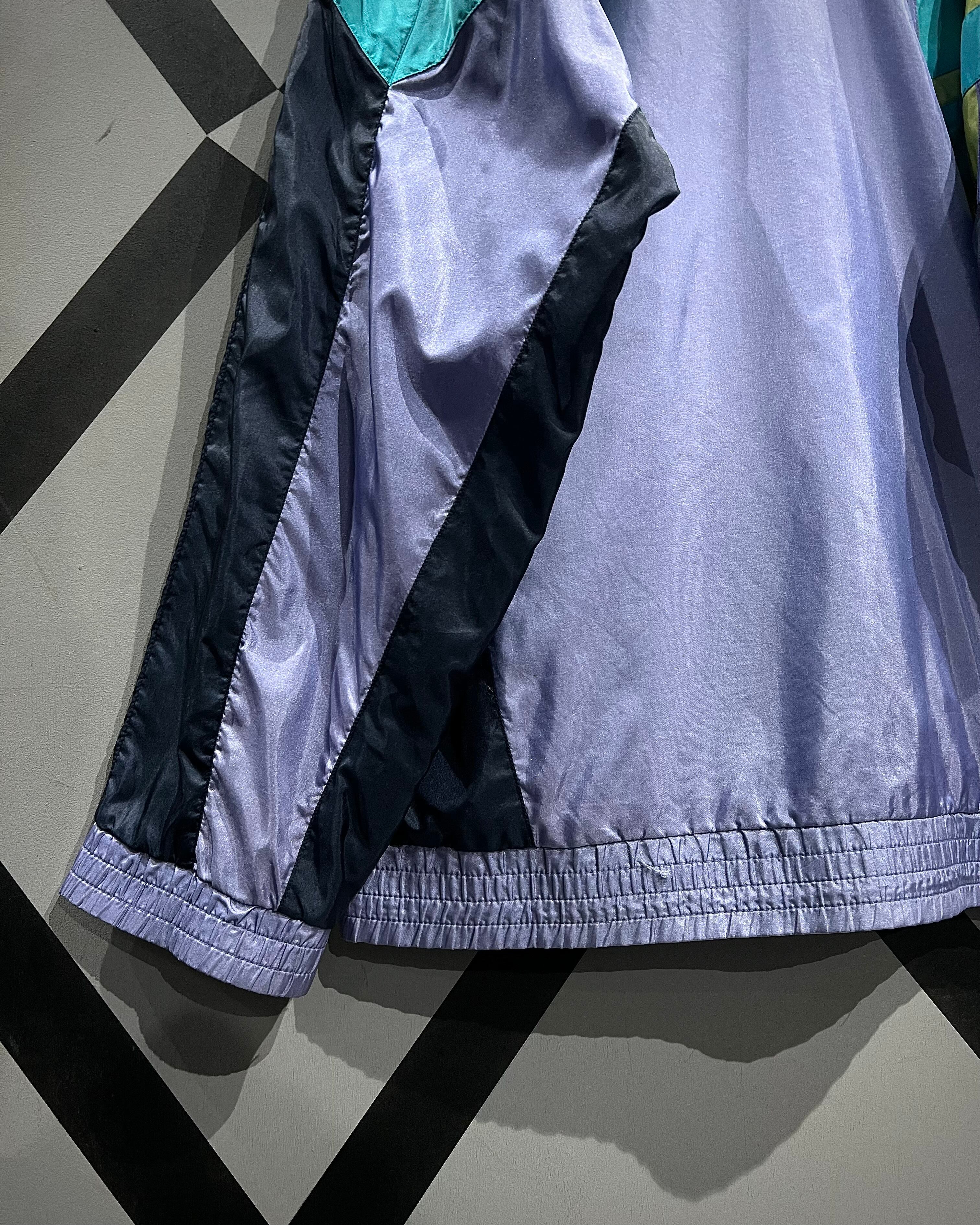 紫、紺、水色、黄色の配色で切り替え、この年代ならではのレトロながらフューチャリスティックなカラーリングが素晴らしいトラックジャケット。