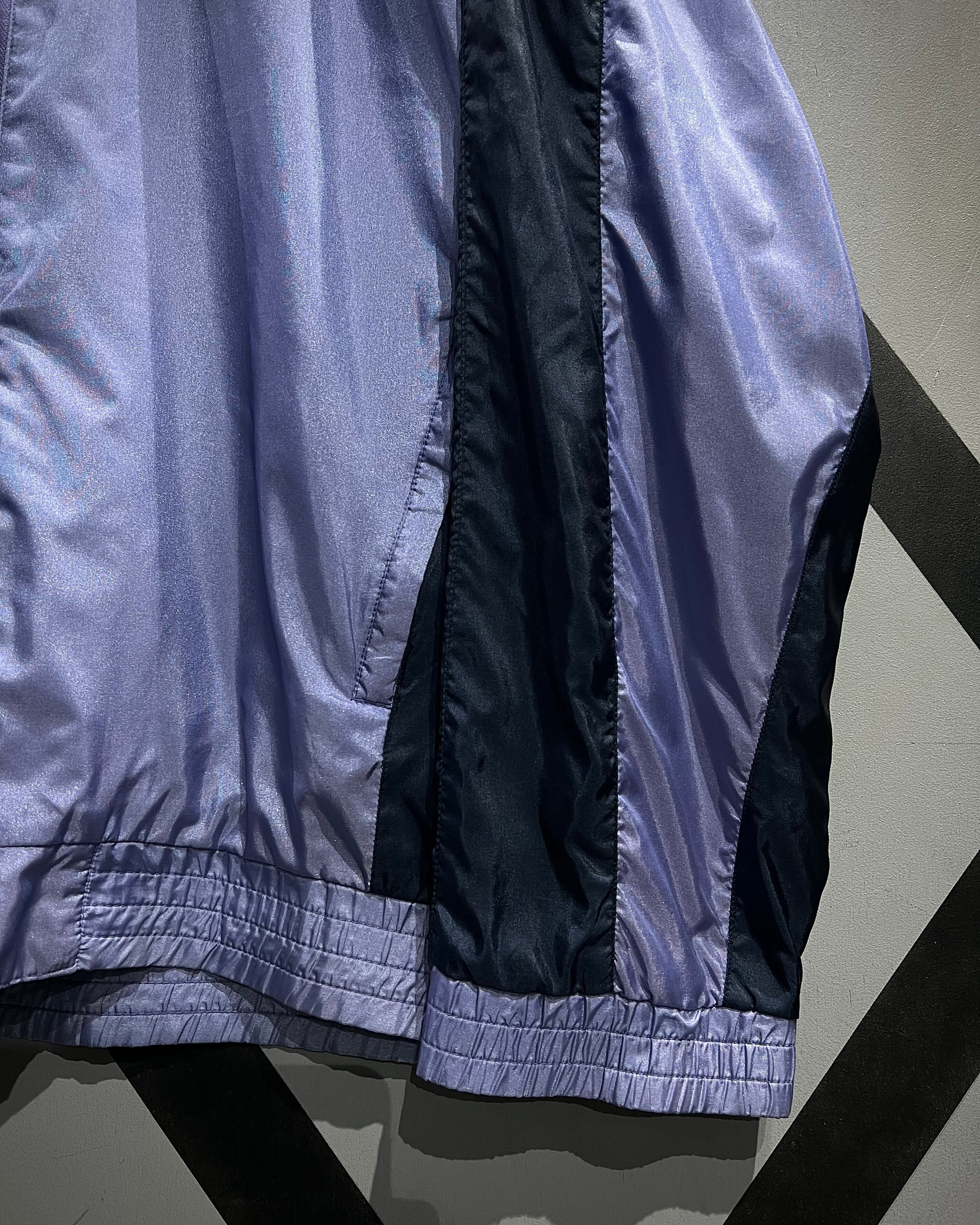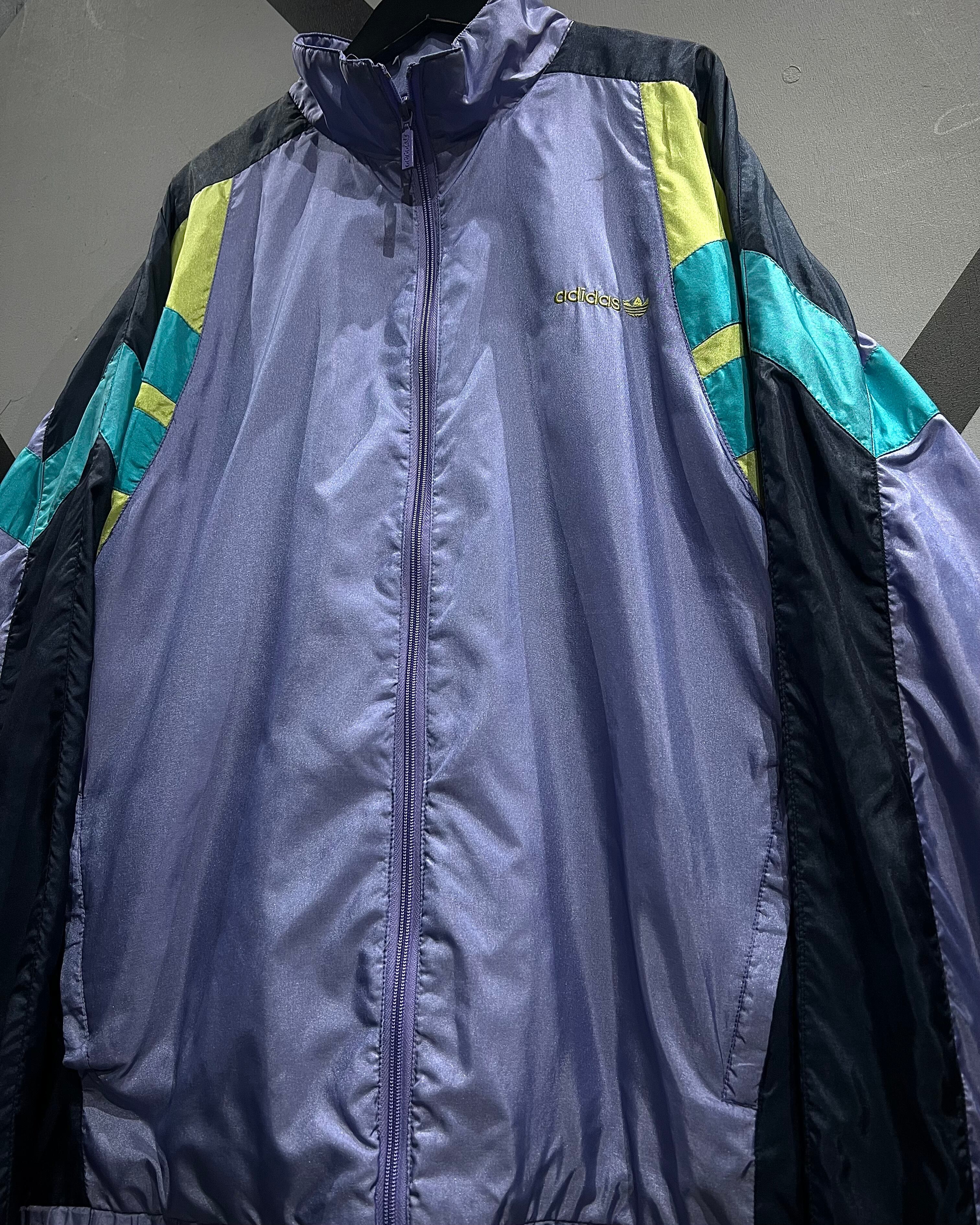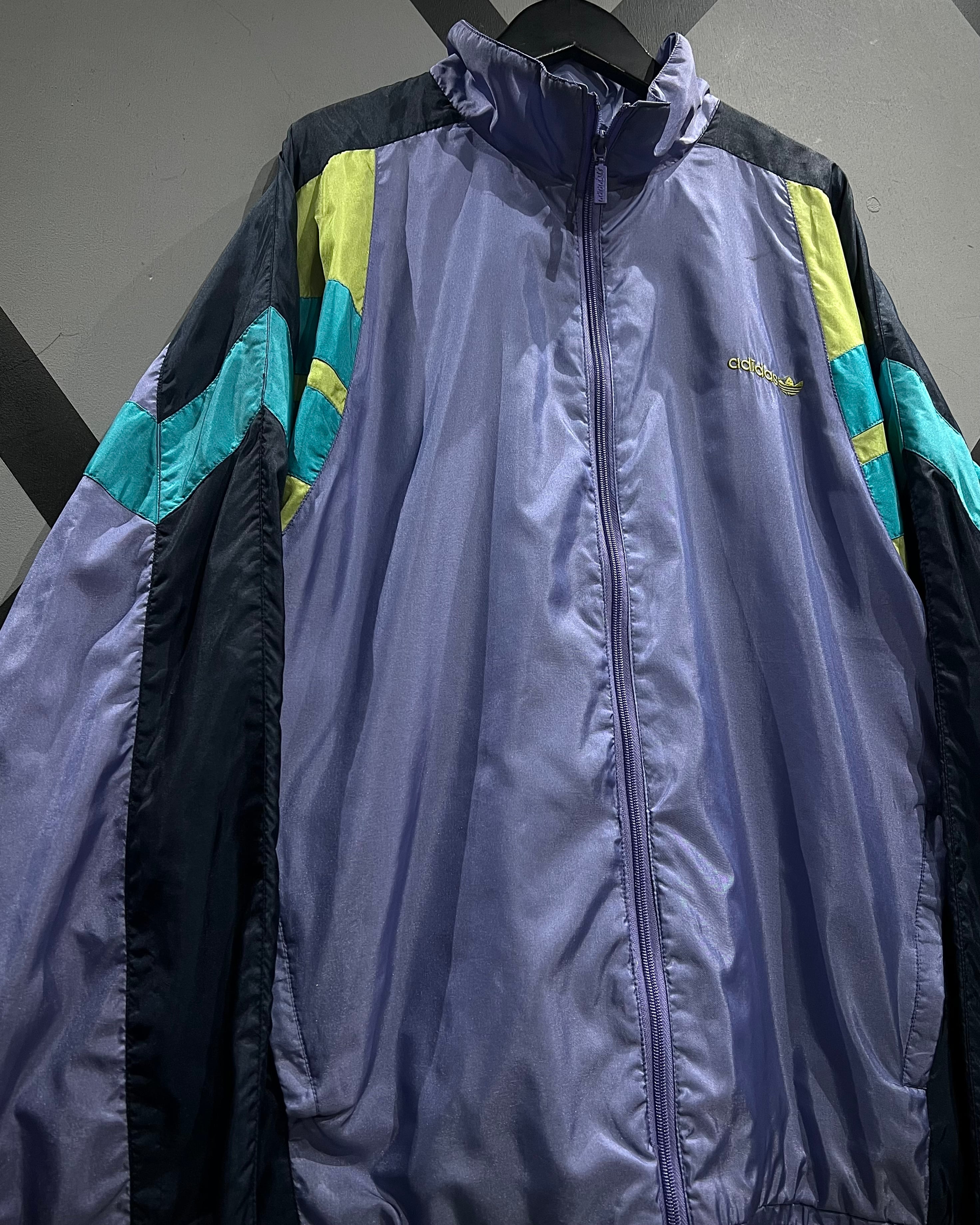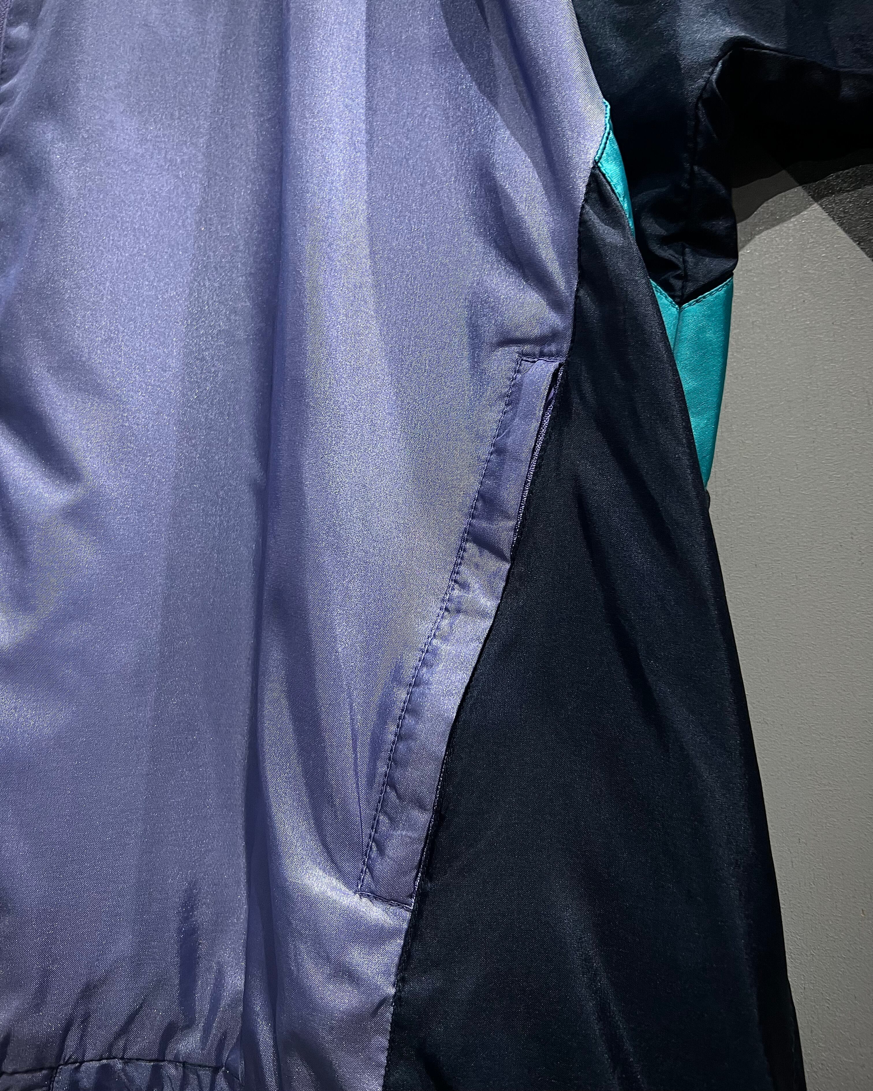 紫、紺、水色、黄色の配色で切り替え、この年代ならではのレトロながらフューチャリスティックなカラーリングが素晴らしいトラックジャケット。