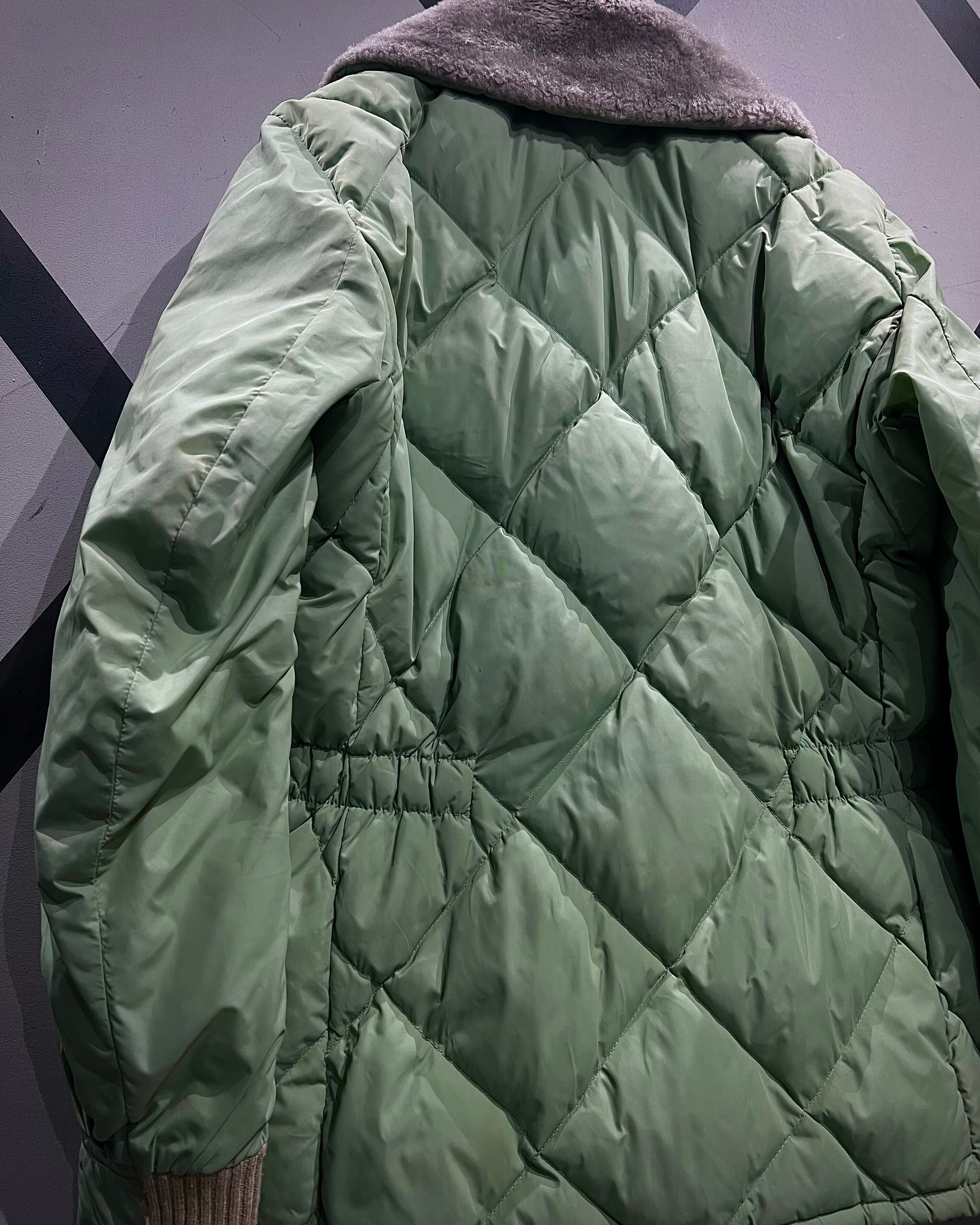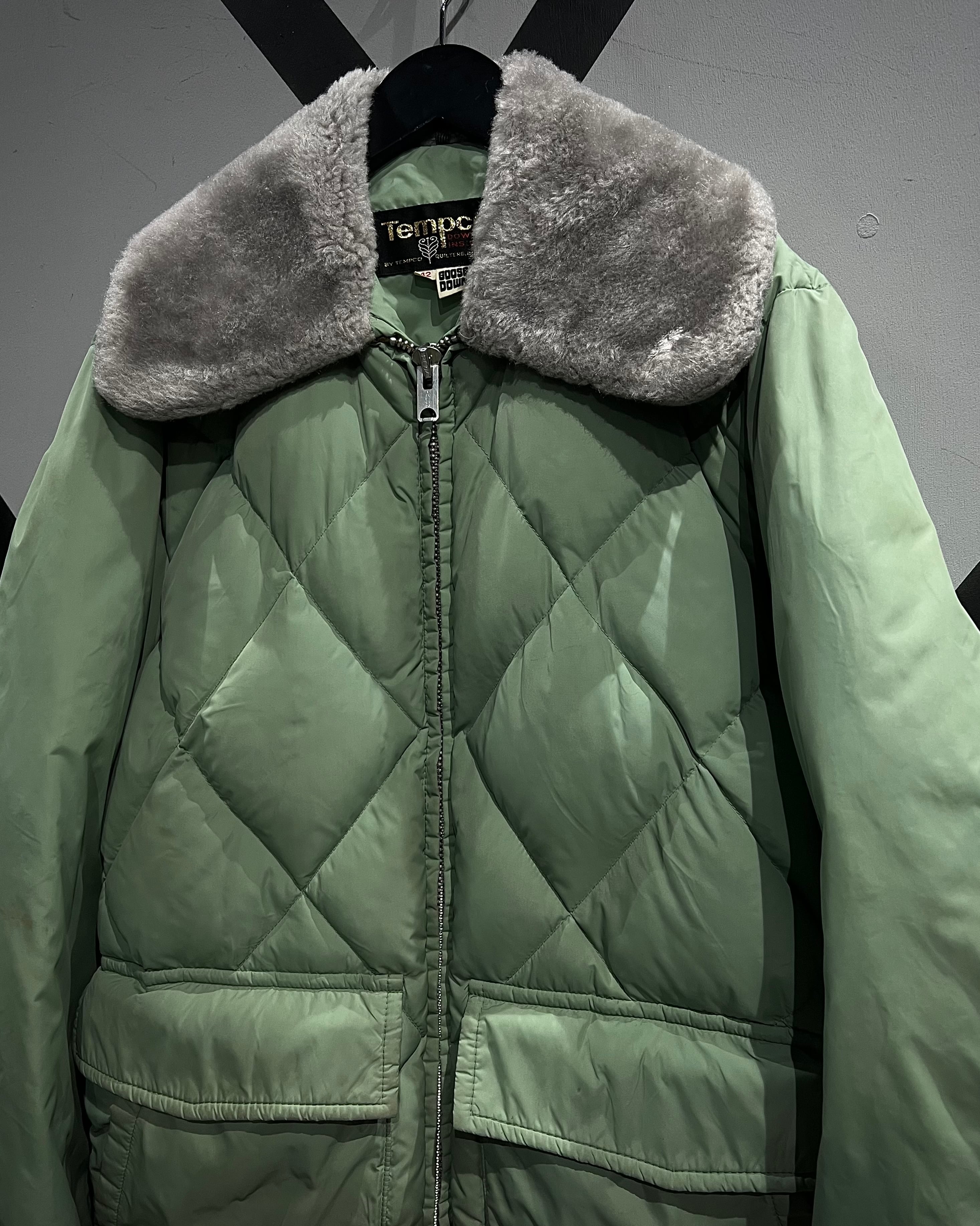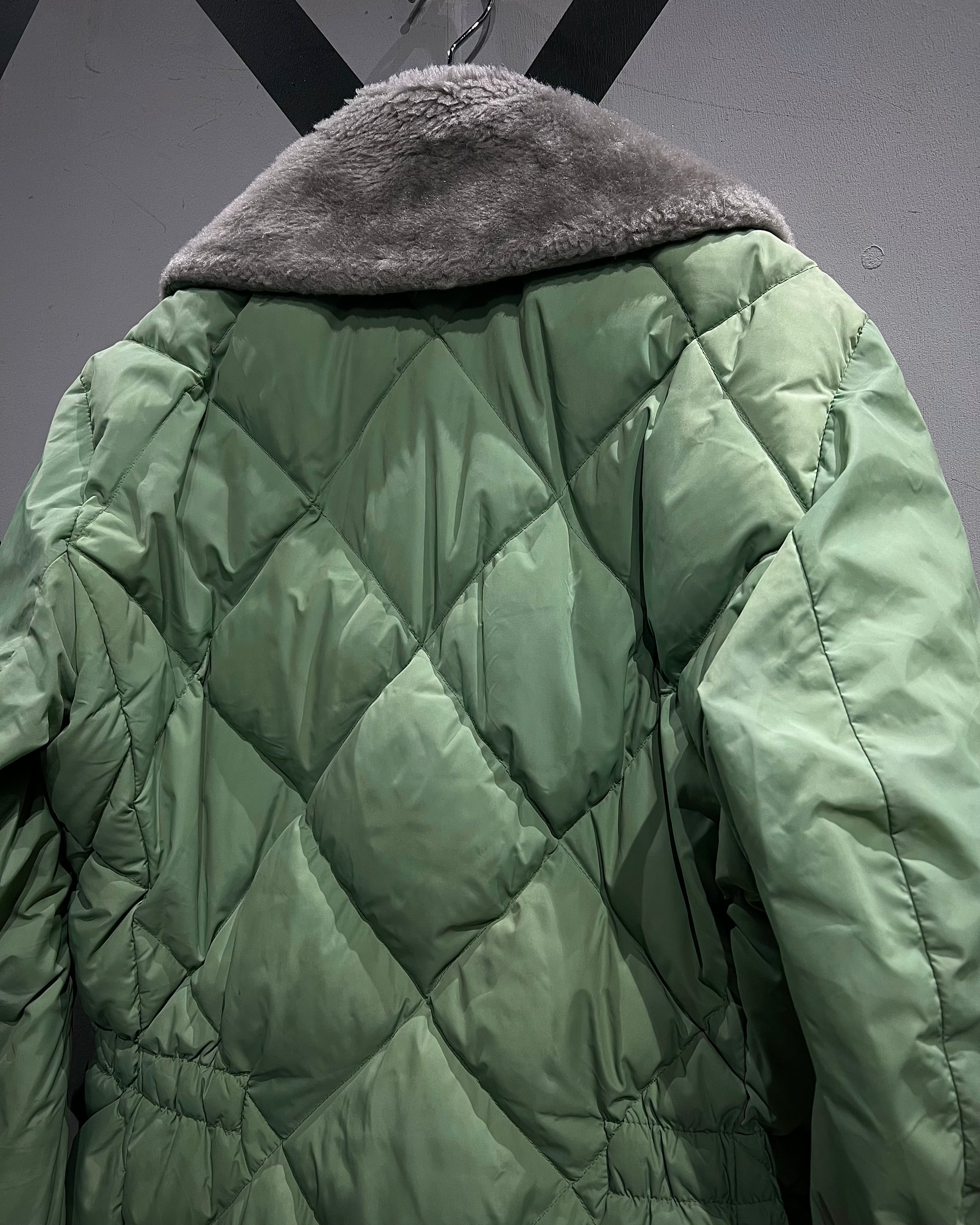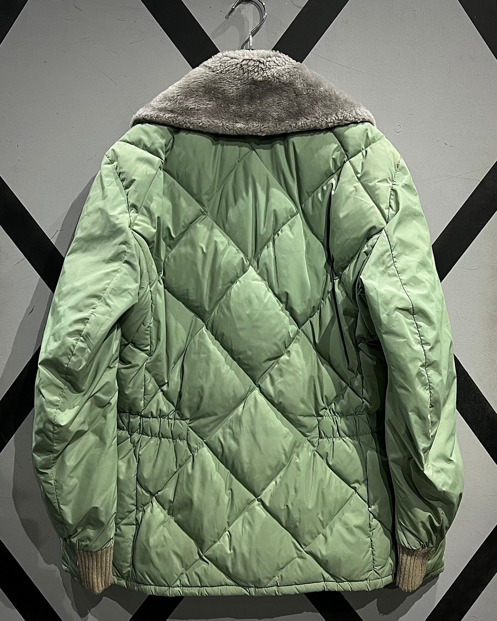 柔らかな発色のライトグリーンボディに、ボリューム感のあるグレーカラーのファーを襟元へ配した、ヴィンテージらしい配色バランスが印象的な1着。