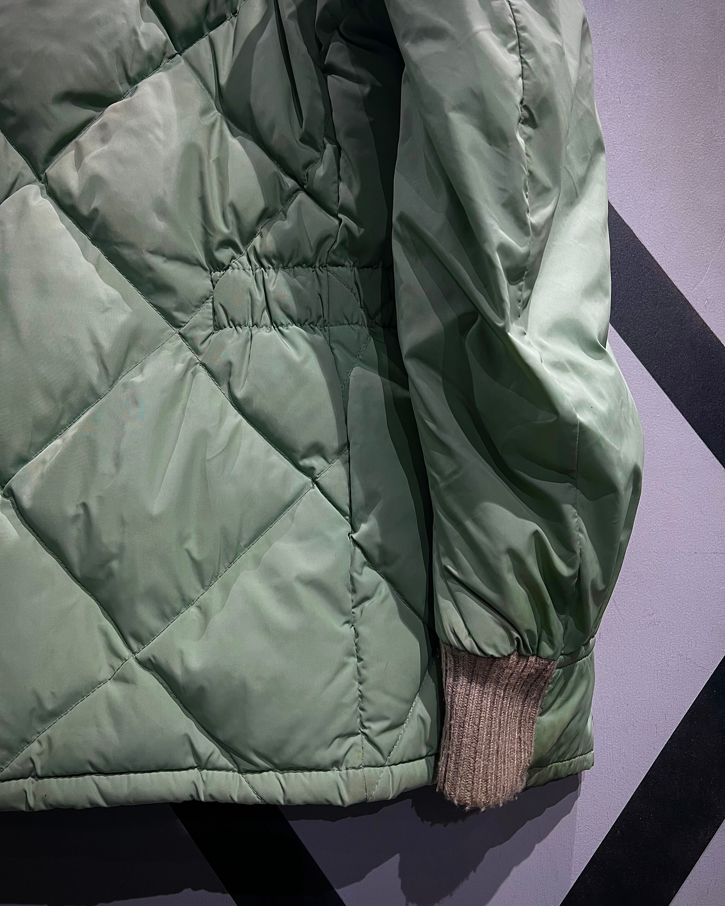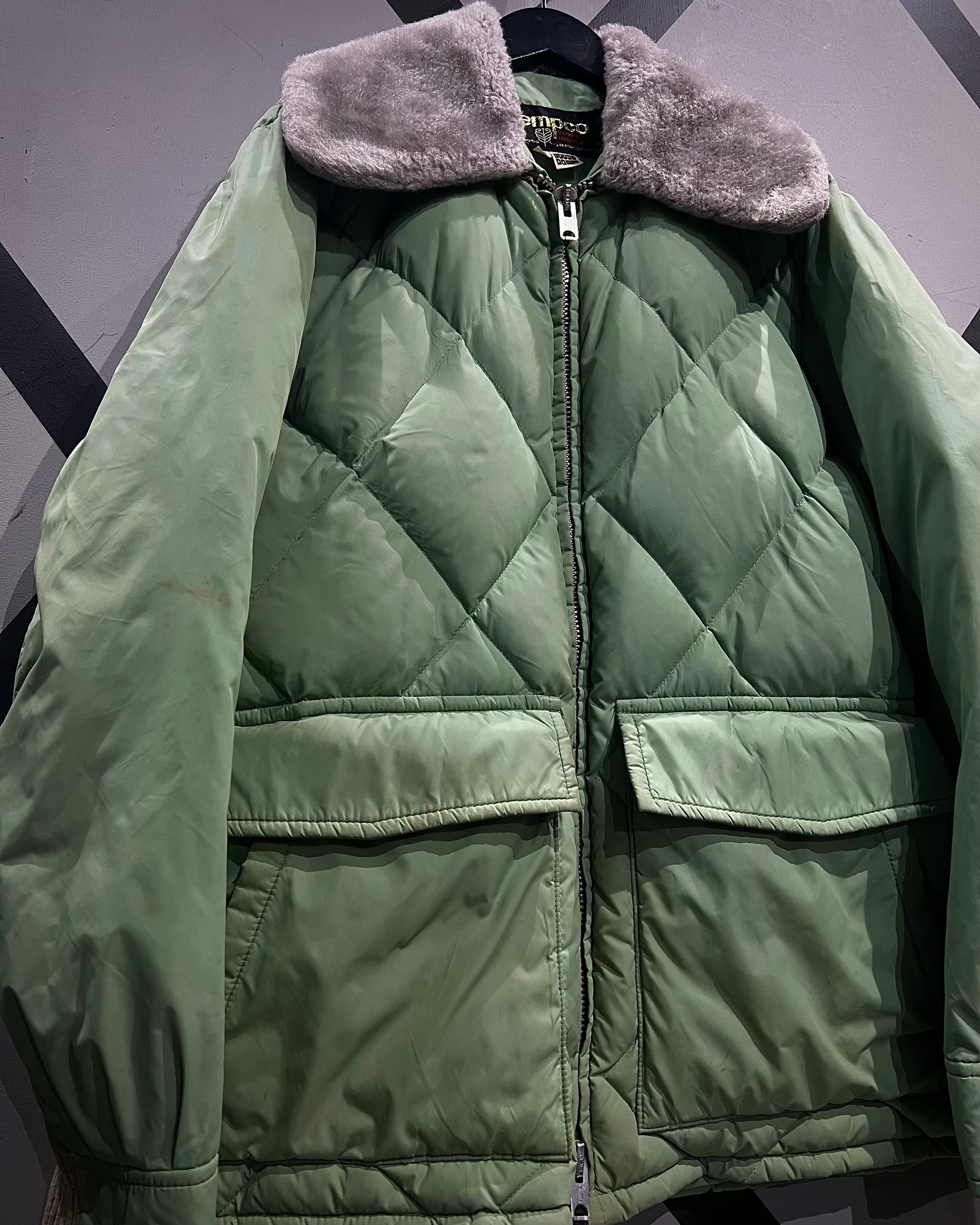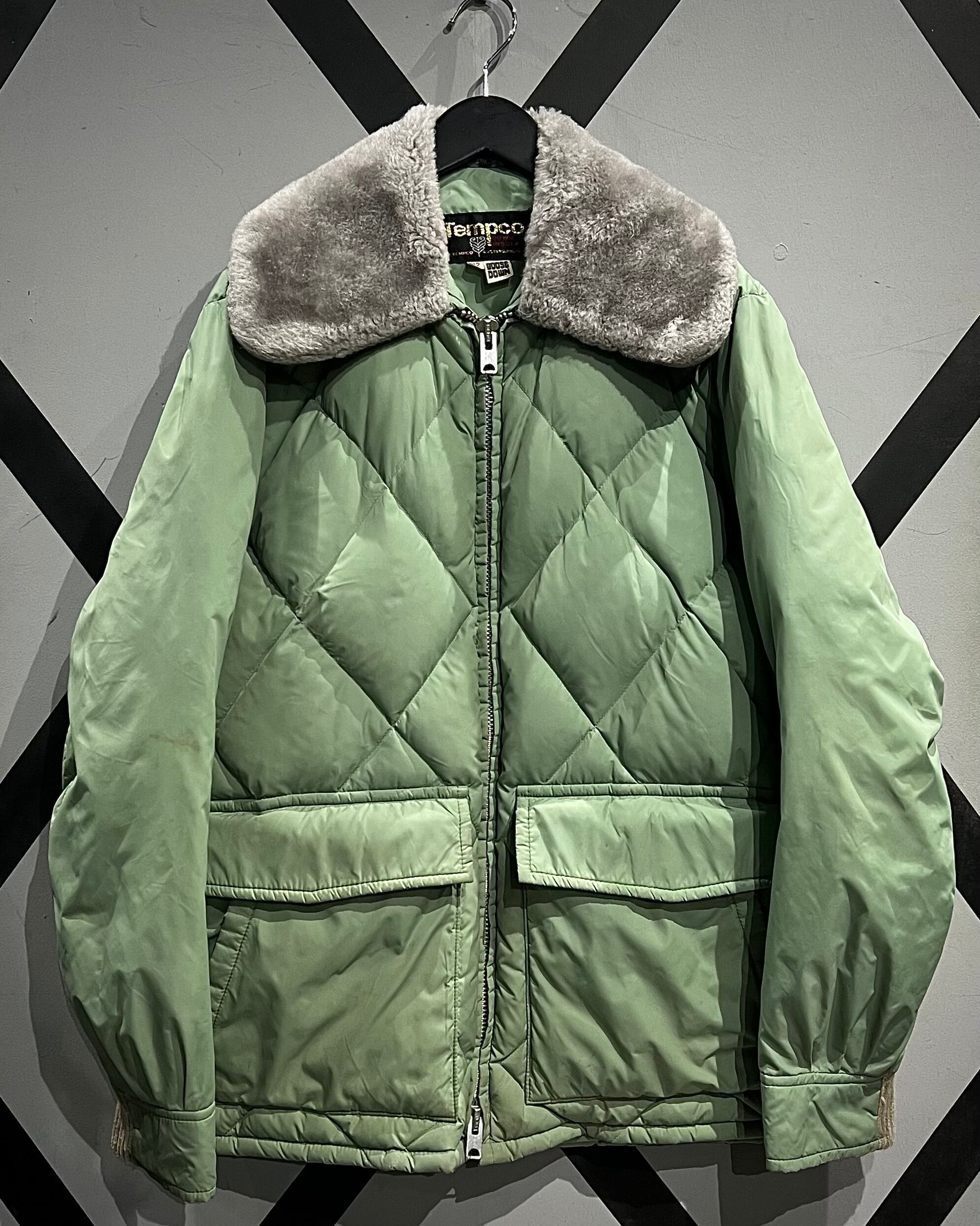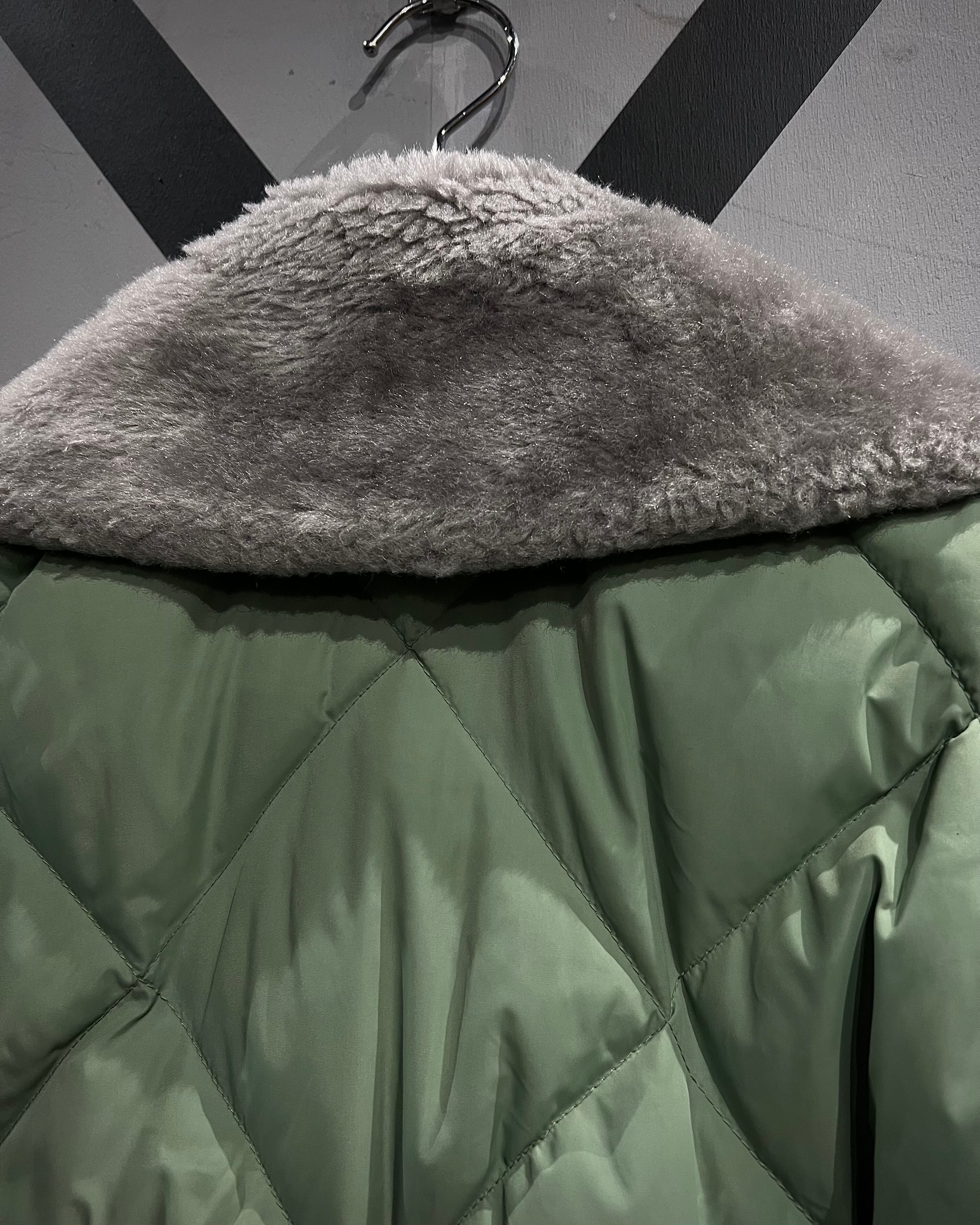 柔らかな発色のライトグリーンボディに、ボリューム感のあるグレーカラーのファーを襟元へ配した、ヴィンテージらしい配色バランスが印象的な1着。