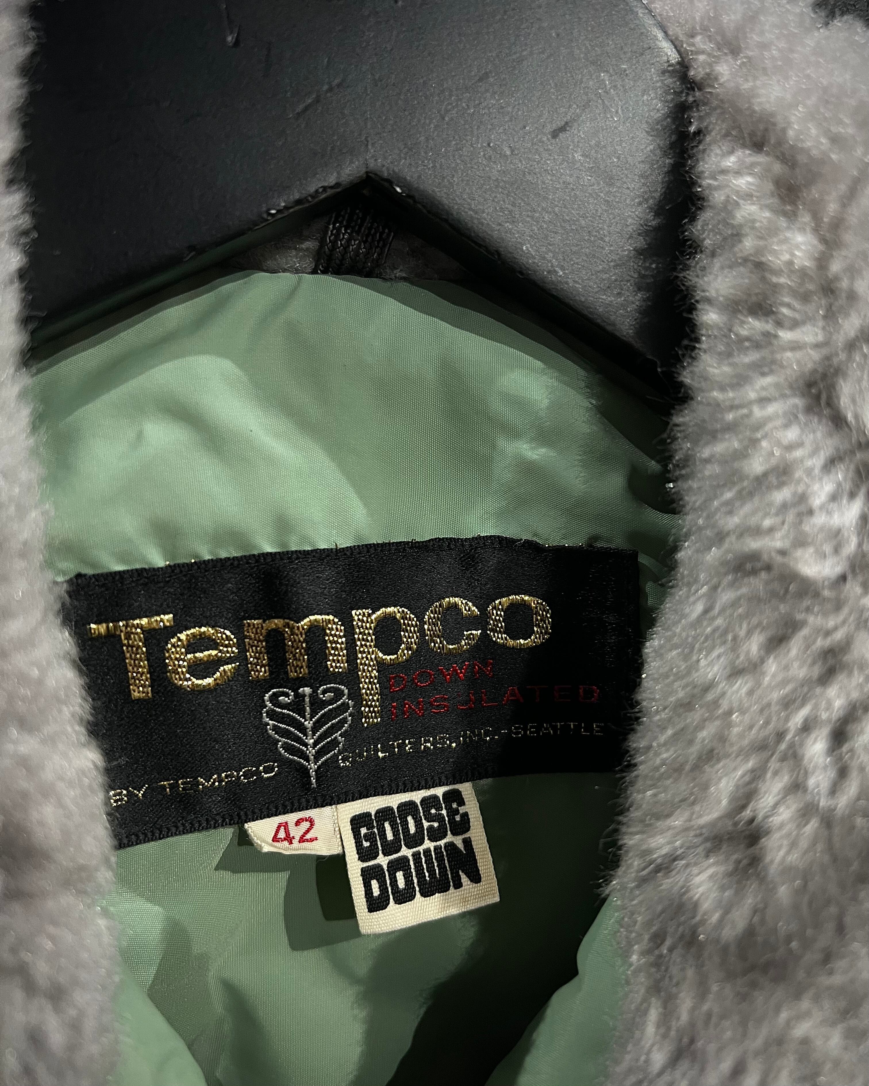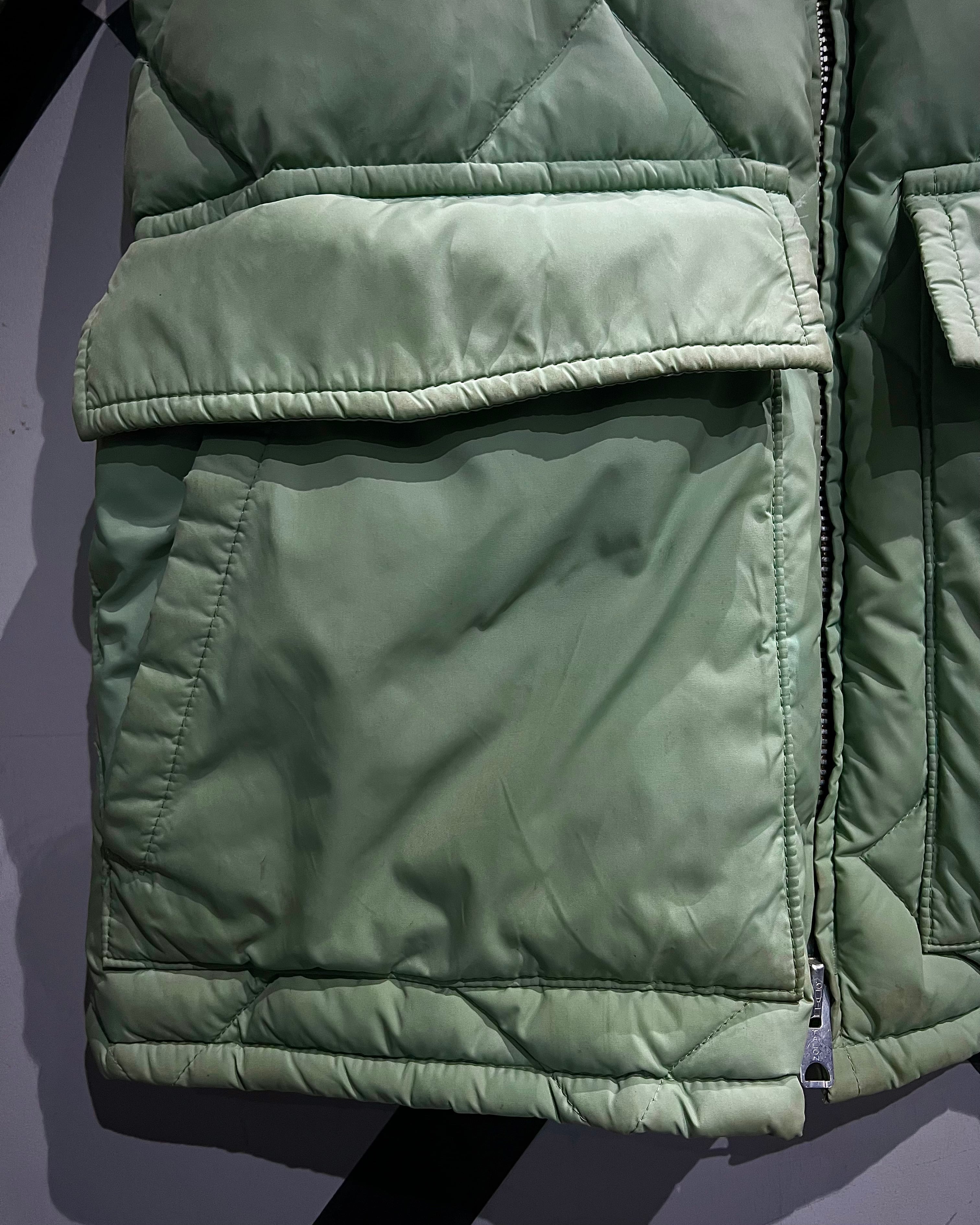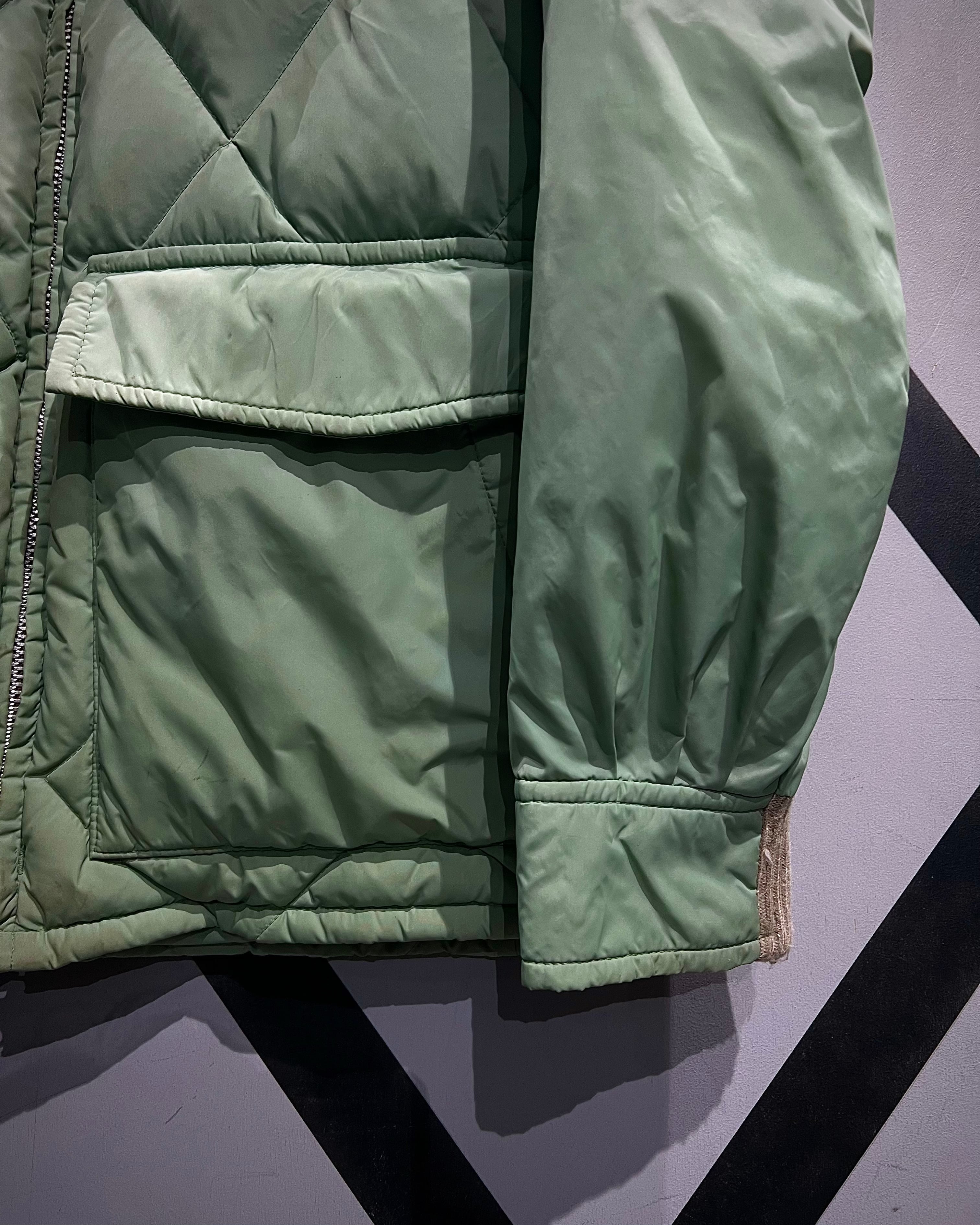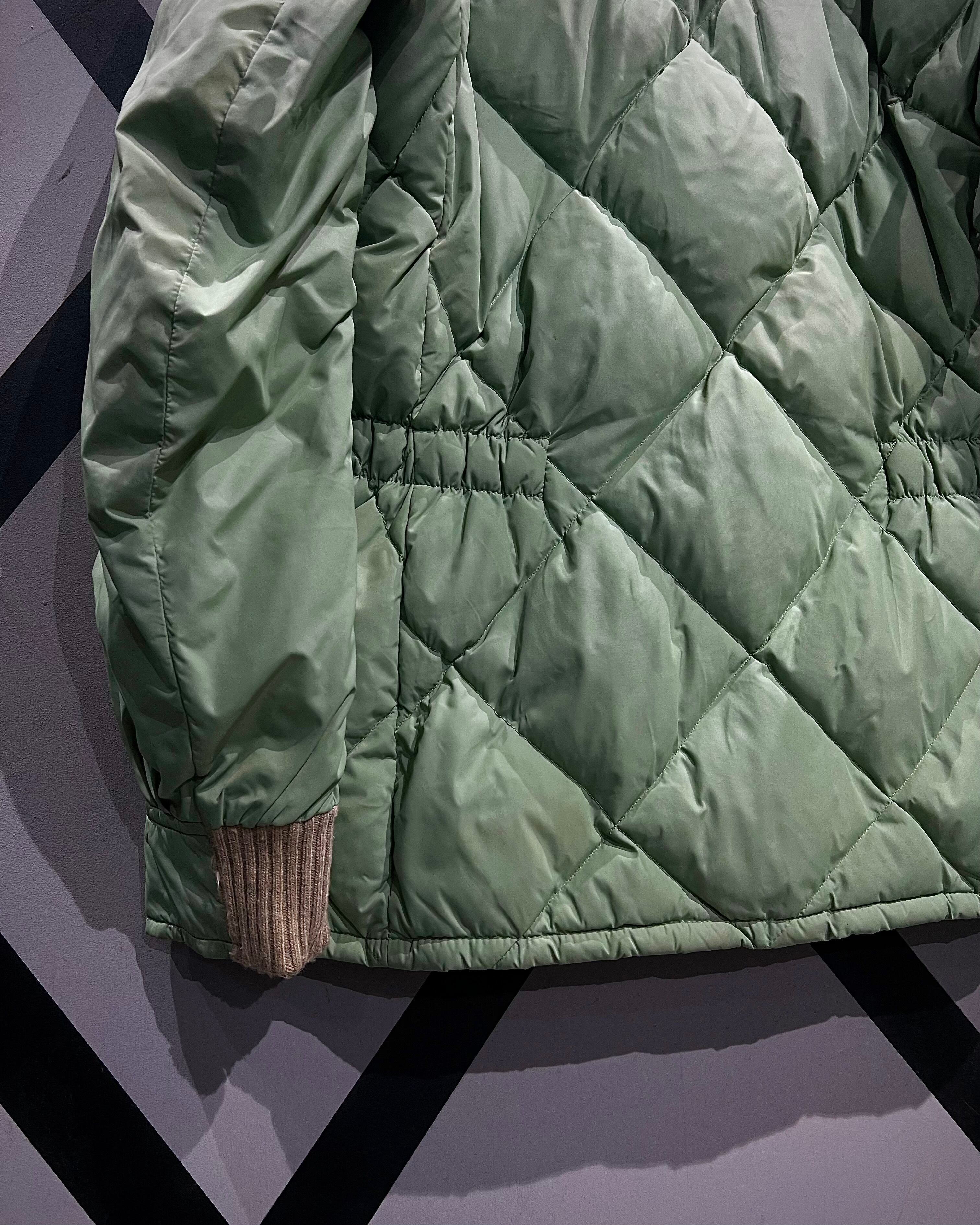 柔らかな発色のライトグリーンボディに、ボリューム感のあるグレーカラーのファーを襟元へ配した、ヴィンテージらしい配色バランスが印象的な1着。