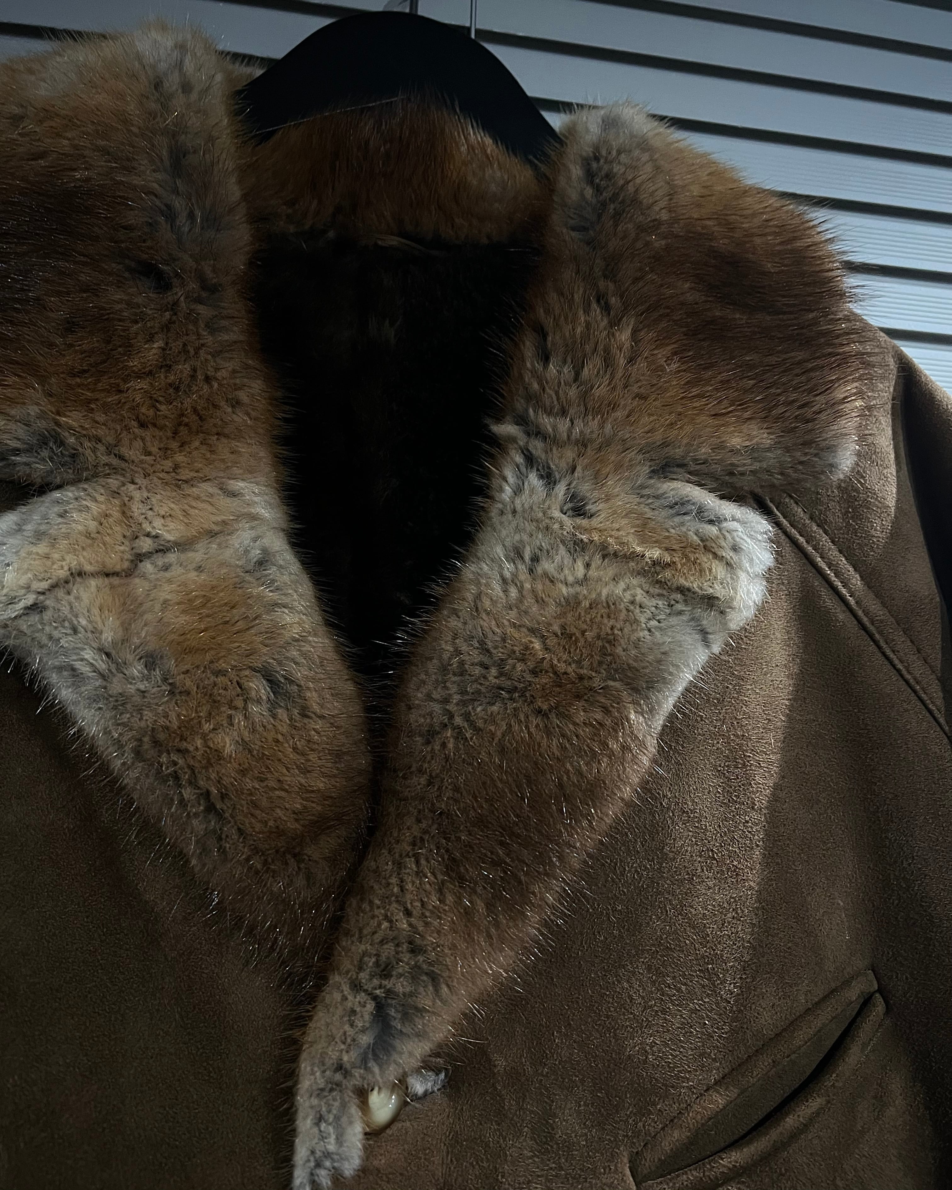大ぶりなファーカラーが顔まわりにボリュームを持たせ、クラシックかつラグジュアリーな印象を演出。フロントボタン仕様やハンドウォーマーポケット、袖口のベルトなど、実用性とデザイン性を兼ね備えたディテール構成も見逃せません。