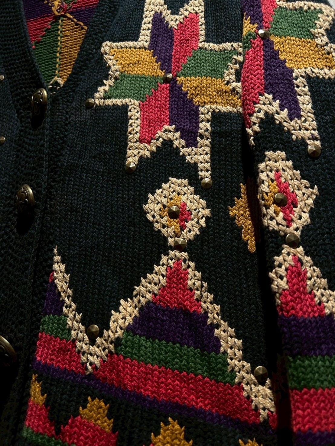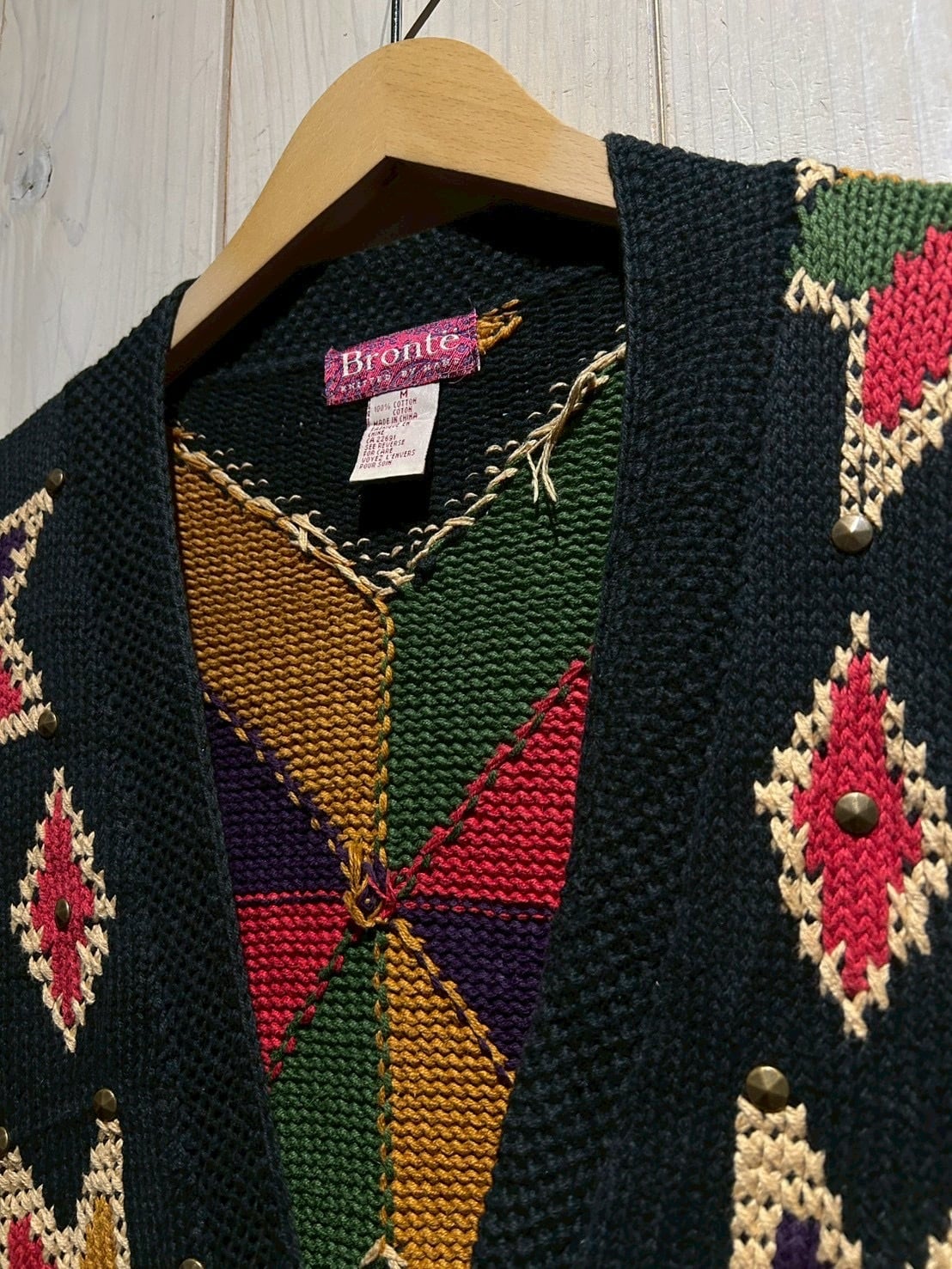 素材にはコットン100%を使用。ブラックベースにレッド、グリーン、イエロー、パープルなど多色使いのネイティブ調パターンが全面に広がり、視線を引きつける仕上がりです。