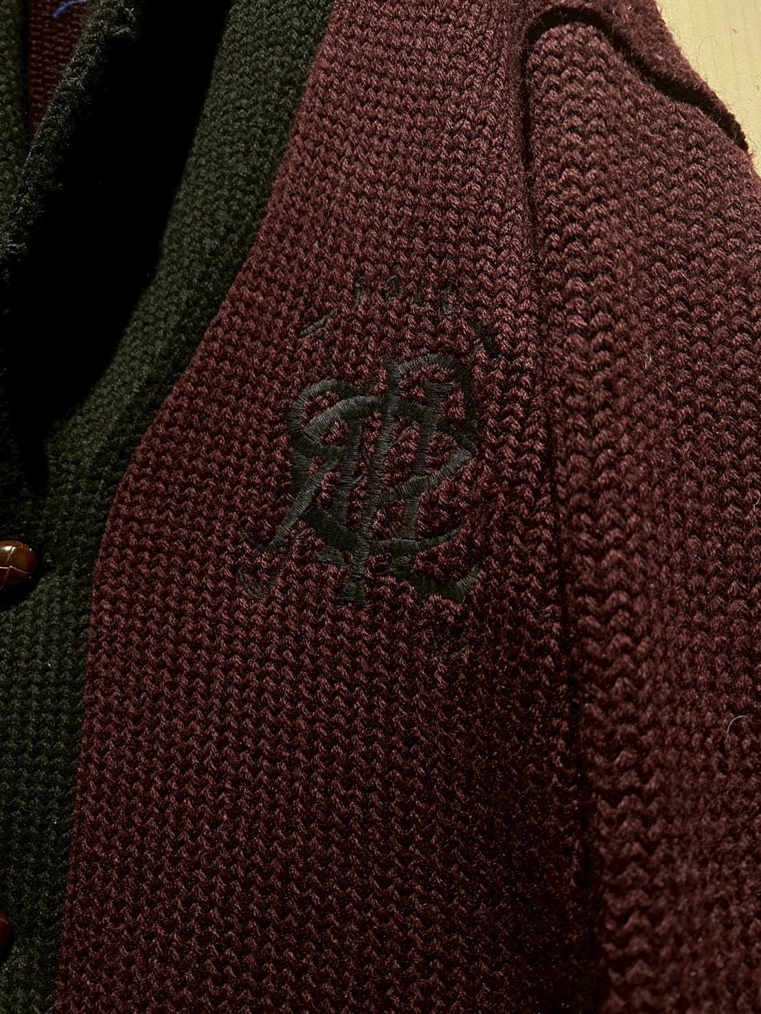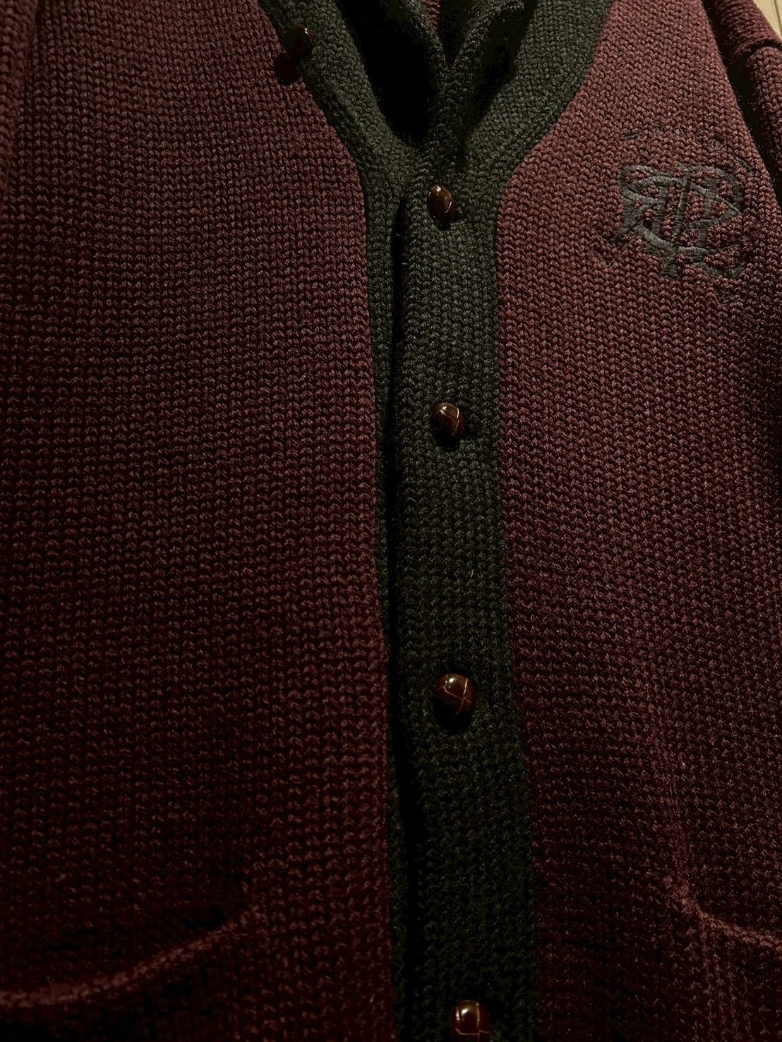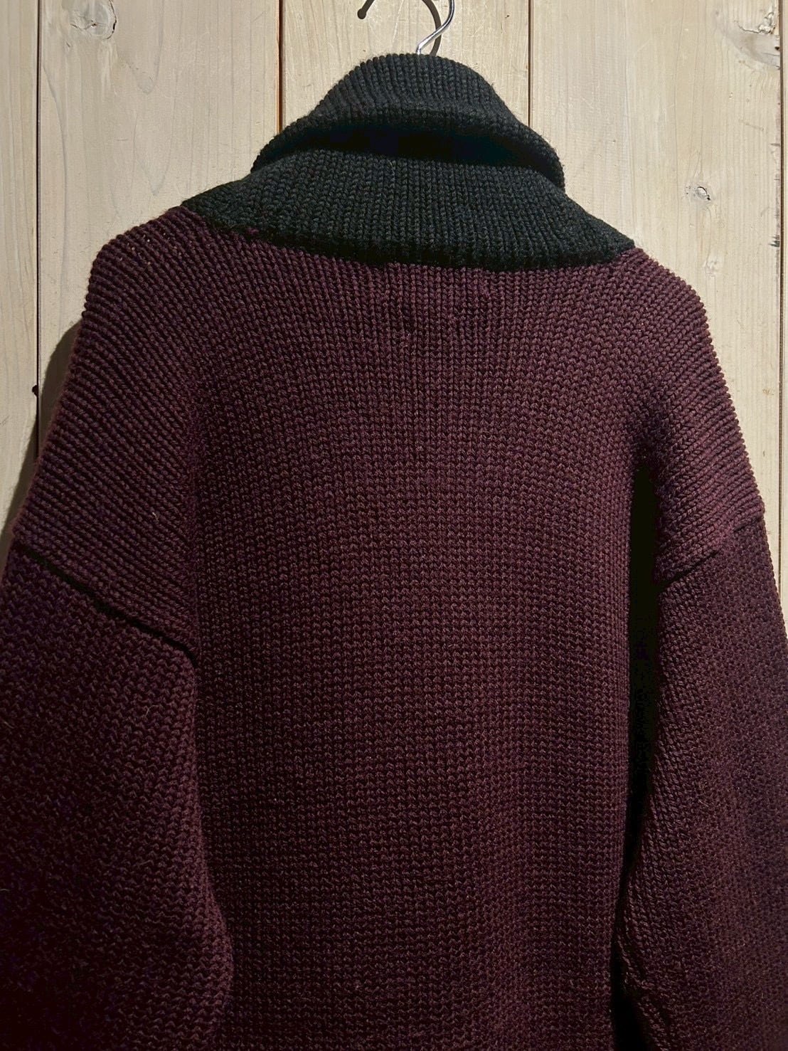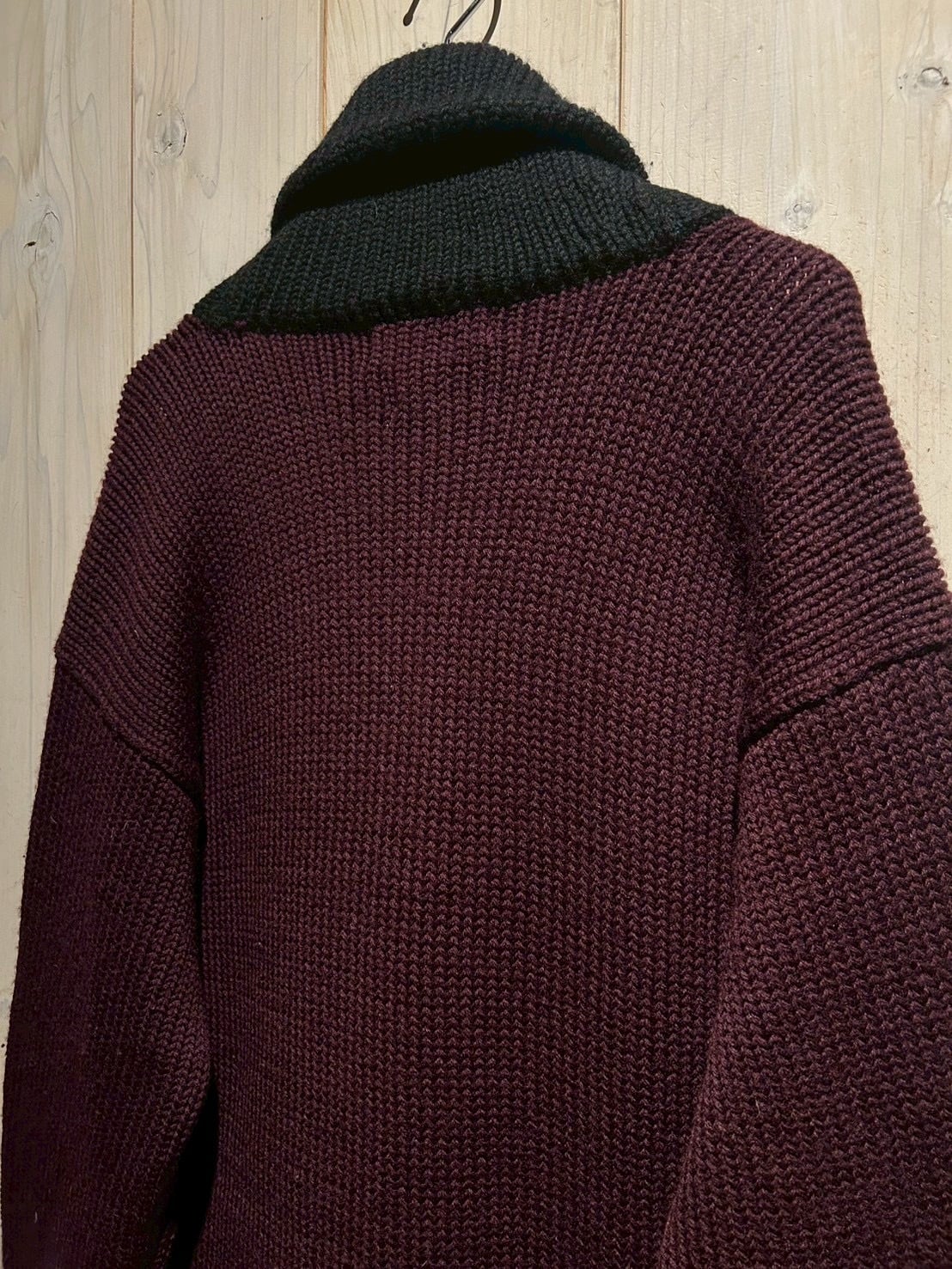 ボディには100%ウールの肉厚なニット素材を採用。ざっくりとした編み地ながらも目の詰まった質感で、着心地も抜群。深みのあるボルドーをベースに、ショールカラーや前立て、袖、裾リブに黒を配した配色バランスも秀逸で、クラシックかつ奥行きのある表情に。