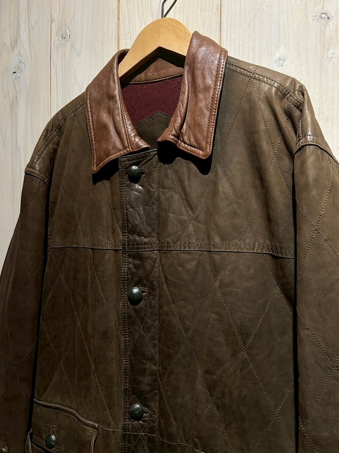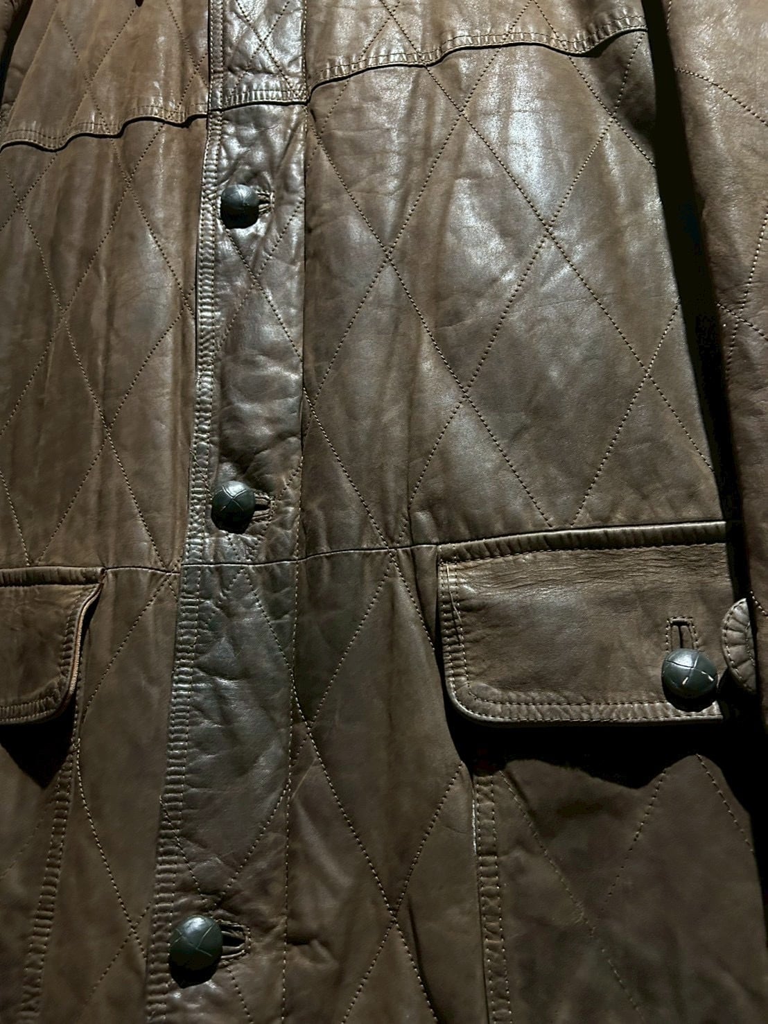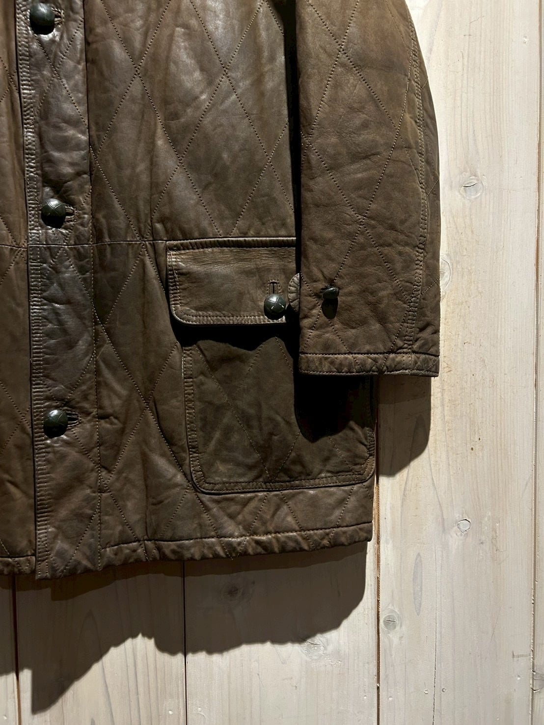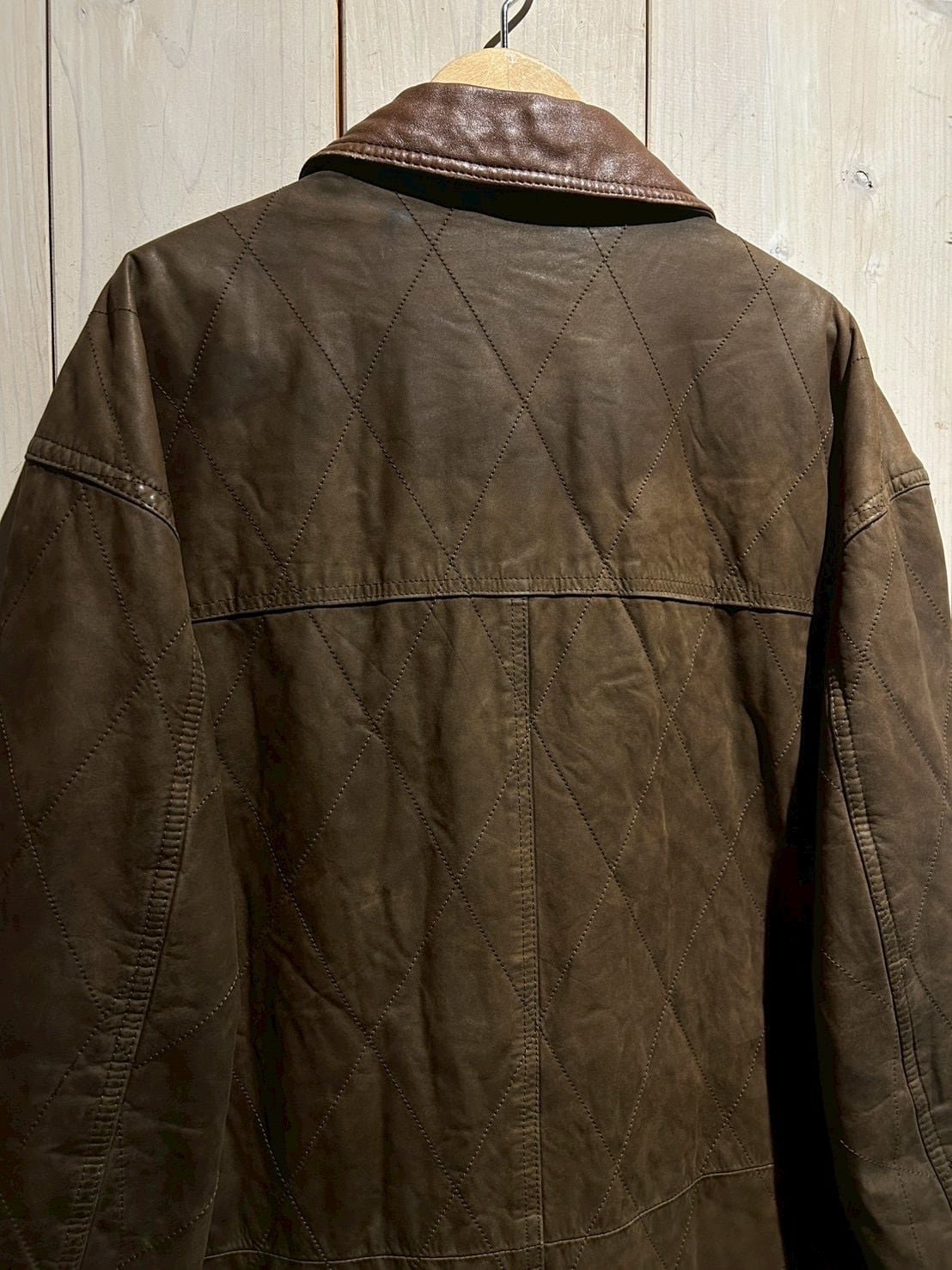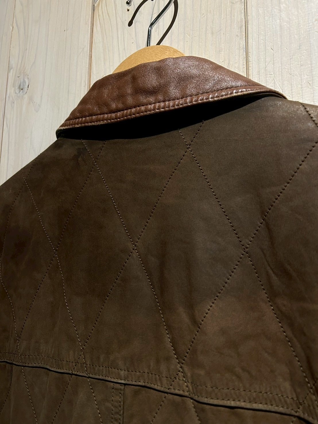 落ち着いたブラウンレザーをベースに、全体へ均等に走るダイヤキルティングが印象的。しなやかさを残しつつも芯のあるレザーで、経年による自然な色ムラやシワ感が奥行きのある表情を生み出しています。