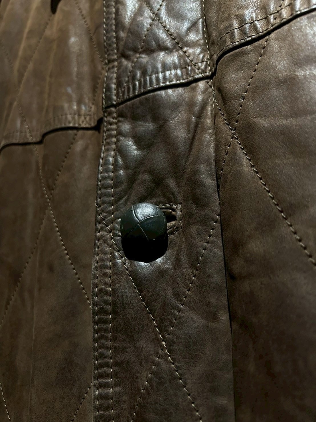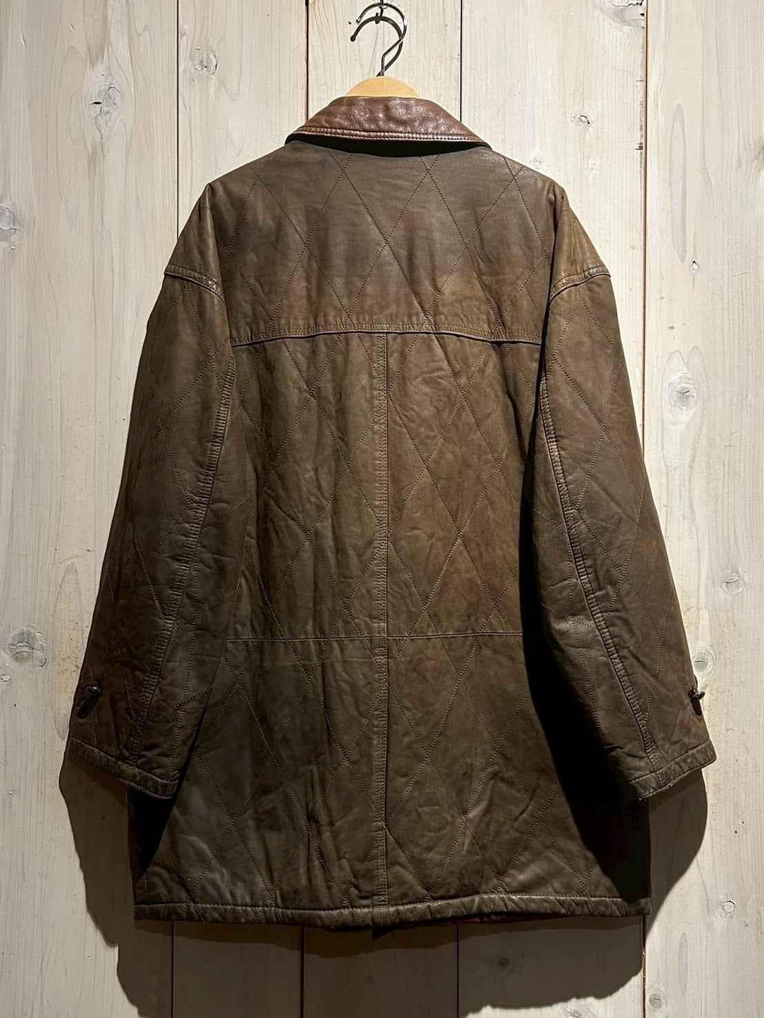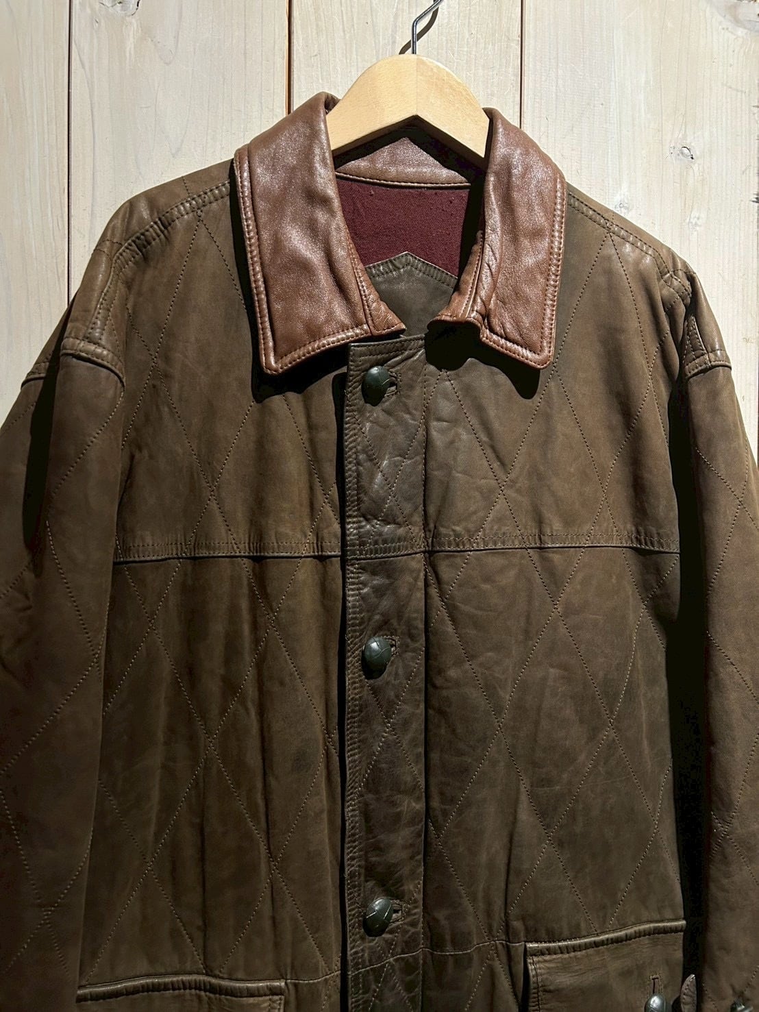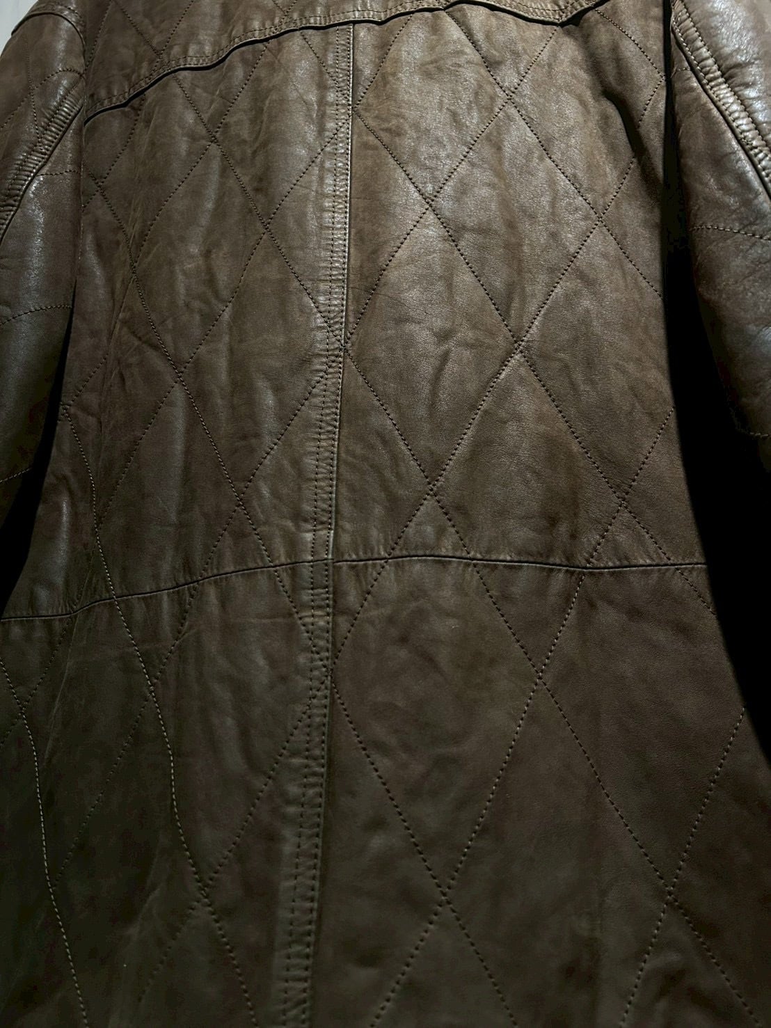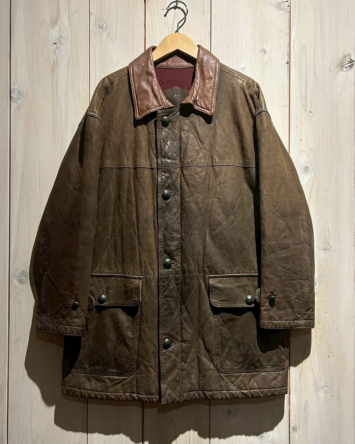 落ち着いたブラウンレザーをベースに、全体へ均等に走るダイヤキルティングが印象的。しなやかさを残しつつも芯のあるレザーで、経年による自然な色ムラやシワ感が奥行きのある表情を生み出しています。