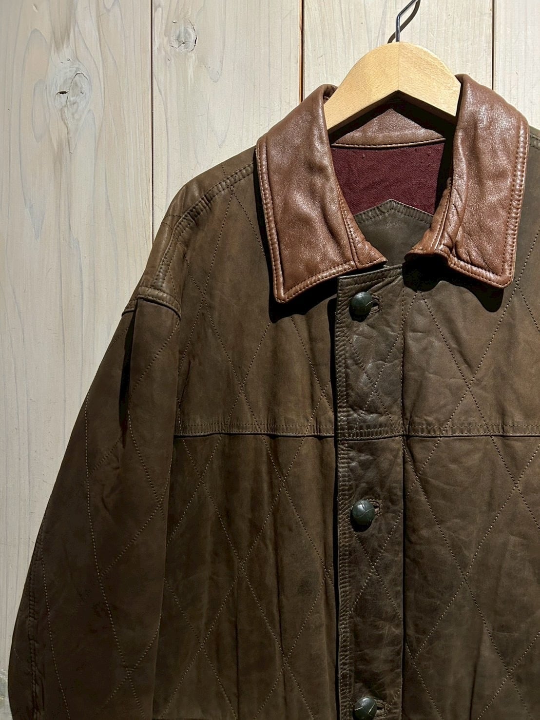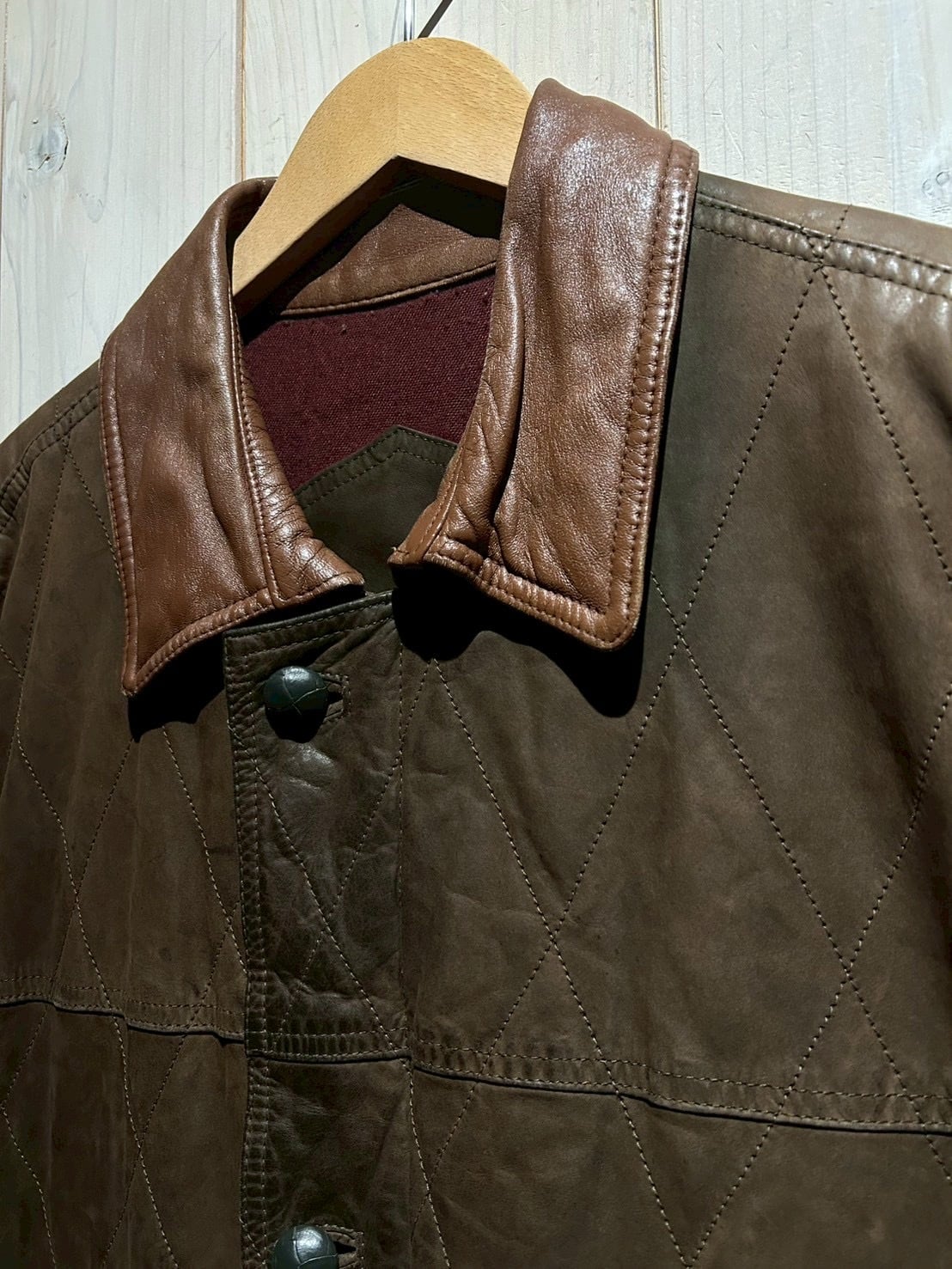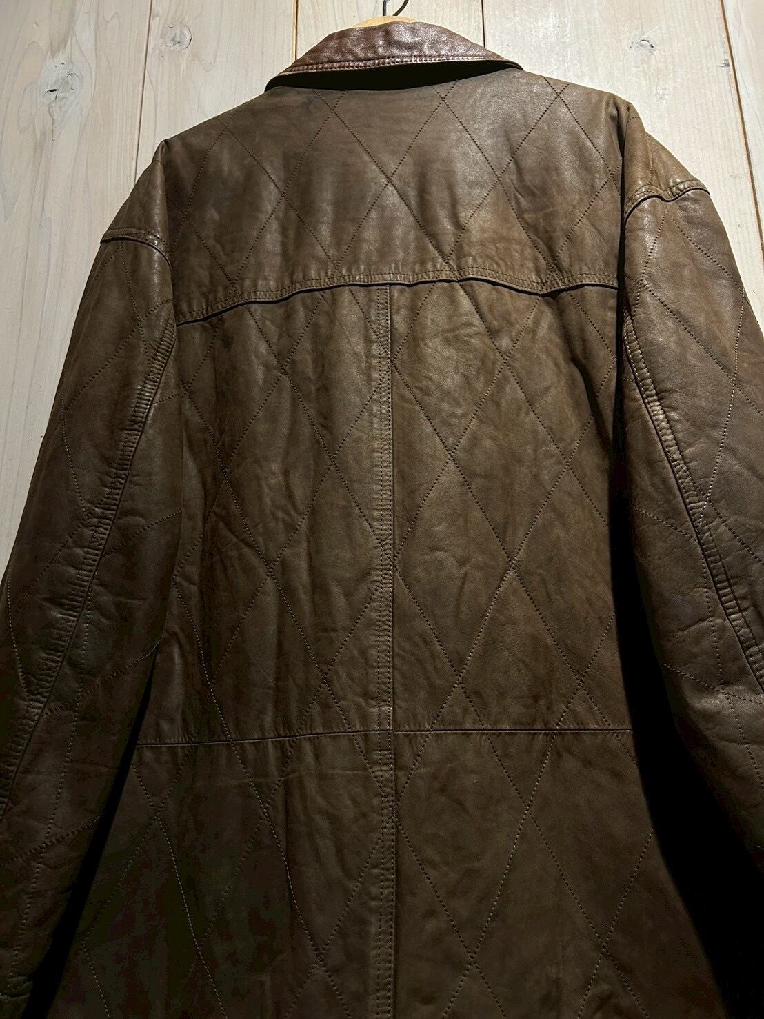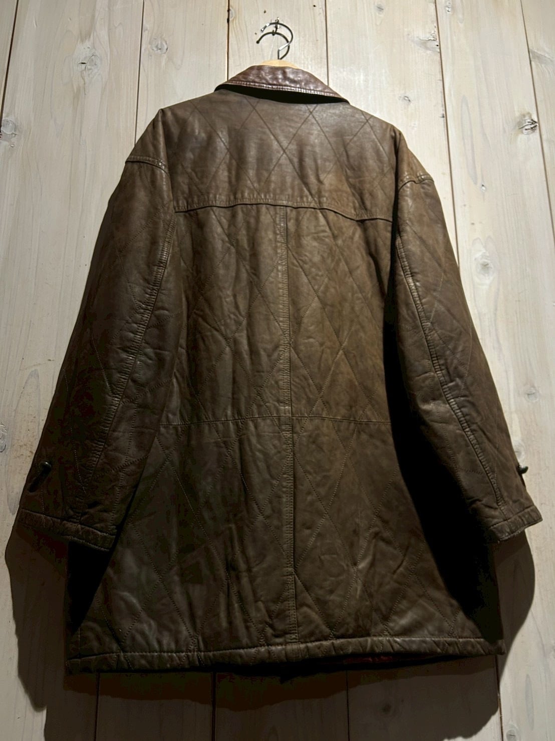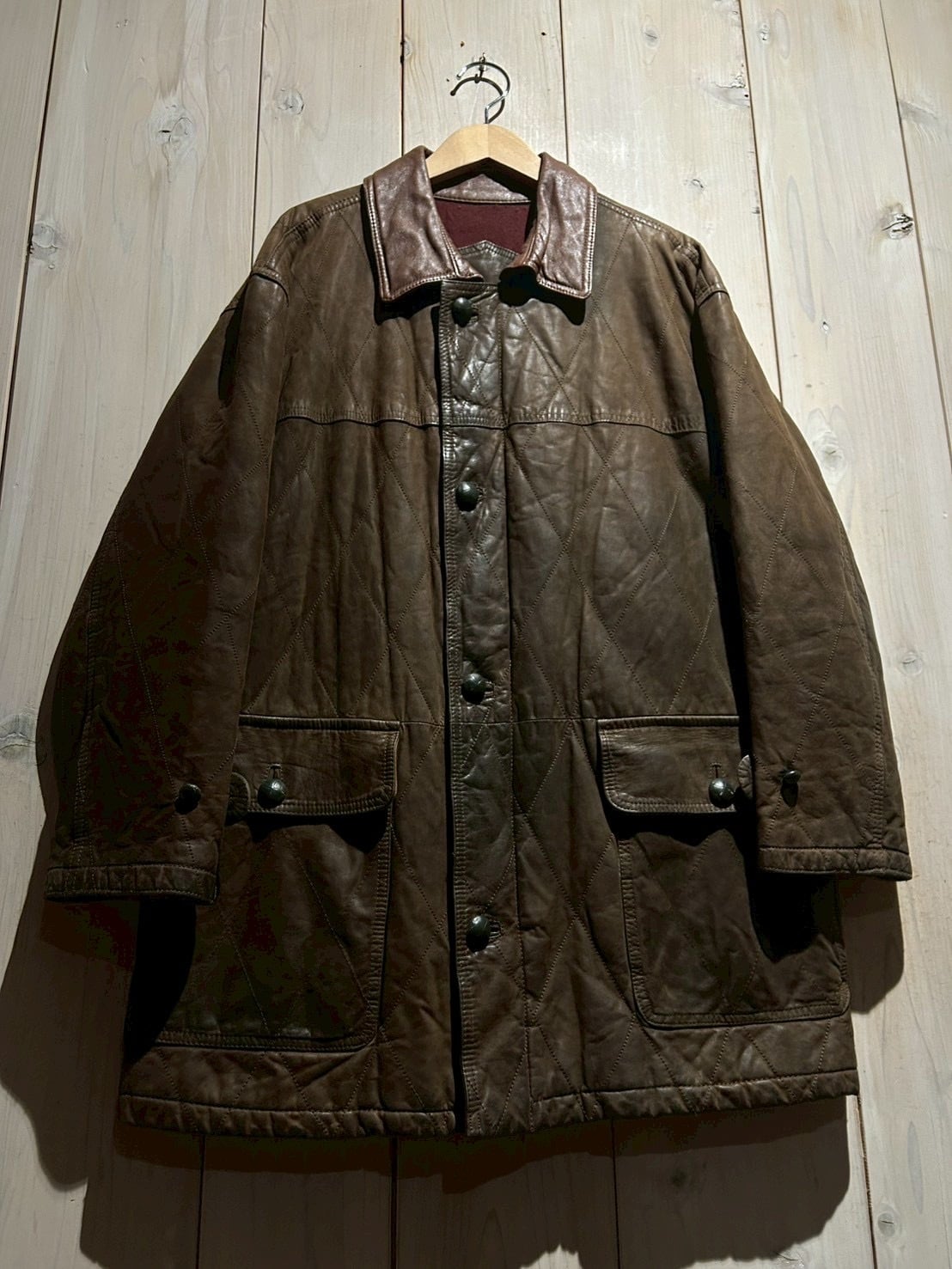 落ち着いたブラウンレザーをベースに、全体へ均等に走るダイヤキルティングが印象的。しなやかさを残しつつも芯のあるレザーで、経年による自然な色ムラやシワ感が奥行きのある表情を生み出しています。