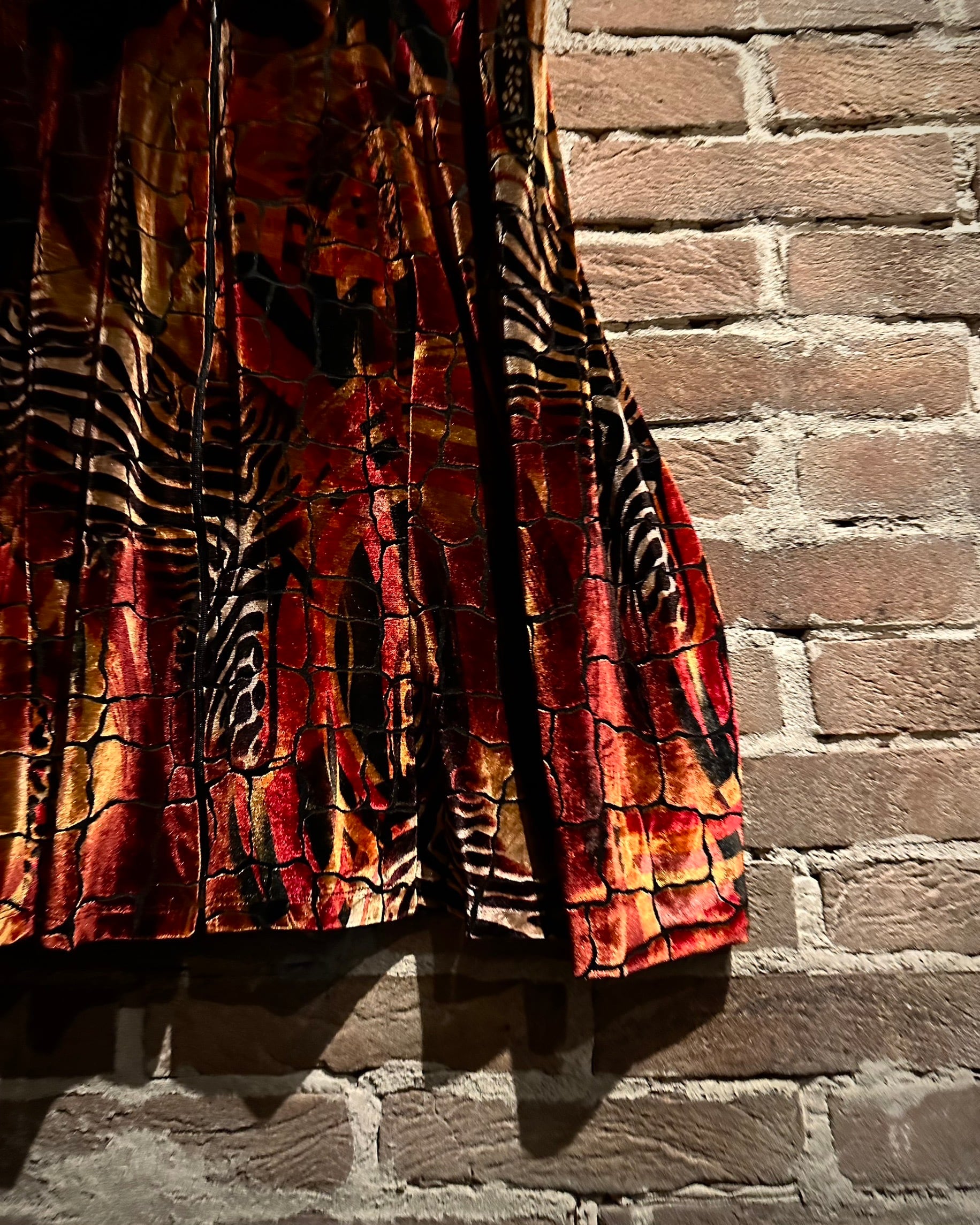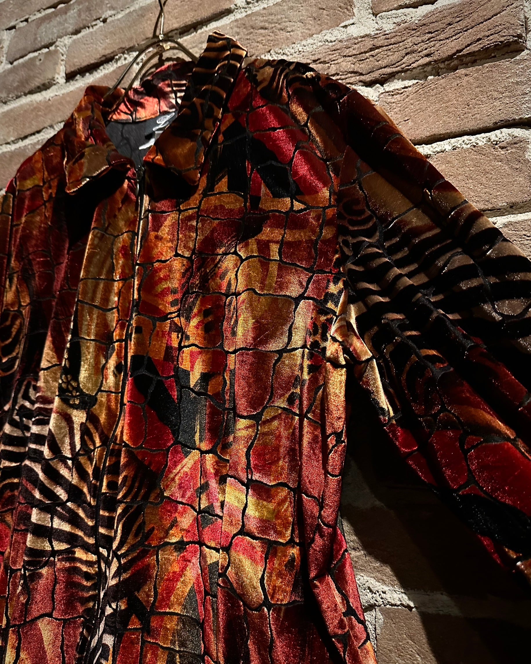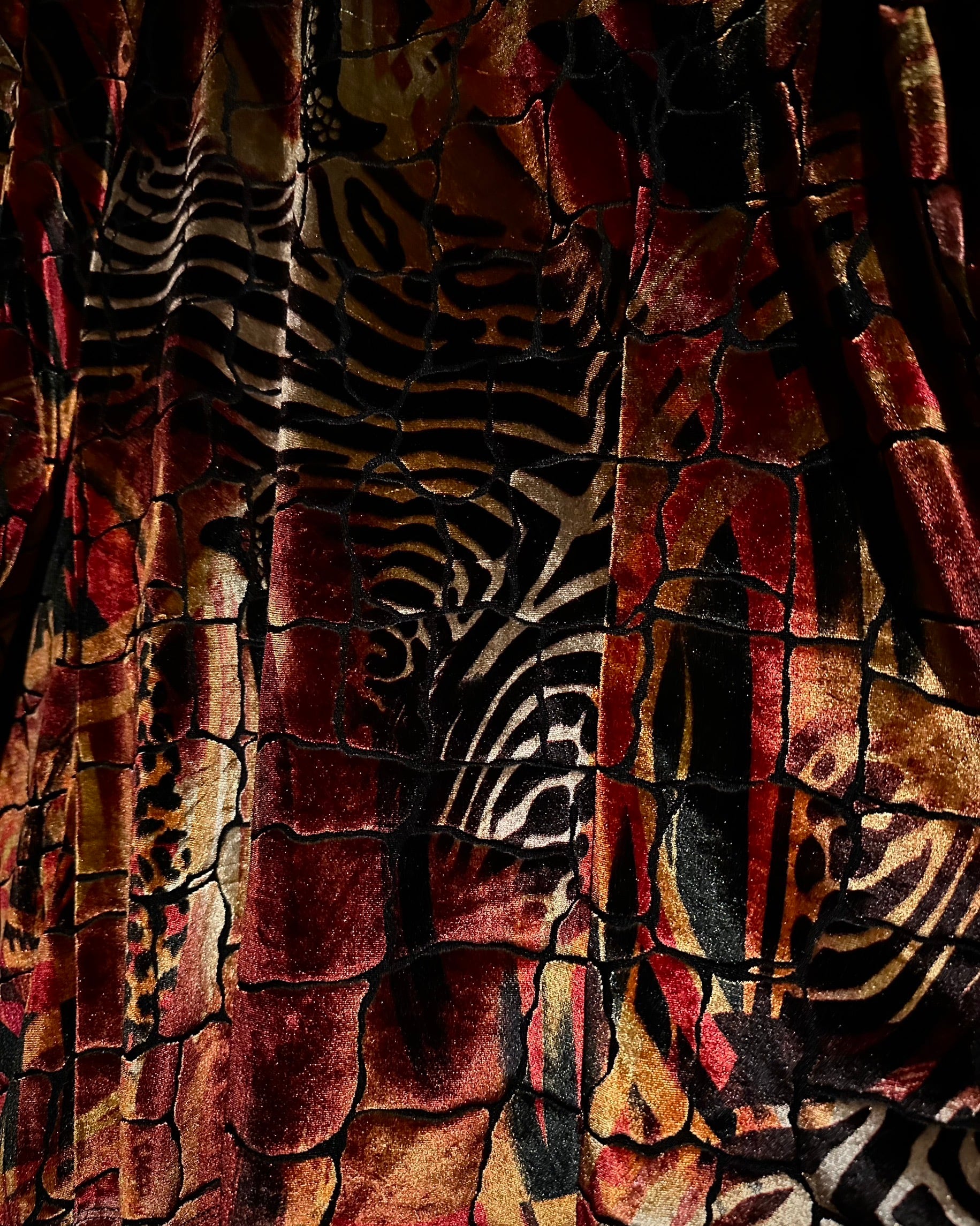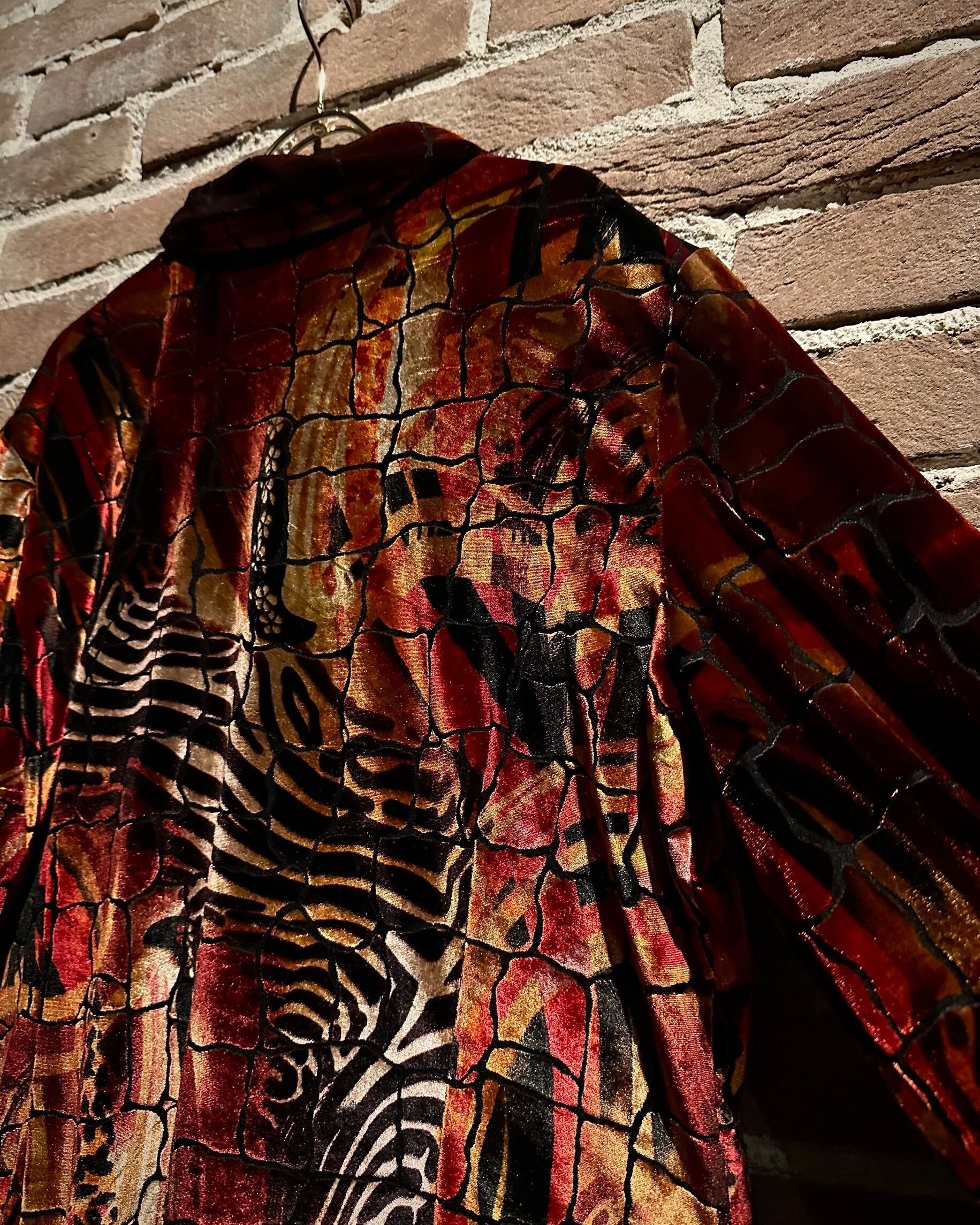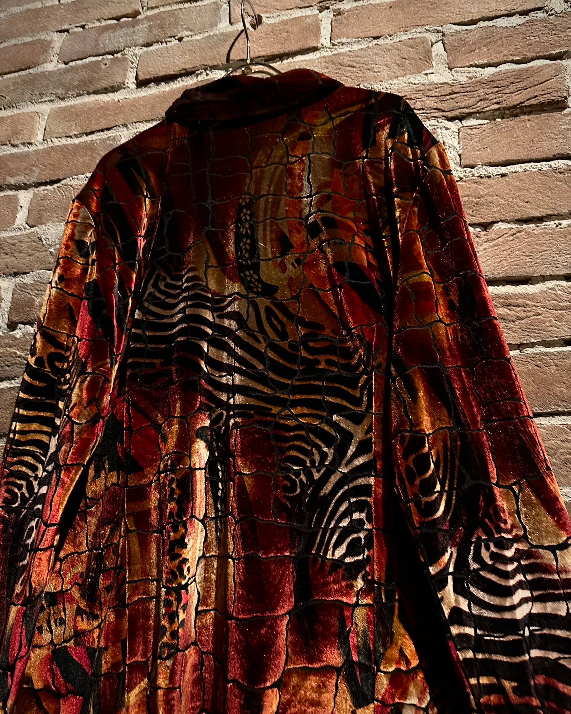 上質なベロア特有の鈍い光沢が非常に美しく、光の当たり方で表情が変化。アニマル柄と相まって、妖艶でムードのある雰囲気を漂わせます。