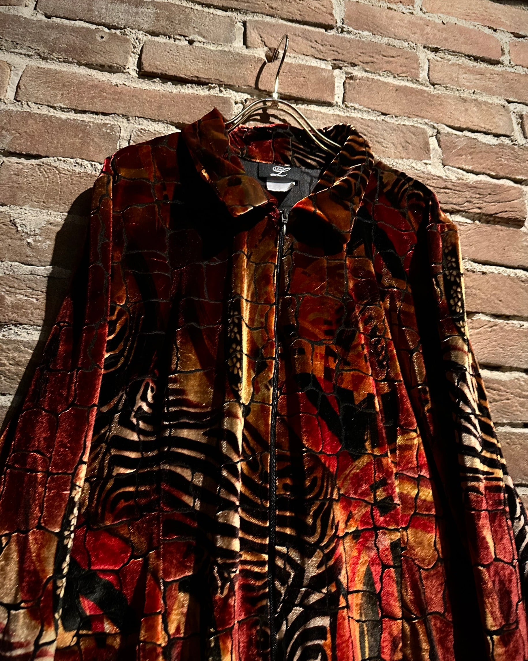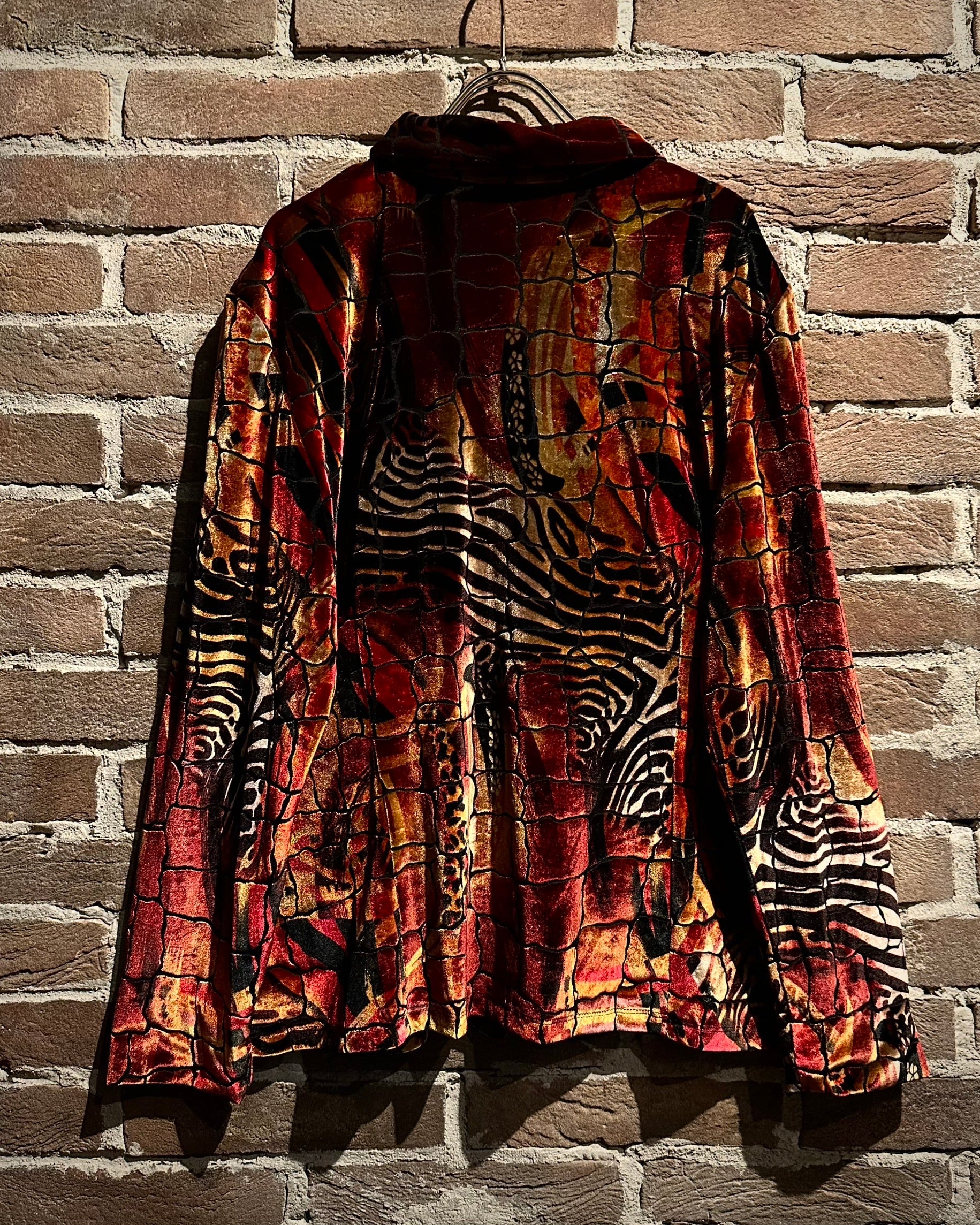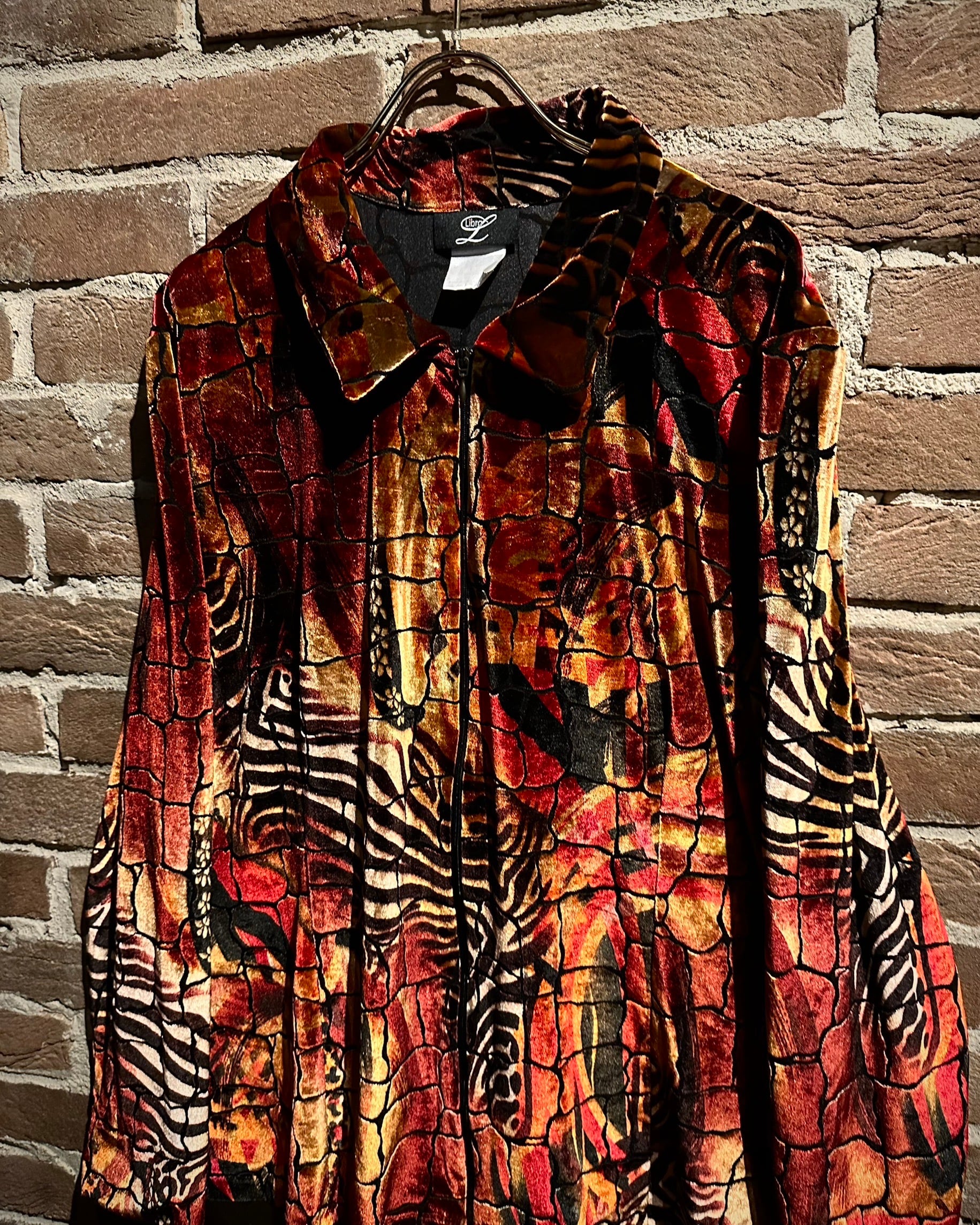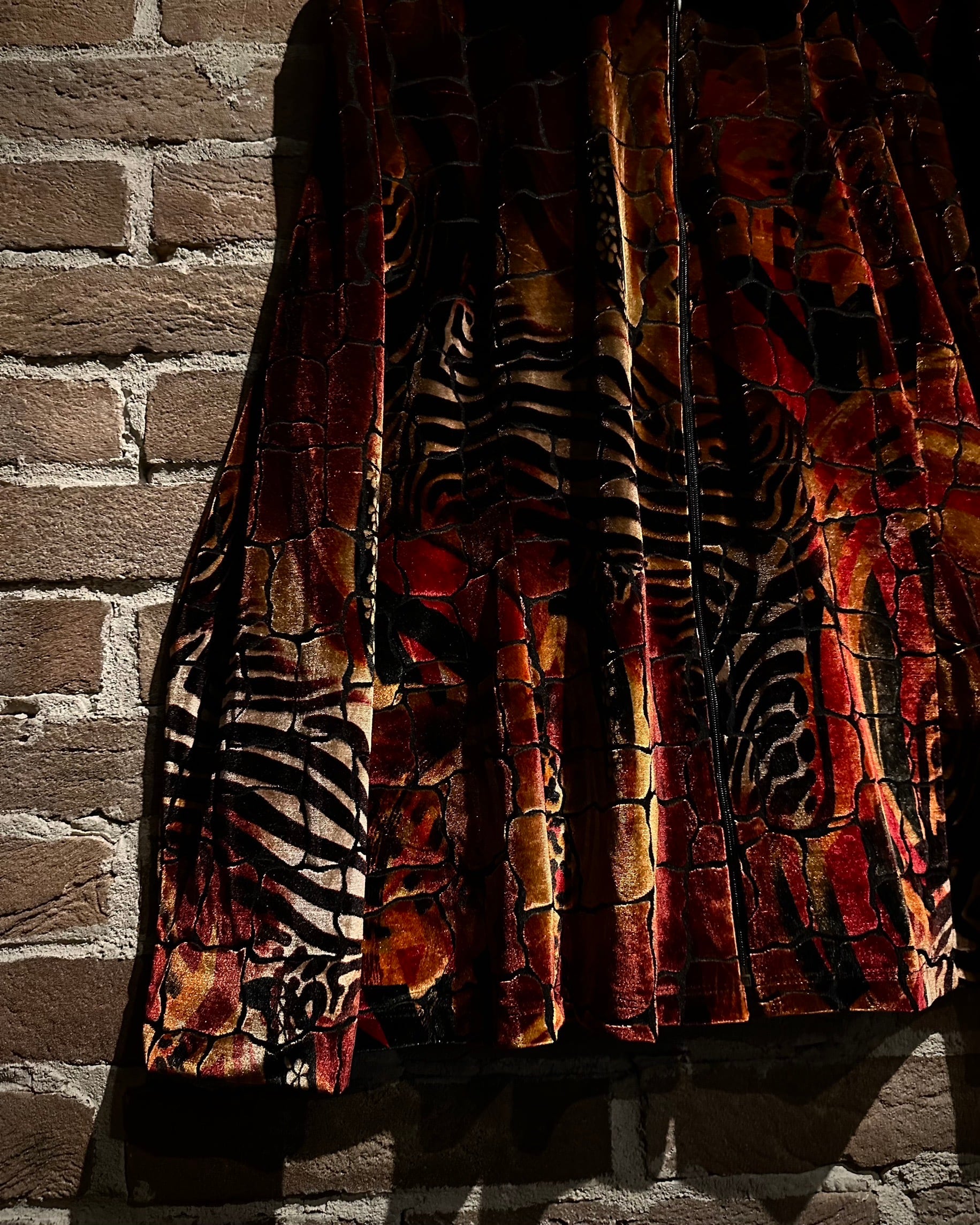 もっちりと柔らかく、滑らかな肌触りのベロアを用いたボディに、ゼブラやクロコダイルなど複数のアニマル柄を落とし込んだジップアップジャケット。