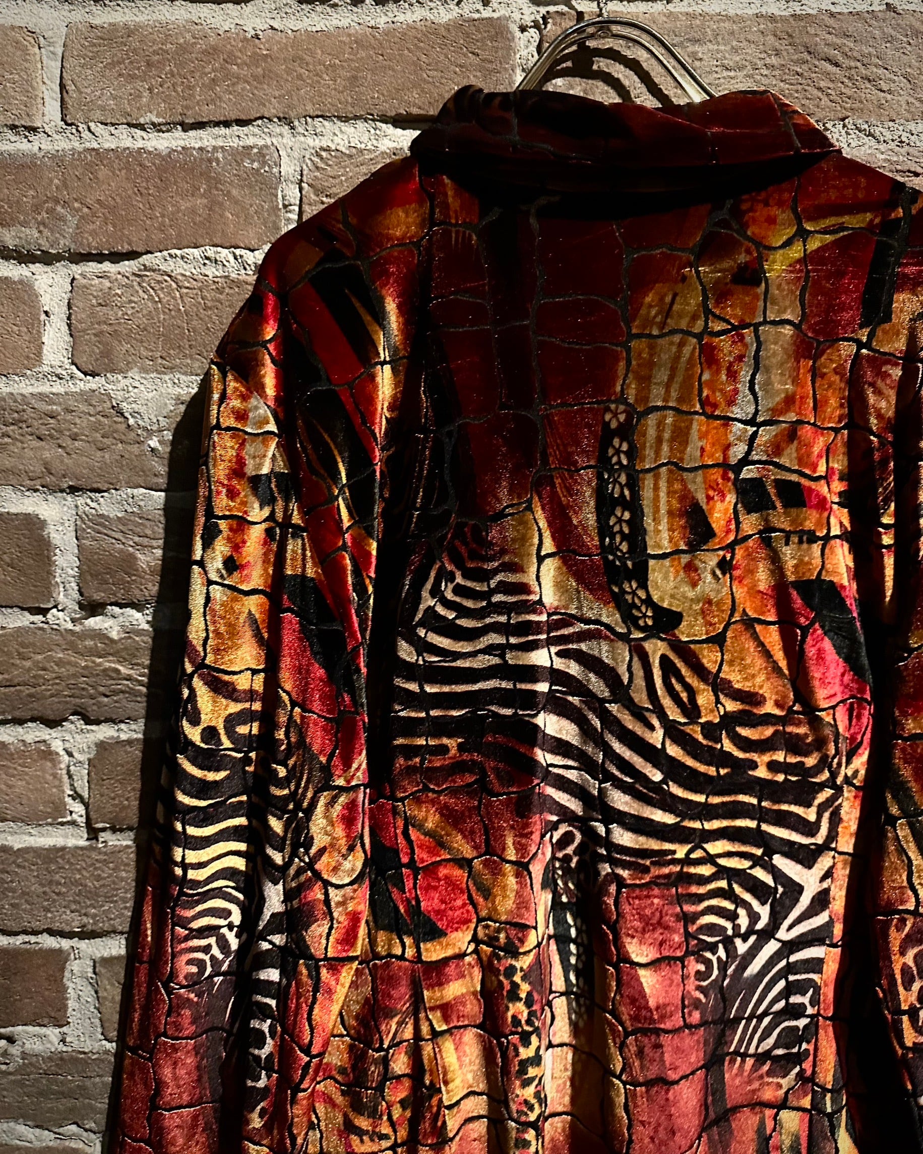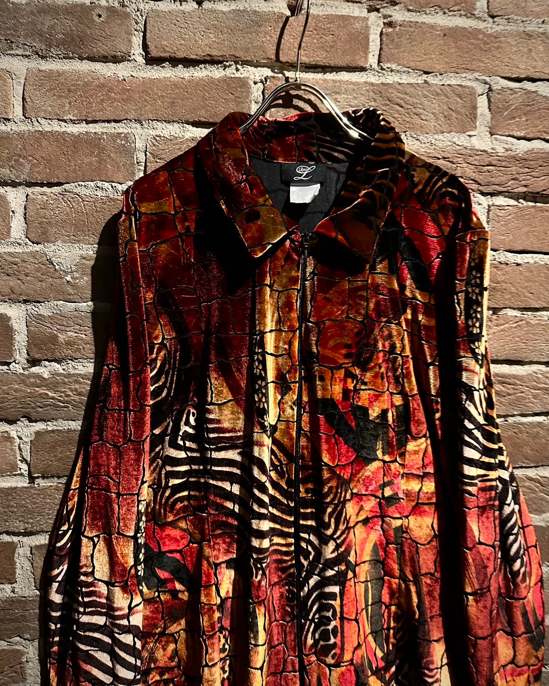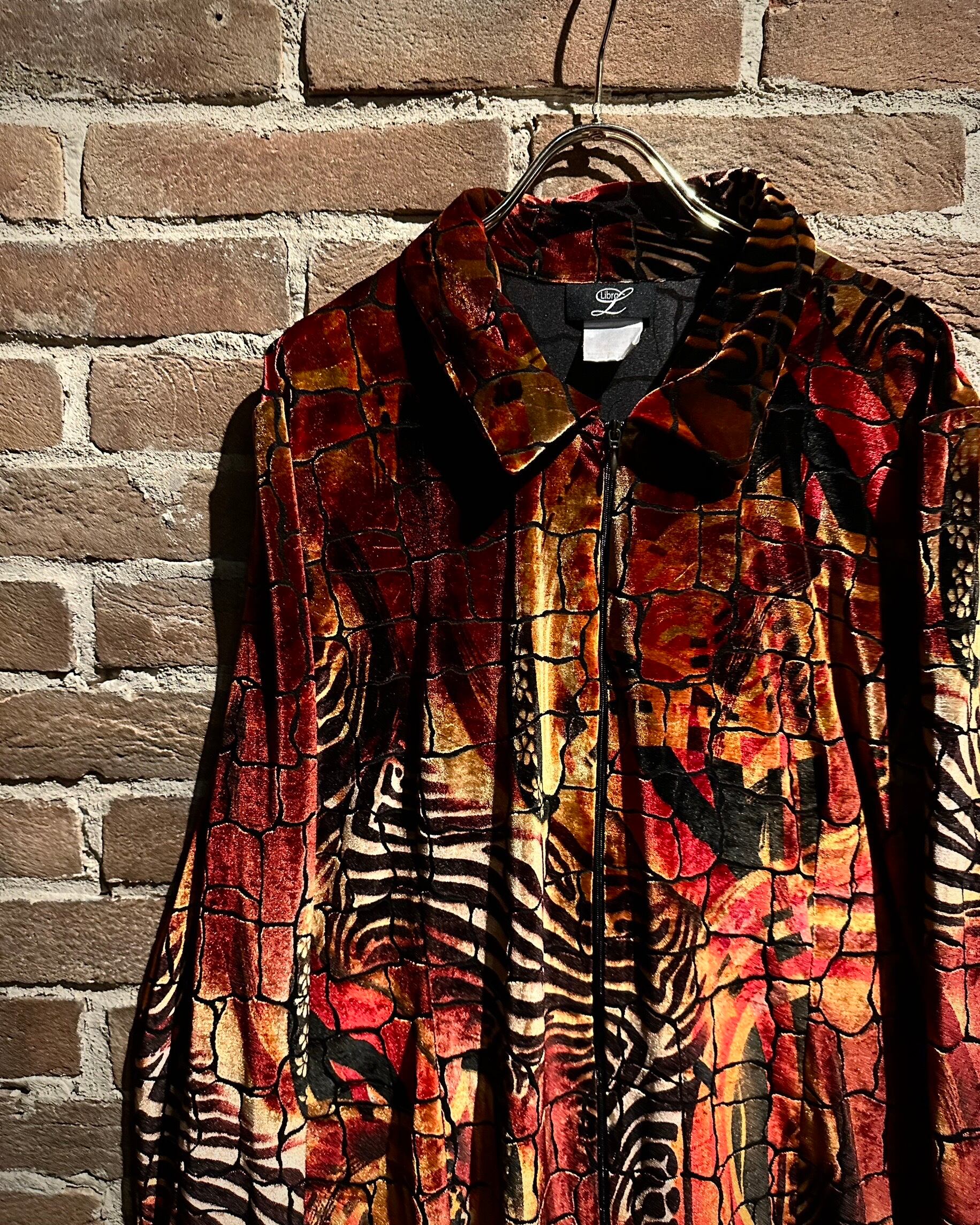 もっちりと柔らかく、滑らかな肌触りのベロアを用いたボディに、ゼブラやクロコダイルなど複数のアニマル柄を落とし込んだジップアップジャケット。