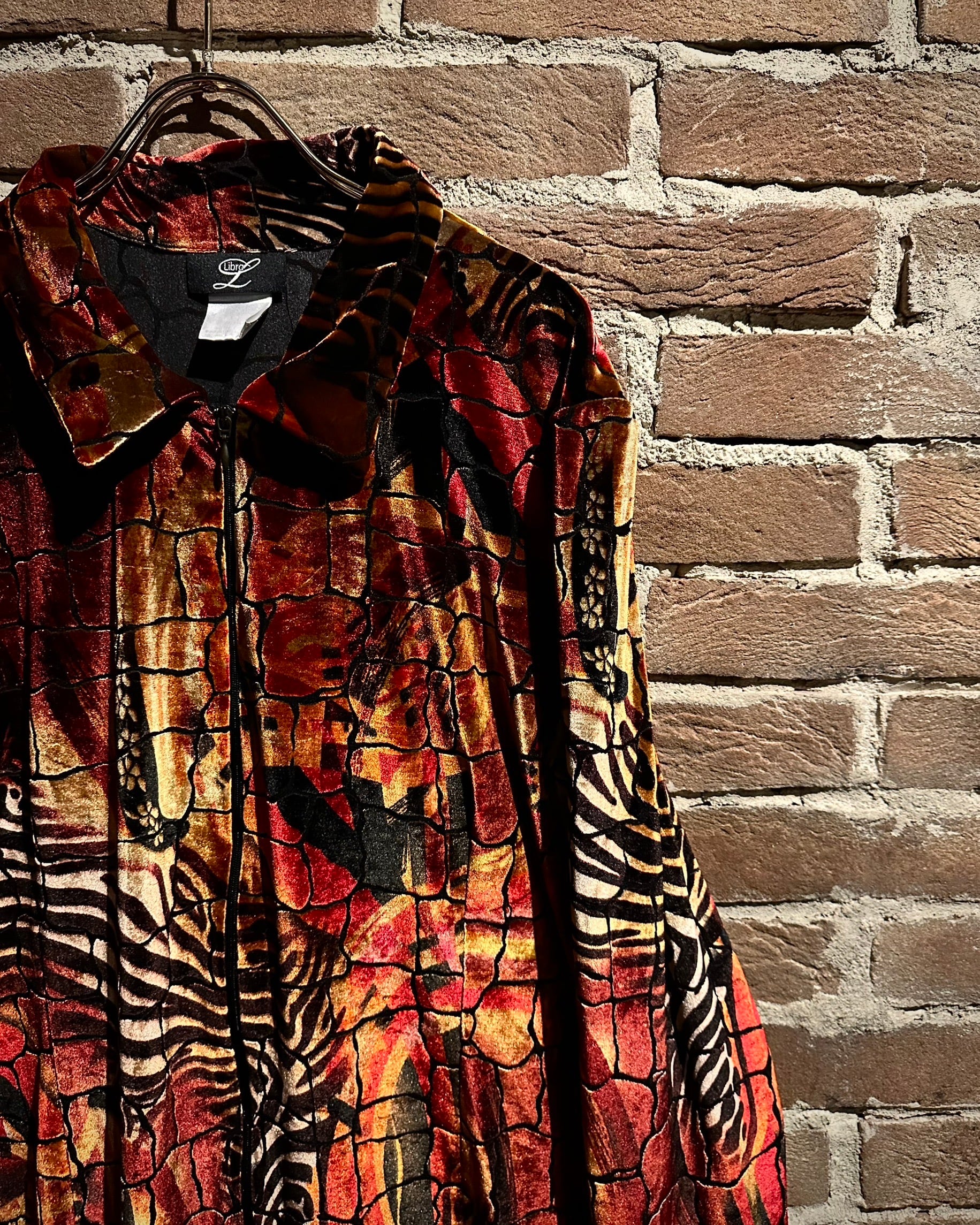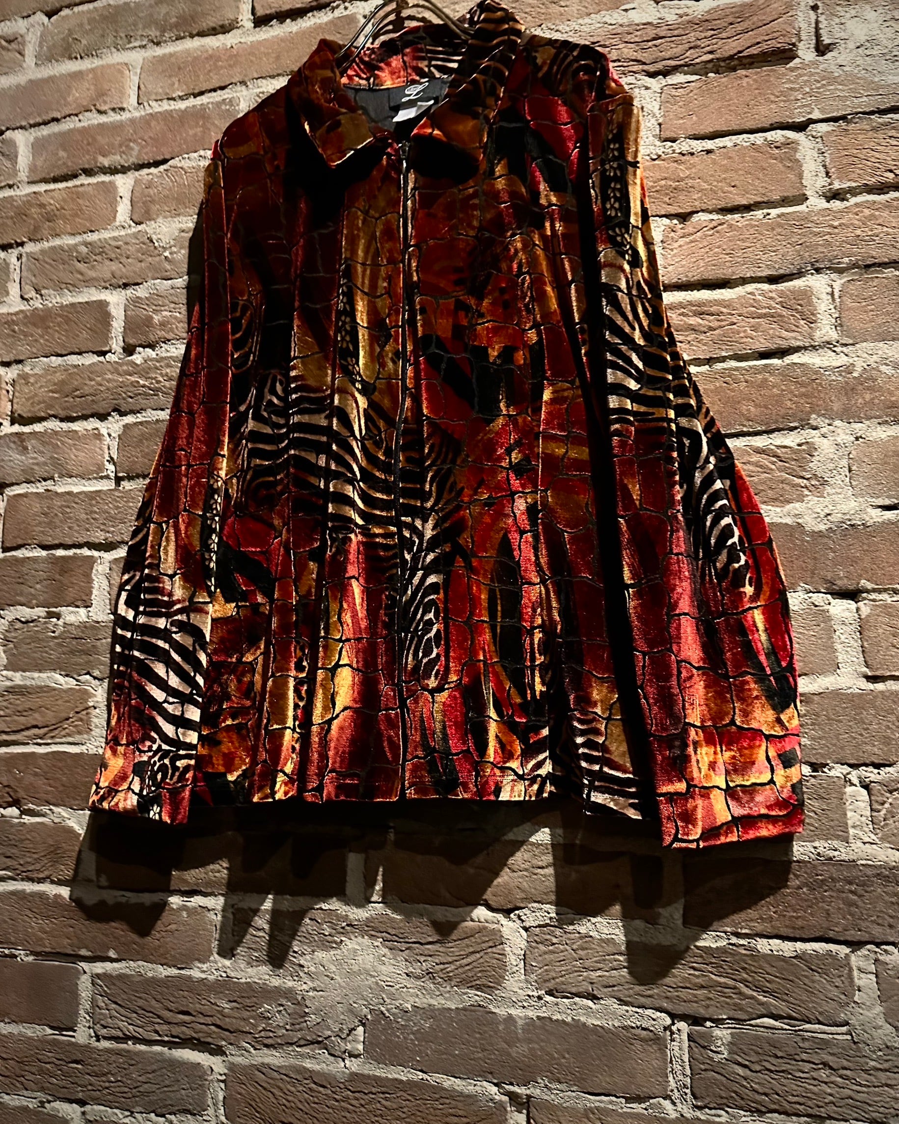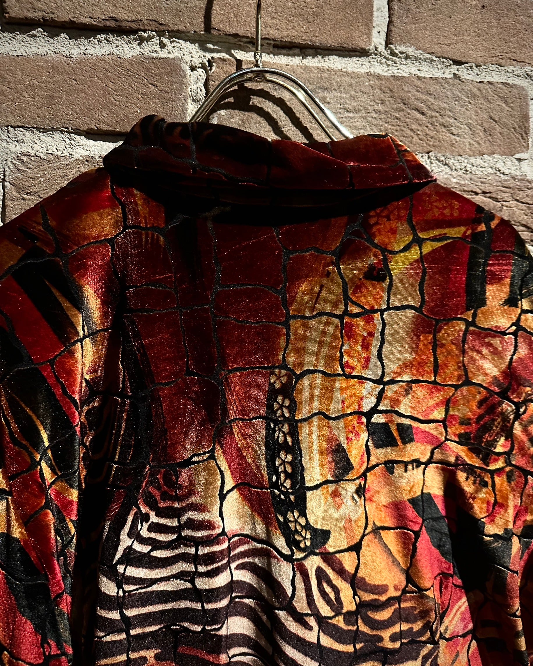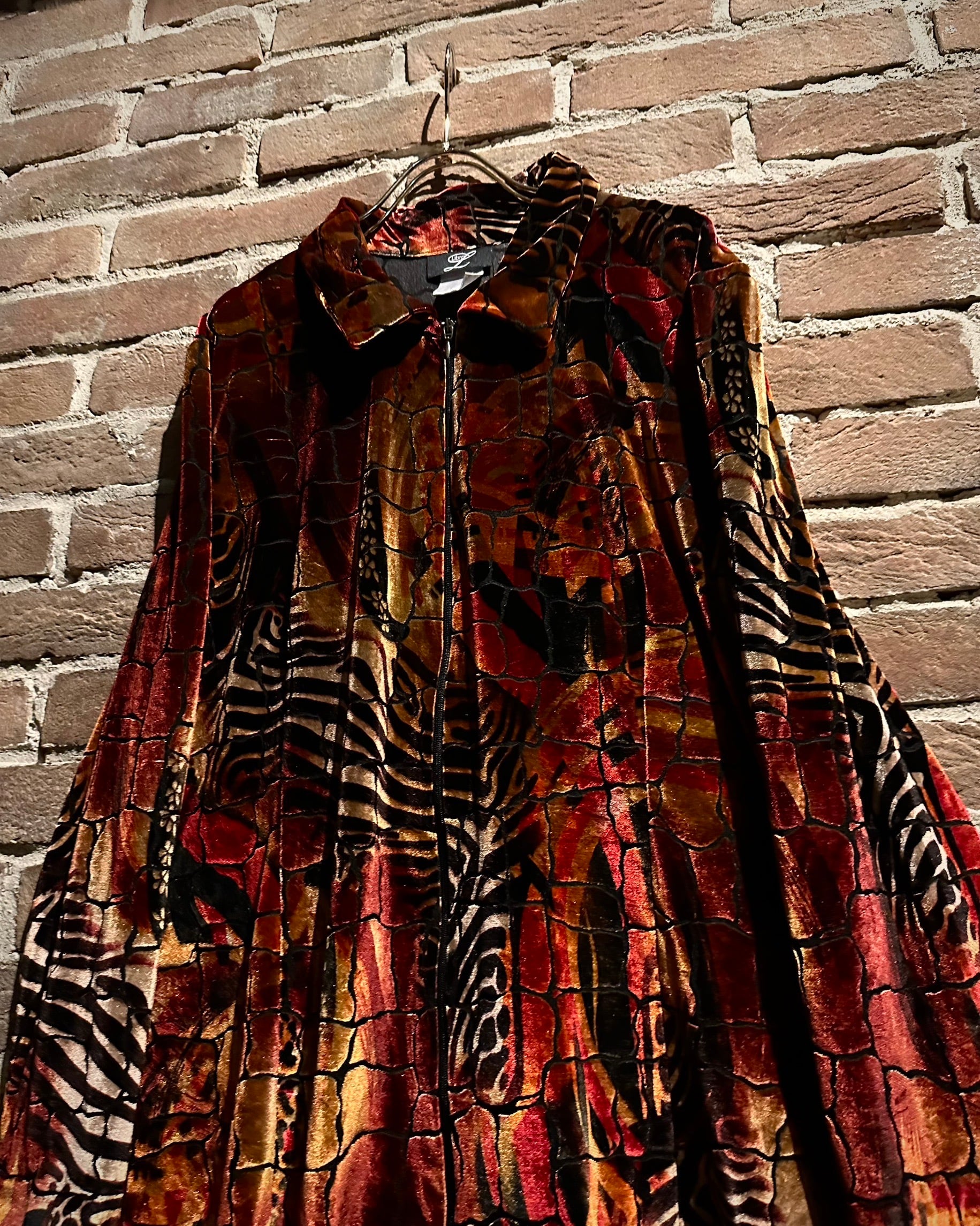 もっちりと柔らかく、滑らかな肌触りのベロアを用いたボディに、ゼブラやクロコダイルなど複数のアニマル柄を落とし込んだジップアップジャケット。