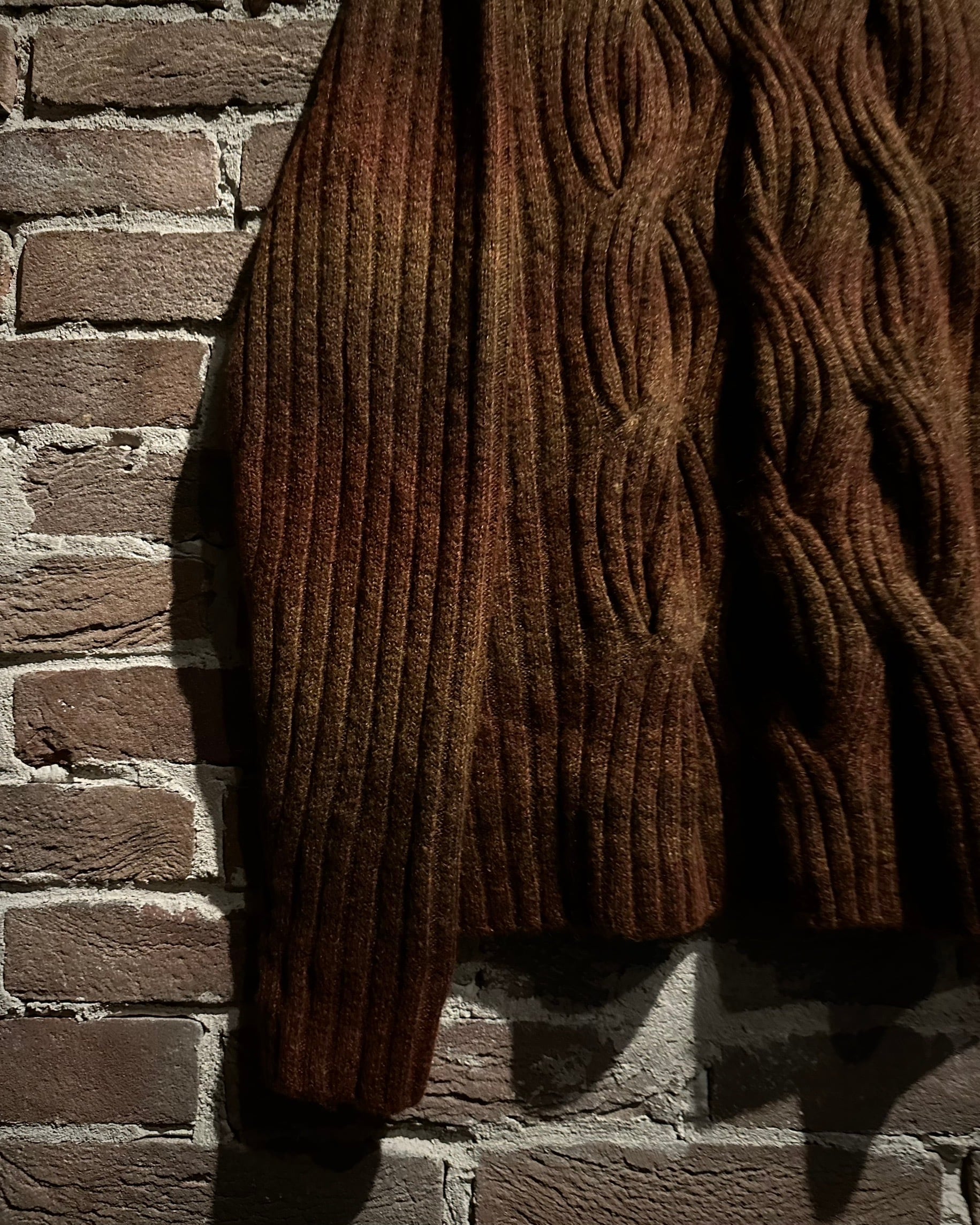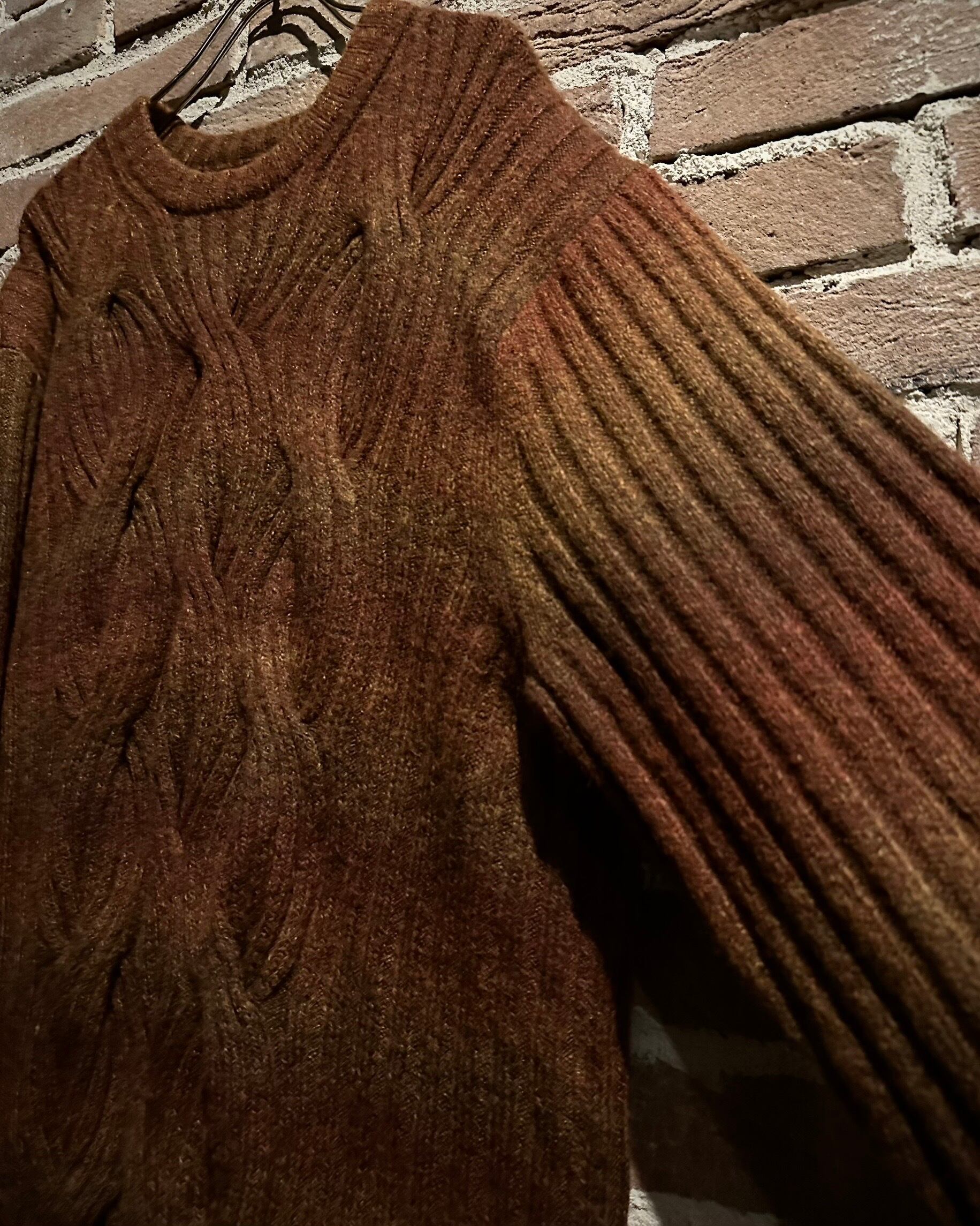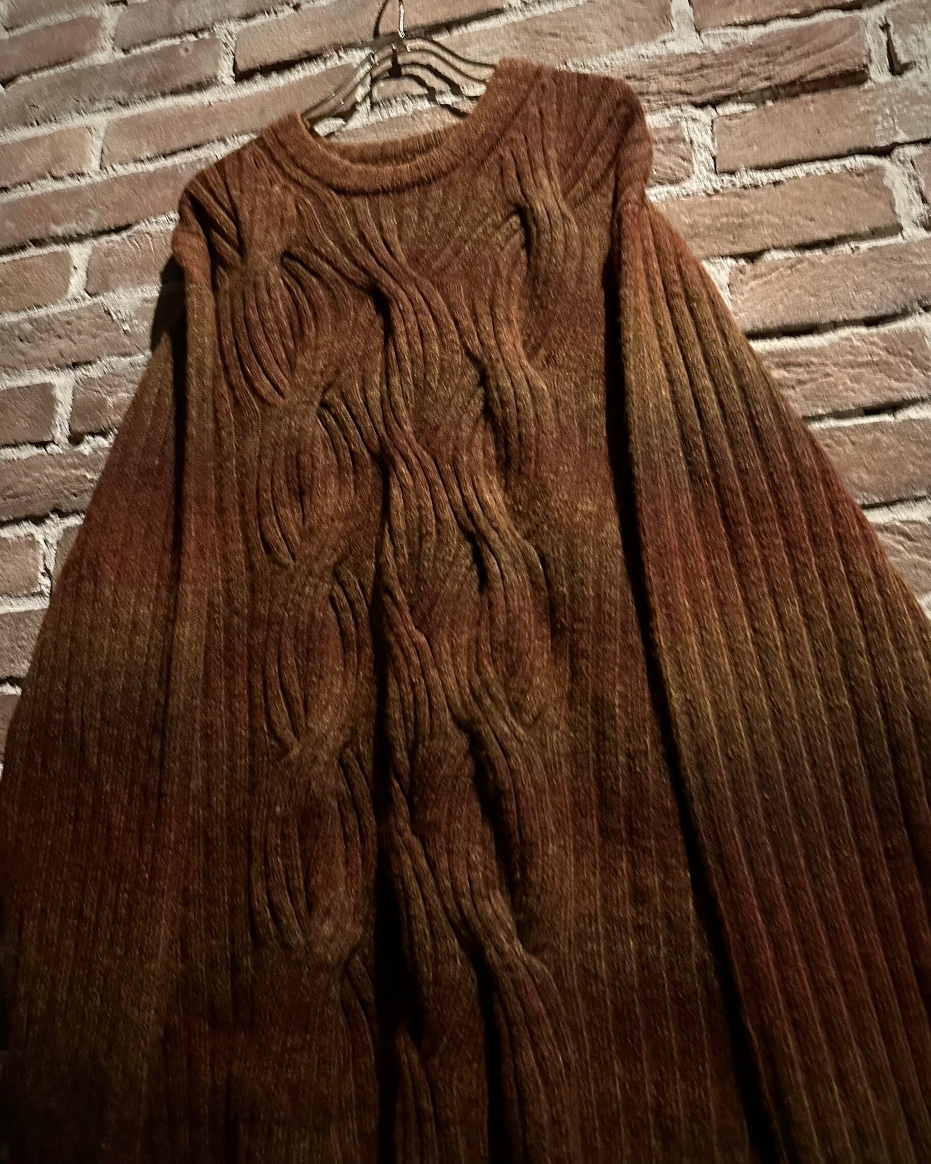 ブラウンを基調としたグラデーションボーダーに、フロントには立体感のあるケーブルニットを配置し、表情豊かな仕上がりに。
