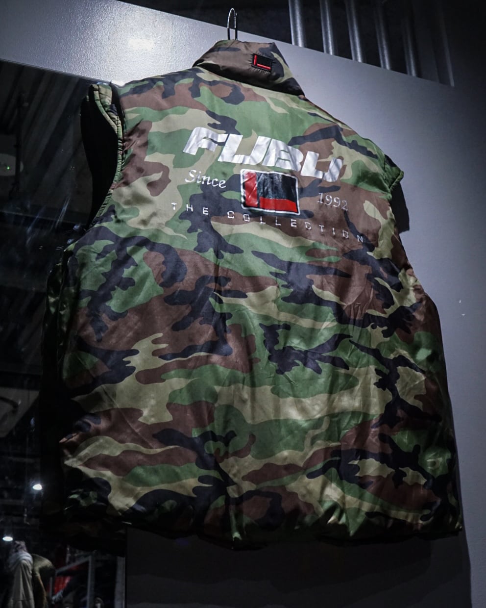 90年代USストリートを象徴するブランドのひとつ、FUBUらしい存在感が色濃く表れたリバーシブルダウンベスト。