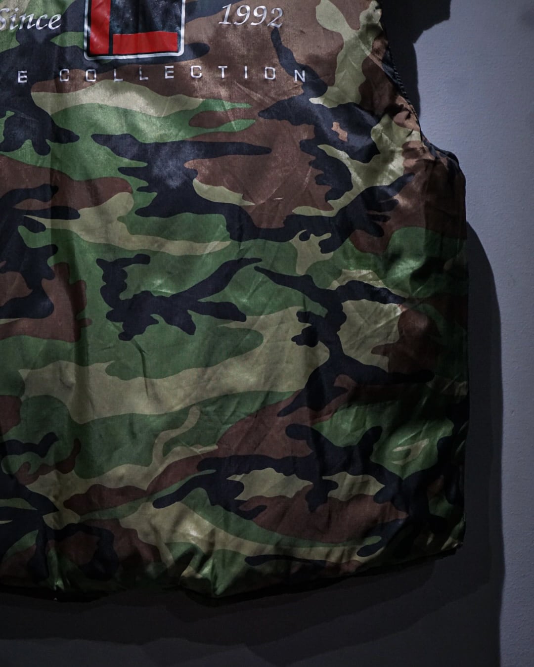 フロントにはロゴ刺繍、カモ柄面の背面にはブランドロゴの大胆なグラフィックプリントを配置。ブラック面にはキルティングデザインが施され、シンプルながら奥行きのある表情に。