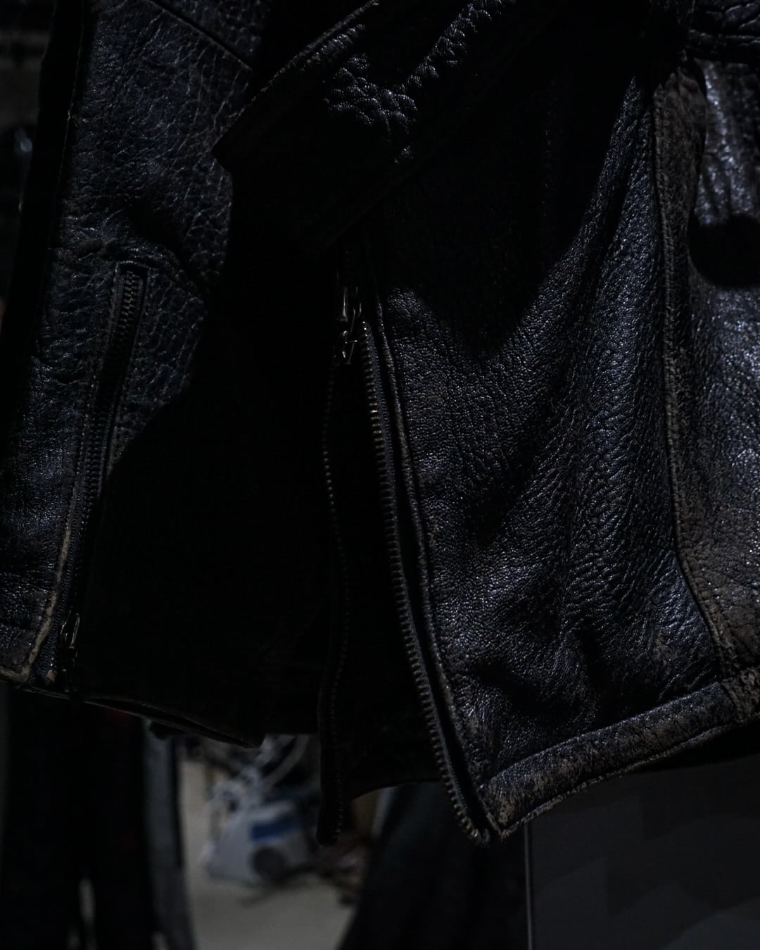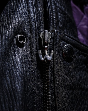 フロントはダブルジップ仕様。複数のジップポケットやコインポケット、エポレットなど、ライダースらしいディテールを随所に配置しています。特筆すべきは長めに取られた稀有な丈感。がっしりとした無骨な中にゆったりとした抜け感を持たせたスペシャルな1着。