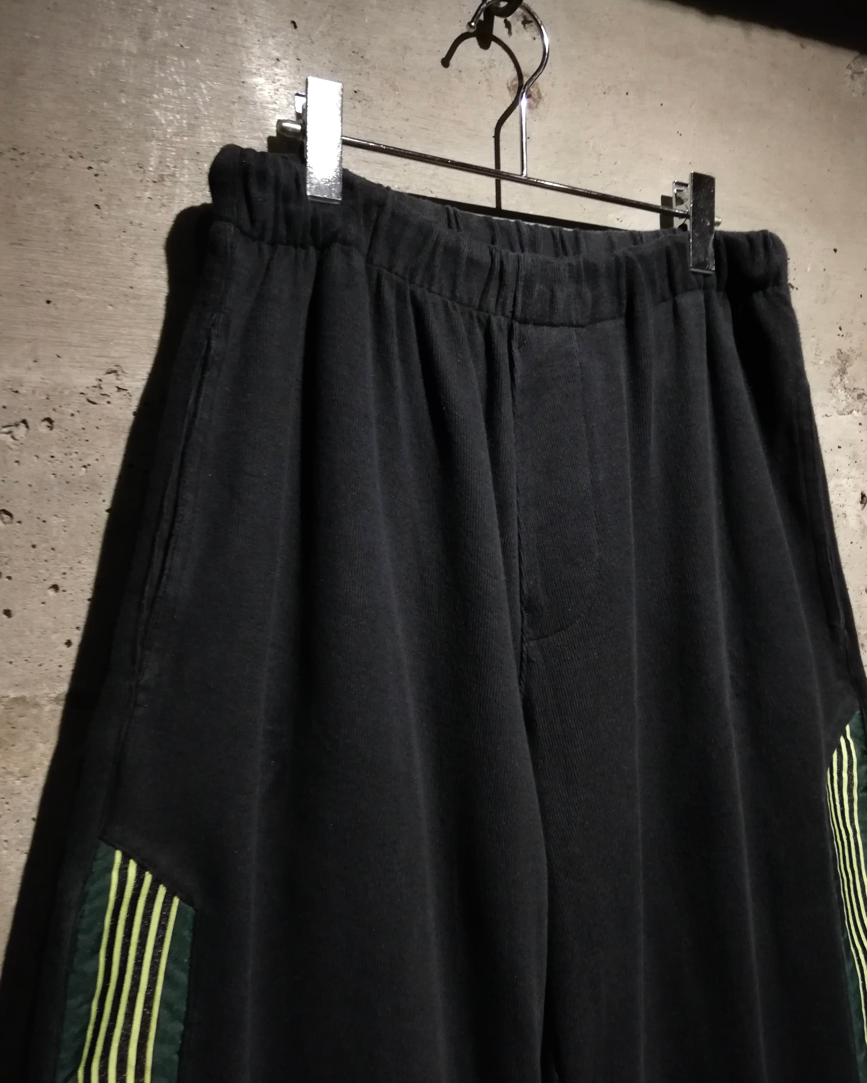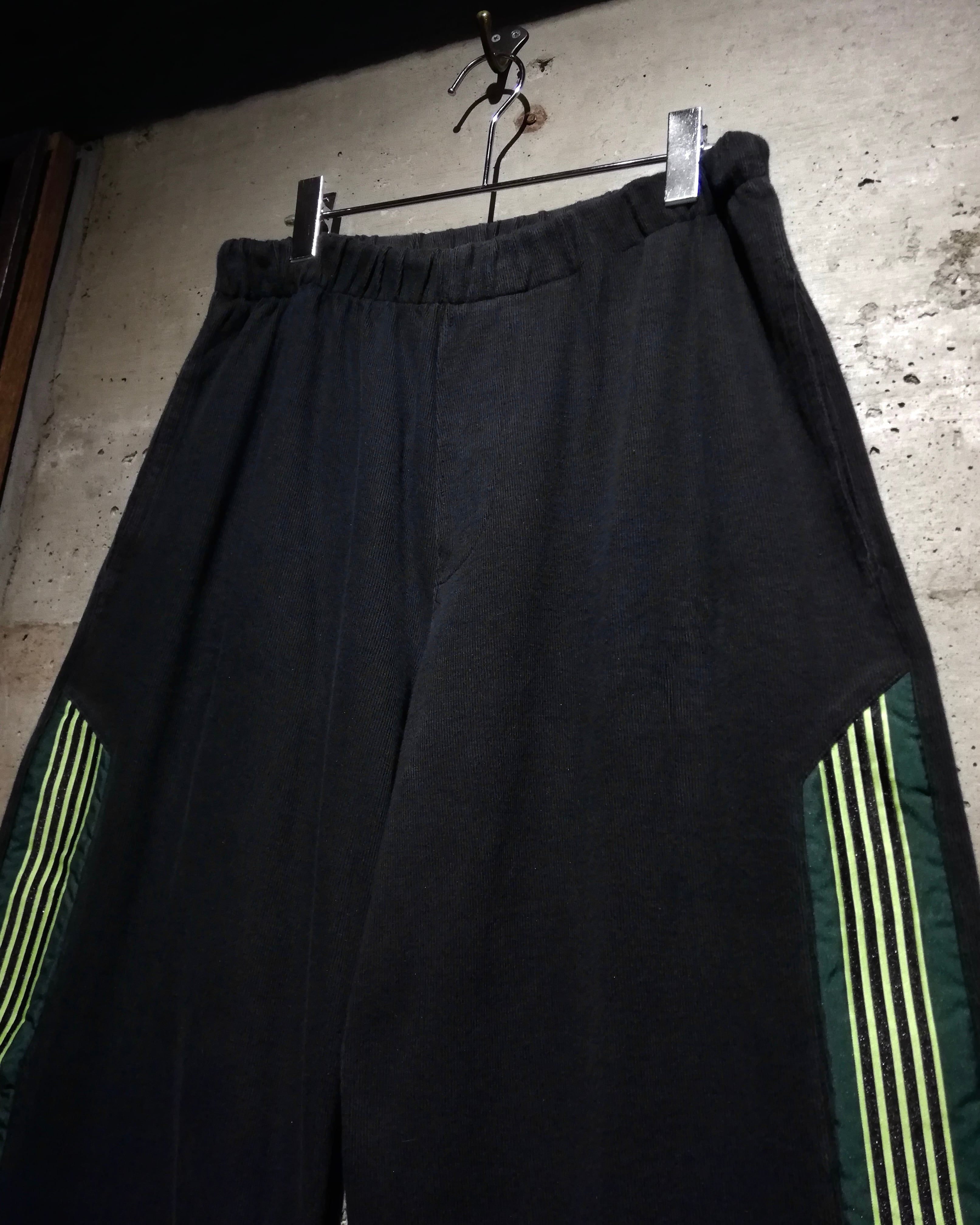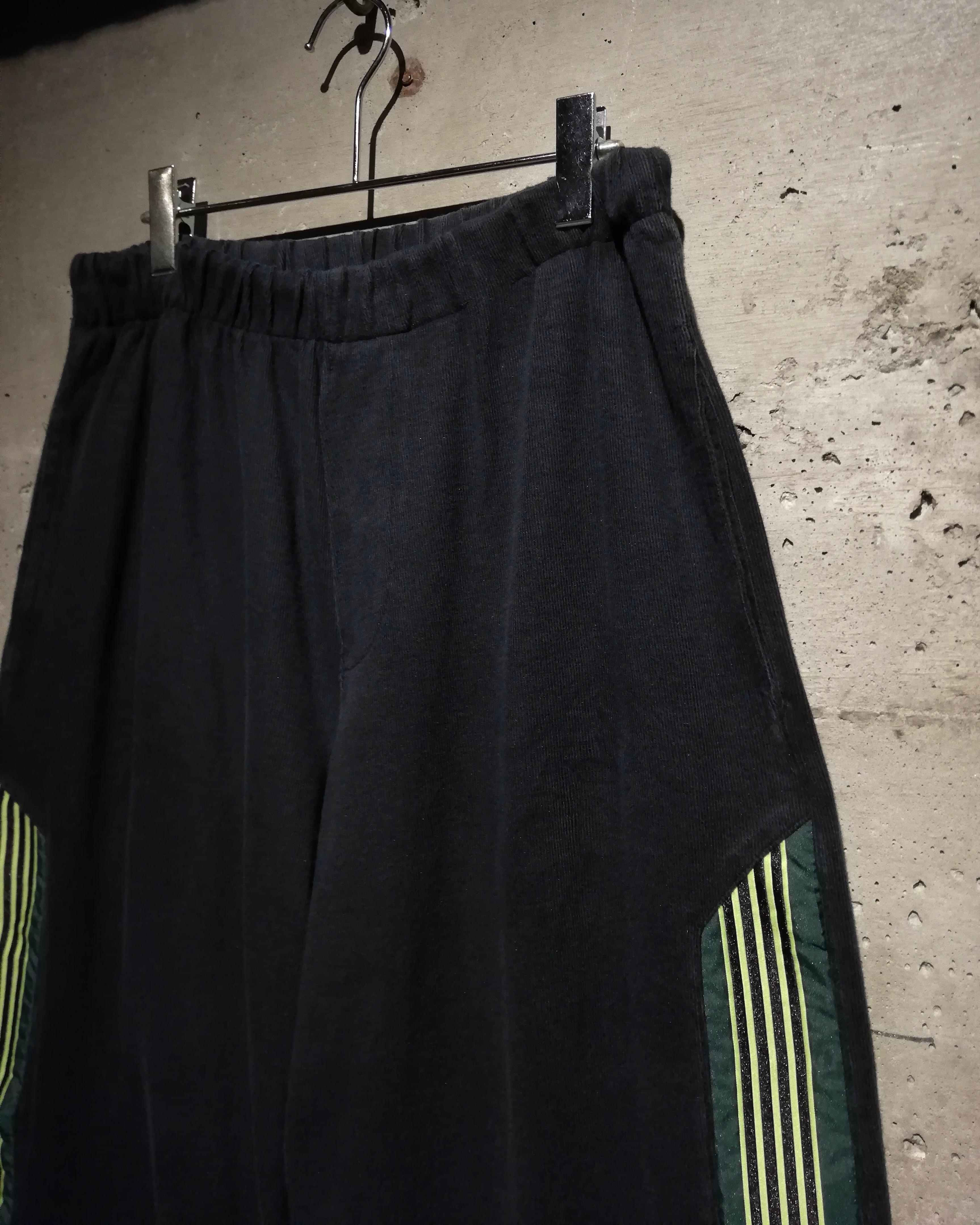 ダークトーンのボディをベースに、サイドへ大胆に配されたネオンイエロー×グリーンのラインワークが印象的なパンツ。当時の空気感をしっかりと纏ったグラフィックに、異素材を切り替えることとで抜群の存在感を放っています。