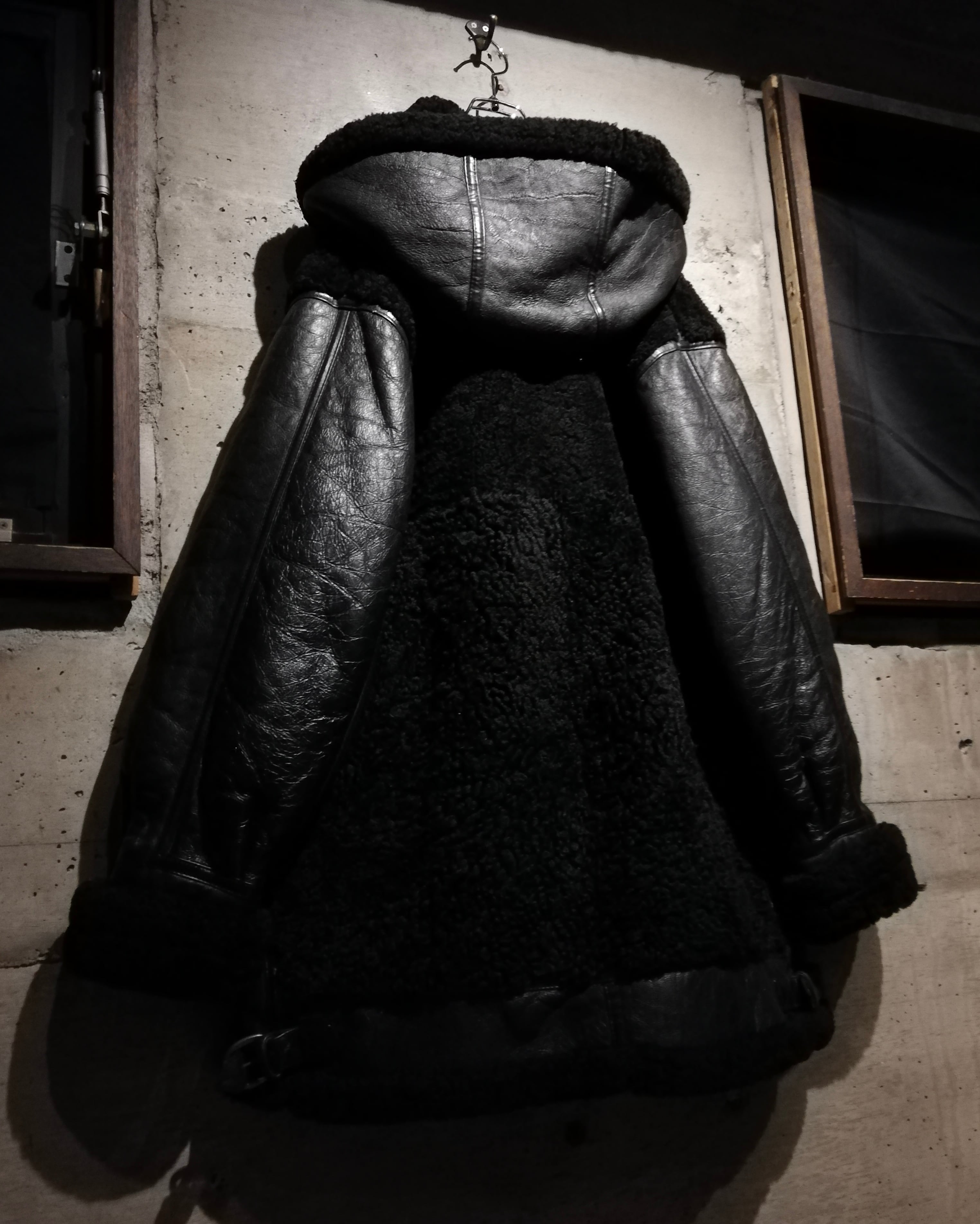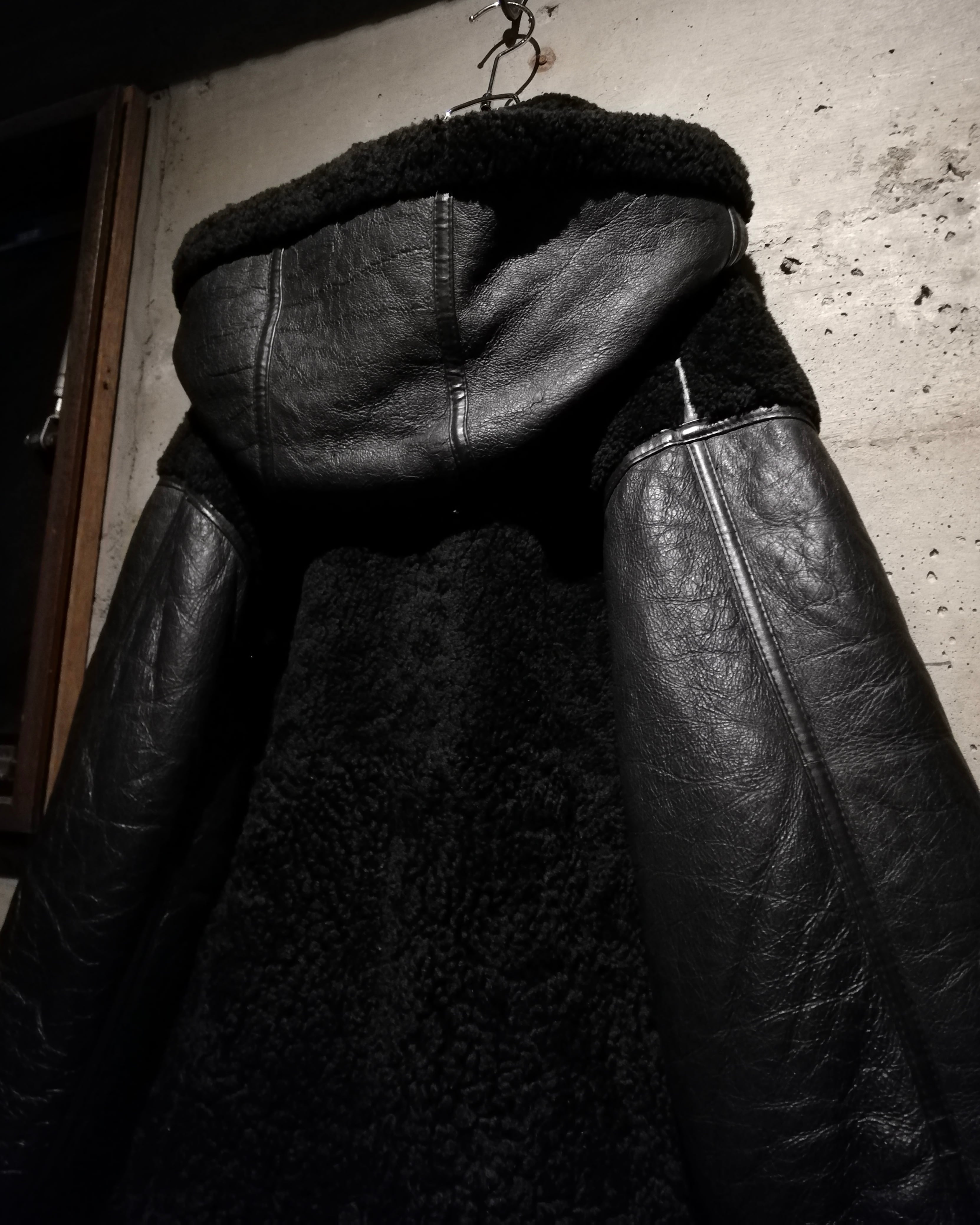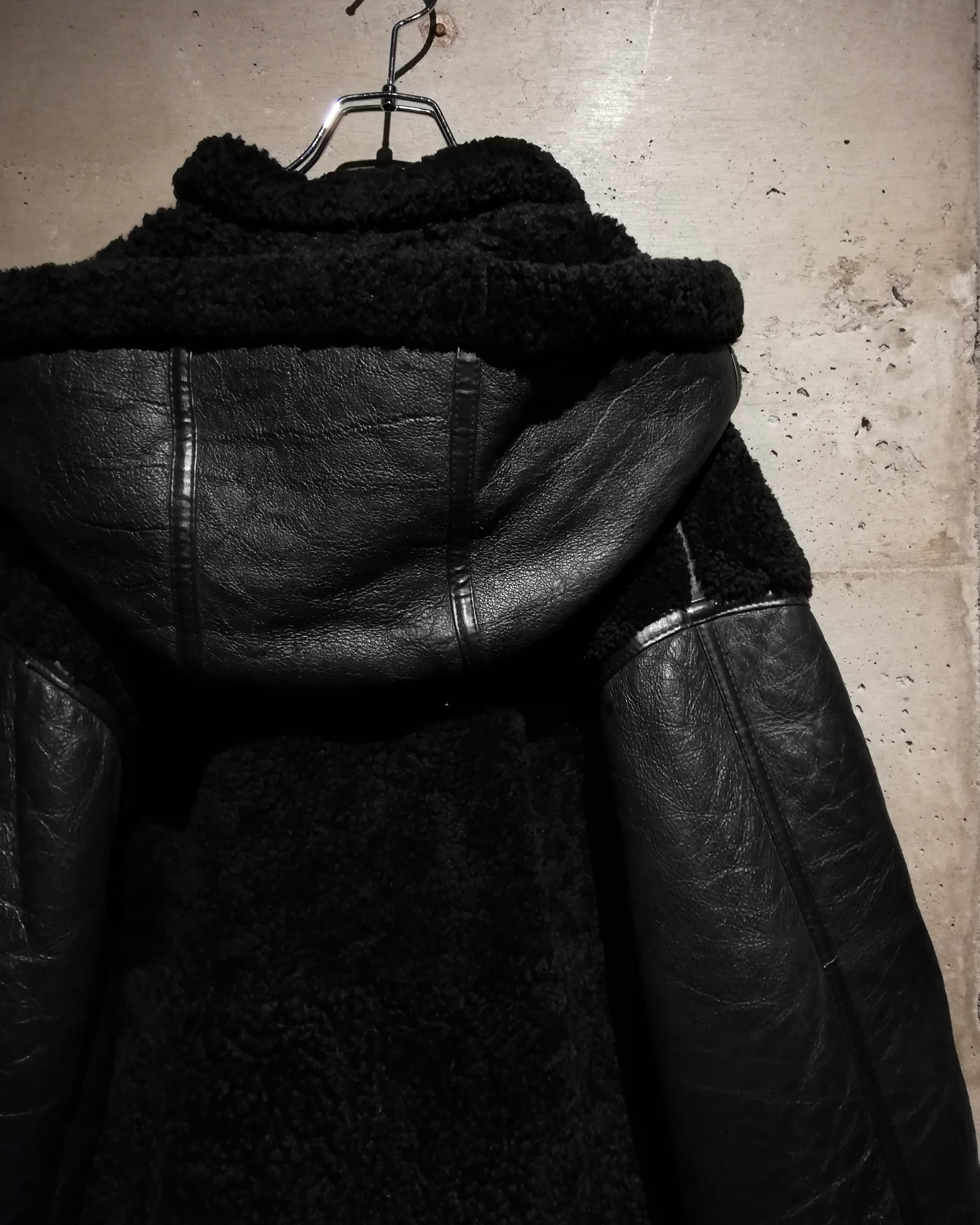 リアルムートンを用いた重厚感漂う切り替えデザイン。コート感覚で着用できるオーバーサイズも魅力。特出すべきはこのデザイン。レザー側を内側に、毛を外。保温性をほぼ無視した、デザイン特化型。古着ならではの魅力が詰まったデザインだと思います。