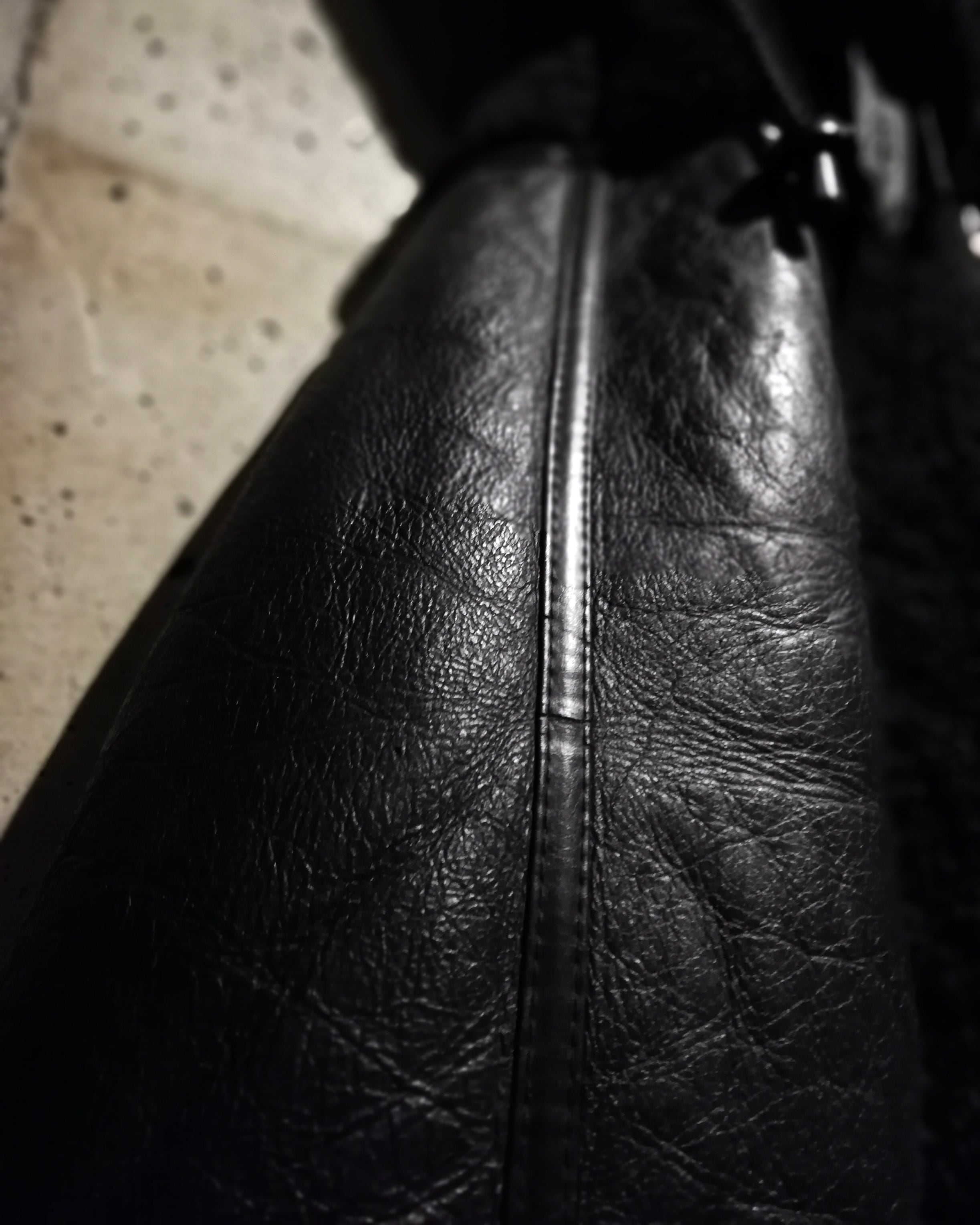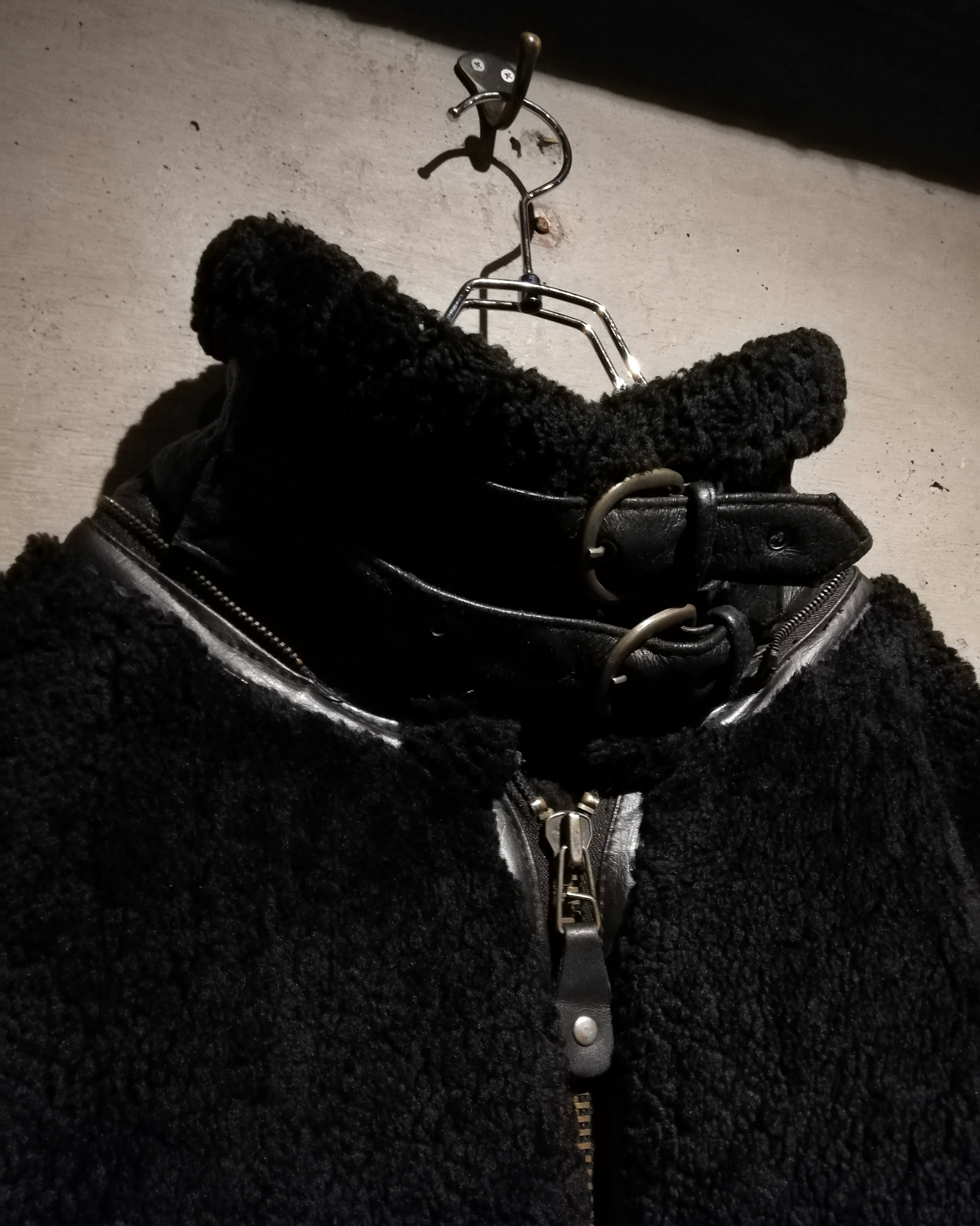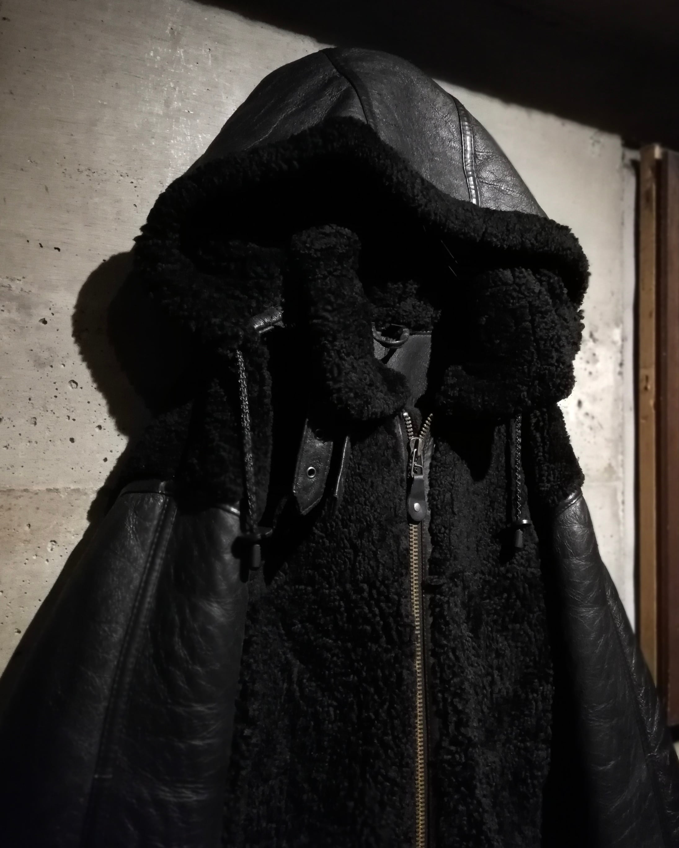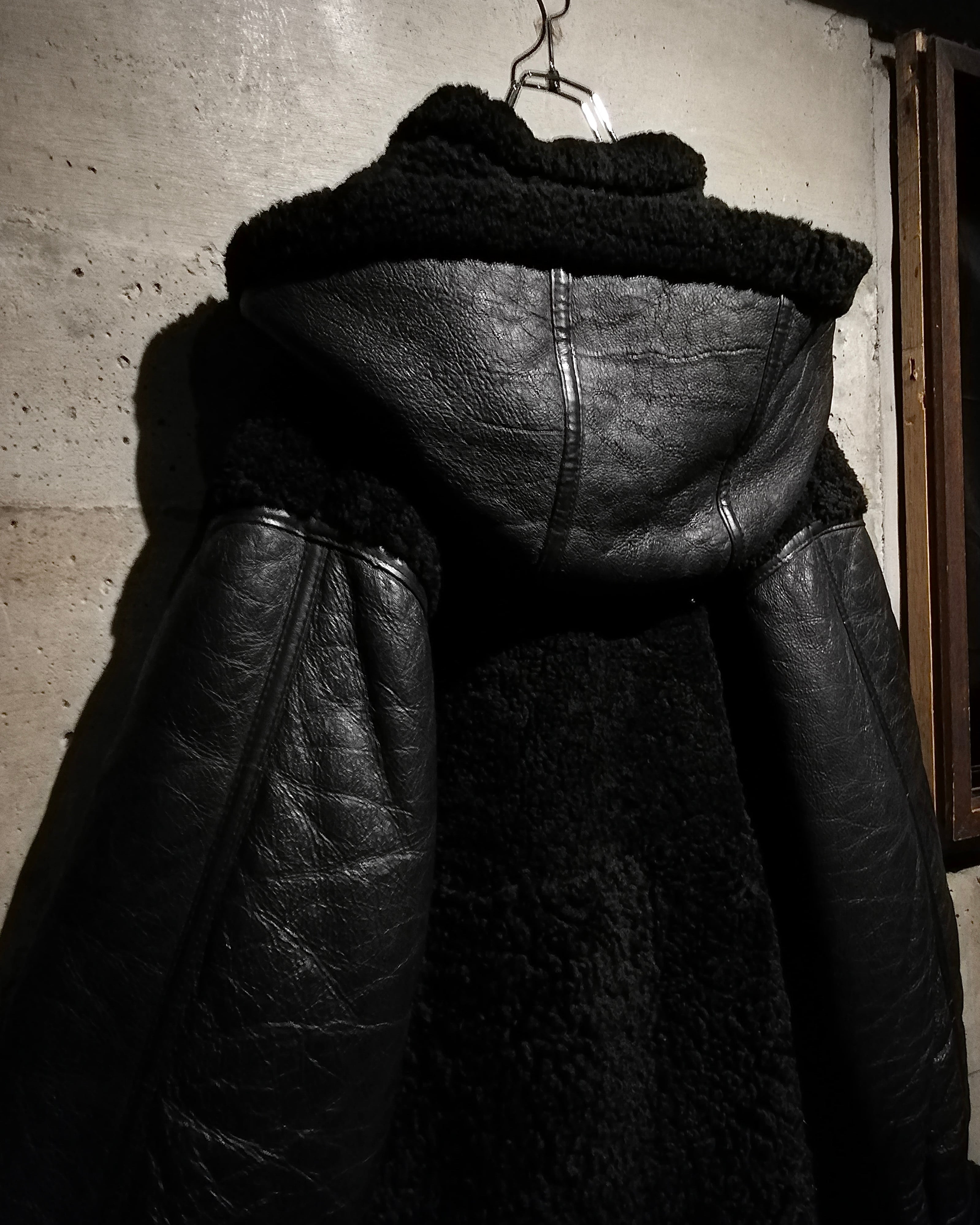 リアルムートンを用いた重厚感漂う切り替えデザイン。コート感覚で着用できるオーバーサイズも魅力。特出すべきはこのデザイン。レザー側を内側に、毛を外。保温性をほぼ無視した、デザイン特化型。古着ならではの魅力が詰まったデザインだと思います。