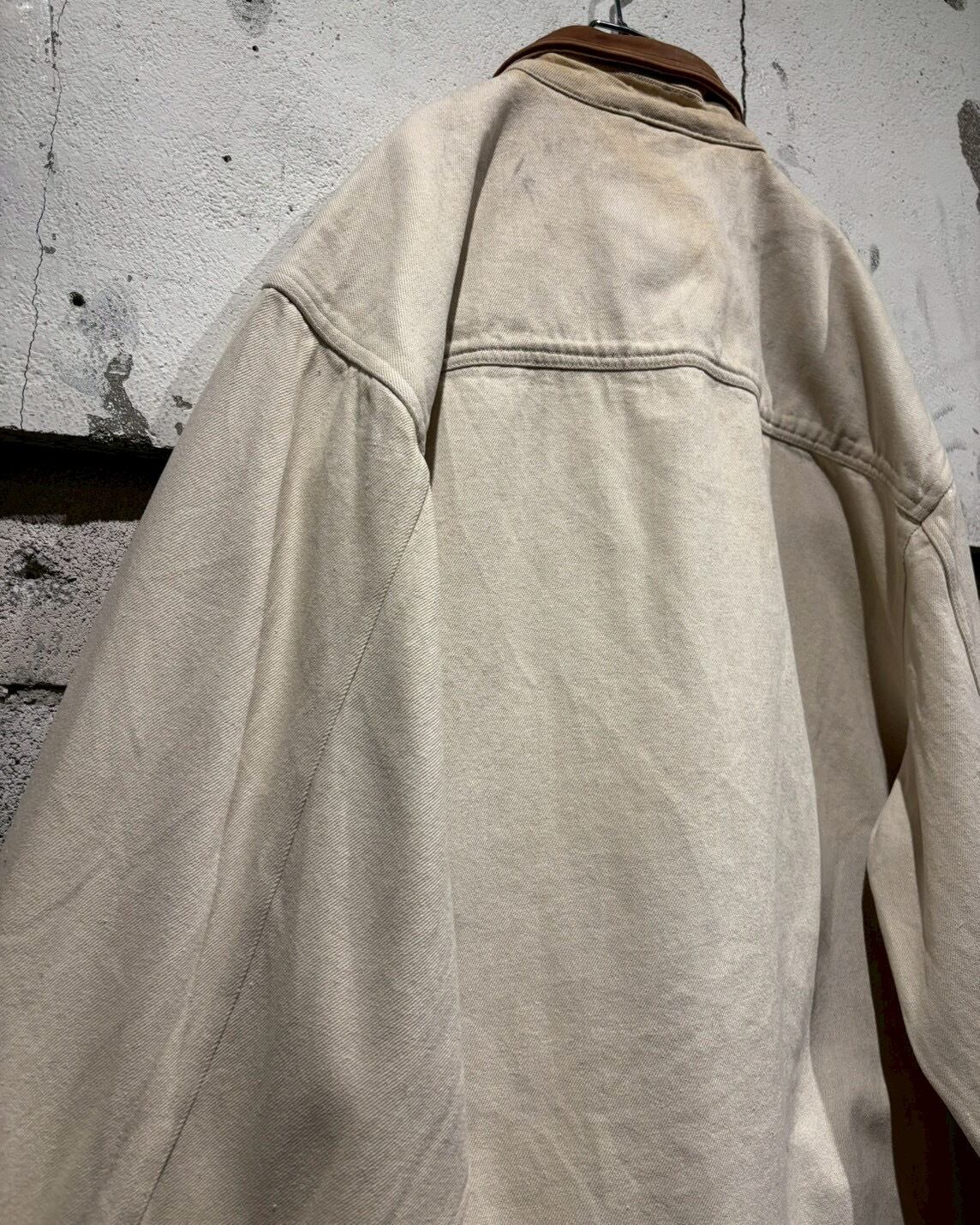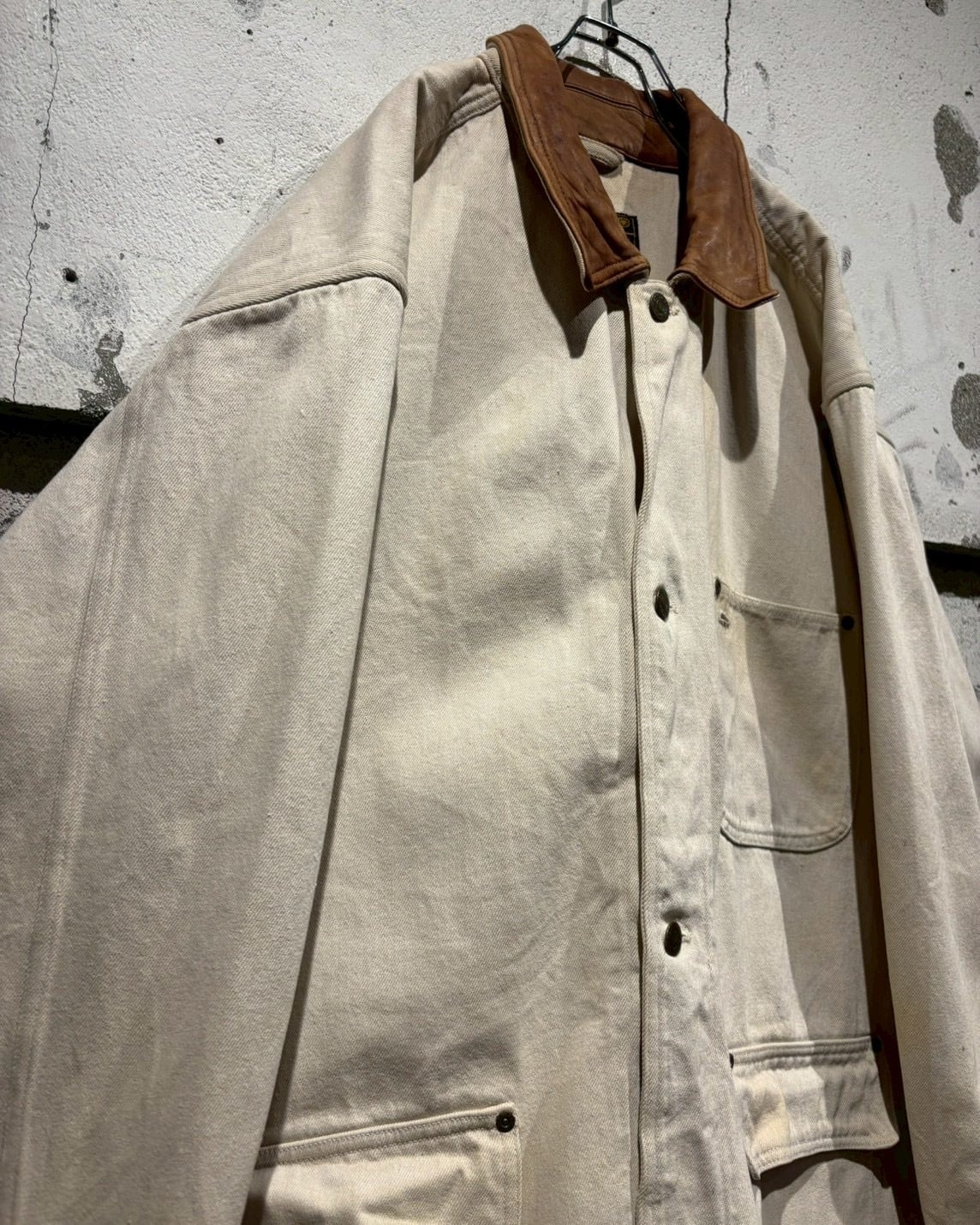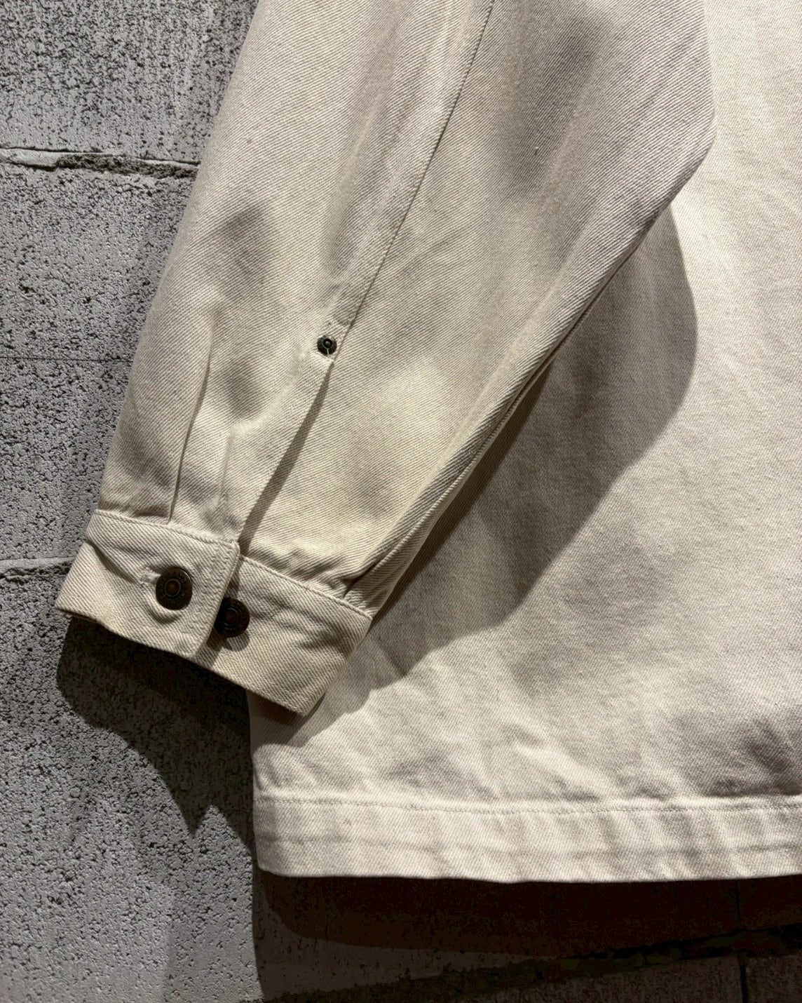 ボディにはアイボリーのコットン素材を採用し、襟元にはブラウンレザーを切り替え。ボディとのコントラストが非常に映え、ワークウェアを起点としながらも、どこか品のある佇まいを感じられます。