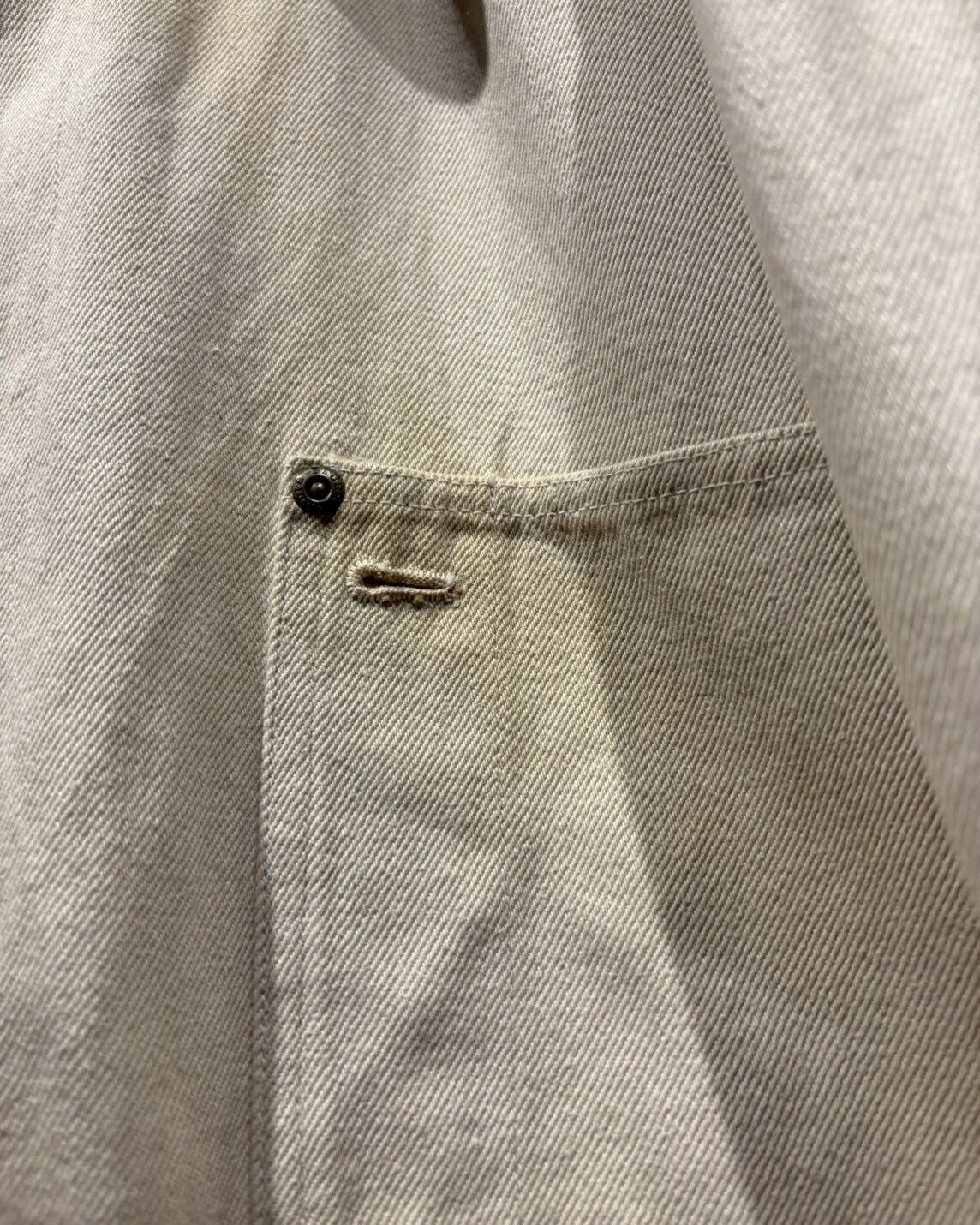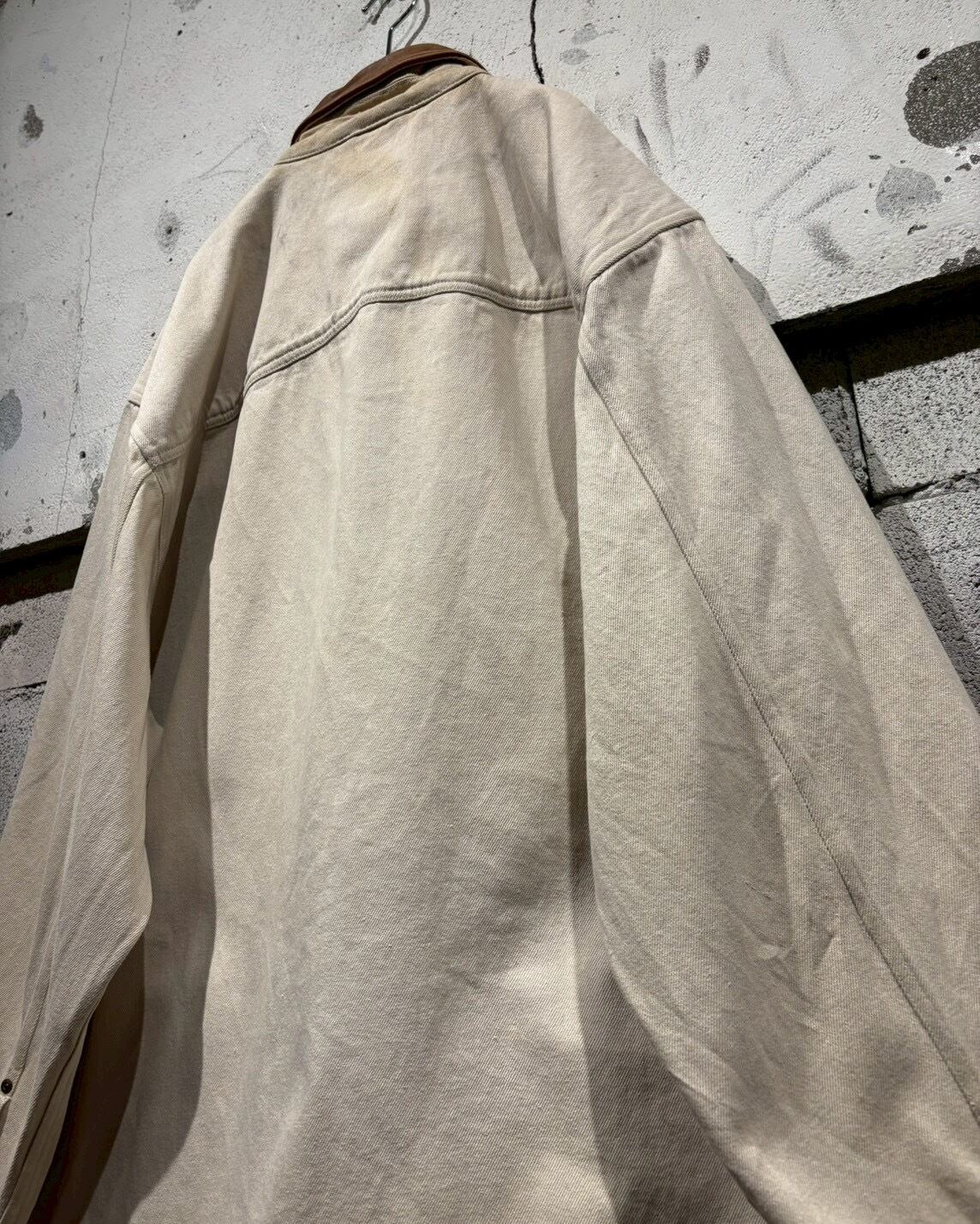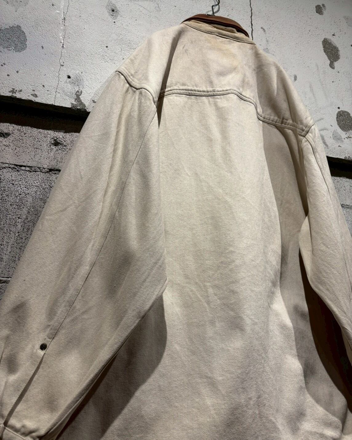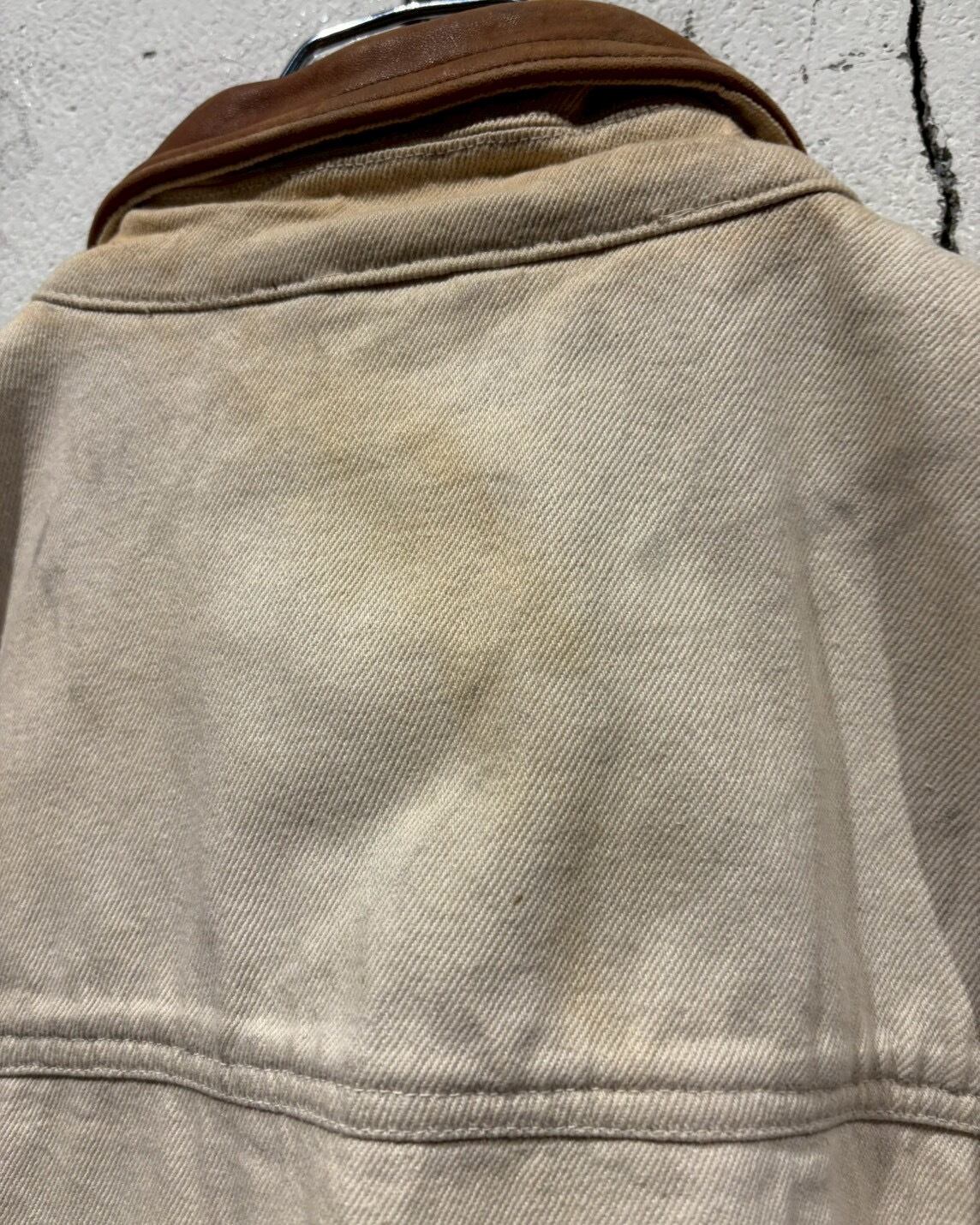 ボディにはアイボリーのコットン素材を採用し、襟元にはブラウンレザーを切り替え。ボディとのコントラストが非常に映え、ワークウェアを起点としながらも、どこか品のある佇まいを感じられます。