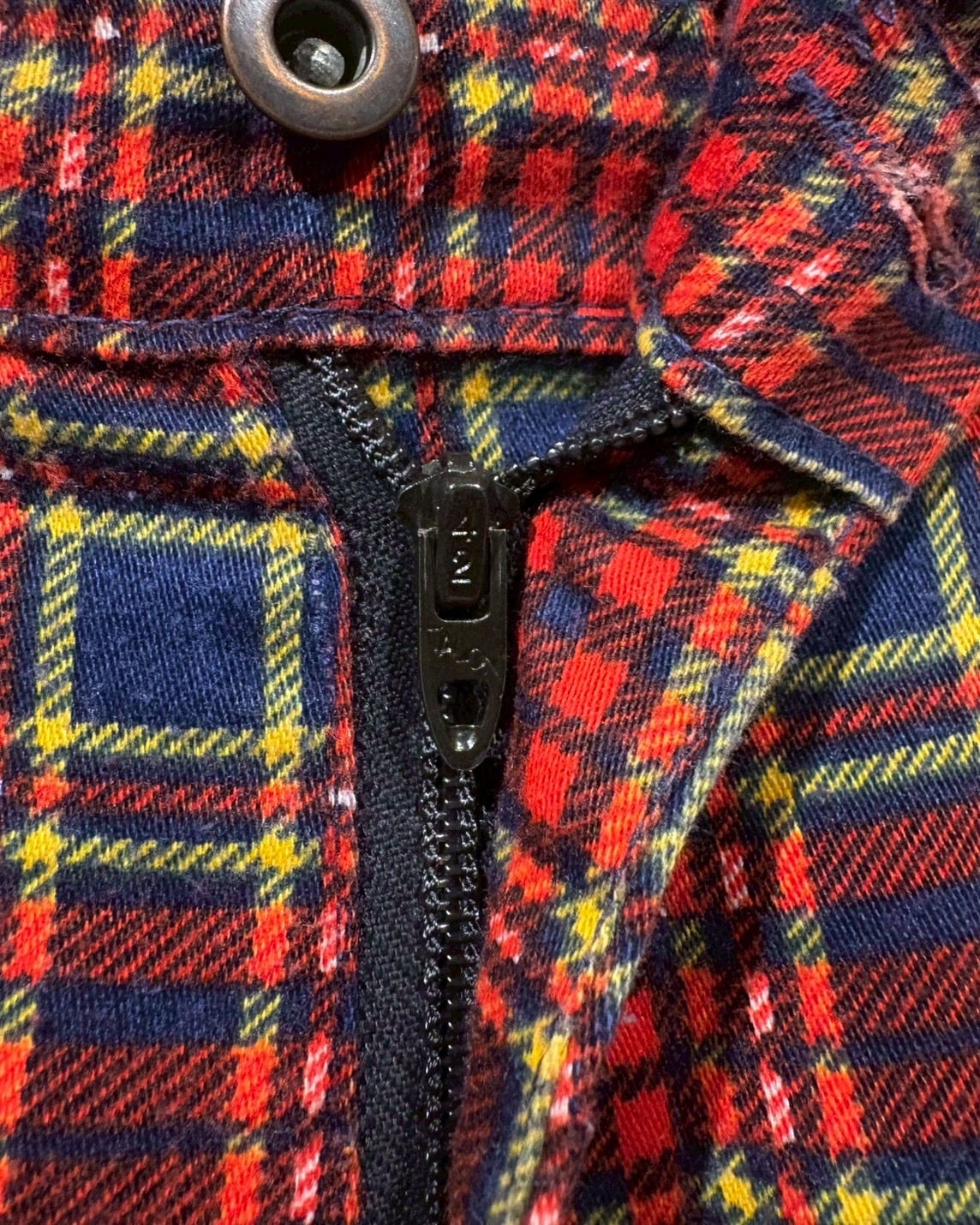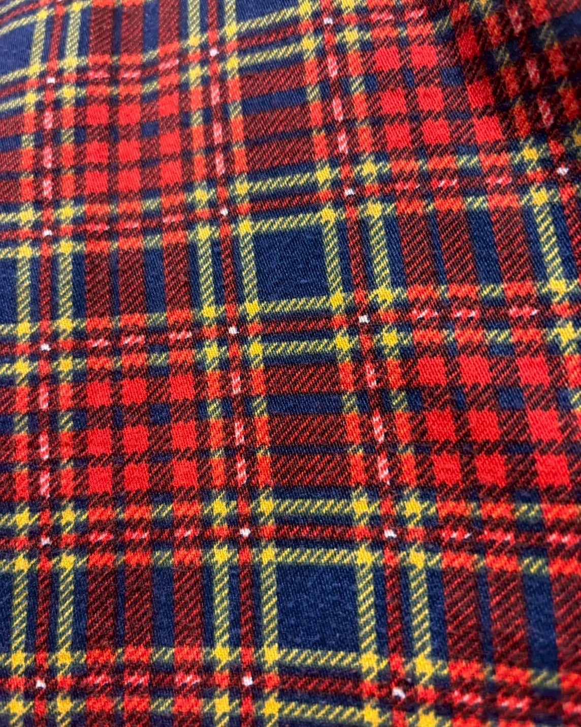 ボディはレッドを基調としたプリントネルパターンで、ネイビーやイエローが合わさるクラシカルな配色が◎
