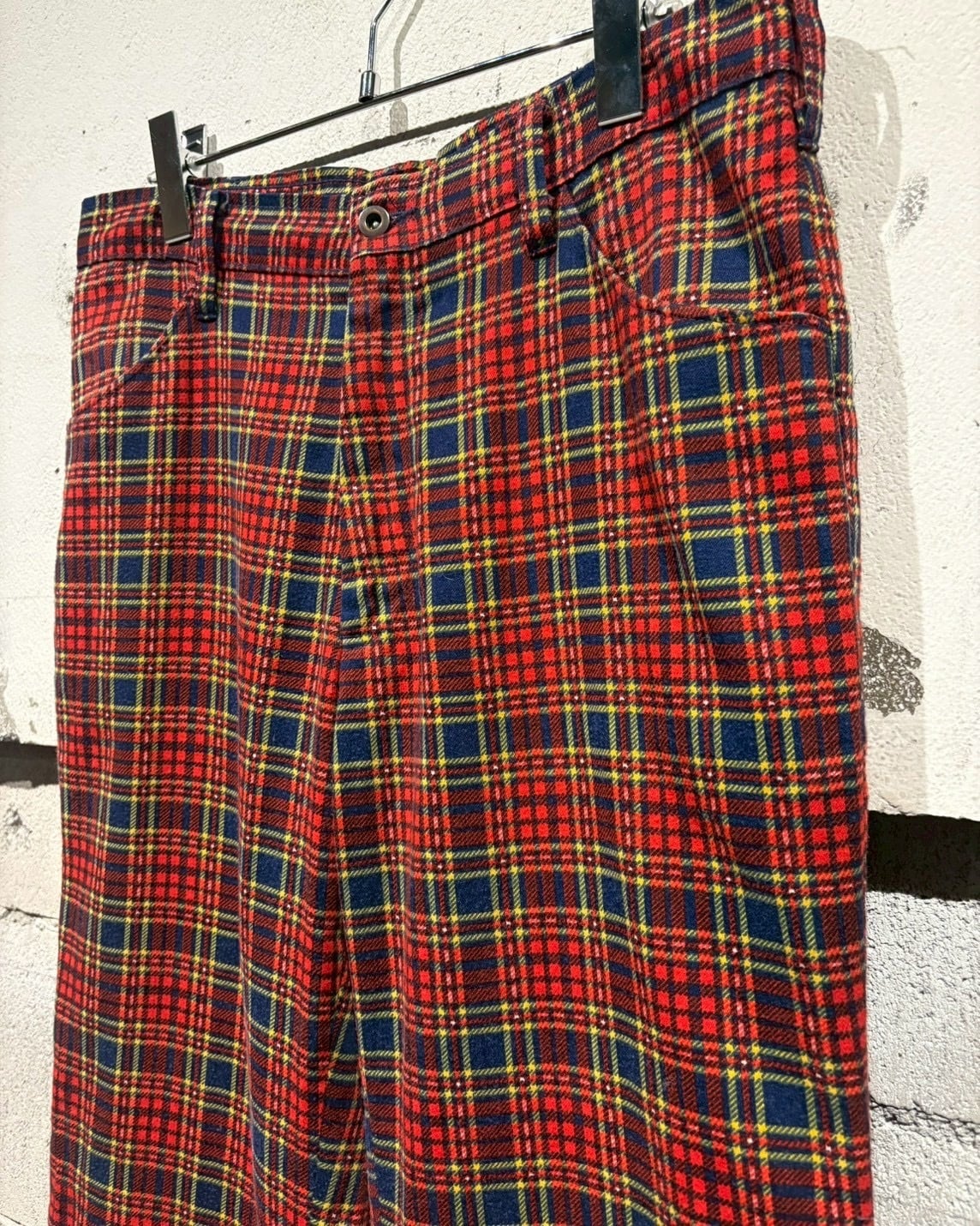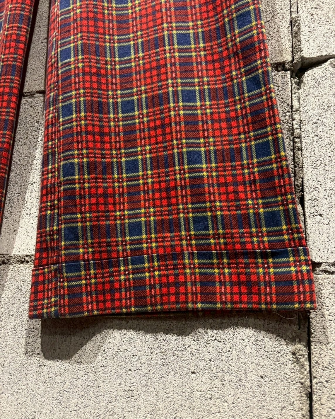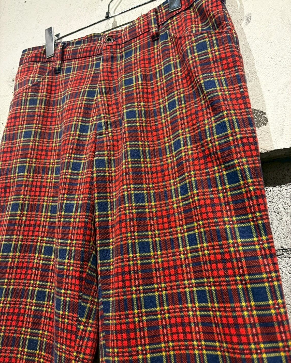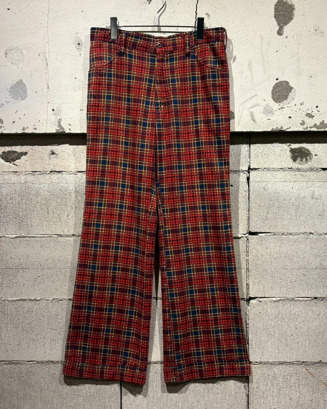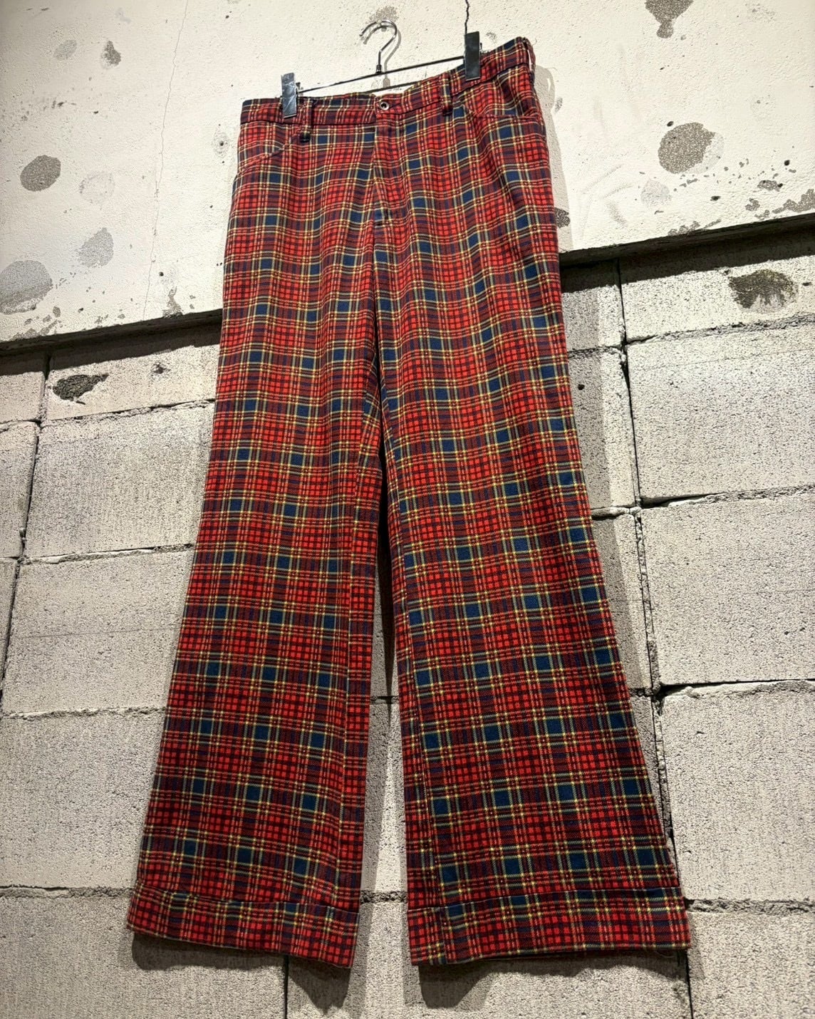 チェック柄×ワイドフレアという時代性とデザイン性を兼ね備えつつ、現代のスタイリングにもしっかりとハマるワイドフレアパンツの逸品です。