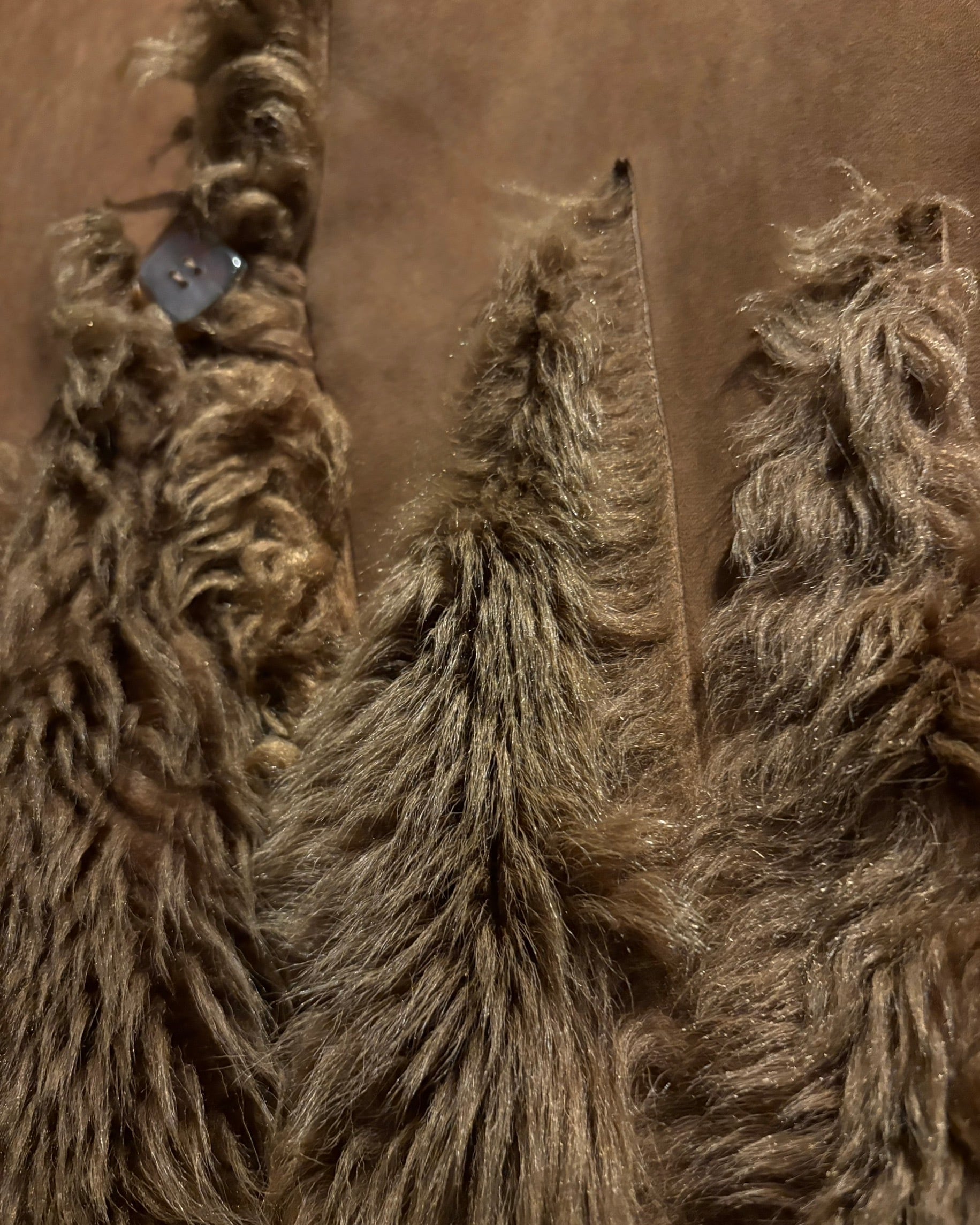 ボディと袖にはジグザグ状にファーを切り替え、ムートンの柔らかな質感とのコントラストが際立つデザイン。冬の定番素材であるファーとムートンを同時に楽しめる、非常に贅沢な一着です。