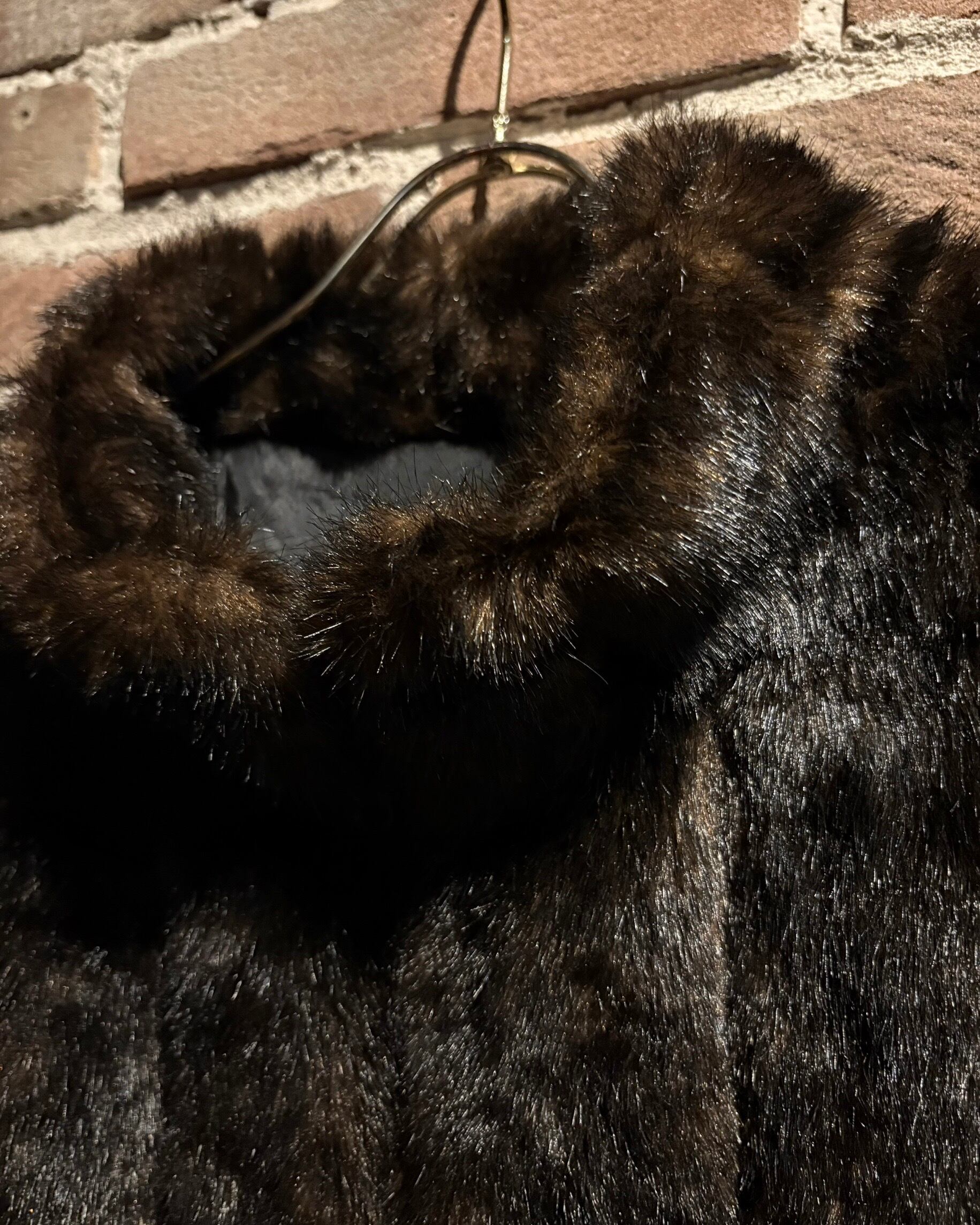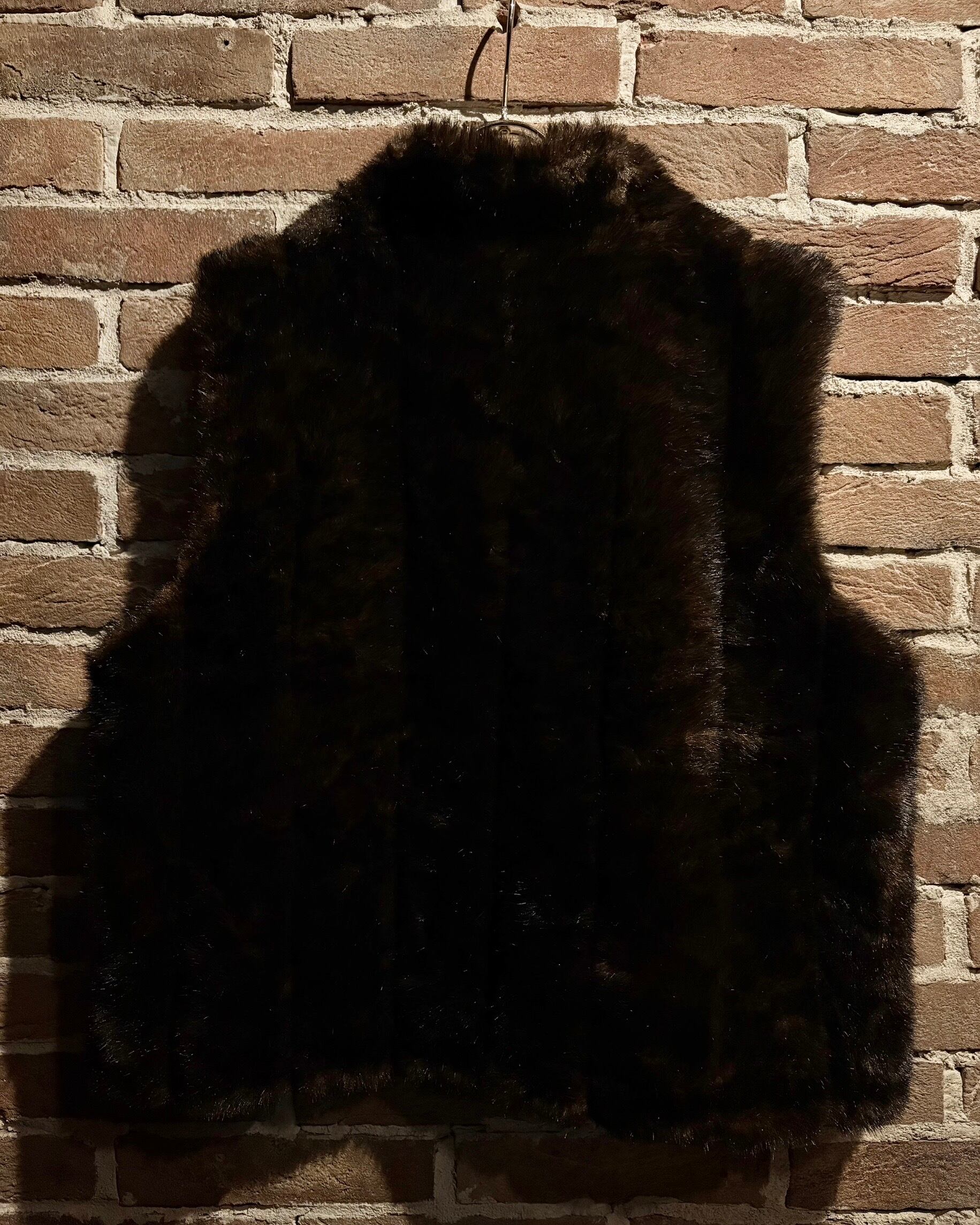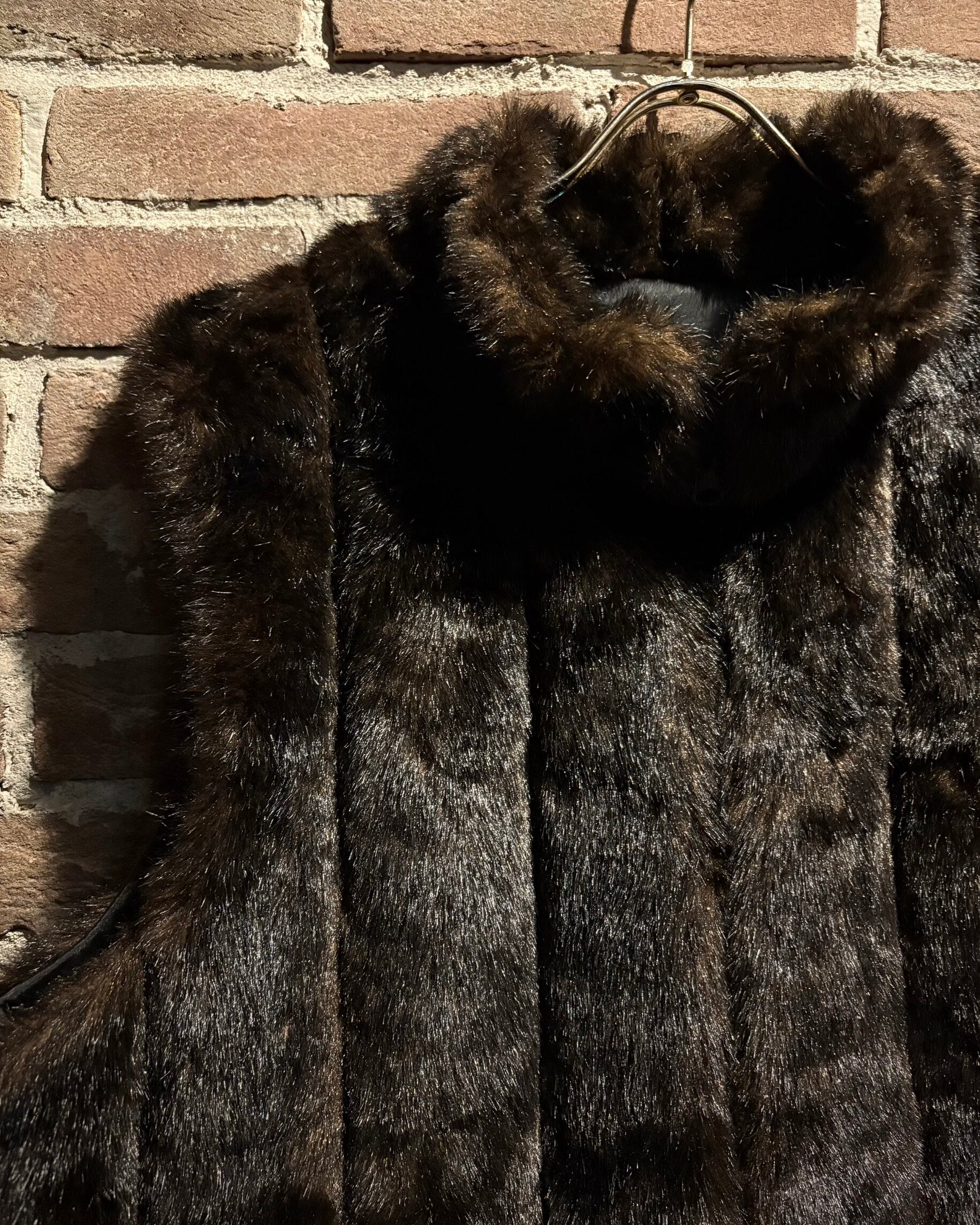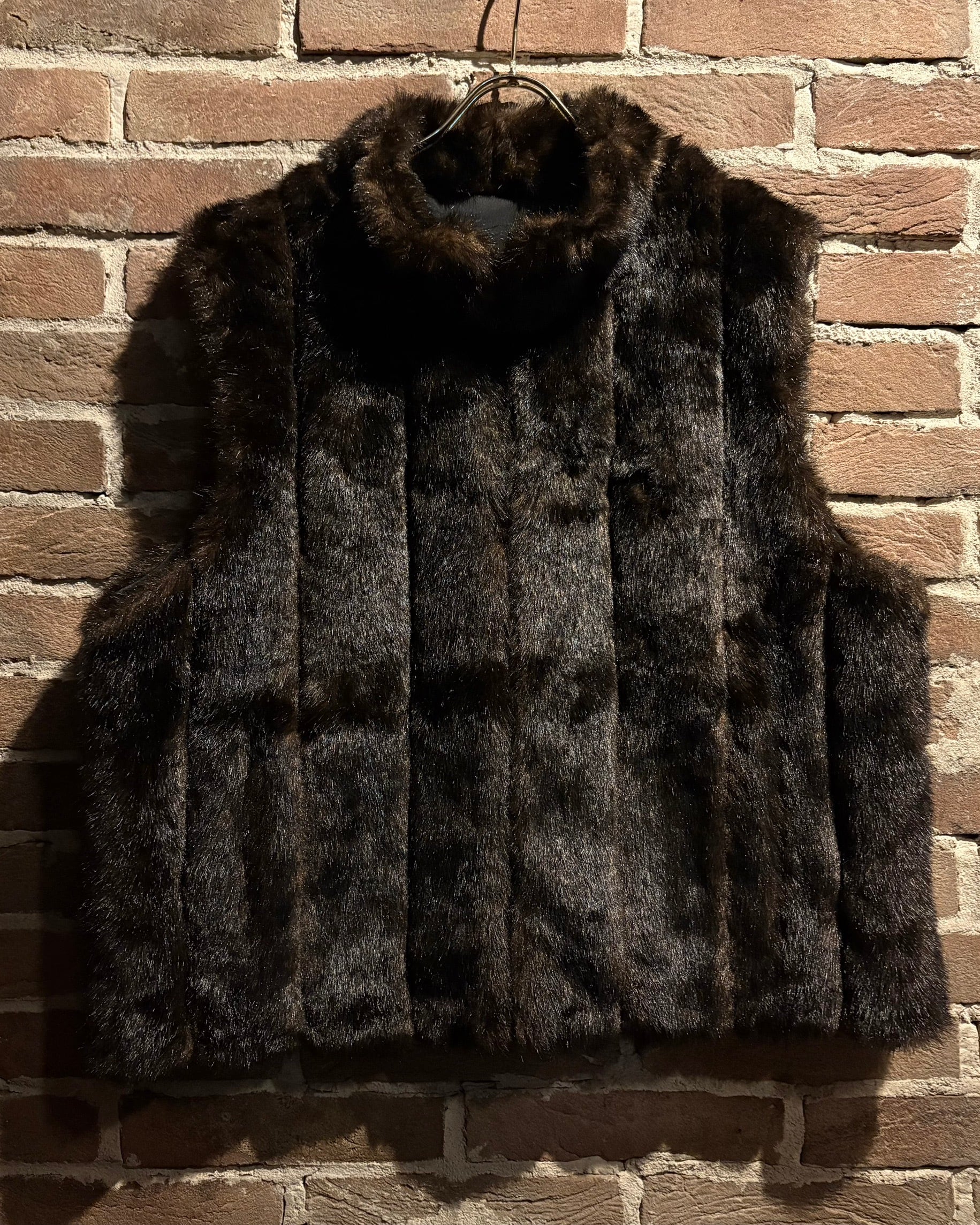フェイクファーとポリエステル、異なる表情を一着で楽しめるリバーシブル仕様のジップアップベスト。