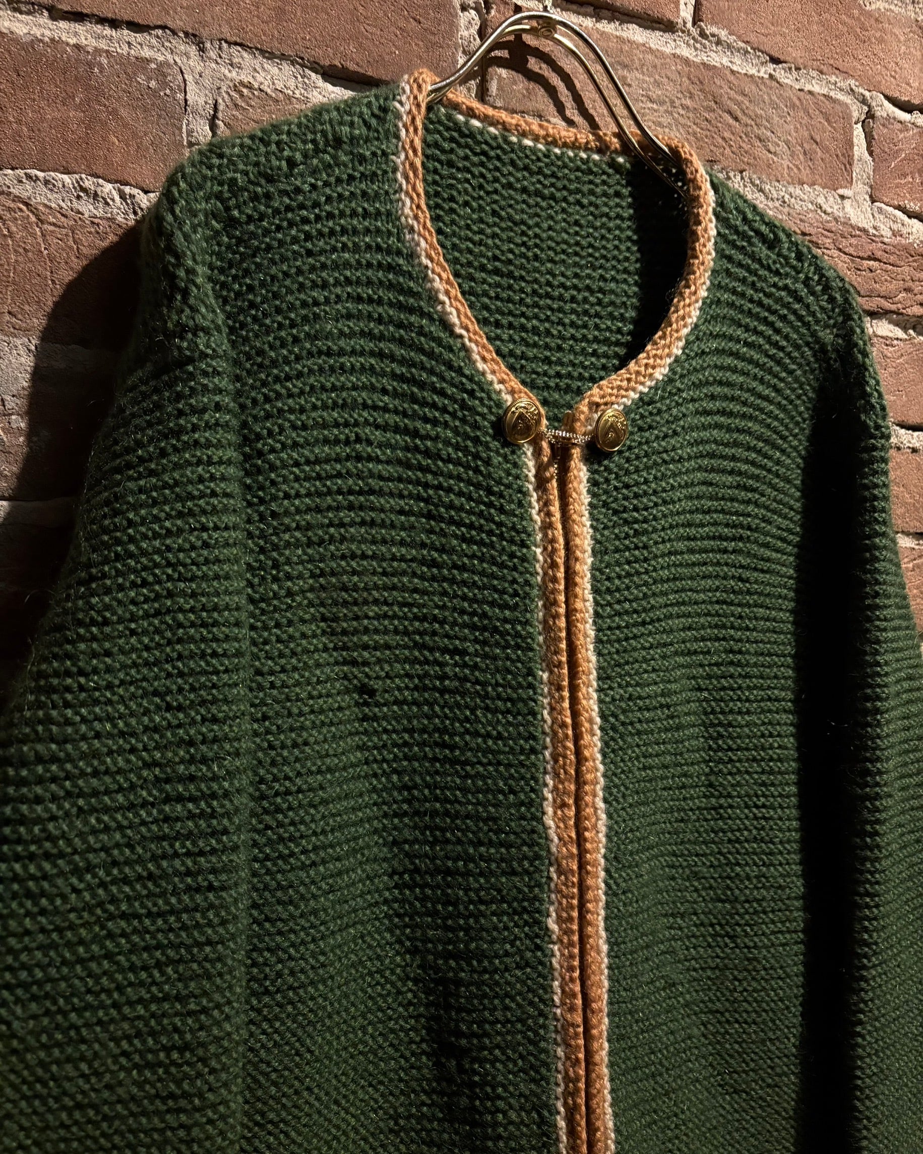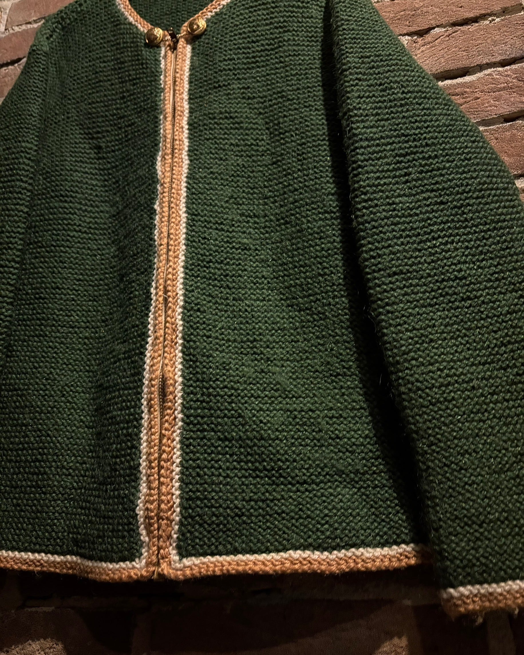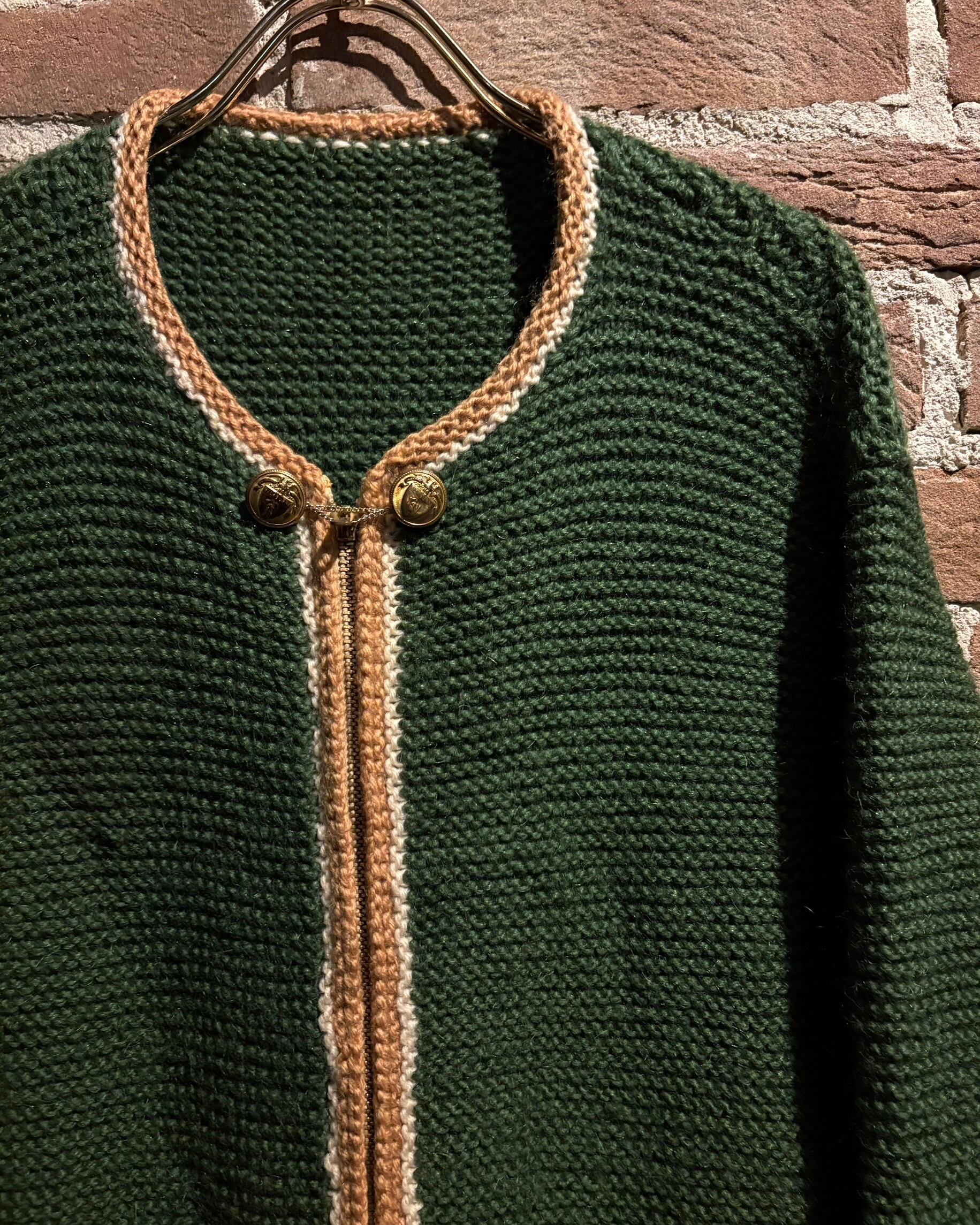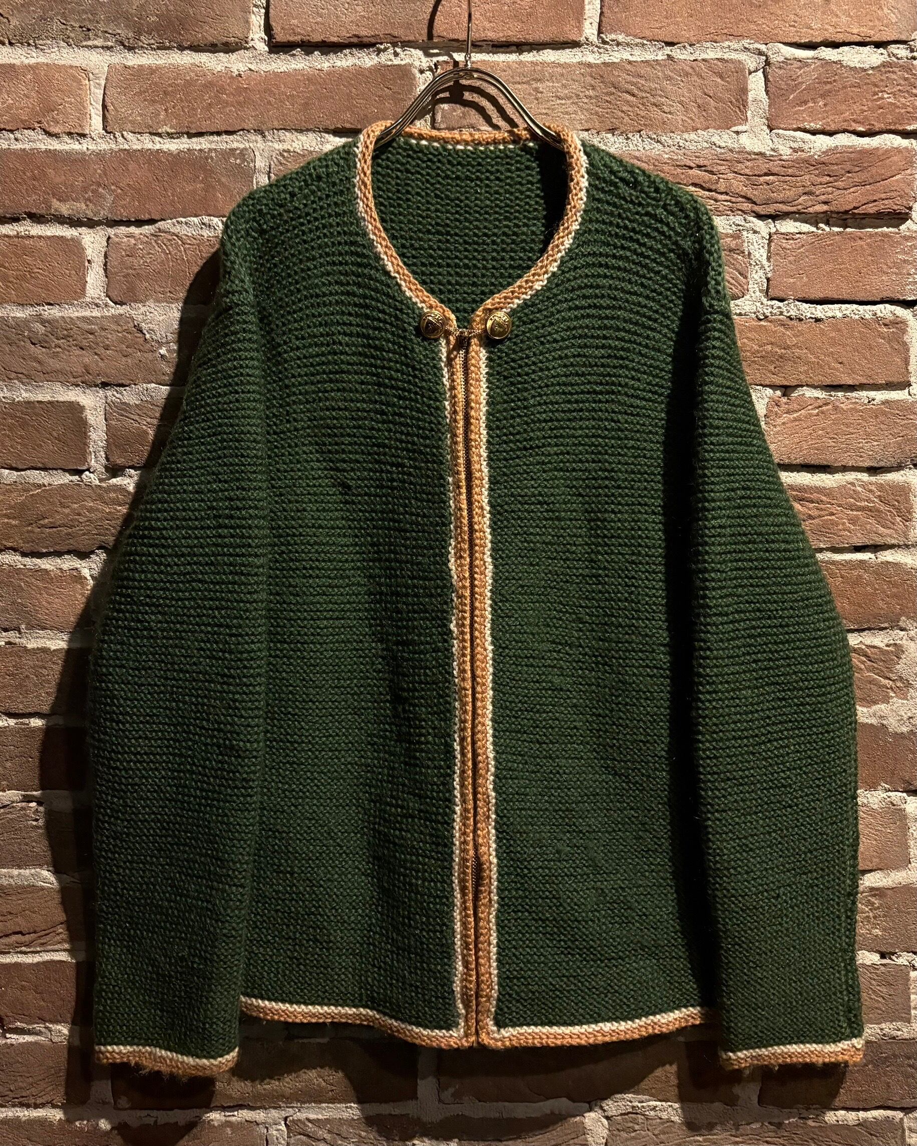 深みのあるグリーンを基調に、ゴールド×ホワイトの配色を効かせたヴィンテージニットジャケット。
