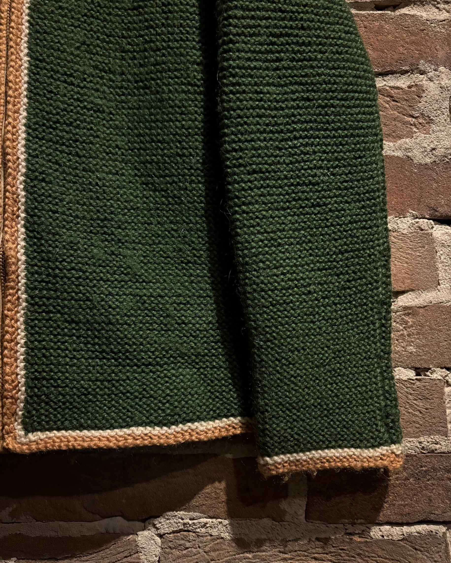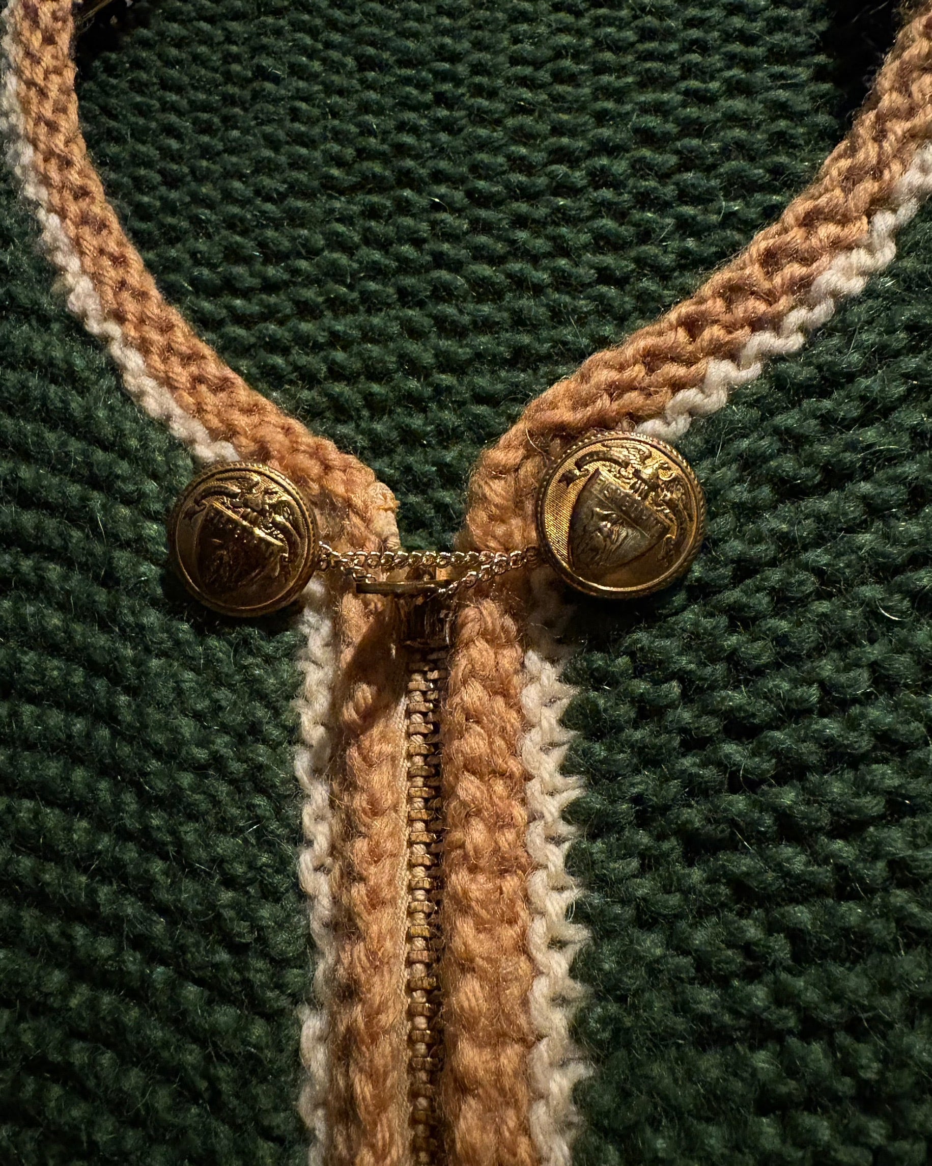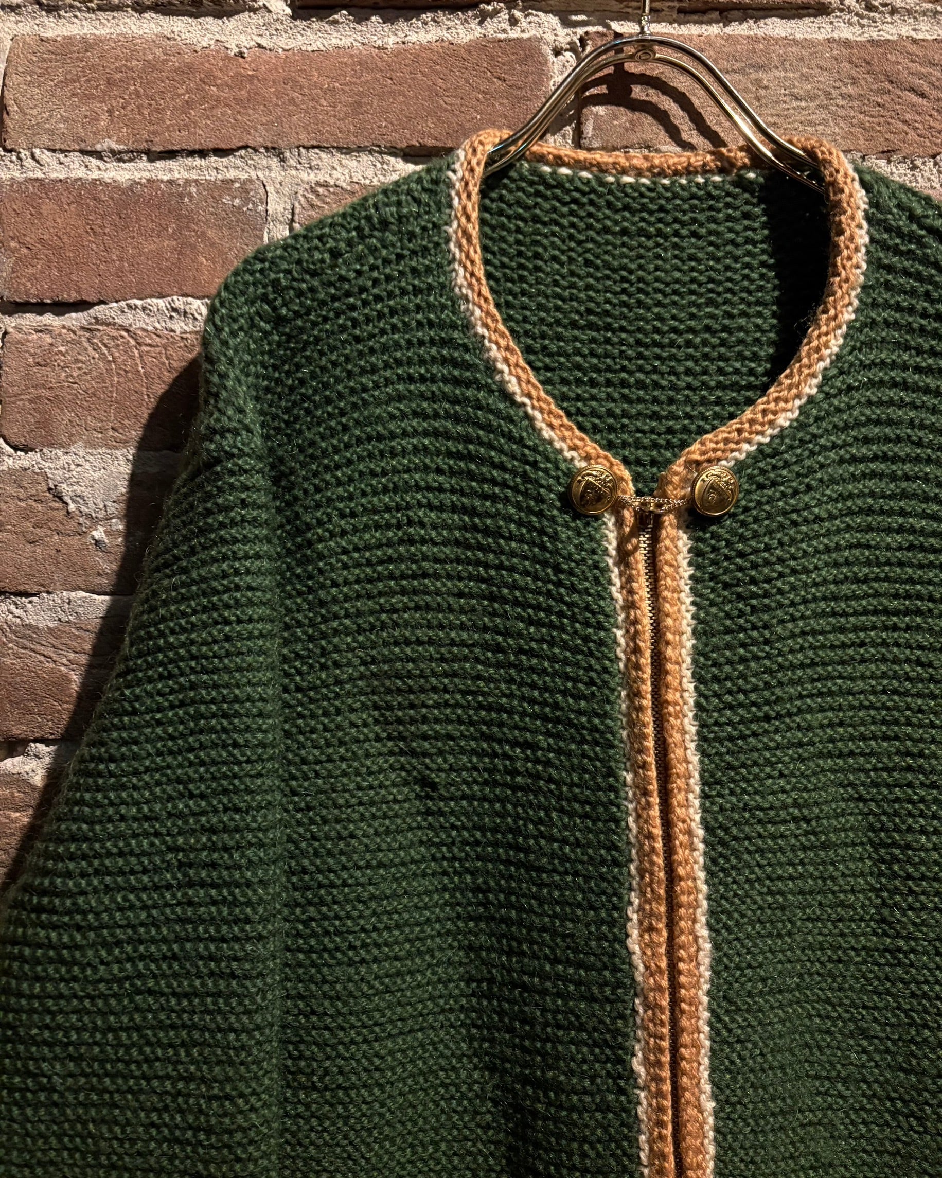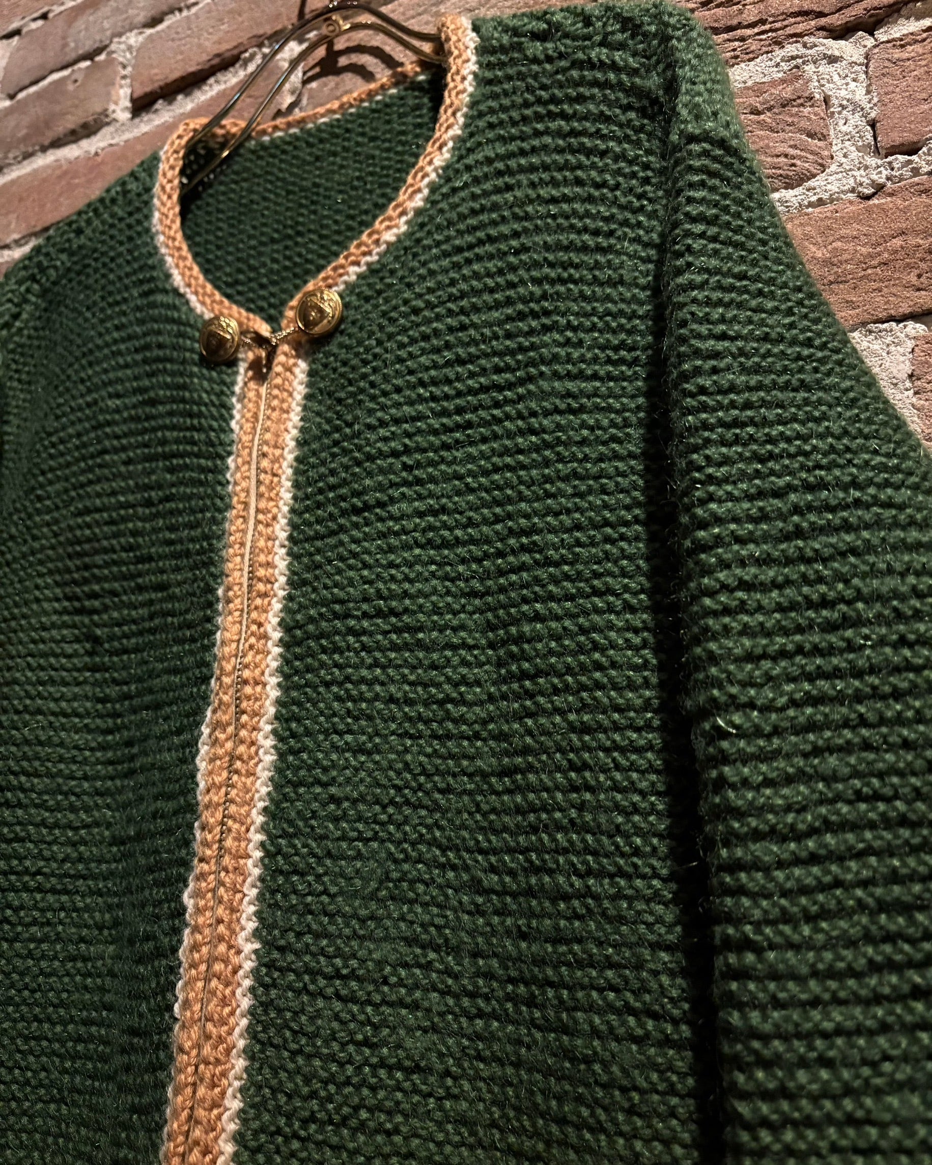 深みのあるグリーンを基調に、ゴールド×ホワイトの配色を効かせたヴィンテージニットジャケット。