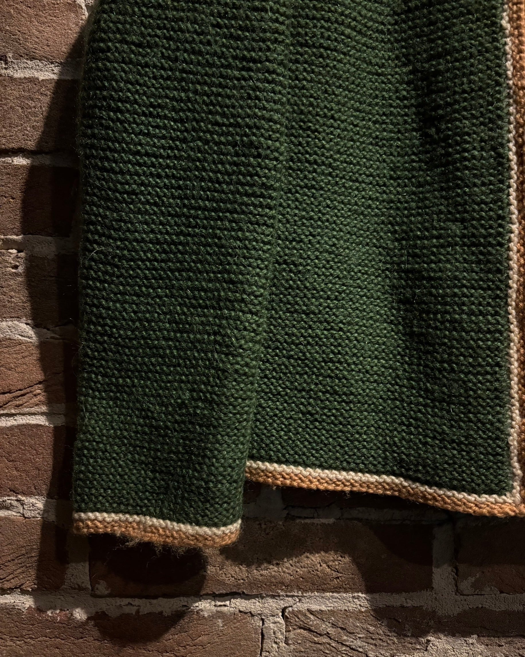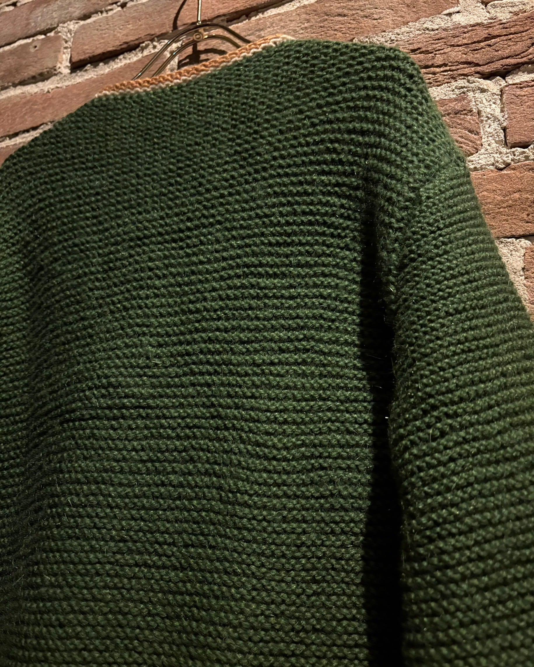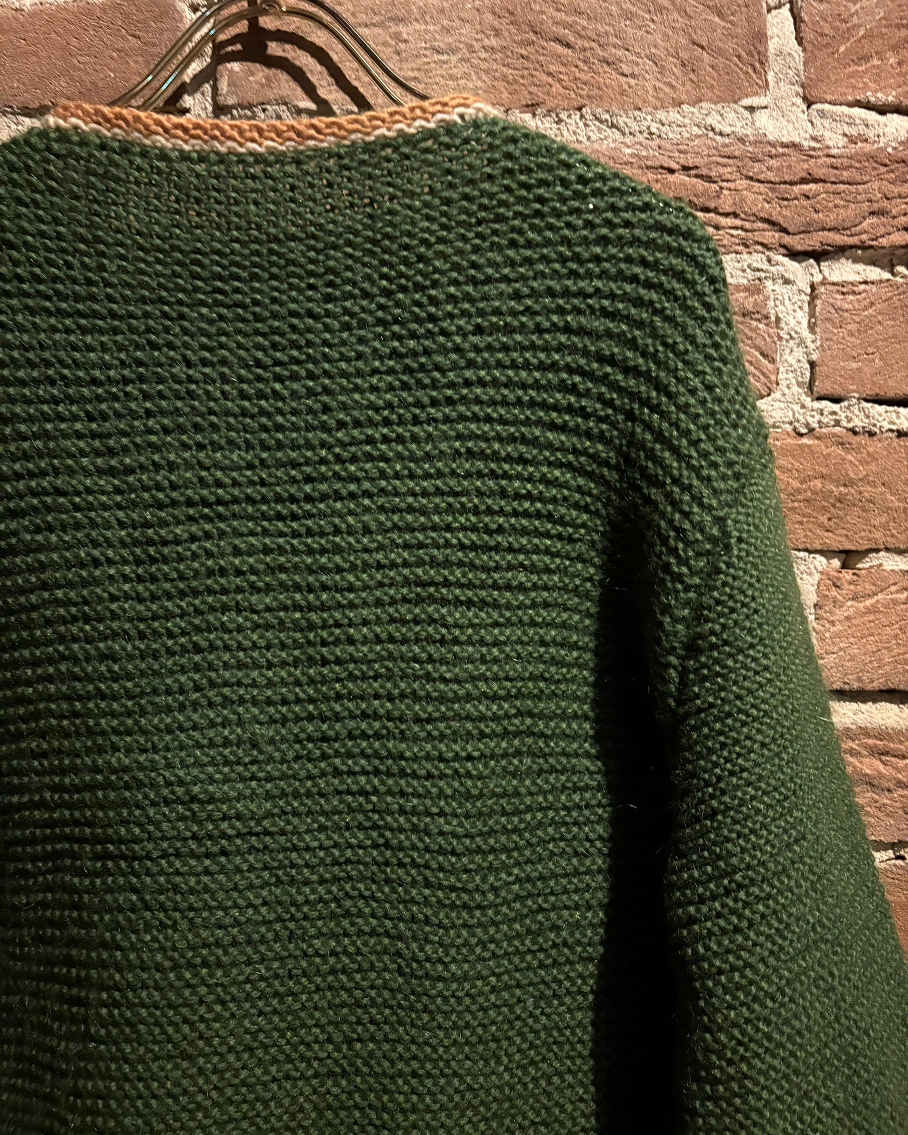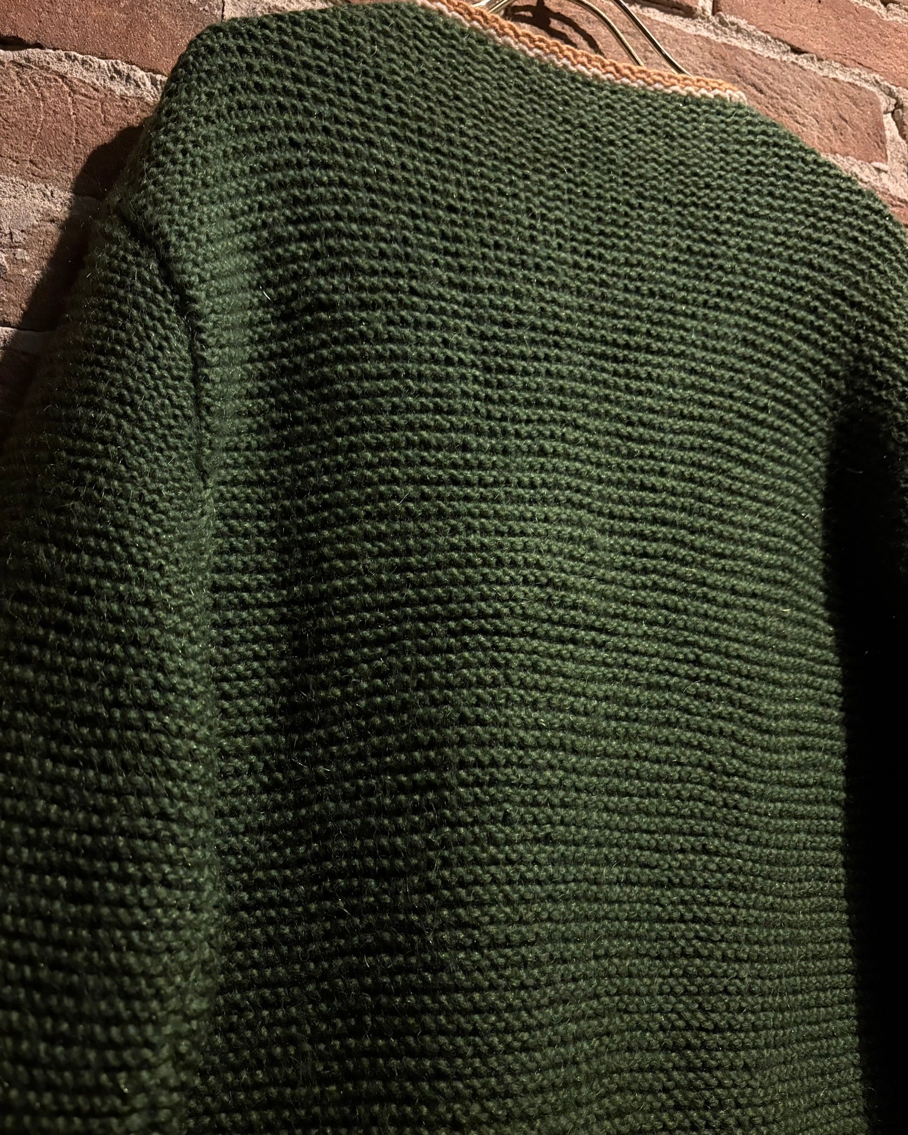 深みのあるグリーンを基調に、ゴールド×ホワイトの配色を効かせたヴィンテージニットジャケット。