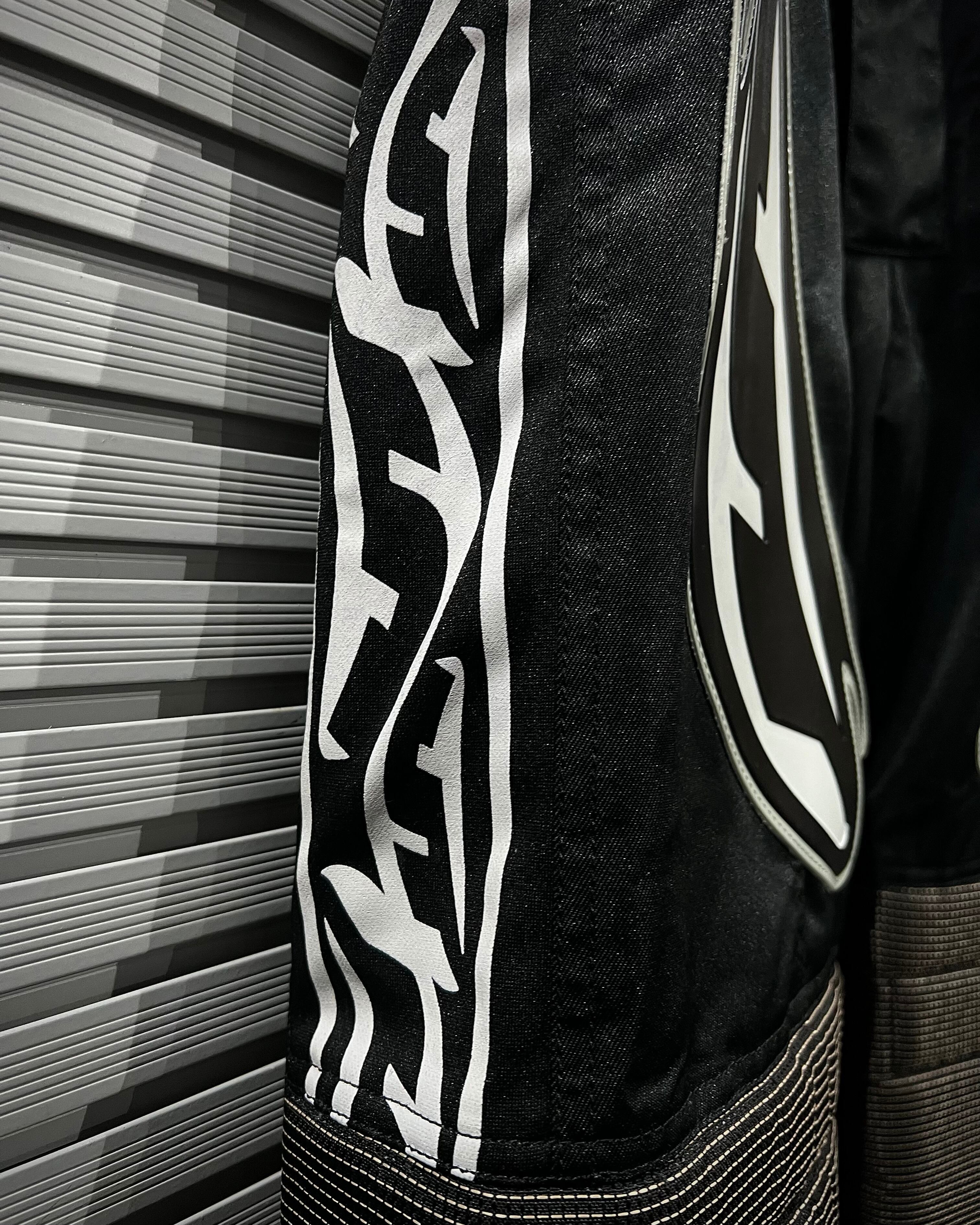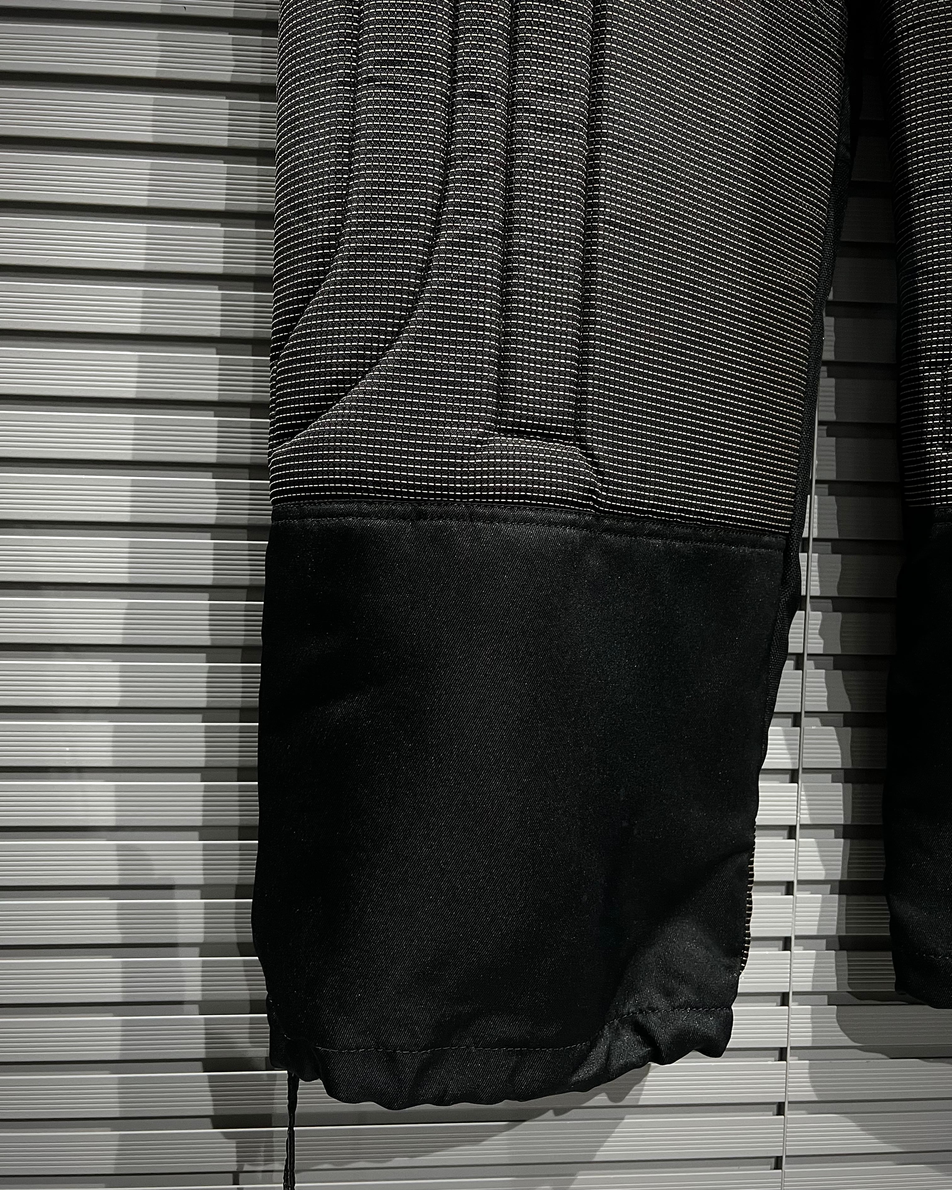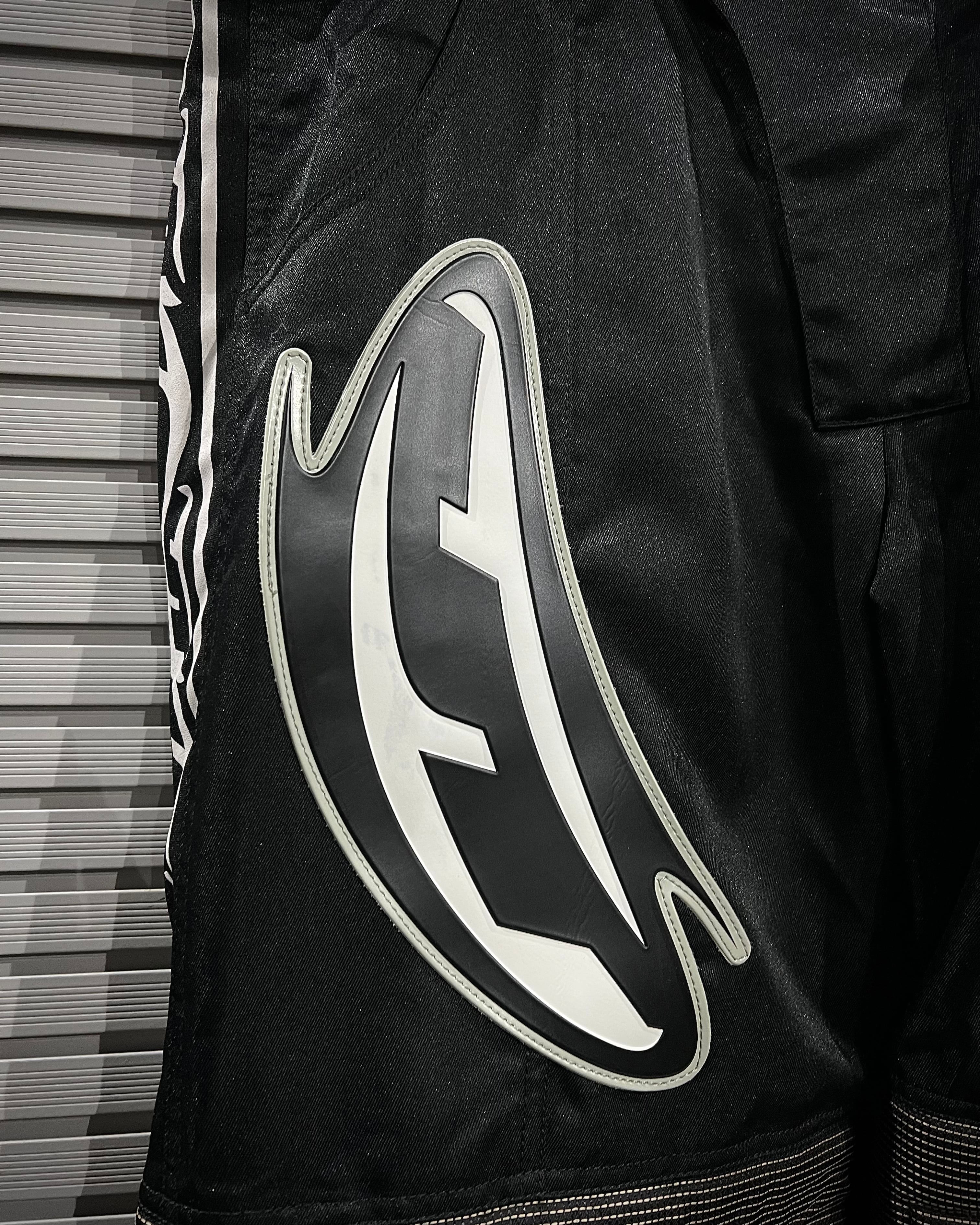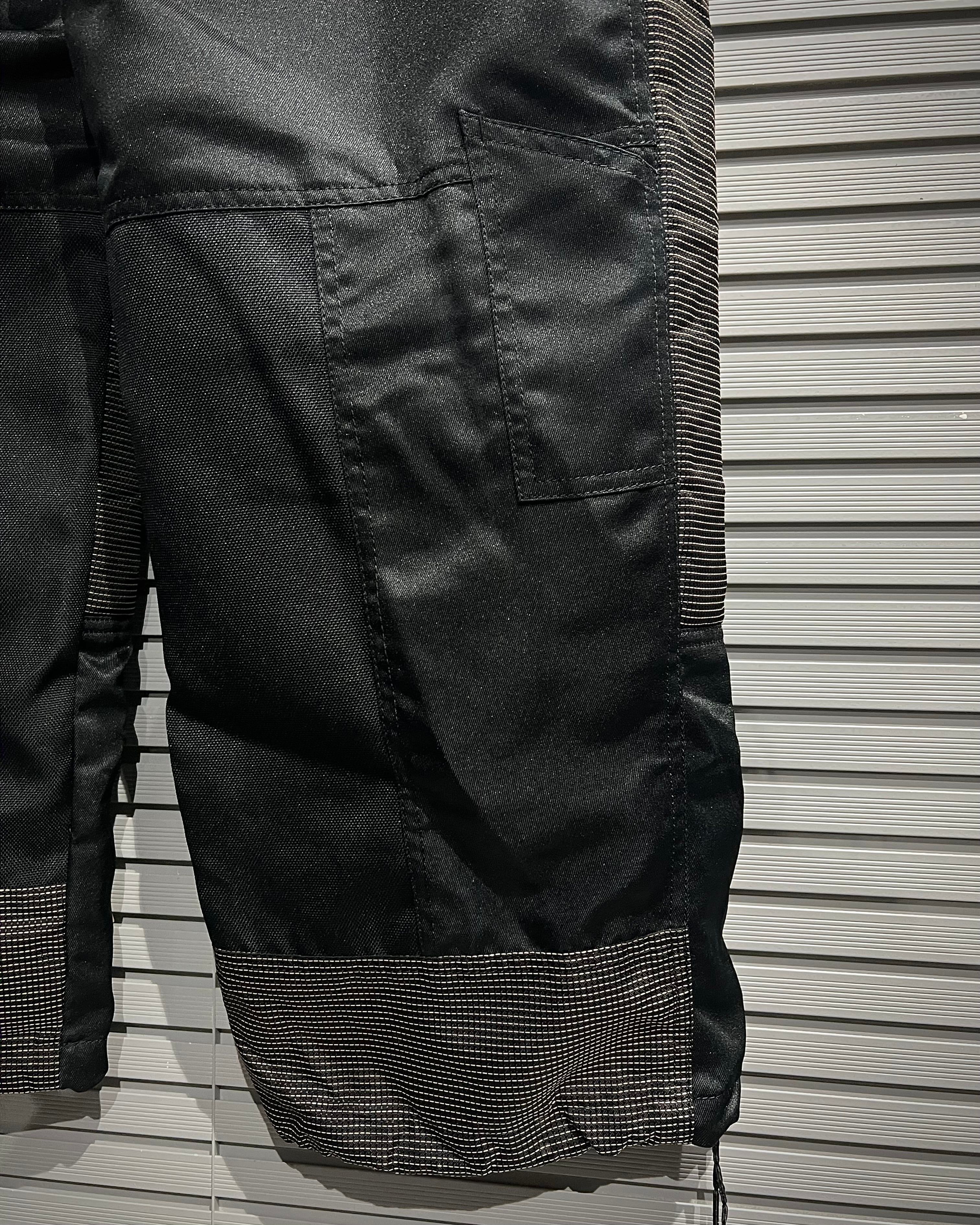 ボディにはPUコーティングを施したポリエステル素材を採用し、マットなブラックを基調に腿部分には大判のロゴワッペンを配置。膝下には切り替えと補強パネルが入り、機能的なデザインが際立ちます。