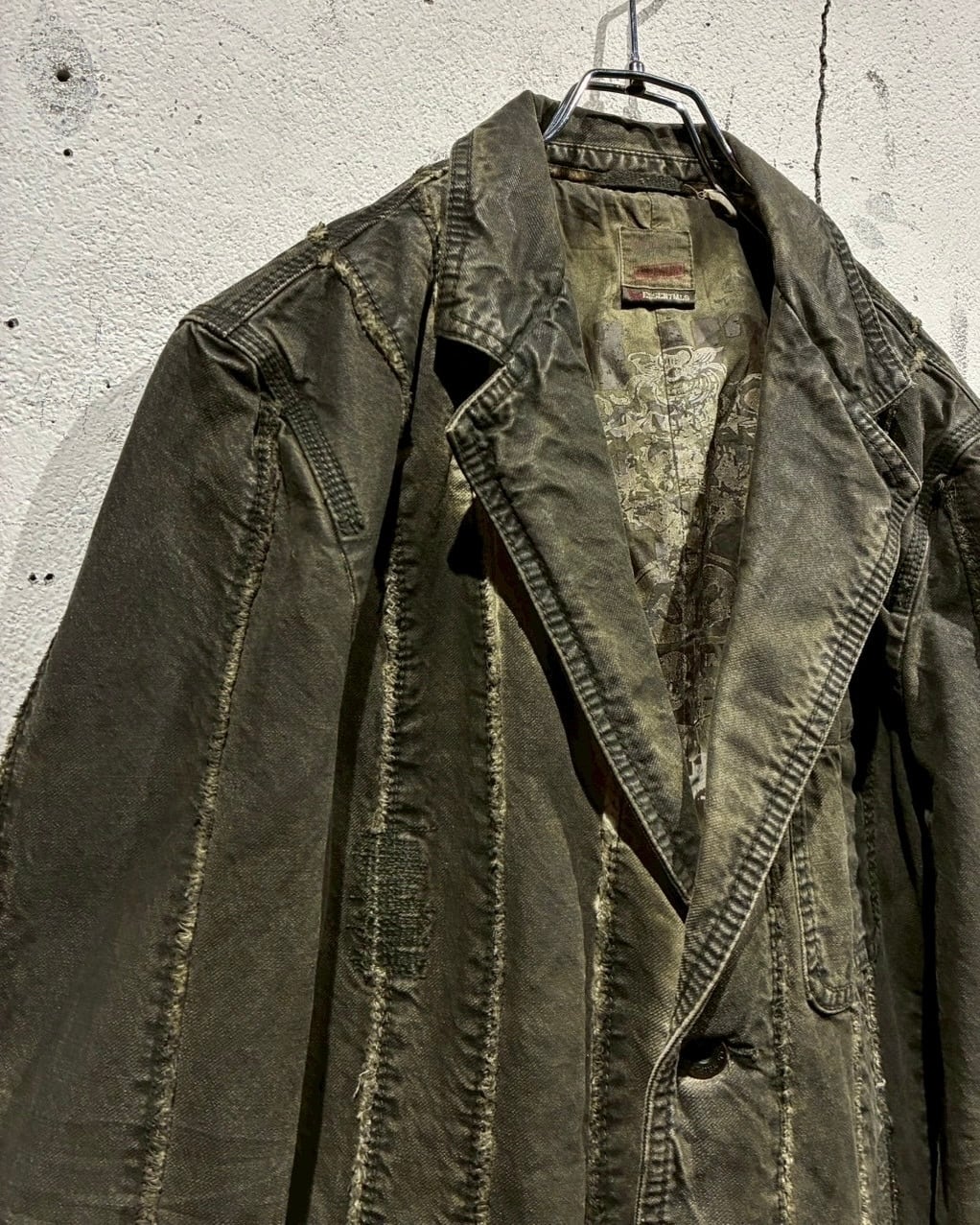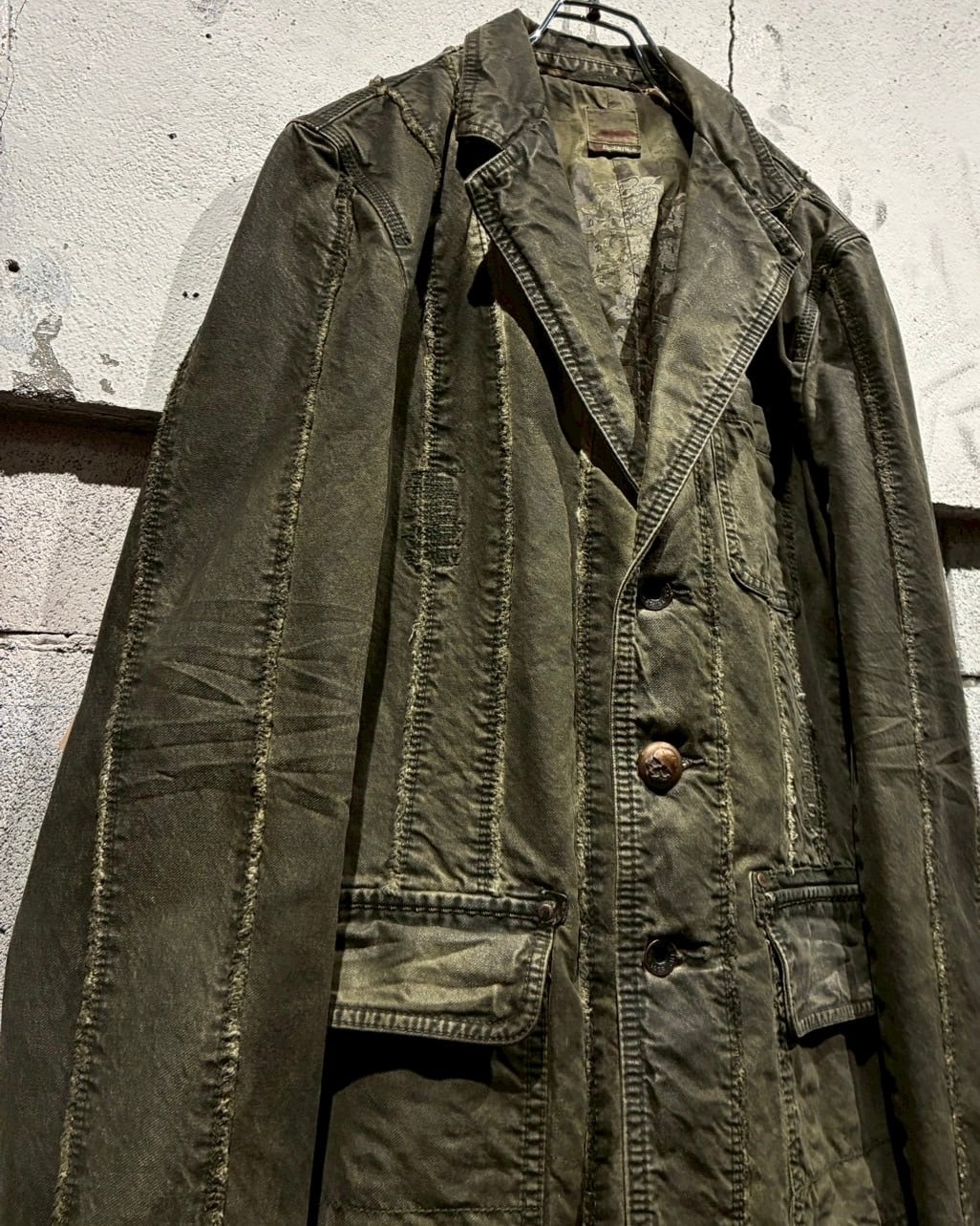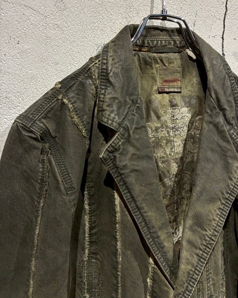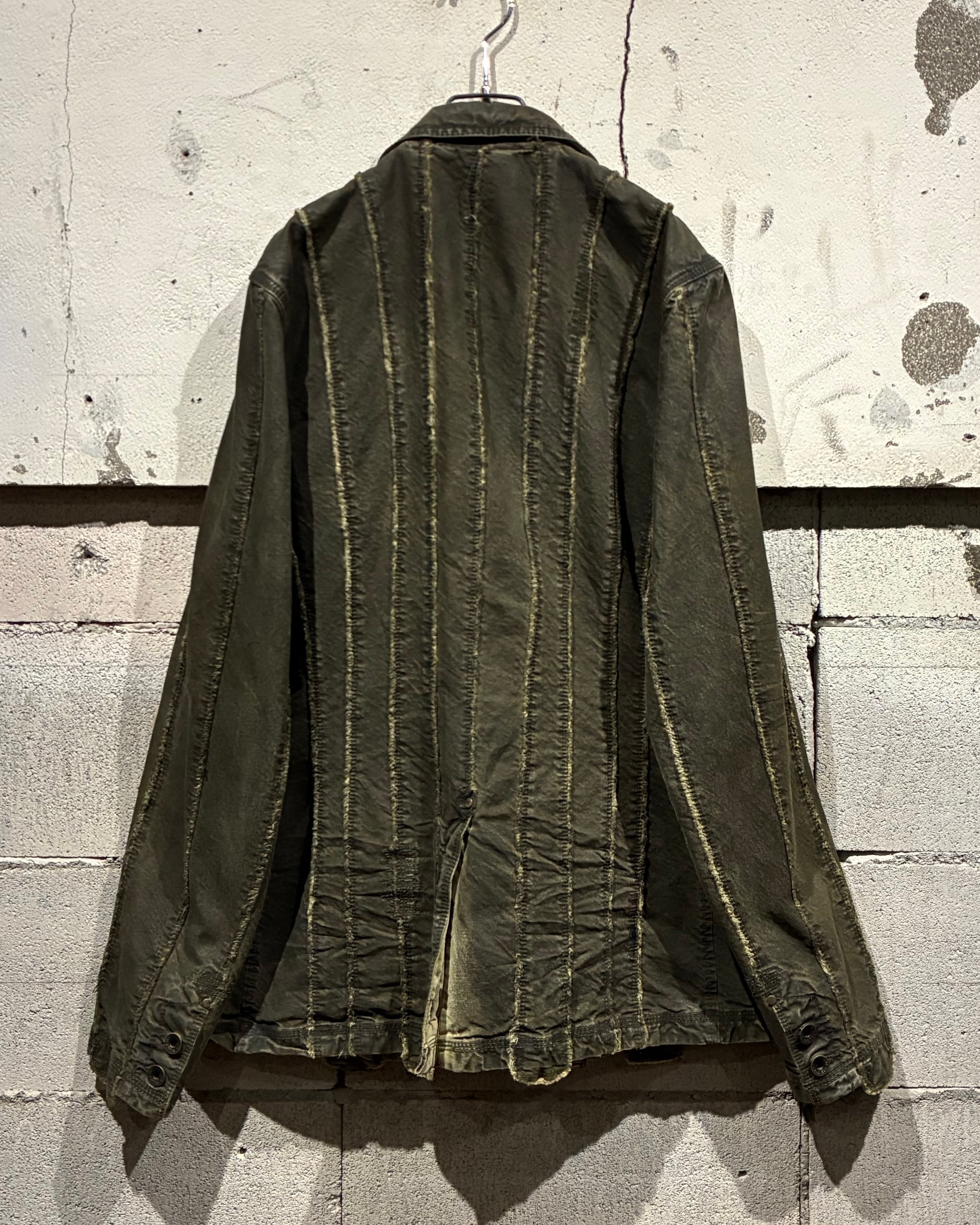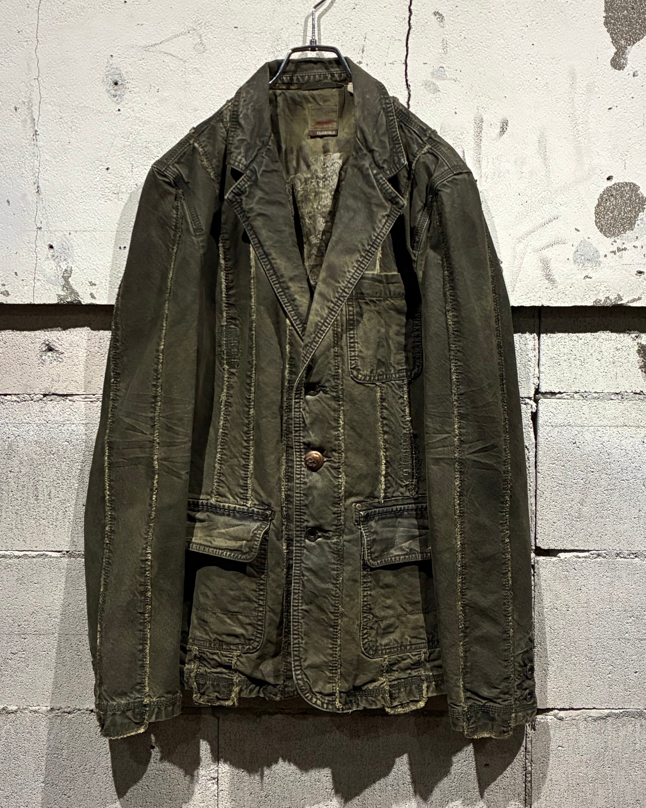 フロントに配されたボタンにはスカルモチーフを採用し、ボディのフェード感も相まってテーラードジャケットの端正さに退廃的でゴシックな要素もプラス。