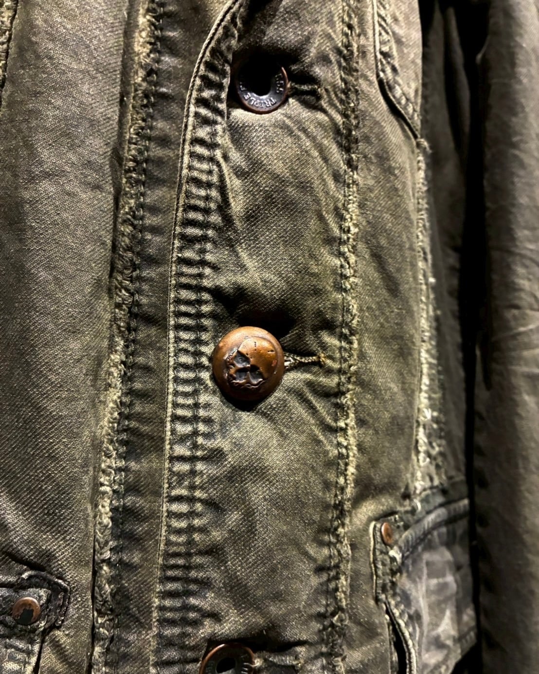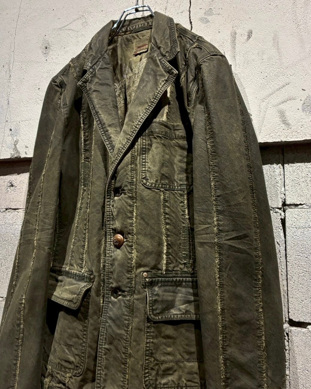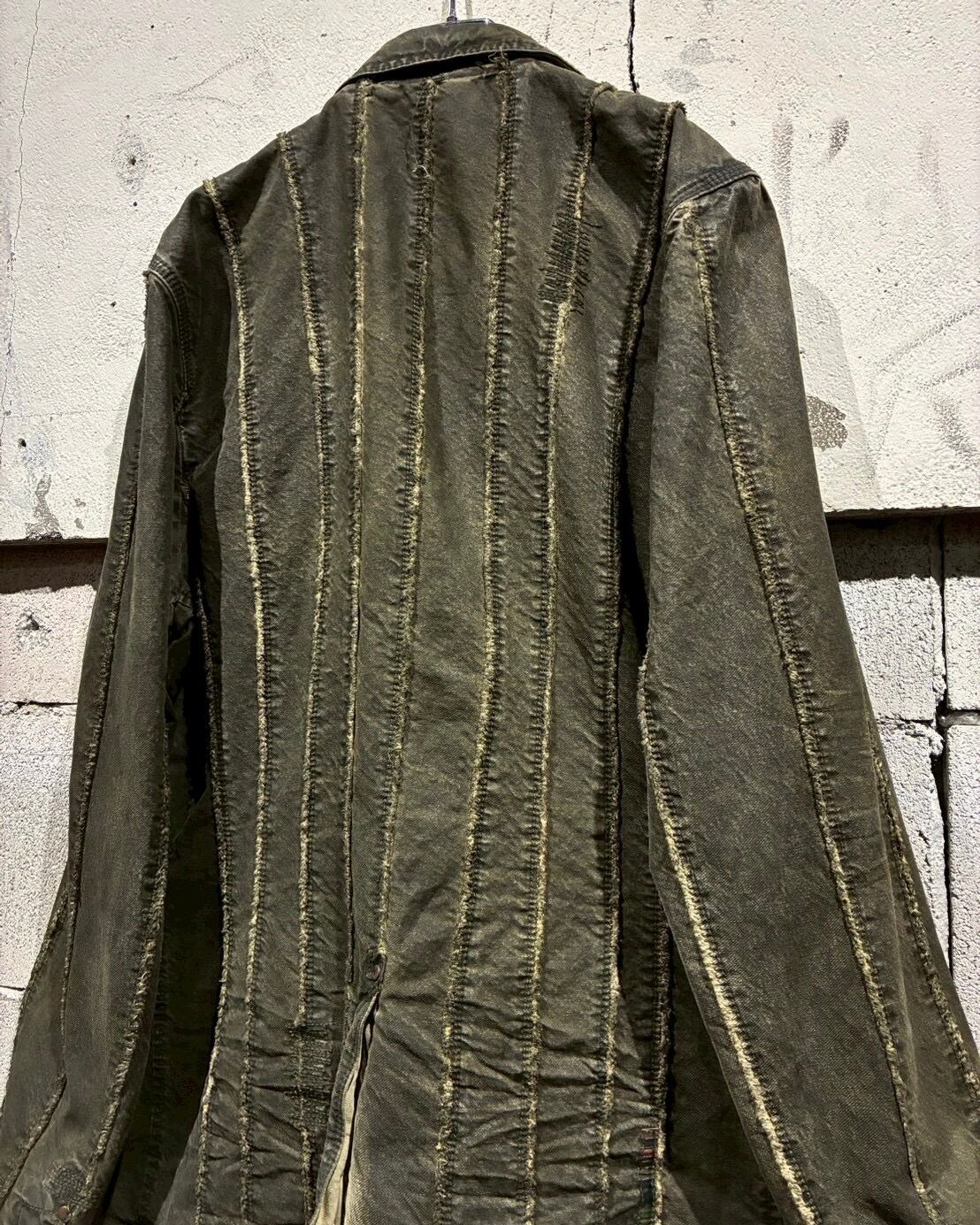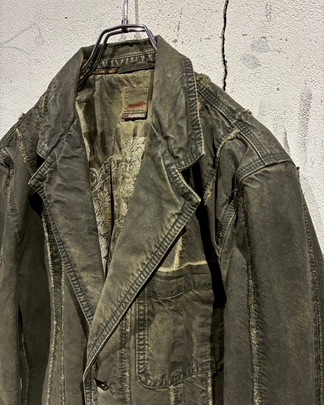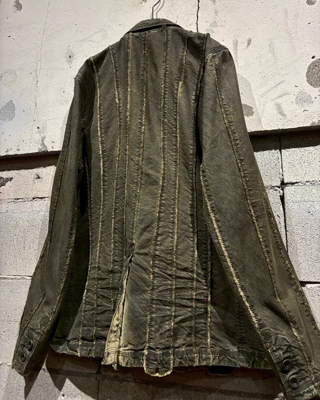 フロントに配されたボタンにはスカルモチーフを採用し、ボディのフェード感も相まってテーラードジャケットの端正さに退廃的でゴシックな要素もプラス。