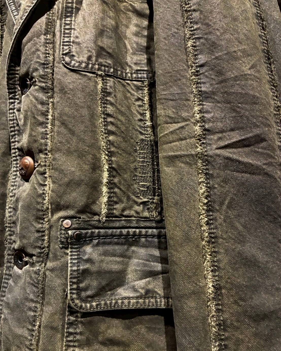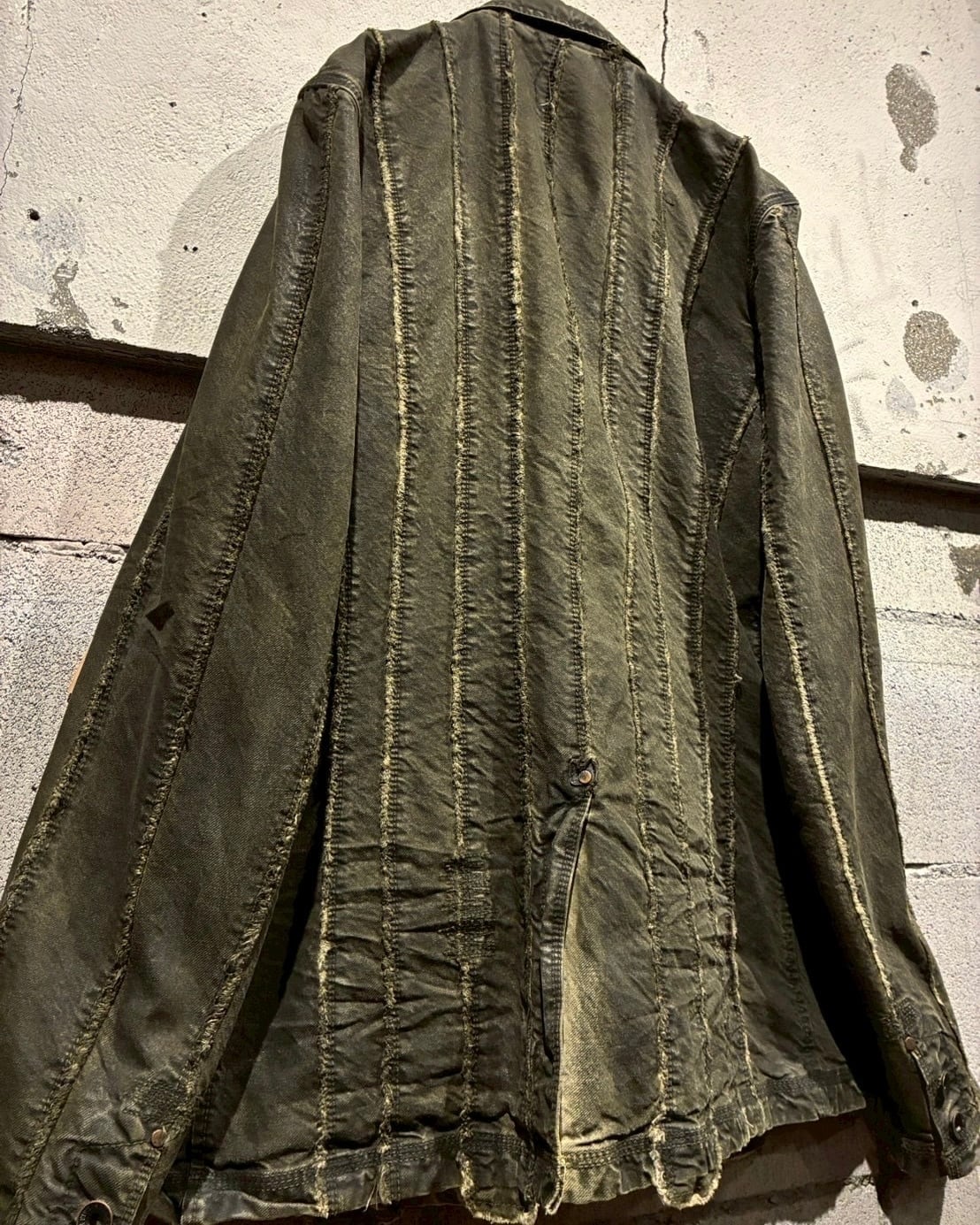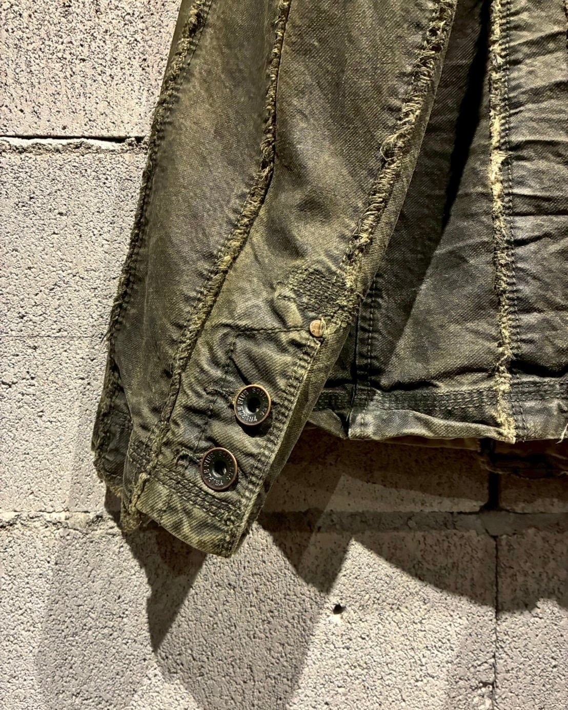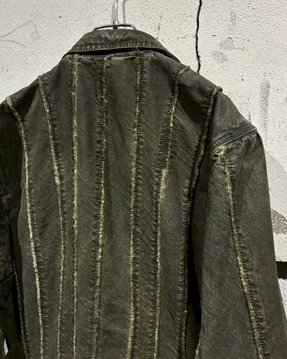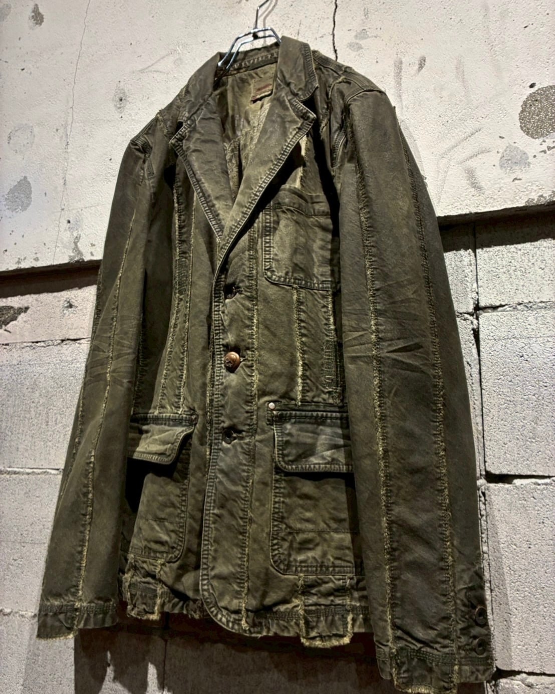 フロントに配されたボタンにはスカルモチーフを採用し、ボディのフェード感も相まってテーラードジャケットの端正さに退廃的でゴシックな要素もプラス。