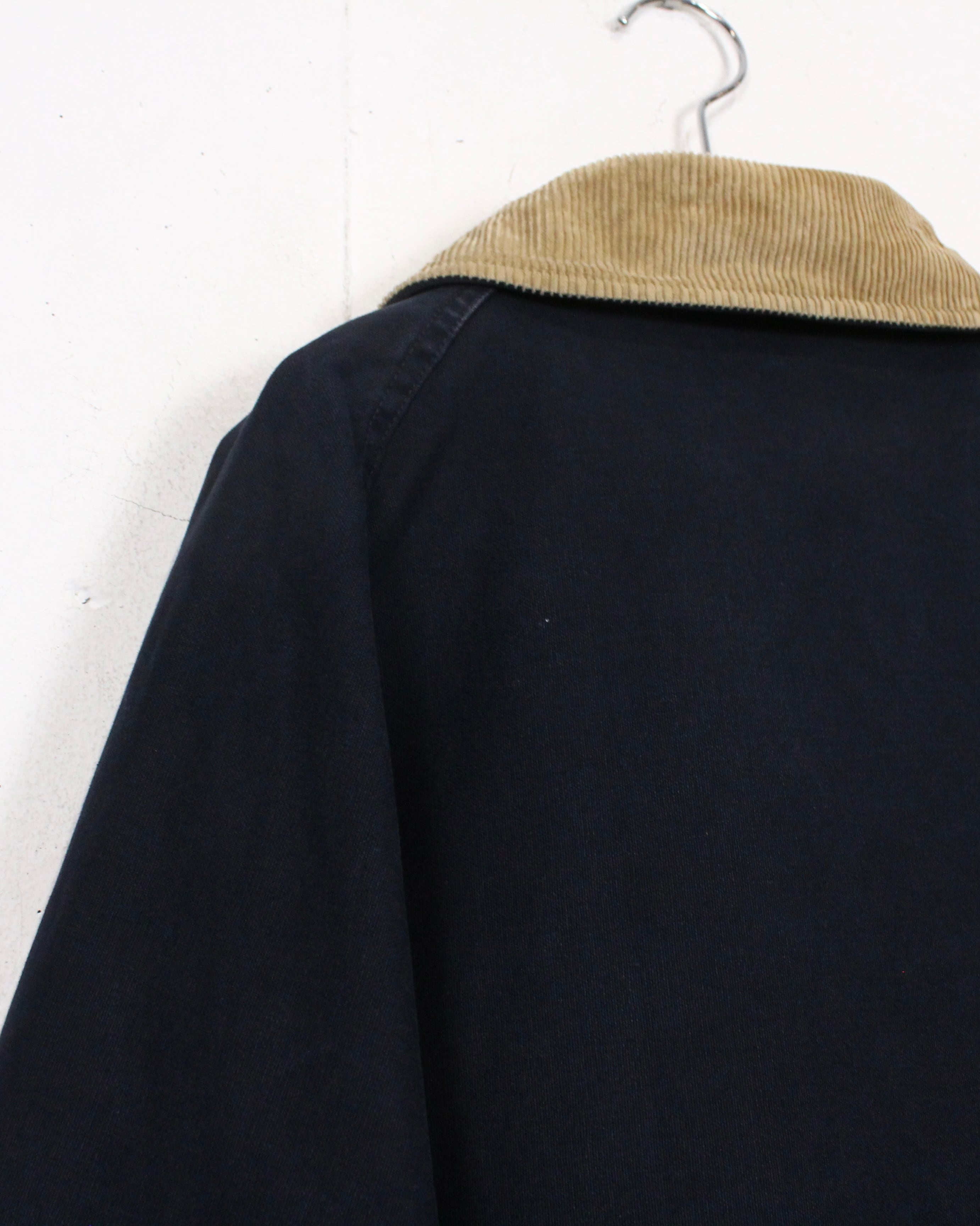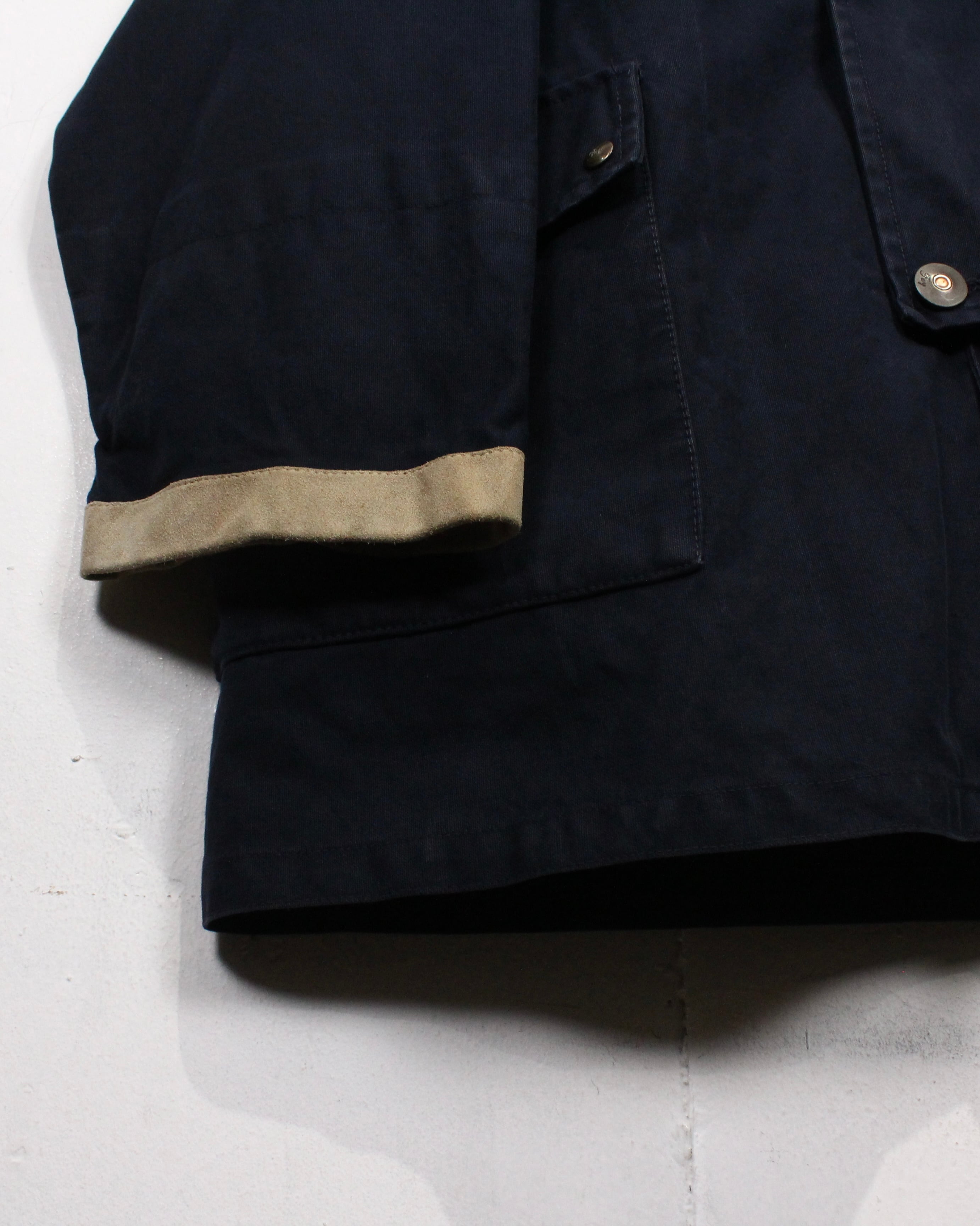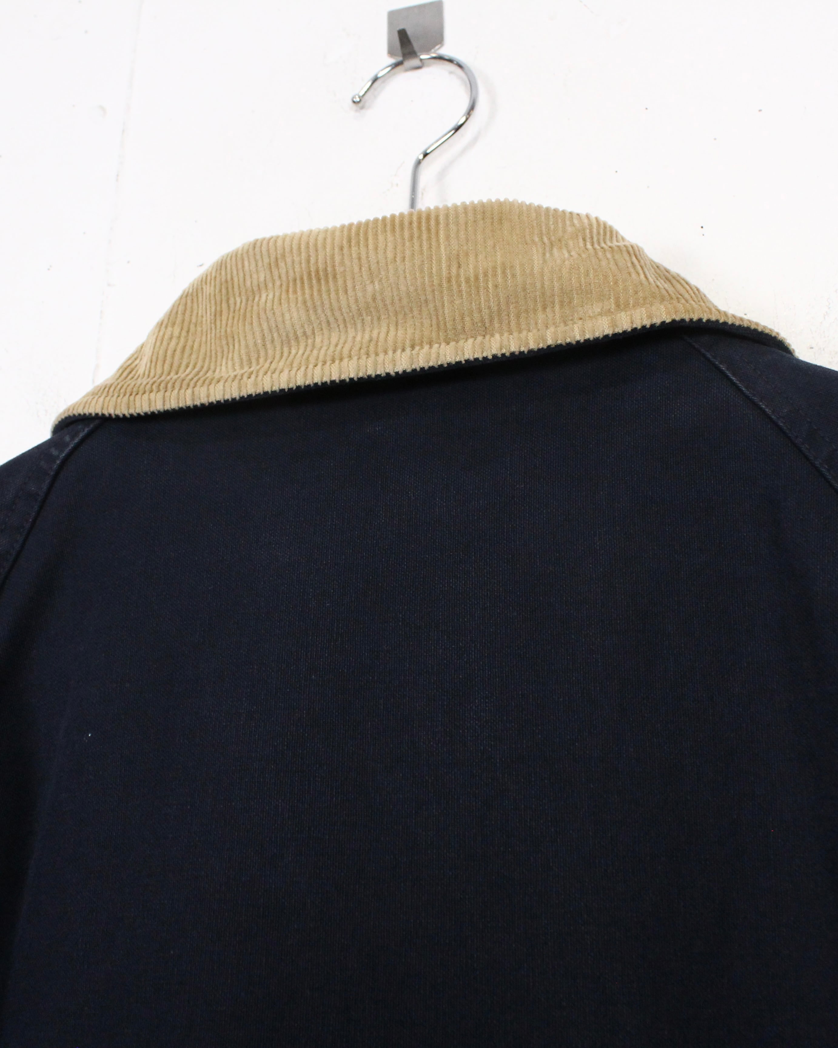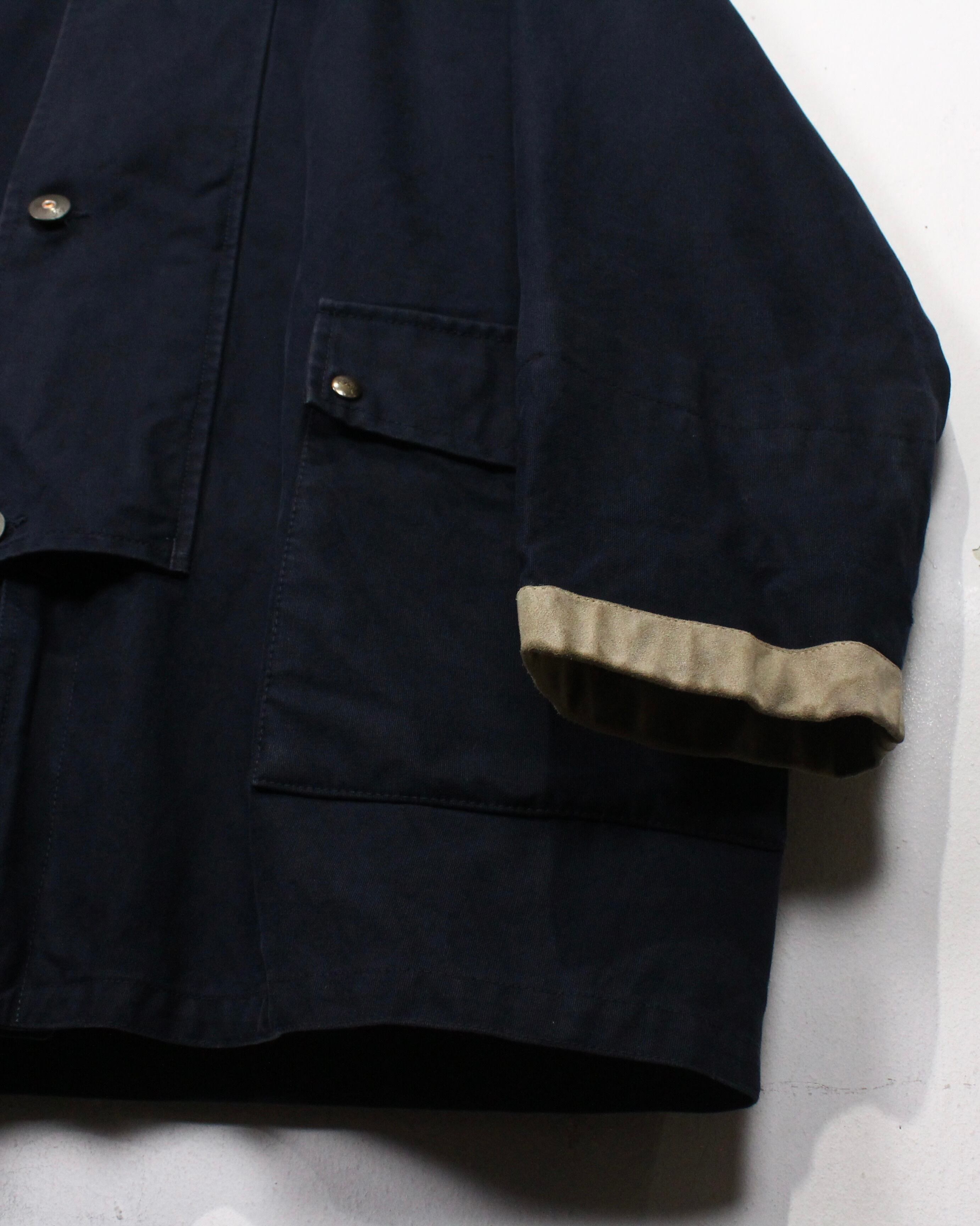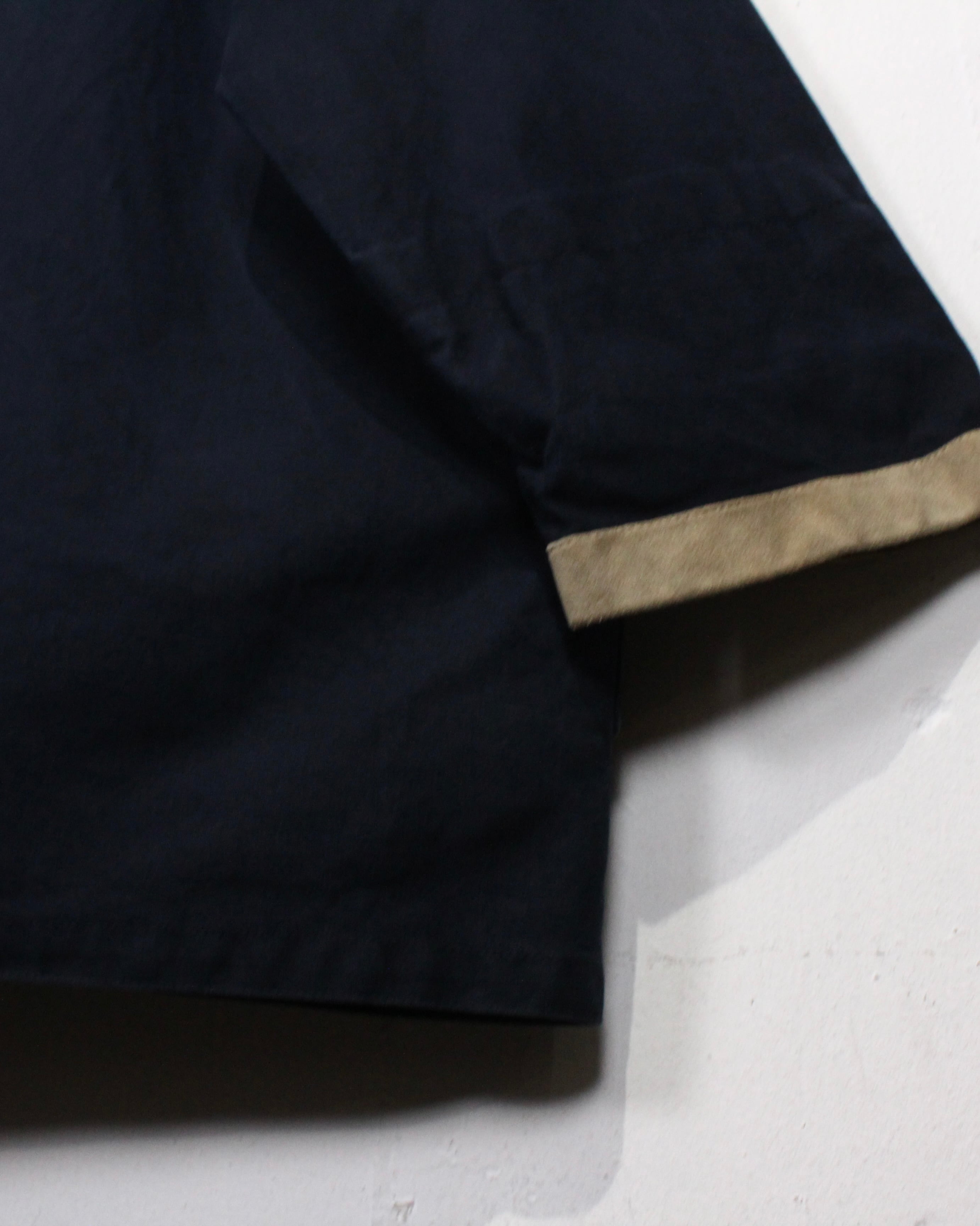 肉厚でタフな生地を使用し、ワーク由来の無骨さとラグジュアリーブランドならではの上品さが合わさった仕上がり。ネイビーボディにベージュの太畝コーデュロイカラーが映え、クラシックかつタイムレスな表情を演出しています。